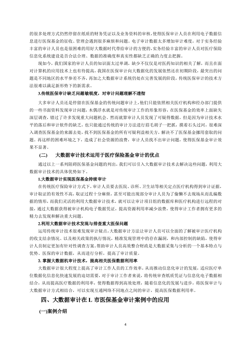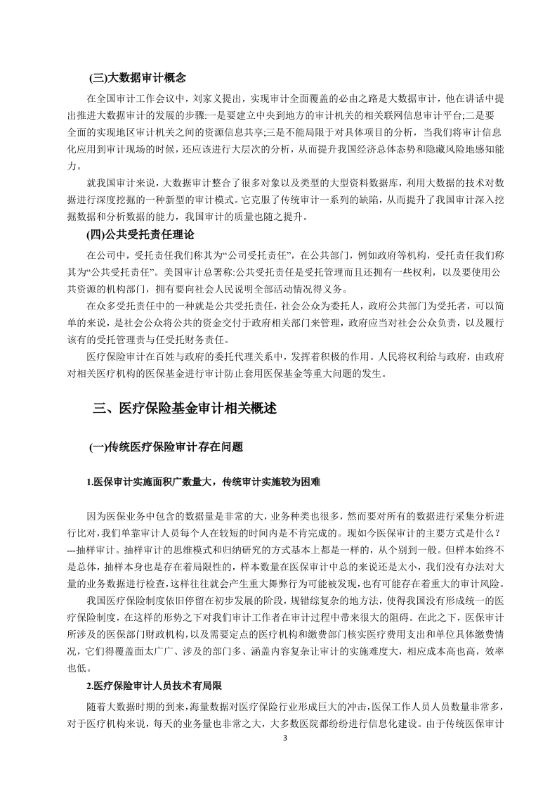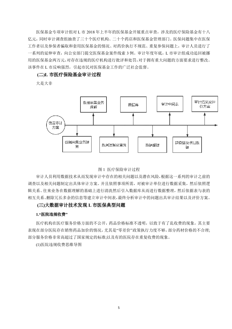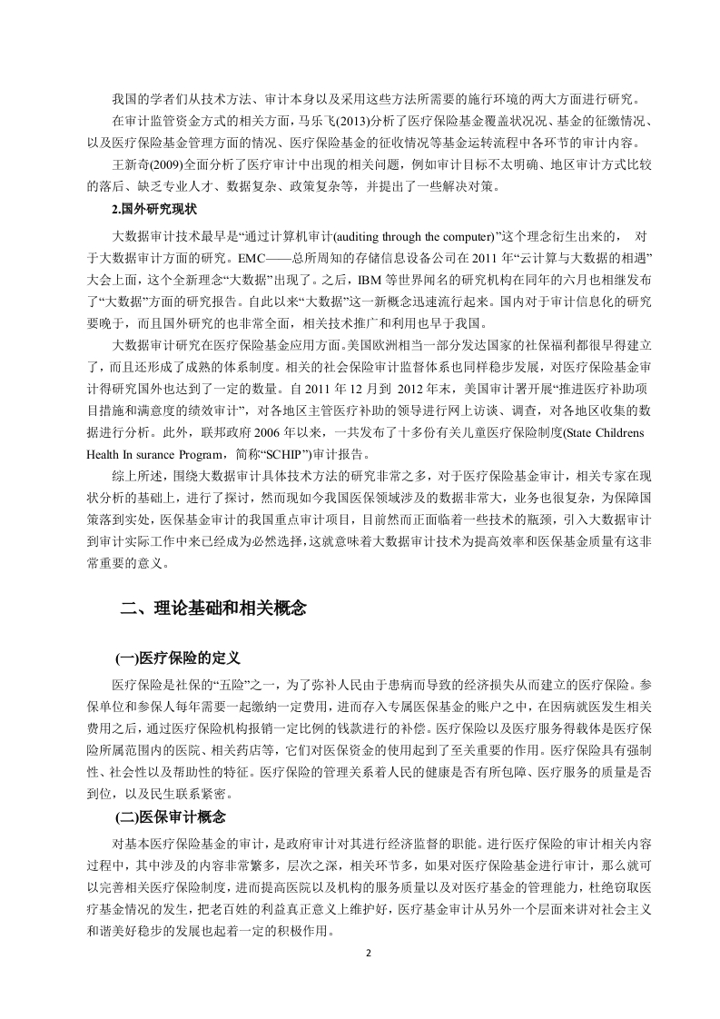 一、引言(一)研究背景及选题意义1.研究背景大数据现代信息技术突飞猛进,在审计发展领域,越来越多的人一直关注着大数据审计,该新型审计技术也成为今年来的流行方向,对于审计工作人员,要想顺应审计发展,那么就要严格要求自己,要学习新型科学的审计技术。大数据big data),21世纪以来非常流行的概念,而且以大数据为代表的新技术也确确实实地影响到企业的经营和人们的生活。大数据会对审计行业带来的不是冲击,而是社会发展的动力。对于现如今审计的工作方式看来,还是一种主要单靠人力做简单的筛查,以及追踪工作,其实如果有了大数据,那么我们就能够能省下很多时间与精力,作为新时代之下审计人员非常期待大数据的到来。如何占有数据,是当今审计发展的一大困难,这些数据来自于不同的行业,我们单纯的仅靠审计部门是非常难得统筹这些数据,对于涉及个人信息数据的时候面临的挑战就更加的大,基于如此背景之下,审计的大数据化也就成为国家以及众多学者们尤为关注的社会聚焦点。现如今,医疗保险在传统审计技术的督查之下,存在着许多问题。如何利用大数据平台构建下审计技术进行医疗保险审计就成为了我们需要关注的众点问题。2.研究目的和意义(1)研究的目的该文章的研究目的是指出大数据在医保审计中相关的优势,结合L市医保大数据审计的案例进行相关分析,指出传统审计方法在医保审计应用中还存在的哪些问题以及利用大数据审计方法的相关优势。基于传统方法对医疗保险进行出现的问题,我们利用大数据审计是如何解决的,以及最后提出有力的方法和建议,希望能够帮助L市提升大数据医保审计的效果,同时给全国各地区医保审计提供良好的范例与示范。(2)研究的意义从理念上看,大数据能够通过“数据驱动”来参与从下到上的经济决策,还能够通过采集数据、评估效果到反馈的完整闭环进行大数据分析的提升和发展。第二,从资源上看,大数据是一种新型信息渠道,具有非常高的经济价值。我们通过云计算技术可以把许多大数据里不重要的信息进行汇集加工,获取高质量以及高价值的信息。我们可以太怎么恰当的例子,大数据地处理就好比从河里面淘出一些微小的、不怎么容易辨识的金沙,然而汇集起来,我们就可以把它变成贵重的金块」什么是我们想要幸福生活地根基呢?医疗保险基金。但我们的社会现状是,经常发生一些不合法使用医疗保险基金的例子,这对我国人民享有基本健康福利有着不利影向,阻碍了医保的发展和推进,不利于社会稳定和谐。在这样的大环境下,我国审计部门就应该加大对医疗保险基金相关方面的审计力度。医疗保险基金涉及的问题范围广,业务问题十分多,审计难度也是非常大的,如果我们把大数据审计技术灵活的嵌入医保审计当中,之前利用传统审计技术不能解决的难题我们不就可以很好的解决了吗?为审计人员提供一种具有高效率和高质量的审计思路,因此,本选题具有积极非常大的现实意义。(二)国内外研究现状1.国内研究现状我国的学者们从技术方法、审计本身以及采用这些方法所需要的施行环境的两大方面进行研究。在审计监管资金方式的相关方面,马乐飞(2013)分析了医疗保险基金覆盖状况况、基金的征缴情况、以及医疗保险基金管理方面的情况、医疗保险基金的征收情况等基金运转流程中各环节的审计内容。王新奇(2009)全面分析了医疗审计中出现的相关问题,例如审计目标不太明确、地区审计方式比较的落后、缺乏专业人才、数据复杂、政策复杂等,并提出了一些解决对策。2.国外研究现状大数据审计技术最早是“通过计算机审计(auditing through the computer)”这个理念衍生出来的,对于大数据审计方面的研究。EMC一总所周知的存储信息设备公司在2011年“云计算与大数据的相遇”大会上面,这个全新理念“大数据”出现了。之后,BM等世界闻名的研究机构在同年的六月也相继发布了“大数据”方面的研究报告。自此以来“大数据”这一新概念迅速流行起来。国内对于审计信息化的研究要晚于,而且国外研究的也非常全面,相关技术推广和利用也早于我国。大数据审计研究在医疗保险基金应用方面.美国欧洲相当一部分发达国家的社保福利都很早得建立了,而且还形成了成熟的体系制度。相关的社会保险审计监督体系也同样稳步发展,对医疗保险基金审计得研究国外也达到了一定的数量。自2011年12月到2012年末,美国审计署开展“推进医疗补助项目措施和满意度的绩效审计”,对各地区主管医疗补助的领导进行网上访谈、调查,对各地区收集的数据进行分析。此外,联邦政府2006年以来,一共发布了十多份有关儿童医疗保险制度(State ChildrensHealth In surance Program,简称“SCHP审计报告。综上所述,围绕大数据审计具体技术方法的研究非常之多,对于医疗保险基金审计,相关专家在现状分析的基础上,进行了探讨,然而现如今我国医保领域涉及的数据非常大,业务也很复杂,为保障国策落到实处,医保基金审计的我国重点审计项目,目前然而正面临着一些技术的瓶颈,引入大数据审计到审计实际工作中来已经成为必然选择,这就意味着大数据审计技术为提高效率和医保基金质量有这非常重要的意义。二、理论基础和相关概念(一)医疗保险的定义医疗保险是社保的“五险”之一,为了弥补人民由于患