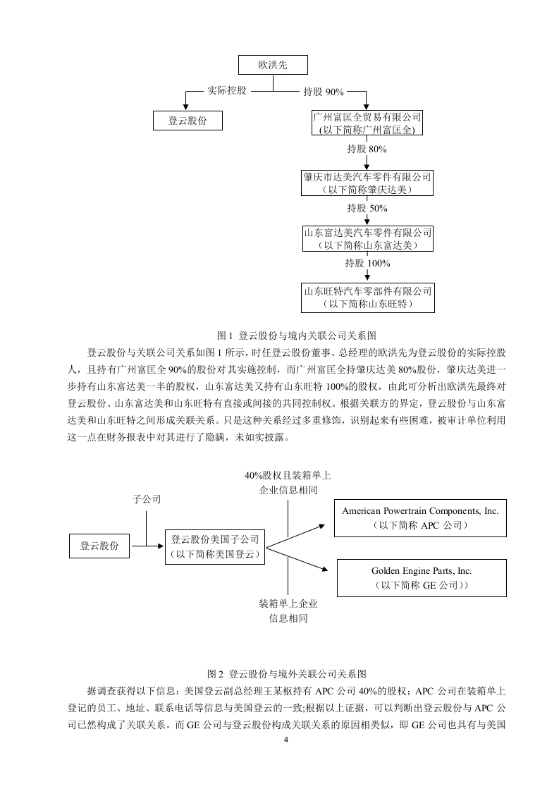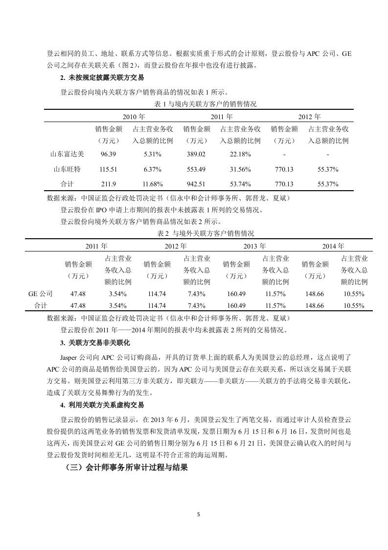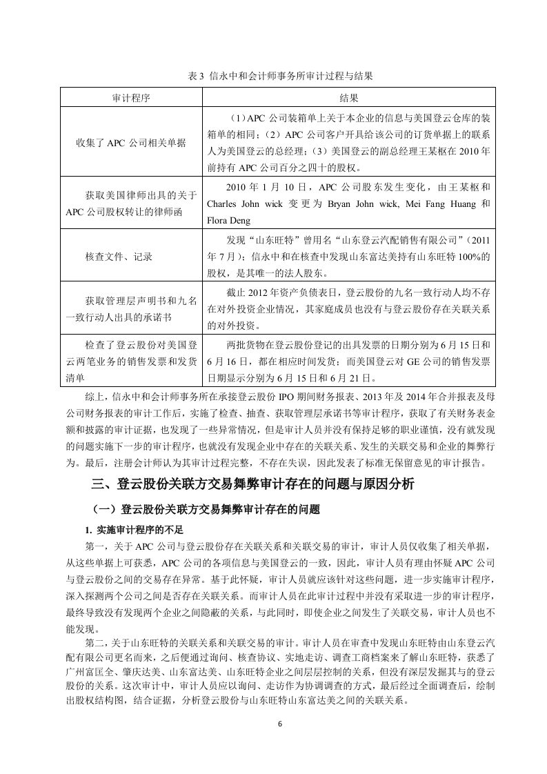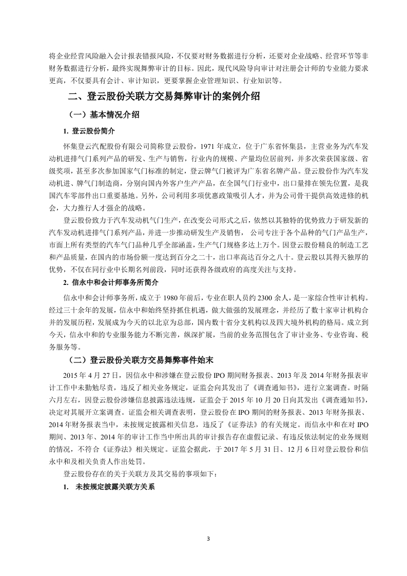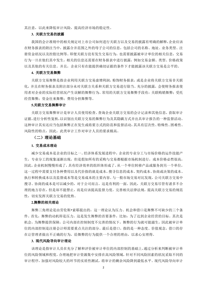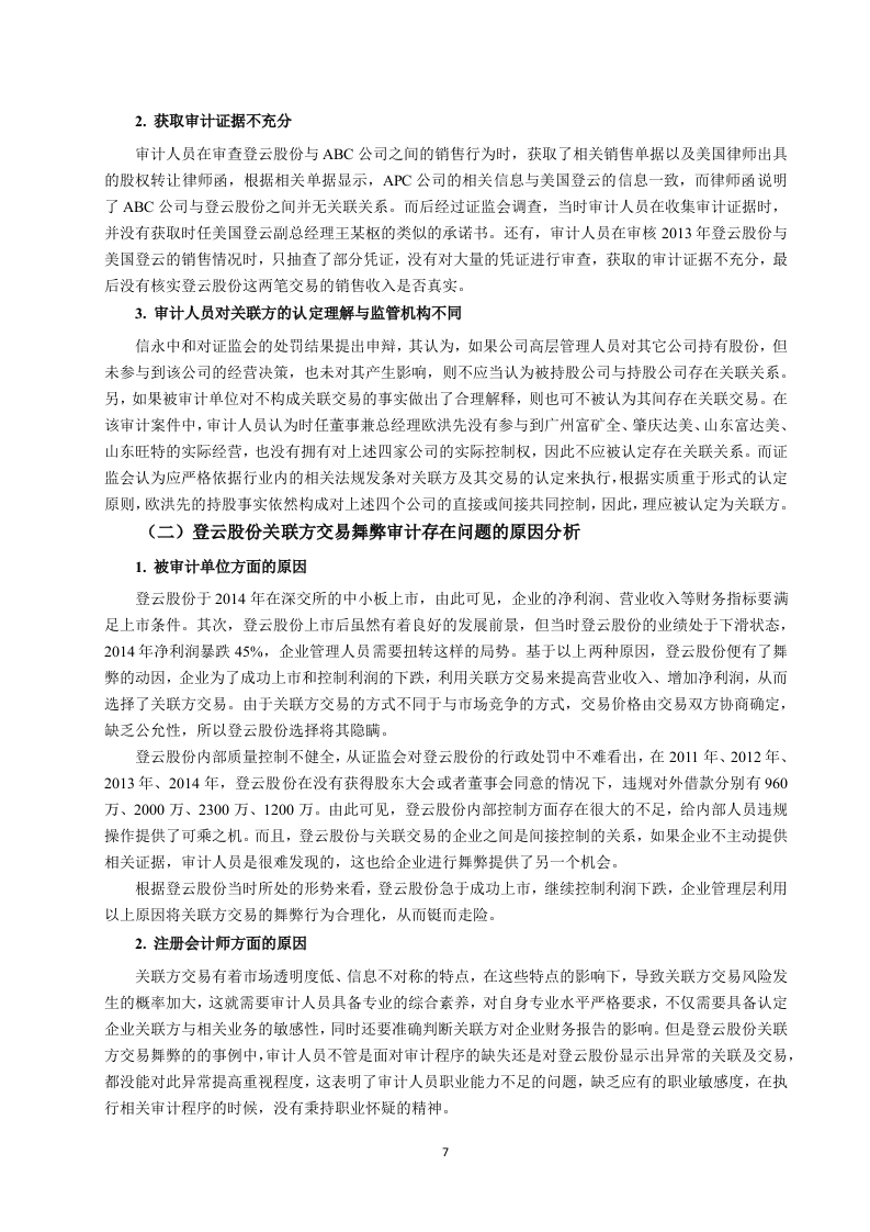 引言随着全球经济的快速增长,一些公司利用财务舞弊的方式以达到盈利的目的,其中,关联方交易是企业用来进行财务舞弊的一种手段。其实在交易市场中,关联交易是被允许存在的,因为关联方交易可以为企业带来好处,如交易流程简便、交易成本低、资金运作效率高等:可是在带来好处的同时,也存在一些弊端,如虚增企业利润,误导信息使用者,关联交易也为公司逃税、违法转移财产提供了一层看似合法的保护屏障。存在弊端主要是因为关联方交易的价格通常是由相关联的公司之间确定的,可能有失公允,侵害股东权益。所以,根据会计准则的要求,企业需要在年报的附注中对关联方及关联方交易进行披露,而企业通常为了不被财务报表使用者发现,不按照准则进行披露。企业还会利用审计人员很难发现此类交易的空缺,经常隐瞒非法动机,在关联方交易方面做手脚。由于我国现行的法律法规还有待完善,关联方交易便为公司提供了财务舞弊的手段。自二十一世纪以来,利用违规关联方交易手段完成交易的企业不少,例如紫鑫药业、阳煤化工、乐视网等,但最终被证监会查实,也付出了相应的代价近些年接连发生的关联方交易导致企业最终受损、被监管机构惩罚的事件,为各学者提供了研究的案例,学者们一致认为有效地控制不公允的关联方交易,有助于交易市场的健康发展。在关联方交易审计方面,Vishny和Shleifer(2004)指出无论企业是否存在关联方交易,企业都应将关联方信息进行披露:存在关联交易的,则必须将与交易相关的信息都披露出来。近些年的审计失败案例,降低了审计人员在人们心中的社会形象,也削弱了审计人员的信心。胡淑娟(2015)的出的结论则侧重于审计人员应提高自身业务能力和增强职业素养。刘熔芬(2014)通过研究,从审计风险评估、追加审计程序和审计完成阶段三个方面提出了针对关联方交易舞弊的审计策略。本文首先明确了相关概念、阐述了涉及到的理论知识,其次,对登云股份情况作了介绍,并分析会计事务所审计的过程与结果,再次,对登云股份关联方交易舞弊的审计存在的问题及原因作了分析,最后针对关联方交易舞弊的审计问题及原因进行了思考,并提出一些审计建议。一、相关概念的界定及理论基础(一)概念的界定1.关联方关联方的界定,各学者的理解不同,但是总体要素基本是一致的。企业经营过程中,如果出现有一方企业控制、共同控制另一方企业,或者对另一方企业实施重大影响的,还有两方或多方企业共同受一方企业控制或重大影响的,就构成关联方了。其中,控制就是在一个企业的决策或者经营过程中有重大的掌控权,企业的运营和发展方向是可以直接受到影响的。共同控制就是指对某项经济活动,两个企业共同控制,共同起到影响该项经济活动相关的重要财务和经营决策的作用。重大影响就是尽管对另一方企业没有控制权,但是在决定重大事顶的时候,有参与表决的权利,对公司的各项经营决策起到影响作用。2.关联方交易关联方交易简单来讲,就是与企业有关联关系的公司发生的转移资源、劳务或义务的,其中包括提供商品、销售商品以及销售劳务的业务往来,还包含业务担保以及资产转移等等。因为企业的规模大小各不相同,经营的模式也非常的多元化,关联企业之间进行交易是常态,这可以降低成本,提高企业的运作效率,这也是很多企业选择关联方交易首要考虑的因素。由于关联企业之间的特殊关系非常隐蔽因此被很多公司利用,从而达到管理层预期的目标。这就警示审计人员在审计过程中要对关联方交易尤其注意,以此来降低审计风险,提高经济市场的稳定性3.关联方交易的披露我国的会计准侧中的相关规定对上市公司如何进行关联方以及交易的披露有明确的解释,企业应该在财务报表的附注当中,披露合并范围之外的母子公司的信息,包括公司的名称、地址、业务类型、注册资金状况以及控股比例等。即便关联方没有发生交易行为,也需要披露被审计单位的相关信息,交易行为一旦在他们其中发生,相关的信息还需要在财务报表中进行披露,例如交易金额、类型、价格政策以及其他的有关信息。并且,企业只有在能提供确切证据的条件下才能披露该关联方交易是公平的。4.关联方交易舞弊关联方交易舞弊是指企业利用关联方交易虚增利润,粉饰财务报表,或是企业将关联方交易非关联化,并且在财务报表及附注部分未对关联方关系和关联方交易进行除当、充分的披露,会使财务报表使用者对企业的实际经营状况产生误解的舞弊行为。常用的关联方交易舞弊手段有:关联购销舞弊:受托经营舞弊:资金往来舞弊:费用分担舞弊等。5.关联方交易舞弊审计关联方交易舞弊审计是审计人员使用检查、查询企业关联方交易的会计记录和其他信息,获取审计证据,进行分析性复核,以识别出关联方交易的舞弊行为及其隐瞒方式并出具审计报告的一种监督活动。这种审计其实还应当包括舞弊正在发生或将要方式的防范和监督活动,其具有层次性、特殊性、困难性、风险性的特点,因此,此类审计工作对审计人员的要求极高。(二)理论基础1.交易成本理论减少交易成本是企业的目标之一。经济体系发展进程中,企业的专业分工与市场价格的运作技能产生,专业分工的现象逐渐出现,但是假如所有的采购与交易都根据市场机制进行,成本