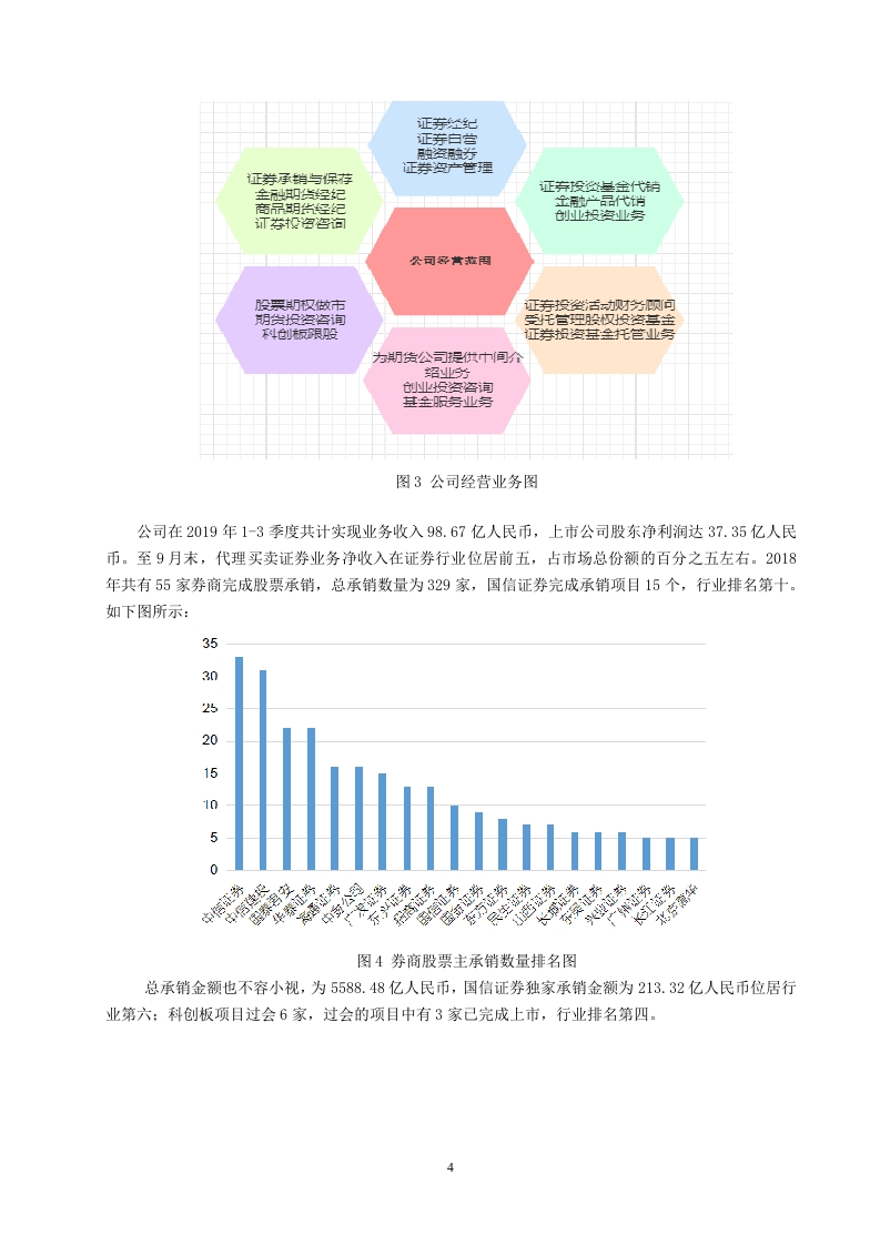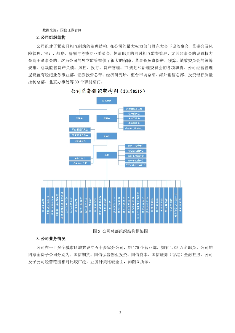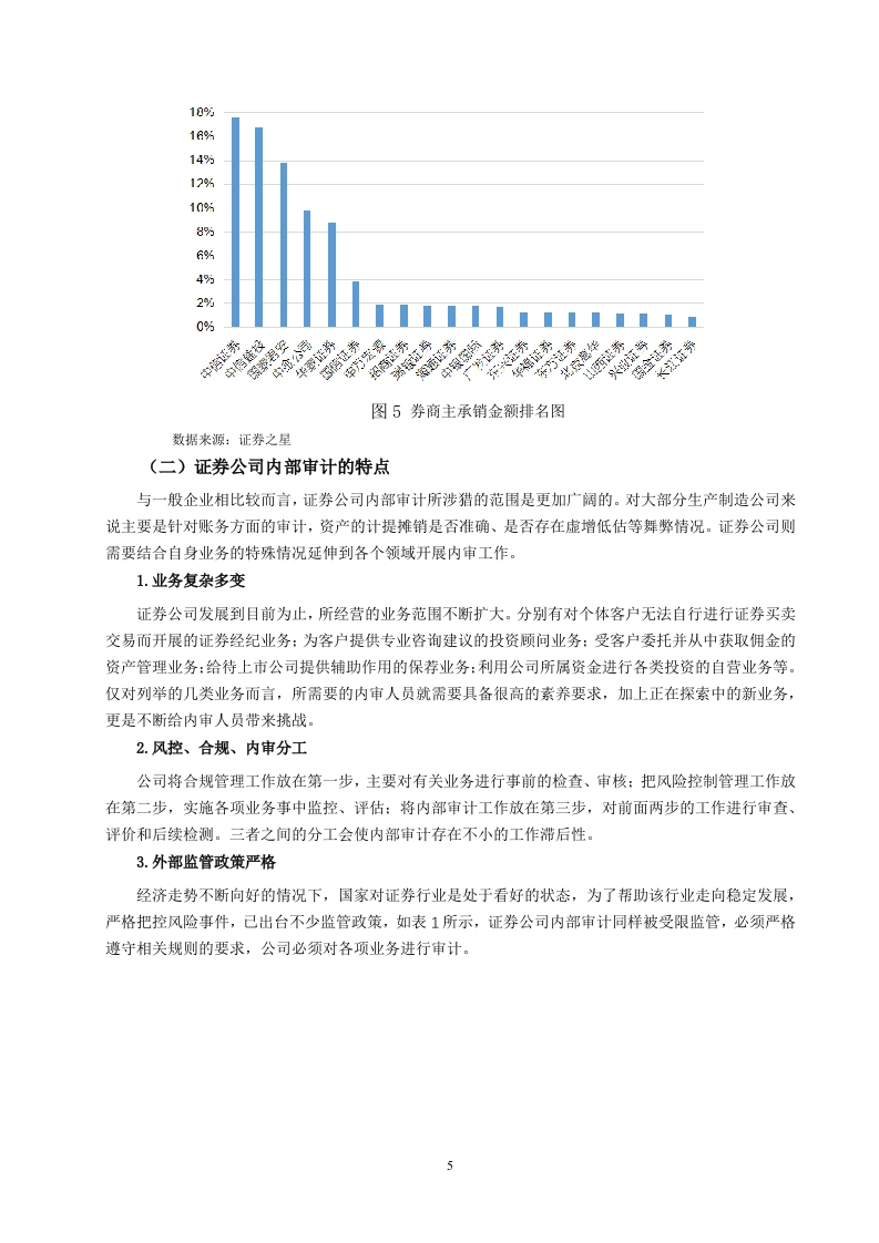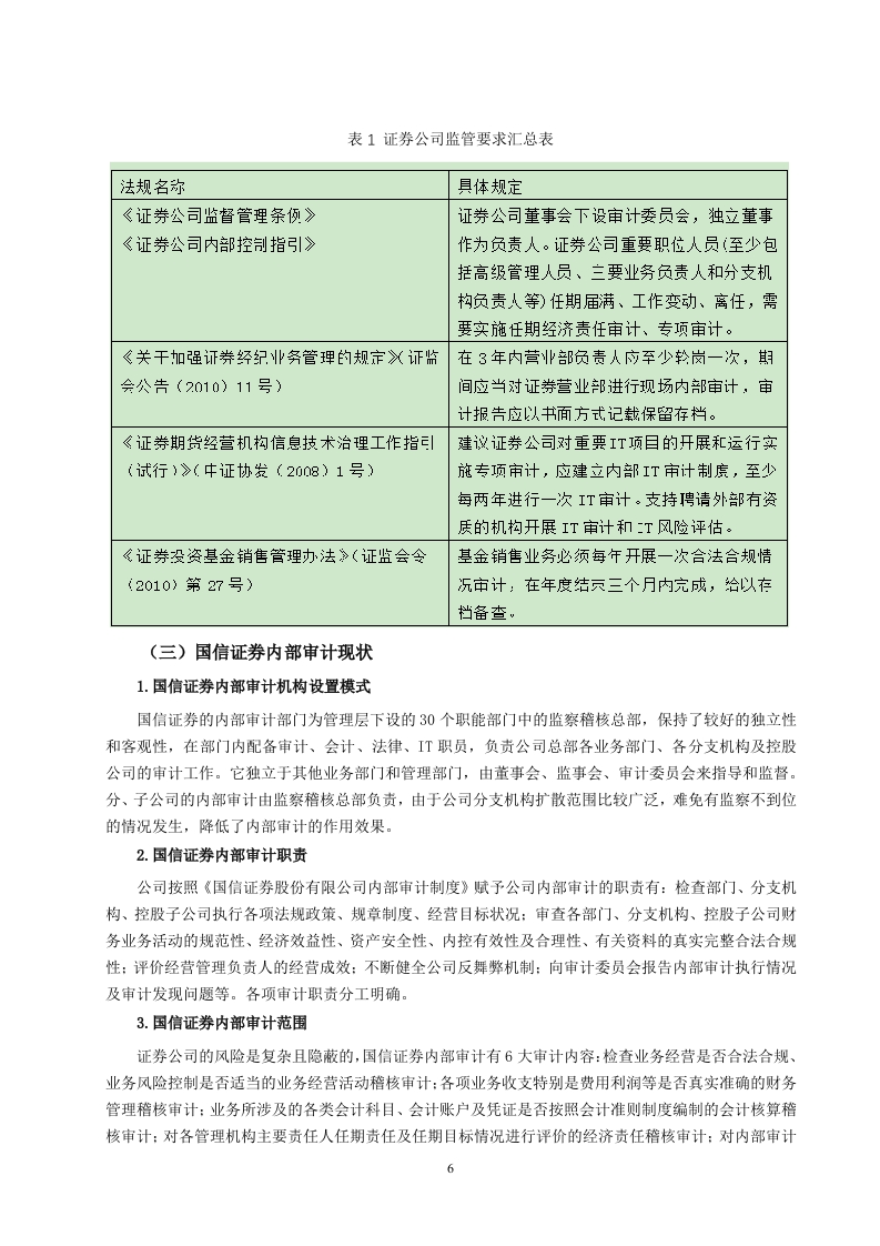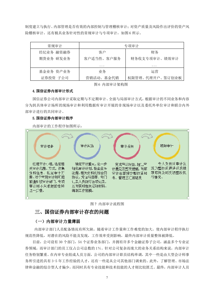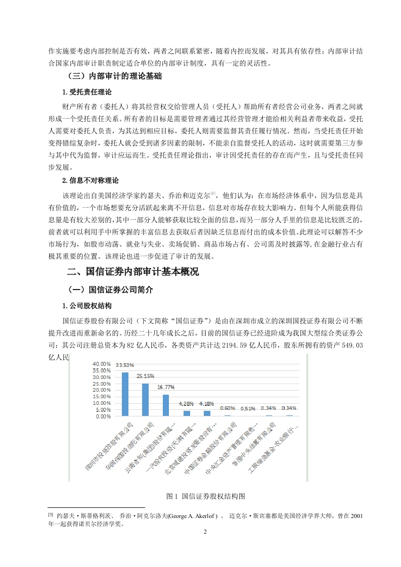 引言目前,我国经济正处于发展时期,市场中的各类企业大量涌现。证券行业步入一个全新发展的时代。由于经济发展的多元化与复杂化、互联网经济的创新以及行业竞争激烈的形势突出,使得证券公司要应对不同业务和产品带来的新风险,而证券行业本身就是一个资本高度集中的领域,所面对的风险再次加大。在现代企业运营中内部审计的作用是不可小视的,它通过依照系统规范的方法和相关规章制度来监督与评估单位内部的经济管理活动,从而向管理层反馈信息并提出建议,为增进企业高效运行和整体价值的实现而服务。但是,在实际的业务运用中,依然存在着大量缺陷与不足,使内部审计职能的发挥及企业价值的提升作用受到了很大限制。国家主席习近平对内部审计工作作出重要指示,强调内审人员需要认真学习领会审计署关于内部审计工作的规定(2018年审计署令第11号)精神。他指出,要把握内部审计专业发展的最佳机会并提出了以下内部审计工作重心的要求:首先,在新环境下的重要任务是将推进党和国家的重大决策计在本单位内落到实处:其次,在具体工作中围绕识别和防范重大风险,发挥其重要的防御作用:最后,不新提高内部审计职员的综合素养能力。可见内部审计的重要性,所以在内部审计研究方面应该响应国家号召,重点去把握关于内部审计的研究,我国学者王光远(2010)教授指出,内部审计作为风险管理的关键环节,它不仅是风险管理的评价者,而且是再管理者。许平彩(2009)认为国内证券公司内部审计在风险导向模式下,以风险管理为核心进行公司管控,以评估运营风险为起点延伸到其他方面进行审计才能使内部审计发挥真正的作用四。我国以往证券公司内部审计基本是在传统内部审计基础上开展研究,而在风险领域来对内部审计探讨的不多,当下就可以此为基础来展开证券公司内部审计的探究。我国证券公司的内部审计研究发展是比较缓慢的,如何去推进内部审计在证券公司的有效运用是一个值得探究的问题.所以本文以国信证券内部审计作为研究对象,剖析其内部审计所存在的问题及缘由,探讨是否能有效发挥内部审计各项职能、是否能达到内部审计目标,进一步去探讨内部审计怎样才能为公司提高经济效益。为国信证券运用内部审计促进公司经营管理、达到战略目标提供可行的优化建议。同时,激励企业内审部门积极拓展研究,促进对内部审计的实践应用,为其他公司的发展管理提供一些的借鉴思路。一、内部审计相关理论概述(一)内部审计的含义内部审计它是从公司内部的角度开展的一种具有独立性、客观性的确认和咨询活动,并且是能够给公司提升价值、改善内部组织效率、提升运营效率的一种经济管理活动。它可以运用相关应用系统以及适用的规范方法,评估和提高风险管理水平,帮助组织实现其目标。(二)内部审计的特征内部审计在我国市场经济体系下主要有这几类特征:内审人员受控于公司内部领导人,只对领导人负责的服务内向性:内部审计人员首先是单位的职工,其次才是经济监督者,如果工作受到领导人大力支持的条件下能够获得较高的权力,所以工作中具有相对的独立性:内部审计它可以采取事前、事中、事后三个阶段来进行,可以是财务方面审计也可以是管理方面审计,审计范围具有广泛性:内部审计工王光远.现代内部审计十大理念[J】.审计研究,2010(02):24-30.凶许平彩.加强我国证券公司内部审计的现实思考[J刀.企业经济,2009(07):161-163.作实施要考虑内部控制是否有效,两者之间联系紧密,随着内控而发展,对其具有依存性:内部审计结合国家内部审计职责制定适合单位的内部审计制度,具有一定的灵活性。(三)内部审计的理论基础1.受托责任理论财产所有者(委托人)将其经营权交给管理人员(受托人)帮助所有者经营公司业务,两者之间就形成一个受托责任关系。所有者的目标是需要管理者通过其经营管理才能给相关利益者带来收益,受托人需要对委托人负责,为其达到相应目标,委托人则需要监督其责任履行情况。然而,当受托责任开始变得错综复杂时,委托人就会受到诸多因素的限制,不能亲自监督受托人的活动,这时就需要第三方参与其中代为监督,审计应运而生。受托责任理论指出,审计因受托责任的存在而产生,且与受托责任同步发展。2.信息不对称理论该理论出自美国经济学家约瑟夫、乔治和迈克尔,他们认为:在市场经济体系中,因为信息是具有价值的,一个市场想要充分活跃起来离不开信息,信息对市场存在较大影响力。但每个人所能获得信息量是有较大差别的,其中一部分人能够获取比较全面的信息,而另一部分人手里的信息是比较匮乏的,前者就可以利用手中所掌握的丰富信息去获取后者因缺乏信息而付出的成本价值,此理论可以解答不少市场行为,如股市动荡、就业与失业、卖场促销、商品市场占有、公司需及时披露等,在金融行业占有极其重要的位置。该理论也进一步促进了审计的发展。二、国信证券内部审计基本概况(一)国信证券公司简介1.公司股权结构国信证券股份有限公司(下文简称“国信证券”)是由在深圳市成立的深圳国投证券有限公司不断提升改进而重新命名的。历经二十几年成长之后,目前的国信证券已经进阶成为我国大型综合类证券公司:其公司注册总资本为82亿人民币,各类资产共计达2194.5
