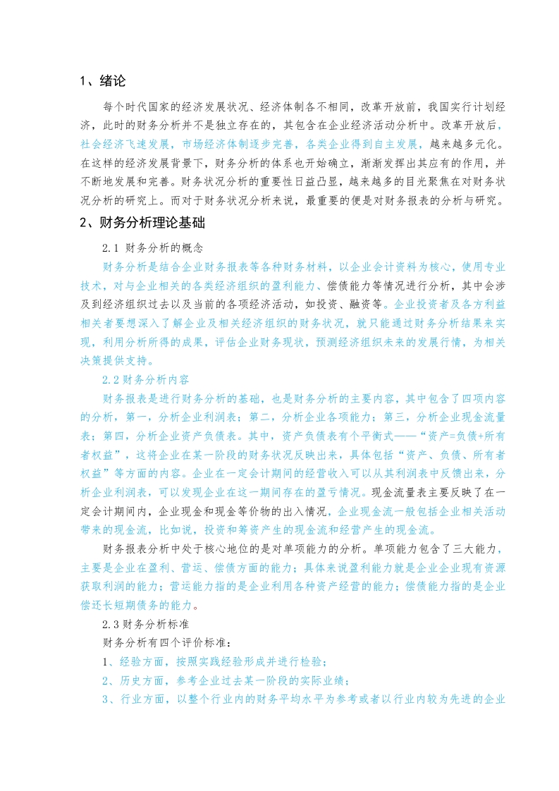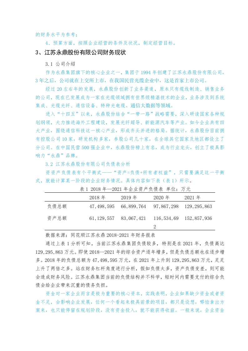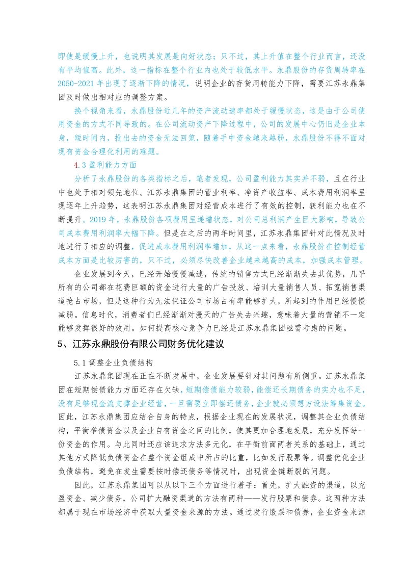 江苏永鼎股份有限公司的财务报表分析Xxx摘要:企业未来发展方向如何、应采取哪些发展战略、怎样更加高效地进行经营管理,上述问题的解决都有赖于对企业整体财务经营情况的研究,而企业财务报表是了解这一切的根本。对于任何企业而言,财务报表都是极为重要的,所以,企业经营管理要重视财务报表,合理利用,为企业其它工作的发展提供助力。本文选取江苏永鼎股份有限公司为研究样本。对其财务报表进行分析,为公司决策者的决策提供更科学的依据。但是仅仅通过对江苏永鼎有限公司的财务报表数据来直接进行分析,已经满足不了公司经济发展的要求,无法对整个公司经营状况、成果以及现金流量进行一个完整的说明。因此,从各个角度、使用不同分析方法,系统地分析企业财务报表,找出现存的问题,并帮助公司决策者制定更好更适宜的决策,以促使企业得到良好的发展,是本文的一个主要研究内容。分析永鼎公司的财务报表,了解其财务状况,对企业整体财务经营情况有认知,针对其中存在的各种各样的问题,提出针对性较强的解决方案,帮助企业找到最合适的发展道路,增强企业经营管理的时效性,确保企业各项工作能够按照预定目标发展,让企业核心能力得到发展,从而保持江苏永鼎企业在行业中竞争力。关链词:上市公司;财务状况;财务报表目录1、绪论...22、财务分析理论基础...22.1财务分析的概念....22.2财务分析内容......22.3财务分析标准.......23、江苏永鼎股份有限公司财务现状...33.1公司介绍.....33.2江苏永鼎股份有限公司负债表分析.…·33.3江苏永鼎股份有限公司利润表分析..…43.4江苏永鼎股份有限公司现金流量表分析..44、江苏永鼎股份有限公司财务中存在的问题..·..。54.1偿债能力方面...54.2营运能力方面....…54.3盈利能力方面..........65、江苏永鼎股份有限公司财务优化建议..65.1调整企业负债结构.....65.2加强资金使用率......5.3实现资金筹措方式多样化.结论……8参考文献...91、绪论每个时代国家的经济发展状况、经济体制各不相同,改革开放前,我国实行计划经济,此时的财务分析并不是独立存在的,其包含在企业经济活动分析中。改革开放后,社会经济飞速发展,市场经济体制逐步完善,各类企业得到自主发展,越来越多元化。在这样的经济发展背景下,财务分析的体系也开始确立,渐渐发挥出其应有的作用,并不断地发展和完善。财务状况分析的重要性日益凸显,越来越多的目光聚焦在对财务状况分析的研究上。而对于财务状况分析来说,最重要的便是对财务报表的分析与研究。2、财务分析理论基础2.1财务分析的概念财务分析是结合企业财务报表等各种财务材料,以企业会计资料为核心,使用专业技术,对与企业相关的各类经济组织的盈利能力、偿债能力等情况进行分析,其中会涉及到经济组织过去以及当前的各项经济活动,如投资、融资等。企业投资者及各方利益相关者要想深入了解企业及相关经济组织的财务状况,就只能通过财务分析结果来实现,利用分析所得的成果,评估企业财务现状,预测经济组织未来的发展行情,为相关决策提供支持。2.2财务分析内容财务报表是进行财务分析的基础,也是财务分析的主要内容,其中包含了四项内容的分析,第一,分析企业利润表:第二,分析企业各项能力:第三,分析企业现金流量表:第四,分析企业资产负债表。其中,资产负债表有个平衡式一一“资产=负债+所有者权益”,这将企业在某一阶段的财务状况反映出来,具体包括“资产、负债、所有者权益”等方面的内容。企业在一定会计期间的经营收入可以从其利润表中反馈出来,分析企业利润表,可以发现企业在这一期间存在的盈亏情况。现金流量表主要反映了在一定会计期间内,企业现金和现金等价物的出入情况,企业现金流一般包括企业相关活动带来的现金流,比如说,投资和筹资产生的现金流和经营产生的现金流。财务报表分析中处于核心地位的是对单项能力的分析。单项能力包含了三大能力,主要是企业在盈利、营运、偿债方面的能力:具体来说盈利能力就是企业企业现有资源获取利润的能力:营运能力指的是企业利用各种资产经营的能力:偿债能力指的是企业偿还长短期债务的能力。2.3财务分析标准财务分析有四个评价标准:1、经验方面,按照实践经验形成并进行检验:2、历史方面,参考企业过去某一阶段的实际业绩:3、行业方面,以整个行业内的财务平均水平为参考或者以行业内较为先进的企业的财务水平为参考:4、预算方面,按照企业经营的条件及状况,制定经营目标。3、江苏永鼎股份有限公司财务现状3.1公司介绍作为永鼎集团旗下的核心企业之一,集团于1994年创建了江苏永鼎股份有限公司,3年之后,公司就在上交所上市,在我国民营光缆企业中,这是首家上市公司。经过20左右年的发展,永鼎股份创新了业务渠道,原本只有缆线制造、销售业务的公司,现在已发展成为一家在光缆领域拥有世界级精湛技术的企业,业务涉及到系统集成、光缆光纤、通信设备、特种光电缆、通信大数据等领域。进入“十四五”以来,永鼎股份结合“一带一路”战略需要,深入研读国家各种规划纲领,大力推进海外工程建设,发展光纤超导、新能源汽车等产业。如今企业共有四大产业,围绕通信科技这一核心产业,形成齐头并进的格局。据统计,永鼎股份目前拥有控股公