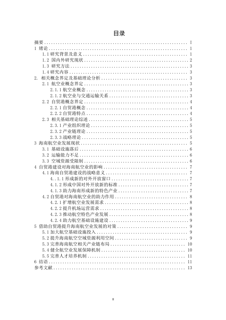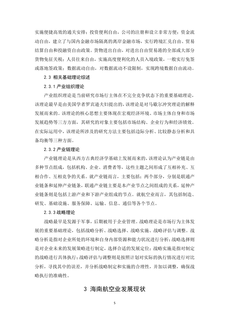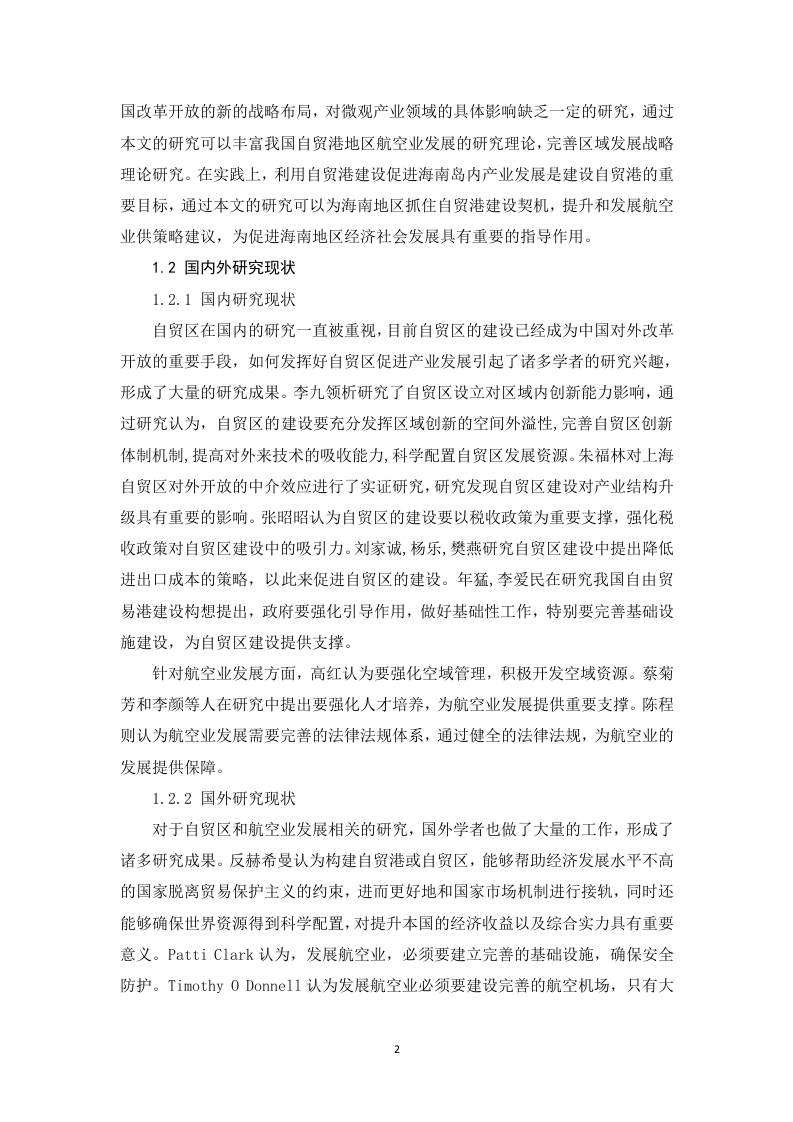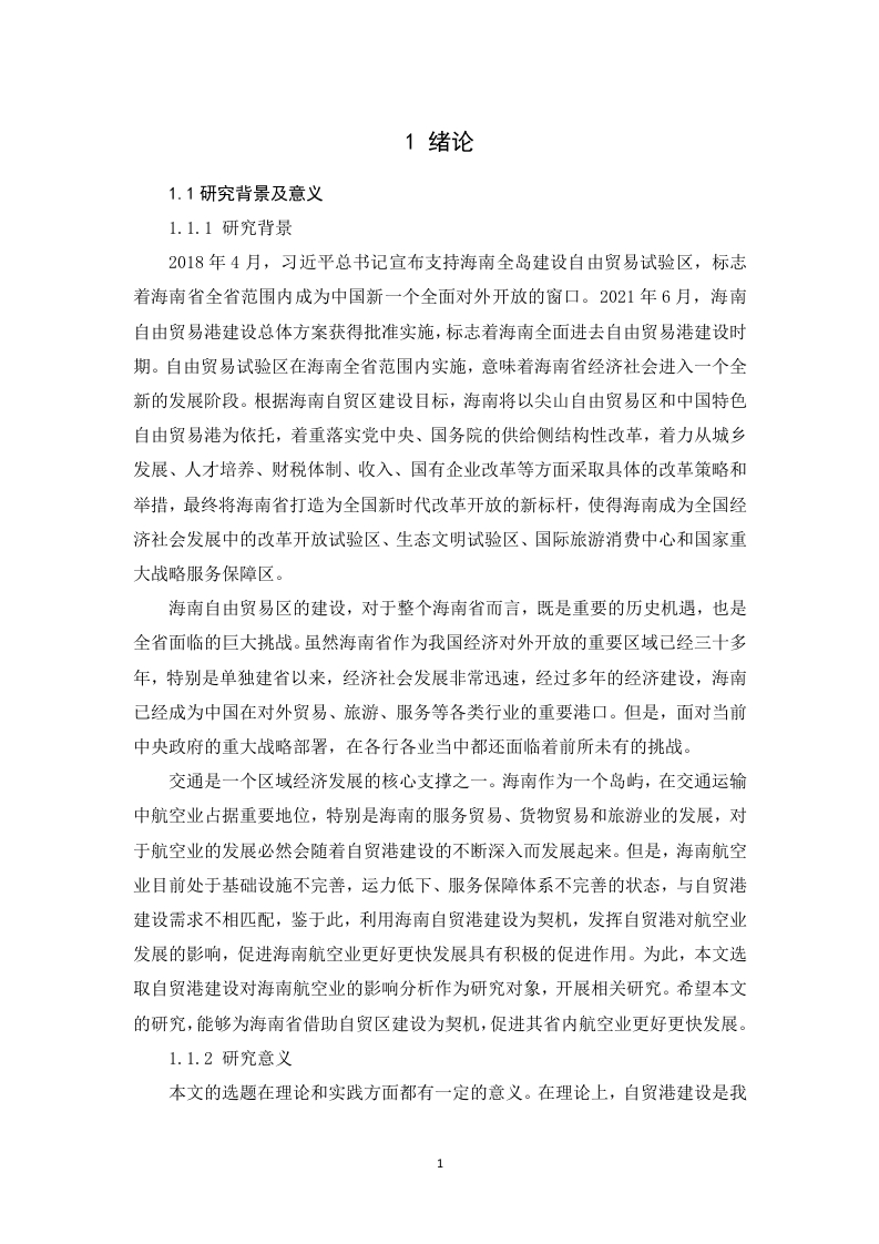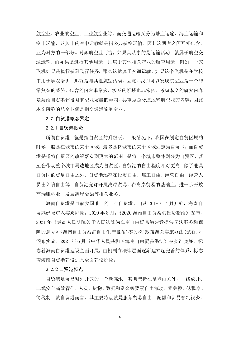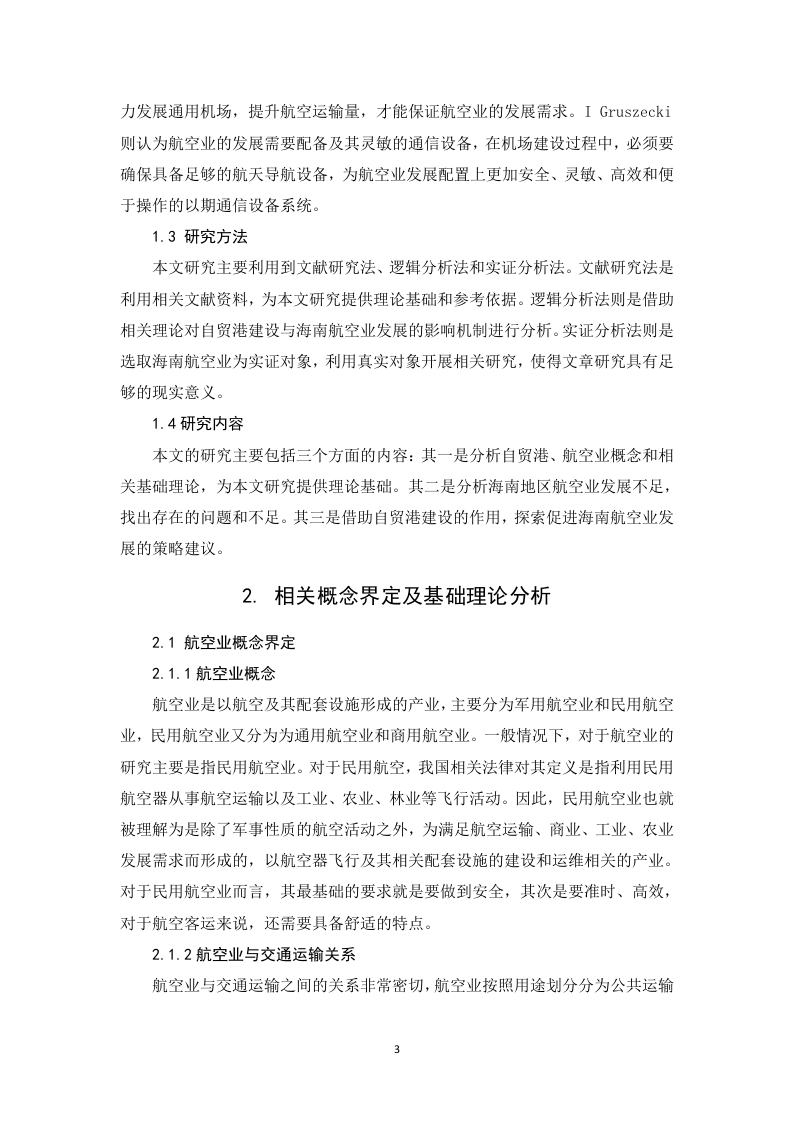 自贸港建设对海南航空业的影响分析摘要2018年4月,海南自贸港建设正式开始,标志着海南全域范围内对外开放的开始。在自贸港建设的大背景之下,海南地区各类产业都将会迎来重要的发展机遇。由于海南地区特殊的地理位置和环境资源特点,导致海南地区交通运输业中很大程度上要依赖航空业,因此航空业就决定了海南地区相当一部分物流运输能力。因此,海南自贸港的建设,对于海南航空业的发展既是一次难得机遇,同时也对海南地区航空业形成了很大的挑战,海南航空业的发展对于自贸港的建设有至关重要的影响。鉴于此,本文选取自贸港建设对海南航空业的影响作为分析研究对象,在总结分析相关基本概念和基础理论基础上,并结合当前国内外学者的研究成果对海南航空业在自贸港建设背景下的发展进行分析。通过研究发现,海南航空业存在基础设施落后、运输能力不足、空域资源受限严重等问题。由于自贸港的建设,对海南航空业发展提出了扩增发展、提升机场运营、发展特色产业和完善基础设施的需求,为了全面利用完善的航空业,促进海南自贸港建设,本文提出海南必须要加大航空业基础设施建设,完善空域资源利用和产业布局,健全航空业发展保障机制,提升人才培养等策略建议,以期为加快航空业高质量发展提供知道。关键词:海南自贸港:航空业;影响分析:策略建议目录摘要1绪论..11.1研究背景及意义11.2国内外研究现状1.3研究方法.....1.4研究内容.……………32.相关概念界定及基础理论分析...............32.1航空业概念界定.·032.1.1航空业概念…32.1.2航空业与交通运输关系…32.2自贸港概念界定......…42.2.1自贸港概念…42.2.2自贸港特点…42.3相关基础理论综述。。。2.3.1产业组织理论52.3.2产业链理论....…52.3.3战略理论..…3海南航空业发展现状53.1基础设施落后。。63.2运输能力不足3.3空域资源受限制...64自贸港建设对海南航空业的影响.74.1海南自贸港建设的战略意义。。74..1.1形成新的对外开放窗口..74.1.2形成中国对外开放新的标准…74.1.3助力海南形成新的特色产业…74.2自贸港对海南航空业的助力作用..84.2.1扩增航空业发展需求…84.2.2提升机场运营需求....…84.2.3推动航空特色产业发展…84.2.4助力航空基础设施建设5借助自贸港提升海南航空业发展的对策95.1加大航空基础设施投入.....95.2提升海南航空空域资源利用空间.................95.3完善海南航空相关产业链布局.105.4健全航空业发展保障机制....105.5完善人才培养机制.....116结语…11参考文献……131绪论1.1研究背景及意义1.1.1研究背景2018年4月,习近平总书记宣布支持海南全岛建设自由贸易试验区,标志着海南省全省范围内成为中国新一个全面对外开放的窗口。2021年6月,海南自由贸易港建设总体方案获得批准实施,标志着海南全面进去自由贸易港建设时期。自由贸易试验区在海南全省范围内实施,意味着海南省经济社会进入一个全新的发展阶段。根据海南自贸区建设目标,海南将以尖山自由贸易区和中国特色自由贸易港为依托,着重落实党中央、国务院的供给侧结构性改革,着力从城乡发展、人才培养、财税体制、收入、国有企业改革等方面采取具体的改革策略和举措,最终将海南省打造为全国新时代改革开放的新标杆,使得海南成为全国经济社会发展中的改革开放试验区、生态文明试验区、国际旅游消费中心和国家重大战略服务保障区。海南自由贸易区的建设,对于整个海南省而言,既是重要的历史机遇,也是全省面临的巨大挑战。虽然海南省作为我国经济对外开放的重要区域已经三十多年,特别是单独建省以来,经济社会发展非常迅速,经过多年的经济建设,海南已经成为中国在对外贸易、旅游、服务等各类行业的重要港口。但是,面对当前中央政府的重大战略部署,在各行各业当中都还面临着前所未有的挑战。交通是一个区域经济发展的核心支撑之一。海南作为一个岛屿,在交通运输中航空业占据重要地位,特别是海南的服务贸易、货物贸易和旅游业的发展,对于航空业的发展必然会随着自贸港建设的不断深入而发展起来。但是,海南航空业目前处于基础设施不完善,运力低下、服务保障体系不完善的状态,与自贸港建设需求不相匹配,鉴于此,利用海南自贸港建设为契机,发挥自贸港对航空业发展的影响,促进海南航空业更好更快发展具有积极的促进作用。为此,本文选取自贸港建设对海南航空业的影响分析作为研究对象,开展相关研究。希望本文的研究,能够为海南省借助自贸区建设为契机,促进其省内航空业更好更快发展。1.1.2研究意义本文的选题在理论和实践方面都有一定的意义。在理论上,自贸港建设是我1国改革开放的新的战略布局,对微观产业领域的具体影响缺乏一定的研究,通过本文的研究可以丰富我国自贸港地区航空业发展的研究理论,完善区域发展战略理论研究。在实践上,利用自贸港建设促进海南岛内产业发展是建设自贸港的重要目标,通过本文的研究可以为海南地区抓住自贸港建设契机,提升和发展航空业供策略建议,为促进海南地区经济社会发展具有重要的指导作用。1.2国内外研究现状1.2.1国内研究现状自贸区在国内的研究一直被重视,目前自贸区的建设已经成为中国对外改革开放的重要手段,如何发挥好自贸区促进产业发展引起了诸多学者的研究兴趣,形成了大量的