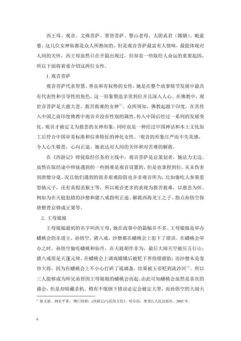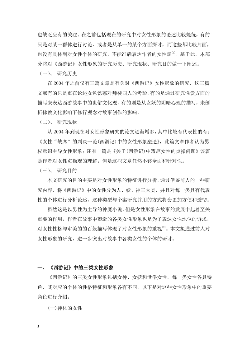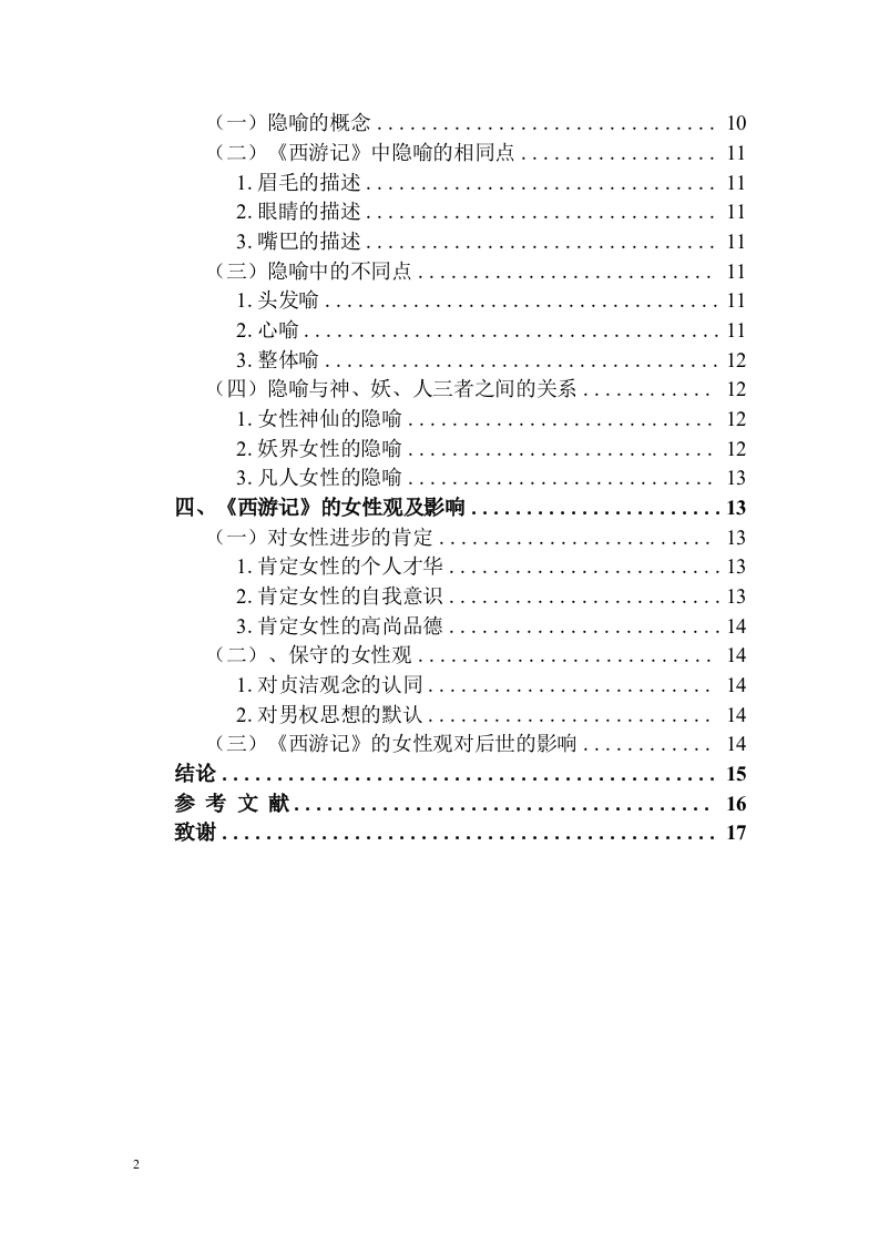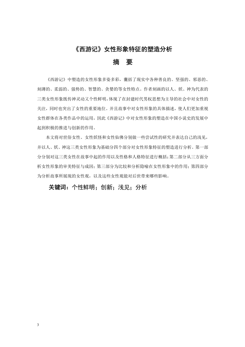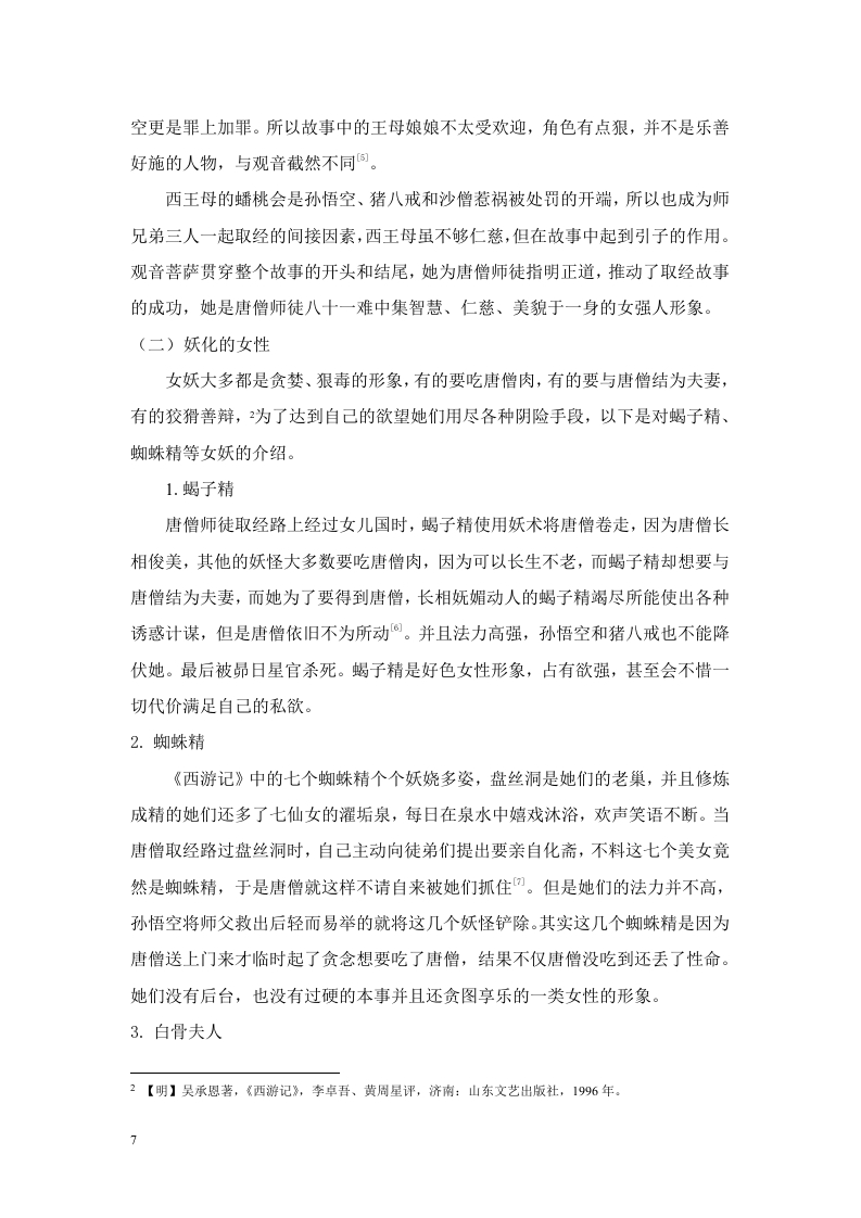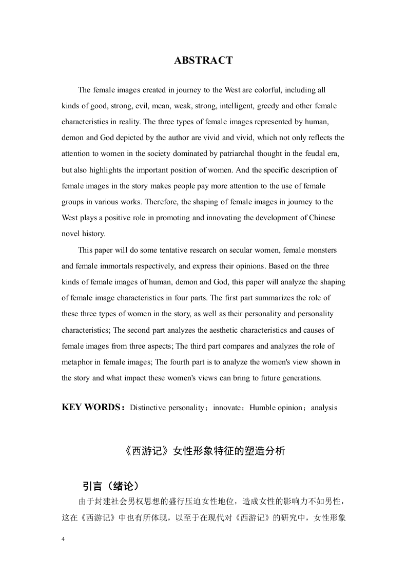 《西游记》中女性形象特征的塑造分析目录摘要..4Abstract.···4《西游记》女性形象特征的塑造分析......5引言(绪论)…5一、《西游记》中的三类女性形象(宋体小四号字加粗)··5(一)神化的女性51.观音菩萨52.王母娘娘6(二)妖化的女性61.蝎子精.62.蜘蛛精.63.白骨夫人74.玉面狐狸7(三)凡人女性.71.女儿国国王..72.高翠兰等平凡女性....8二、《西游记》中女性形象的审美特征及成因8(一)审美特征81.象征化82.人性化..83.个性化..8(二)、人、妖、神的审美特征81.凡人女性的形象与审美特征82.妖界女性的形象与审美特征93.女性神仙的形象与审美特征..…9(三)审美成因...101.佛教的影响...102.道教的影响...103.儒家的影响...10三、《西游记》女性形象描述的隐喻..........101(一)隐喻的概念..·.·10(二)《西游记》中隐喻的相同点..·..·111.眉毛的描述..112.眼睛的描述...113.嘴巴的描述...11(三)隐喻中的不同点111.头发喻.112.心喻..113.整体喻...12(四)隐喻与神、妖、人三者之间的关系121.女性神仙的隐喻...122.妖界女性的隐喻...123.凡人女性的隐喻.....13四、《西游记》的女性观及影响.·.13(一)对女性进步的肯定.·131.肯定女性的个人才华...132.肯定女性的自我意识..·133.肯定女性的高尚品德...14(二)、保守的女性观..141.对贞洁观念的认同.......·..·.·.142.对男权思想的默认14(三)《西游记》的女性观对后世的影响14结论....15参考文献..16致谢.…。172《西游记》女性形象特征的塑造分析摘要《西游记》中塑造的女性形象多姿多彩,囊括了现实中各种善良的、坚强的、邪恶的、刻薄的、柔弱的、强势的、智慧的、贪婪的等女性特点。作者刻画的以人、妖、神为代表的三类女性形象既传神灵动又个性鲜明,体现了在封建时代男权思想为主导的社会中对女性的关注,同时也突出了女性的重要地位。并且故事中对女性形象的具体描述,使人们更加重视女性群体在各类作品中的运用,因此《西游记》中对女性形象的塑造在中国小说史的发展中起到积极的推进与创新的作用。本文将对世俗女性、女性妖怪和女性仙佛分别做一些尝试性的研究并表达自己的浅见,并以人、妖、神这三类女性形象为基础分四个部分对女性形象特征的塑造进行分析。第一部分分别对这三类女性在故事中起的作用以及性格和人格特征进行概括:第二部分从三方面分析女性形象的审美特征与成因:第三部分为比较和分析隐喻在女性形象中的作用:第四部分为分析故事所展现的女性观,以及这些女性观能对后世带来哪些影响。关键词:个性鲜明;创新;浅见;分析2ABSTRACTThe female images created in journey to the West are colorful,including allkinds of good,strong,evil,mean,weak,strong,intelligent,greedy and other femalecharacteristics in reality.The three types of female images represented by human,demon and God depicted by the author are vivid and vivid,which not only reflects theattention to women in the society dominated by patriarchal thought in the feudal era,but also highlights the important position of women.And the specific description offemale images in the story makes people pay more attention to the use of femalegroups in various works.Therefore,the shaping of female images in journey to theWest plays a positive role in promoting and innovating the development of Chinesenovel history.This paper will do some tentative research on secular women,female monstersand female immortals respectively,and express their opinions.Based on the threekinds of female images of human,demon and God,this paper will analyze the shapingof female image characteristics in four parts.The first part summarizes the role ofthese three types of women in the story,as well as their personality and personalitycharacteristics;The second part analyzes the aesthetic characteristics and causes offemale images from three aspects;The third part compares and analyzes the role ofmetaphor in female images;The fourth part is to analyze the women's view shown inthe story and what impact these women's views can bring to future generations.KEY WORDS:Distinctive personality:innovate:Humble opinion:analysis《西游记》女性形象特征的塑造分析引言(绪论)由于封建社会男权思想的盛行压迫女性地位,造成女性的影响力不如男性,这在《西游记》中也有所体现,以至于在现代对《西游记》的研究中,女性形象4