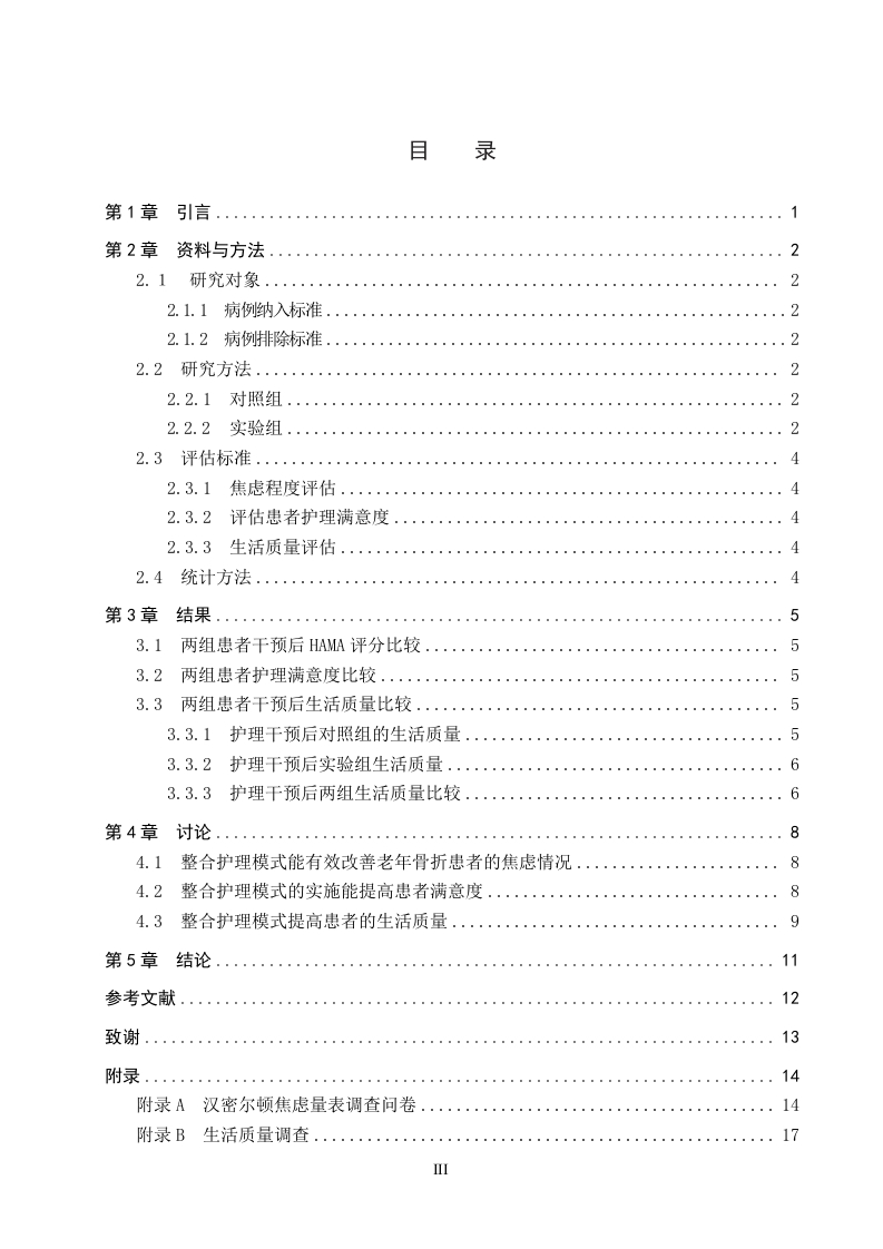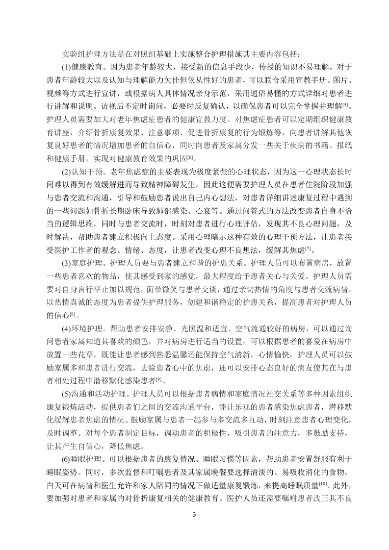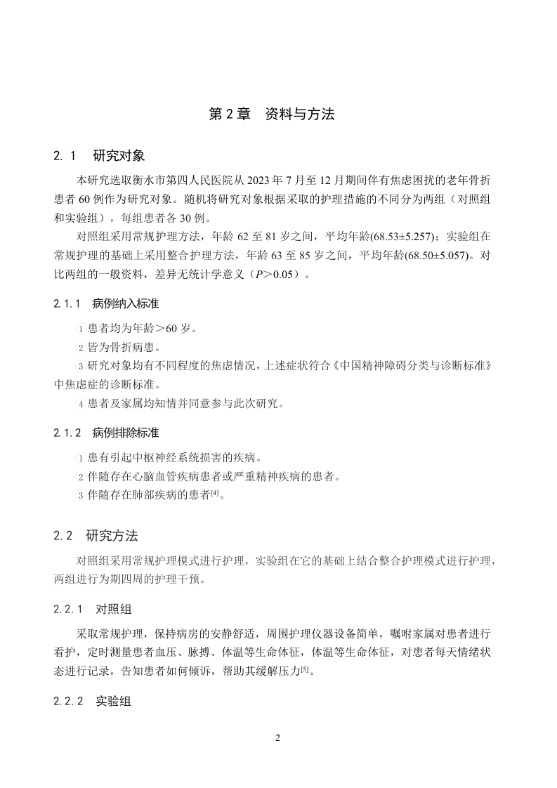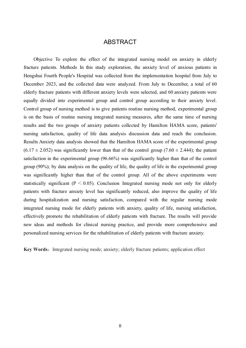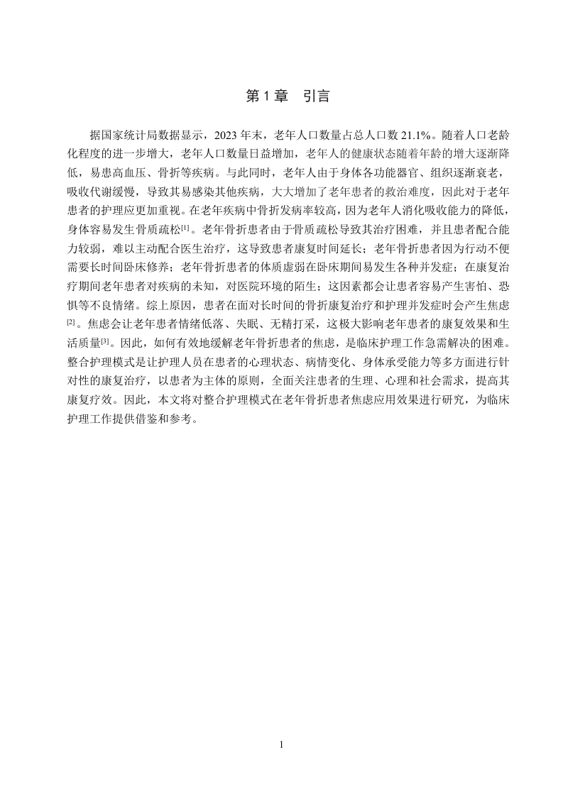 整合护理模式在老年骨折焦虑患者中的应用效果研究摘要目的探究整合护理模式的实施在老年骨折患者焦虑问题方面上的应用效果。方法收集衡水市第四人民医院从2023年7月至12月期间老年骨折住院人员中焦虑患者60例作为研究对象,将研究对象分为实验组和对照组。对照组给予常规护理方法,实验组在常规护理的基础上进行整合护理措施,将干预后两组患者所得HMA评分、满意度、生活质量数据展开分析并得出结论。结果数据显示,实验组HAMA评分(6.17±2.052)明显低于对照组(7.60±2.444);实验组患者满意度(96.66%)明显高于对照组满意度(90%):实验组的生活质量明显高于对照组。以上实验差异都具有统计学意义(P<0.05)。结论整合护理模式可以降低老年骨折患者焦虑水平,提高患者在住院期间的生活质量和护理满意度。研究结果将为临床护理实践提供新的思路和方法,为老年骨折焦虑患者的康复提供更全面、个性化的护理服务。关键词:整合护理模式:焦虑:老年骨折患者:应用效果ABSTRACTObjective To explore the effect of the integrated nursing model on anxiety in elderlyfracture patients.Methods In this study exploration,the anxiety level of anxious patients inHengshui Fourth People's Hospital was collected from the implementation hospital from July toDecember 2023,and the collected data were analyzed.From July to December,a total of 60elderly fracture patients with different anxiety levels were selected,and 60 anxiety patients wereequally divided into experimental group and control group according to their anxiety level.Control group of nursing method is to give patients routine nursing method,experimental groupis on the basis of routine nursing integrated nursing measures,after the same time of nursingresults and the two groups of anxiety patients collected by Hamilton HAMA score,patients'nursing satisfaction,quality of life data analysis discussion data and reach the conclusion.Results Anxiety data analysis showed that the Hamilton HAMA score of the experimental group(6.17 +2.052)was significantly lower than that of the control group (7.60 2.444);the patientsatisfaction in the experimental group (96.66%)was significantly higher than that of the controlgroup(90%);by data analysis on the quality of life,the quality of life in the experimental groupwas significantly higher than that of the control group.All of the above experiments werestatistically significant (P<0.05).Conclusion Integrated nursing mode not only for elderlypatients with fracture anxiety level has significantly reduced,also improve the quality of lifeduring hospitalization and nursing satisfaction,compared with the regular nursing modeintegrated nursing mode for elderly patients with anxiety,quality of life,nursing satisfaction,effectively promote the rehabilitation of elderly patients with fracture.The results will providenew ideas and methods for clinical nursing practice,and provide more comprehensive andpersonalized nursing services for the rehabilitation of elderly patients with fracture anxiety.Key Words:Integrated nursing mode;anxiety;elderly fracture patients;application effect目录第1章引言.…1第2章资料与方法22.1研究对象2.1.1病例纳入标准.......22.1.2病例排除标准..22.2研究方法....22.2.1对照组..22.2.2实验组....22.3评估标准...…42.3.1焦虑程度评估..·42.3.2评估患者护理满意度42.3.3生活质量评估42.4统计方法....4第3章结果.…53.1两组患者干预后HAMA评分比较53.2两组患者护理满意度比较...53.3两组患者干预后生活质量比较..53.3.1护理干预后对照组的生活质量53.3.2护理干预后实验组生活质量.63.3.3护理干预后两组生活质量比较.....第4章讨论...64.1整合护理模式能有效改善老年骨折患者的焦虑情况.·84.2整合护理模式的实施能提高患者满意度.·4.3整合护理模式提高患者的生活质量9第5章结论.......11参考文献12致谢.13附录14附录A汉密尔顿焦虑量表调查问卷..14附录B生活质量调查.17Ⅲ