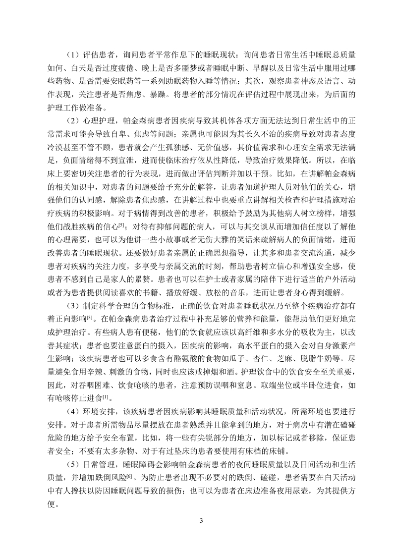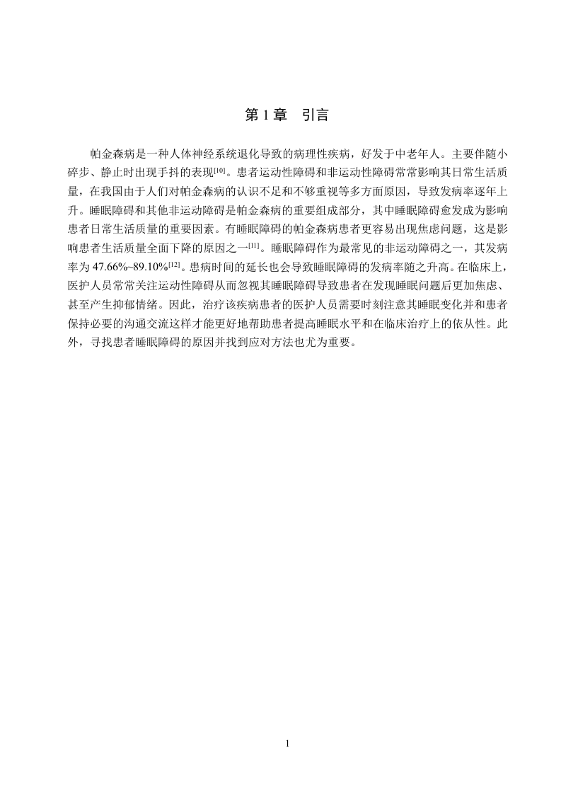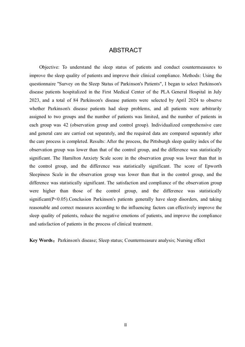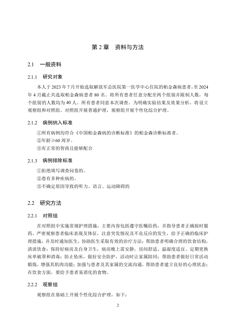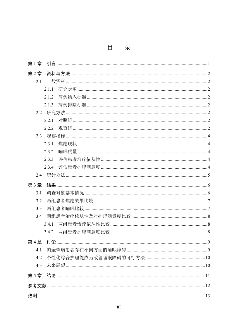 帕金森患者睡眠状况的调查分析及对策研究摘要目的:了解帕金森病患者睡眠状况进行对策研究以改善患者睡眠质量并提高患者在临床上的依从性和满意度。方法:本人于2023年7月开始选取解放军总医院第一医学中心住院的帕金森病患者,至2024年4月截止共选取帕金森病患者80名,观察帕金森病患者是否存在睡眠问题,将所有患者任意分配至两个组别并限制人数,每个组别的人数均为人(观察组、对照组)。分别进行个性化综合护理和普通护理,护理进程结束后,分别比较所需数据。结果:进程结束后,观察组患者的匹兹堡睡眠质量指数低于对照组,差异具有统计学意义:观察组汉密尔顿焦虑量表分数低于对照组,差异具有统计学意义:观察组Epworth嗜睡量表分数低于对照组,差异具有统计学意义:观察组满意度及依从性高于对照组,差异有统计学意义(P<0.O5)。结论:帕金森病患者普遍有睡眠障碍,针对其影响因素采取合理正确的措施,可以有效提高睡眠质量,减少患者负面情绪,提高患者在临床治疗过程中的依从性和满意度。关键词:帕金森病:睡眠现状:对策分析;护理效果ABSTRACTObjective:To understand the sleep status of patients and conduct countermeasures toimprove the sleep quality of patients and improve their clinical compliance.Methods:Using thequestionnaire "Survey on the Sleep Status of Parkinson's Patients",I began to select Parkinson'sdisease patients hospitalized in the First Medical Center of the PLA General Hospital in July2023,and a total of 84 Parkinson's disease patients were selected by April 2024 to observewhether Parkinson's disease patients had sleep problems,and all patients were arbitrarilyassigned to two groups and the number of patients was limited,and the number of patients ineach group was 42 (observation group and control group).Individualized comprehensive careand general care are carried out separately,and the required data are compared separately afterthe care process is completed.Results:After the process,the Pittsburgh sleep quality index of theobservation group was lower than that of the control group,and the difference was statisticallysignificant.The Hamilton Anxiety Scale score in the observation group was lower than that inthe control group,and the difference was statistically significant.The score of EpworthSleepiness Scale in the observation group was lower than that in the control group,and thedifference was statistically significant.The satisfaction and compliance of the observation groupwere higher than those of the control group,and the difference was statisticallysignificant(P<0.05).Conclusion Parkinson's patients generally have sleep disorders,and takingreasonable and correct measures according to the influencing factors can effectively improve thesleep quality of patients,reduce the negative emotions of patients,and improve the complianceand satisfaction of patients in the process of clinical treatment.Key Words:Parkinson's disease;Sleep status;Countermeasure analysis;Nursing effectⅡ目录第1章引言…第2章资料与方法22.1一般资料。2.1.1研究对象.22.1.2病例纳入标准.22.1.3病例排除标准22.2研究方法。.22.2.1对照组…22.2.2观察组.22.3观察指标。42.3.1焦虑现状….42.3.2睡眠质量.42.3.3评估患者治疗依从性.42.3.4评估患者护理满意度.42.4统计方法.…5第3章结果.63.1调查对象基本情况63.2两组患者焦虑效果比较…3.3两组患者睡眠比较73.4两组患者治疗依从性及对护理满意度比较.83.4.1两组患者治疗依从性比较.83.4.2两组患者护理满意度比较.8第4章讨论.….94.1帕金森病患者存在不同方面的睡眠障碍94.2个性化综合护理能成为改善睡眠障碍的可行方法,.10104.3米来展望.10第5章结论.11参考文献.12致谢.13面附录14附录A帕金森病患者睡眠现状调查14附录B汉密尔顿焦虑量表调查16IV