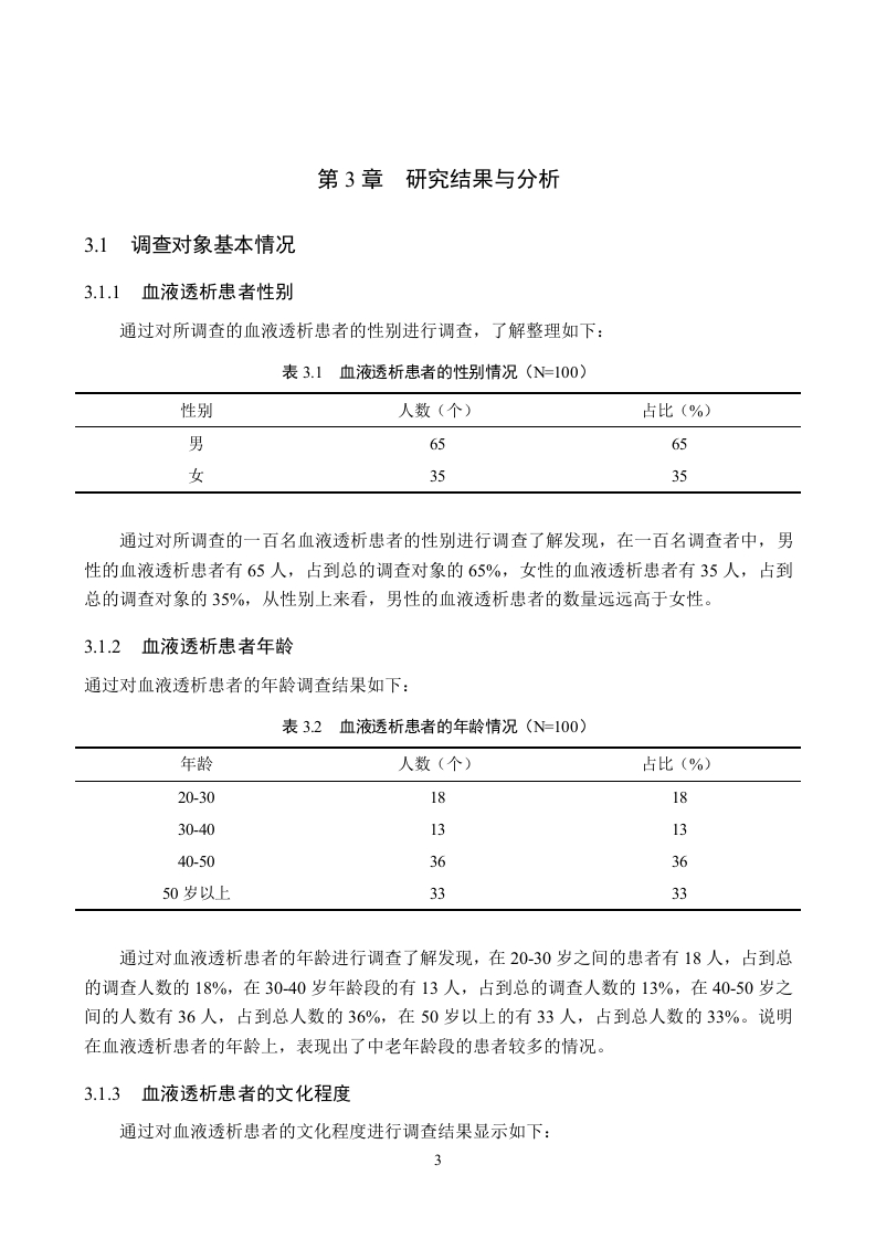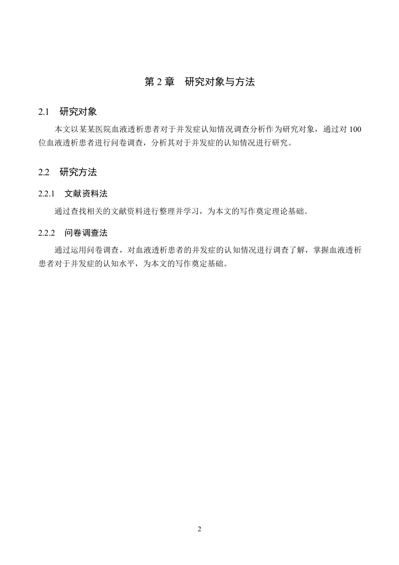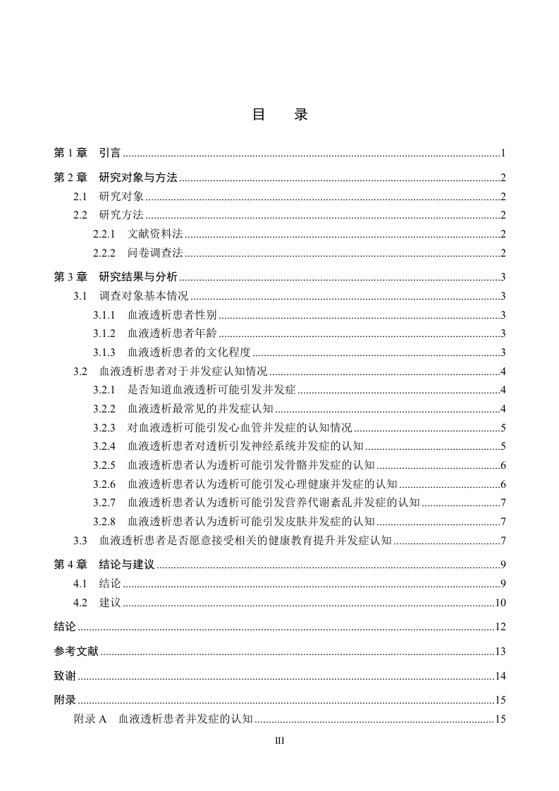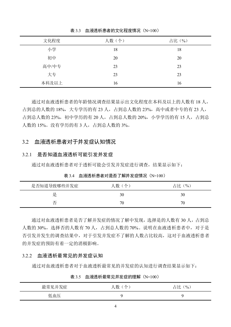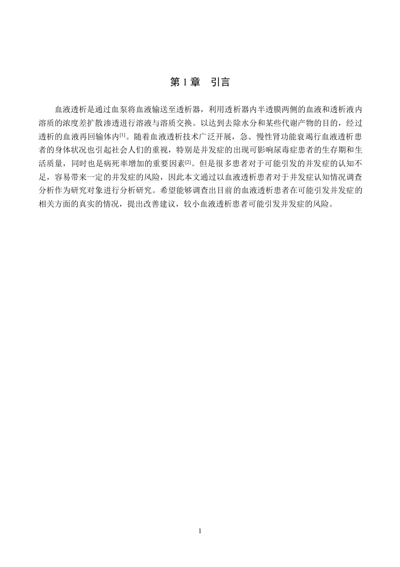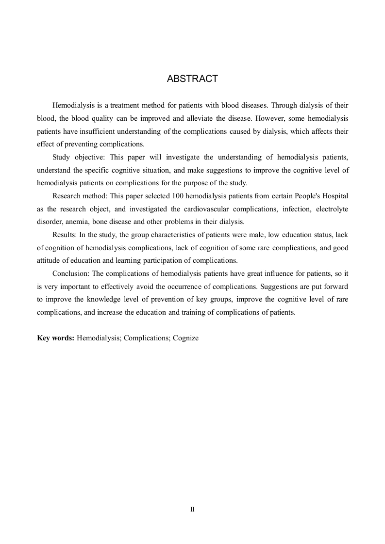 血液透析患者对于并发症认知情况调查分析摘要血液透析是对血液病患者的一种治疗方法,通过对其血液进行透析,能够提升其血液质量,缓解病情。但是一些血液透析患者对于透析带来的并发症的了解不足,影响其预防并发症的效果。研究目的:本文以探索血液透析患者对于血液透析带来的并发症的了解情况进行调查,了解具体的认知情况,为提升血液透析患者对并发症的认知水平提出建议为研究目的进行分析研究。研究方法:本文通过运用文献资料法与问卷调查法选取某某人民医院的100例血液透析患者作为研究对象,针对他们透析中出现的心血管并发症、感染、电解质紊乱、贫血、骨病等问题进行调查研究。研究结果:研究中发现患者的群体特征表现为男性、低学历等状态、患者对血液透析并发症的认知情况不足、对于一些少见的并发症的认知欠缺、对并发症的认知的教育学习参与态度良好等问题。结论:血液透析患者的并发症对于患者来说,影响是巨大的,因此如何能够有效的避免并发症的发生,是十分重要的,提出了提升重点群体的预防知识水平、提升对于少见的并发症的认知水平、增加对患者的并发症的教育培训等建议。关键词:血液透析:并发症;认知IABSTRACTHemodialysis is a treatment method for patients with blood diseases.Through dialysis of theirblood,the blood quality can be improved and alleviate the disease.However,some hemodialysispatients have insufficient understanding of the complications caused by dialysis,which affects theireffect of preventing complications.Study objective:This paper will investigate the understanding of hemodialysis patients,understand the specific cognitive situation,and make suggestions to improve the cognitive level ofhemodialysis patients on complications for the purpose of the study.Research method:This paper selected 100 hemodialysis patients from certain People's Hospitalas the research object,and investigated the cardiovascular complications,infection,electrolytedisorder,anemia,bone disease and other problems in their dialysis.Results:In the study,the group characteristics of patients were male,low education status,lackof cognition of hemodialysis complications,lack of cognition of some rare complications,and goodattitude of education and learning participation of complications.Conclusion:The complications of hemodialysis patients have great influence for patients,so itis very important to effectively avoid the occurrence of complications.Suggestions are put forwardto improve the knowledge level of prevention of key groups,improve the cognitive level of rarecomplications,and increase the education and training of complications of patients.Key words:Hemodialysis;Complications;Cognize目录第1章引言.第2章研究对象与方法22.1研究对象22.2研究方法…22.2.1文献资料法..22.2.2问卷调查法2第3章研究结果与分析.33.1调查对象基本情况.33.1.1血液透析患者性别.33.1.2血液透析患者年龄….33.1.3血液透析患者的文化程度.…33.2血液透析患者对于并发症认知情况43.2.1是否知道血液透析可能引发并发症43.2.2血液透析最常见的并发症认知.43.2.3对血液透析可能引发心血管并发症的认知情况…53.2.4血液透析患者对透析引发神经系统并发症的认知.53.2.5血液透析患者认为透析可能引发骨骼并发症的认知63.2.6血液透析患者认为透析可能引发心理健康并发症的认知63.2.7血液透析患者认为透析可能引发营养代谢紊乱并发症的认知.73.28血液透析患者认为透析可能引发皮肤并发症的认知73.3血液透析患者是否愿意接受相关的健康教育提升并发症认知7第4章结论与建议94.1结论94.2建议.10结论12参考文献.13致谢….14附录.15附录A血液透析患者并发症的认知.15第1章引言血液透析是通过血泵将血液输送至透析器,利用透析器内半透膜两侧的血液和透析液内溶质的浓度差扩散渗透进行溶液与溶质交换。以达到去除水分和某些代谢产物的目的,经过透析的血液再回输体内山。随着血液透析技术广泛开展,急、慢性肾功能衰竭行血液透析患者的身体状况也引起社会人们的重视,特别是并发症的出现可影响尿毒症患者的生存期和生活质量,同时也是病死率增加的重要因素]。但是很多患者对于可能引发的并发症的认知不足,容易带来一定的并发症的风险,因此本文通过以血液透析患者对于并发症认知情况调查分析作为研究对象进行分析研究。希望能够调查出目前的血液透析患者在可能引发并发症的相关方面的真实的情况,提出改善建议,较小血液透析患者可能引发并发症的风险。1