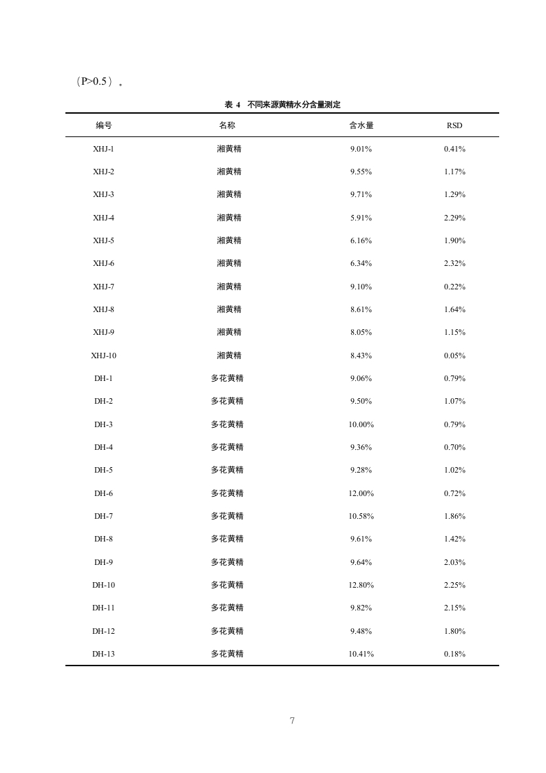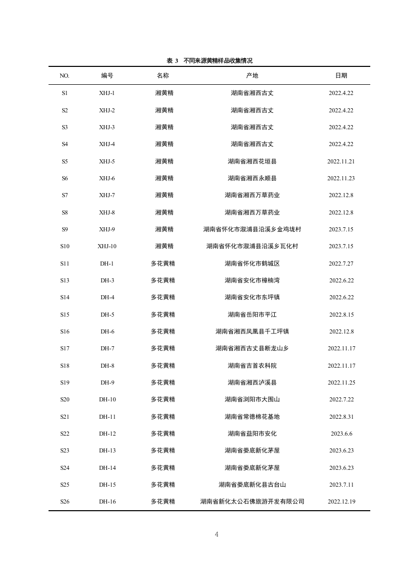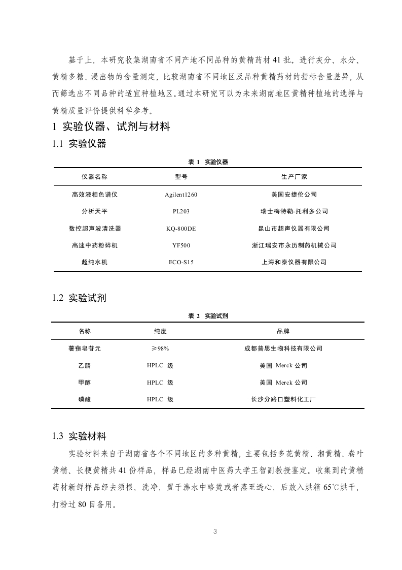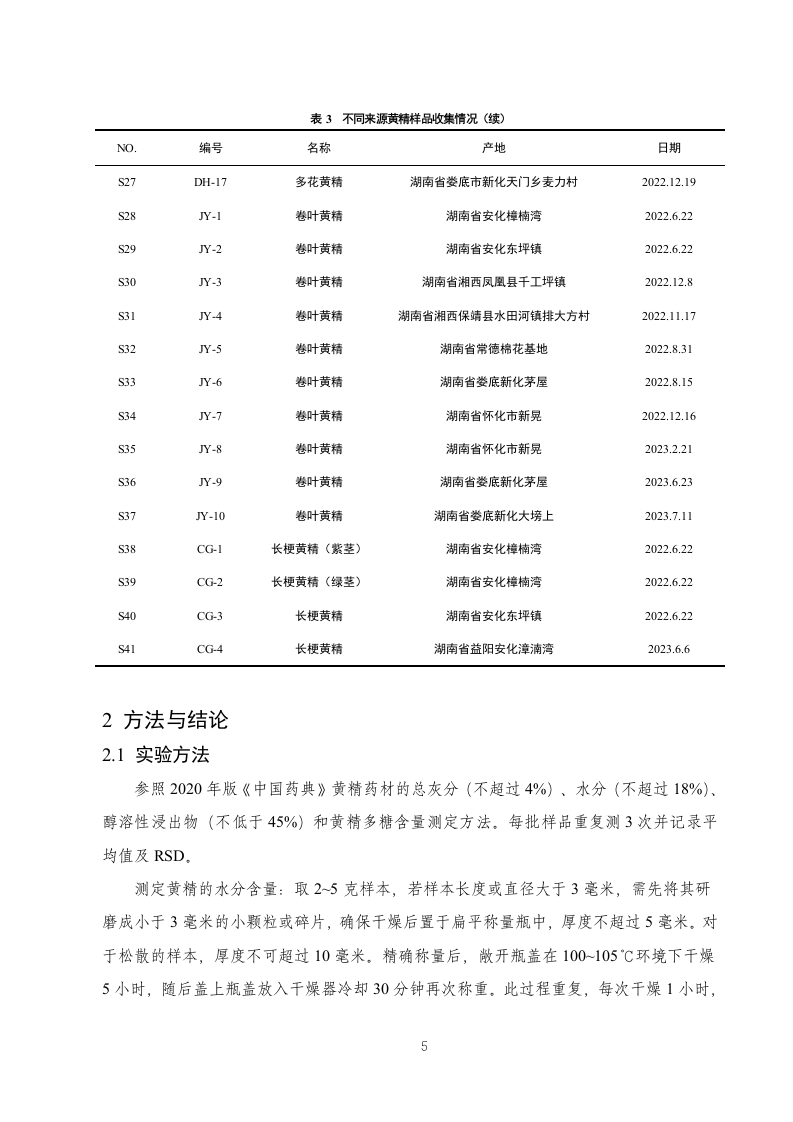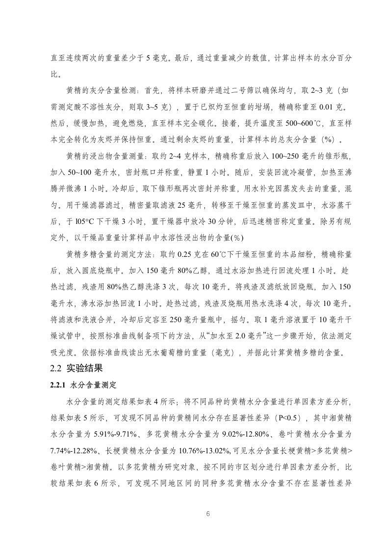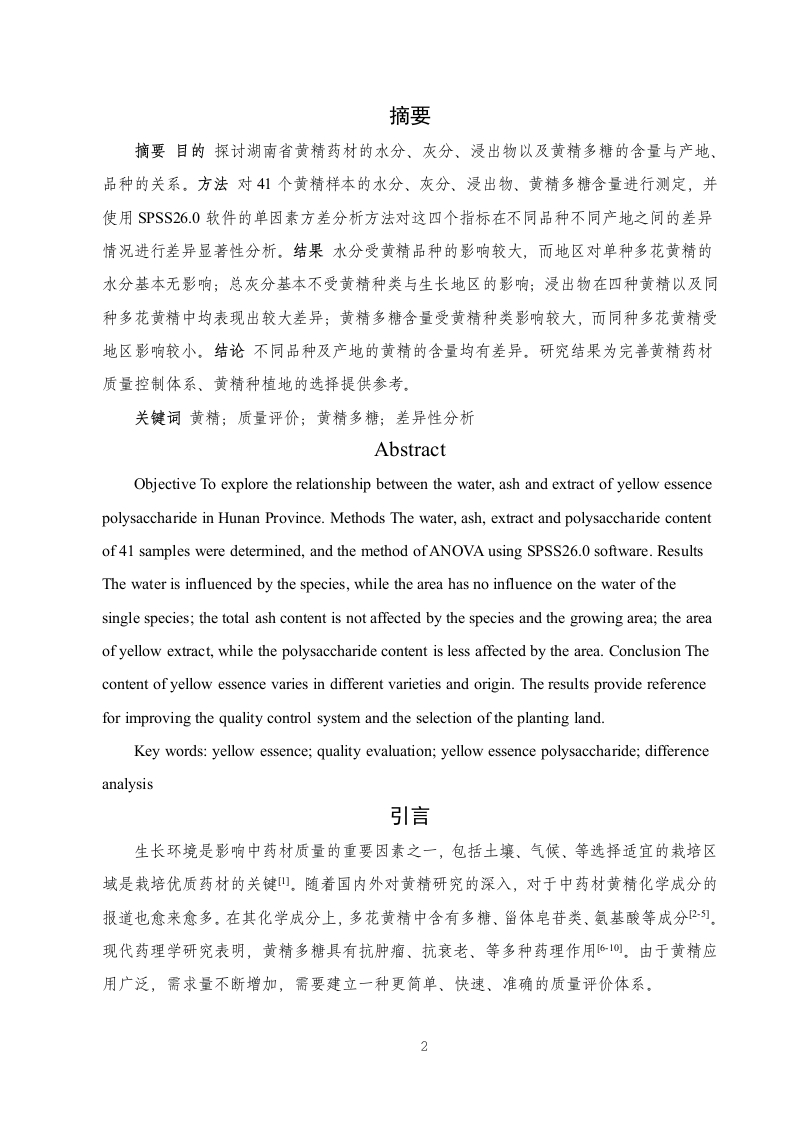 湘产黄精药材水分、灰分、浸出物及黄精多糖的测定研究目录摘要..3引言….41实验仪器、试剂与材料1.1实验仪器.…1.2实验试剂.51.3实验材料….52方法与结论.72.1实验方法.72.2实验结果.82.2.1水分含量测定….82.2.2总灰分含量测定.102.2.3浸出物含量检测….132.2.4多糖含量测定结果….163小结与讨论20参考文献….21致谢.221摘要摘要目的探讨湖南省黄精药材的水分、灰分、浸出物以及黄精多糖的含量与产地、品种的关系。方法对41个黄精样本的水分、灰分、浸出物、黄精多糖含量进行测定,并使用SPSS26.0软件的单因素方差分析方法对这四个指标在不同品种不同产地之间的差异情况进行差异显著性分析。结果水分受黄精品种的影响较大,而地区对单种多花黄精的水分基本无影响;总灰分基本不受黄精种类与生长地区的影响;浸出物在四种黄精以及同种多花黄精中均表现出较大差异;黄精多糖含量受黄精种类影响较大,而同种多花黄精受地区影响较小。结论不同品种及产地的黄精的含量均有差异。研究结果为完善黄精药材质量控制体系、黄精种植地的选择提供参考。关镀词黄精;质量评价;黄精多糖;差异性分析AbstractObjective To explore the relationship between the water,ash and extract of yellow essencepolysaccharide in Hunan Province.Methods The water,ash,extract and polysaccharide contentof 41 samples were determined,and the method of ANOVA using SPSS26.0 software.ResultsThe water is influenced by the species,while the area has no influence on the water of thesingle species;the total ash content is not affected by the species and the growing area;the areaof yellow extract,while the polysaccharide content is less affected by the area.Conclusion Thecontent of yellow essence varies in different varieties and origin.The results provide referencefor improving the quality control system and the selection of the planting landKey words:yellow essence;quality evaluation;yellow essence polysaccharide;differenceanalysis引言生长环境是影响中药材质量的重要因素之一,包括土壤、气候、等选择适宜的栽培区域是栽培优质药材的关键山。随着国内外对黄精研究的深入,对于中药材黄精化学成分的报道也愈来愈多。在其化学成分上,多花黄精中含有多糖、留体皂苷类、氨基酸等成分2]。现代药理学研究表明,黄精多糖具有抗肿瘤、抗衰老、等多种药理作用610。由于黄精应用广泛,需求量不断增加,需要建立一种更简单、快速、准确的质量评价体系。2基于上,本研究收集湖南省不同产地不同品种的黄精药材41批。进行灰分、水分、黄精多糖、浸出物的含量测定,比较湖南省不同地区及品种黄精药材的指标含量差异,从而筛选出不同品种的适宜种植地区,通过本研究可以为未来湖南地区黄精种植地的选择与黄精质量评价提供科学参考。1实验仪器、试剂与材料1.1实验仪器表1实验仪器仪器名称型号生产厂家高效液相色谱仪Agilent1260美国安捷伦公司分析天平PL203瑞士梅特勒托利多公司数控超声波清洗器KQ-800DE昆山市超声仪器有限公司高速中药粉碎机YF500浙江瑞安市永历制药机械公司超纯水机ECO-S15上海和泰仪器有限公司1.2实验试剂表2实验试剂名称纯度品牌薯蓣皂苷元≥98%成都普思生物科技有限公司乙腈HPLC级美国Merck公司甲醇HPLC级美国Merck公司磷酸HPLC级长沙分路口塑料化工厂1.3实验材料实验材料来自于湖南省各个不同地区的多种黄精,主要包括多花黄精、湘黄精、卷叶黄精、长梗黄精共41份样品,样品已经湖南中医药大学王智副教授鉴定。收集到的黄精药材新鲜样品经去须根,洗净,置于沸水中略烫或者蒸至透心,后放入烘箱65℃烘干,打粉过80目备用.表3不同来源黄精样品收集情况NO.编号名称产地日期XHJ-l湘黄精湖南省湘西古丈2022.4.224XH)-2湘黄精湖南省湘西古丈2022.4.22XHJ-3湘黄精湖南省湘西古丈2022.4.22S4XHJ4湘黄精湖南省湘西古丈2022.4.22S5XHJ-5湘黄精湖南省湘西花垣县2022.11.21S6XHJ-6湘黄精湖南省湘西永顺县2022.11.23STXHJ-7湘黄精湖南省湘西万草药业2022.12.8XH)-8湘黄精湖南省湘西万草药业2022.12.8S9XHJ-9湘黄精湖南省怀化市溆浦县沿溪乡金鸡垅村2023.7.15S10XHJ-10湘黄精湖南省怀化市溆浦县沿溪乡瓦化村2023.7.15S11DH-I多花黄精湖南省怀化市鹤城区2022.7.27S13DH-3多花黄精湖南省安化市樟楠湾2022.6.22S14DH-4多花黄精湖南省安化市东坪镇2022.6.22S15DH-5多花黄精湖南省岳阳市平江2022.8.15S16DH-6多花黄精湖南省湘西凤凰县千工坪镇2022.12.8S17DH-7多花黄精湖南省湘西古丈县断龙山乡2022.11.17S18DH-8多花黄精湖南省吉首衣科院2022.11.17S19DH-9多花黄精湖南省湘西泸溪县2022.11.25S20DH-10多花黄精湖南省浏阳市大围山2022.7.22S21DH-11多花黄精湖南省常德棉花基地2022.8.31S22DH-12多花黄精湖南省益阳市安化2023.6.6S23DH-13多花黄精湖南省娄底新化茅屋2023.6.23S24DH-14多花黄精湖南省娄底新化茅屋2023.6.23S25DH-15多花黄精湖南省娄底新化县古台山2023.7.116DH-16多花黄精湖南省新化太公石佛旅游开发有限公司2022.12.194