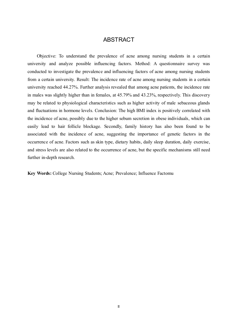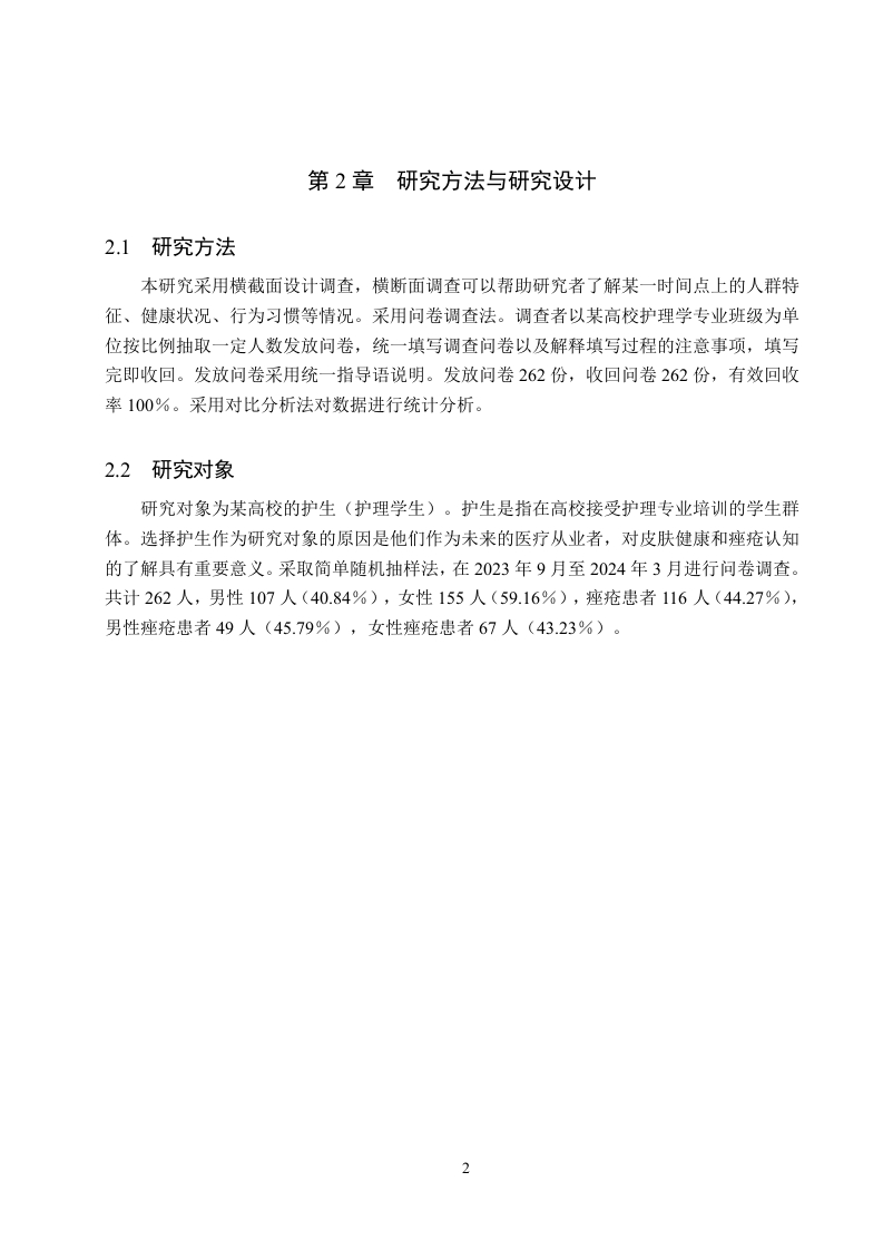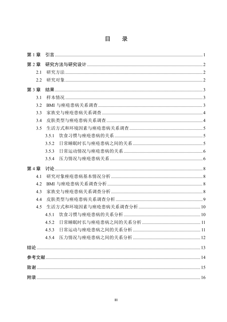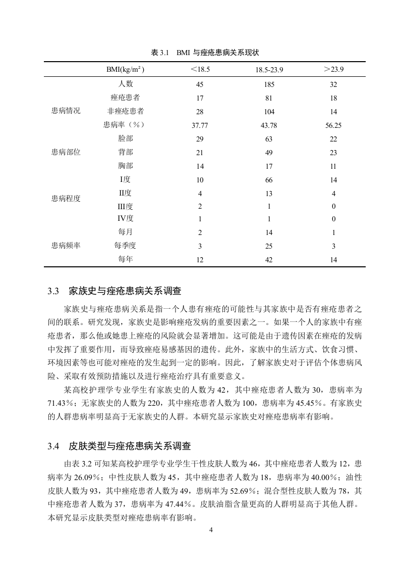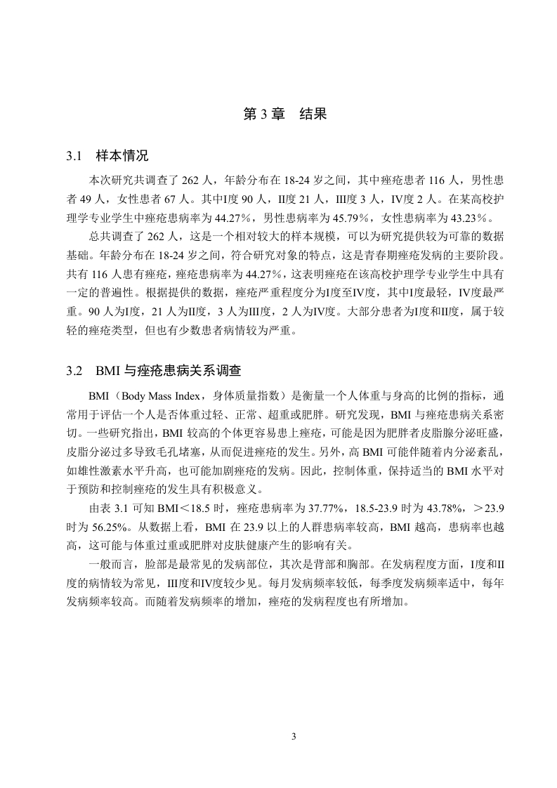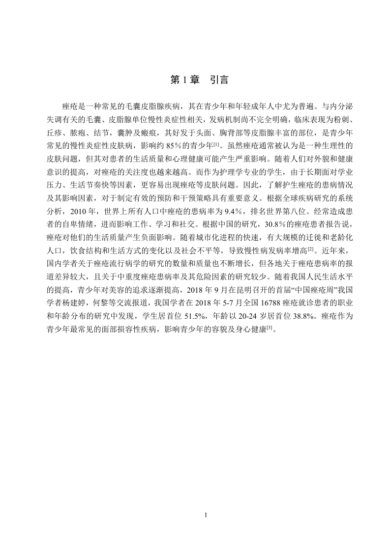 某高校护生座疮患病率及影响因素调查分析摘要目的:了解某高校护生痤疮的患病率,分析可能存在的患病影响因素。方法:取某高校护理学专业学生为研究对象,采取问卷调查法对其座疮患病率及影响因素因素进行调查。结果:某高校护理学专业学生的痤疮患病率达到了44.27%。进一步分析发现,在座疮患者中,男性的患病率略高于女性,分别为45.79%和43.23%。这一发现可能与男性皮脂腺活性较高、荷尔蒙水平波动等生理特征相关。结论:BMI指数的偏高与座疮患病率呈正相关,可能是因为肥胖者皮脂分泌较多,容易导致毛囊堵塞。其次,家族史也被发现与痤疮患病率有关,暗示了遗传因素在痤疮发生中的重要性。皮肤类型、饮食习惯、日常睡眠时长、日常运动情况、压力情况等因素也与痤疮的发生有一定关联,但具体机制还需进一步深入研究。关键词:高校护生:痤疮:患病率;影响因素ABSTRACTObjective:To understand the prevalence of acne among nursing students in a certainuniversity and analyze possible influencing factors.Method:A questionnaire survey wasconducted to investigate the prevalence and influencing factors of acne among nursing studentsfrom a certain university.Result:The incidence rate of acne among nursing students in a certainuniversity reached 44.27%.Further analysis revealed that among acne patients,the incidence ratein males was slightly higher than in females,at 45.79%and 43.23%,respectively.This discoverymay be related to physiological characteristics such as higher activity of male sebaceous glandsand fluctuations in hormone levels.Conclusion:The high BMI index is positively correlated withthe incidence of acne,possibly due to the higher sebum secretion in obese individuals,which caneasily lead to hair follicle blockage.Secondly,family history has also been found to beassociated with the incidence of acne,suggesting the importance of genetic factors in theoccurrence of acne.Factors such as skin type,dietary habits,daily sleep duration,daily exercise,and stress levels are also related to the occurrence of acne,but the specific mechanisms still needfurther in-depth research.Key Words:College Nursing Students;Acne;Prevalence;Influence Factomu目录第1章引言第2章研究方法与研究设计.22.1研究方法2.2研究对象..2第3章结果.33.1样本情况.33.2BMⅫ与痤疮患病关系调查..33.3家族史与痤疮患病关系调查….43.4皮肤类型与痤疮患病关系调查.43.5生活方式和环境因素与痤疮患病关系调查.53.5.1饮食习惯与痤疮患病的关系….53.5.2日常睡眠时长与痤疮患病之间的关系.53.5.3日常运动情况与痤疮患病的关系.63.5.4压力情况与痤疮患病关系….6第4章讨论..84.1研究对象痤疮患病基本情况分析..84.2BM与痤疮患病关系调查分析.….84.3家族史与痤疮患病关系调查分析…84.4皮肤类型与痤疮患病关系调查分析.94.5生活方式和环境因素与痤疮患病关系调查分析.104.5.1饮食习惯与痤疮患病的关系分析…104.5.2日常睡眠时长与痤疮患病之间的关系分析.114.5.3日常运动与痤疮患病之间的关系分析.114.5.4压力情况与痤疮患病之间的关系分析….12结论.13参考文献.14致谢.15附绿。.16第1章引言座疮是一种常见的毛囊皮脂腺疾病,其在青少年和年轻成年人中尤为普遍。与内分泌失调有关的毛囊、皮脂腺单位慢性炎症性相关,发病机制尚不完全明确,临床表现为粉刺、丘疹、脓疱、结节,囊肿及瘢痕,其好发于头面、胸背部等皮脂腺丰富的部位,是青少年常见的慢性炎症性皮肤病,影响约85%的青少年山。虽然痤疮通常被认为是一种生理性的皮肤问题,但其对患者的生活质量和心理健康可能产生严重影响。随着人们对外貌和健康意识的提高,对痤疮的关注度也越来越高。而作为护理学专业的学生,由于长期面对学业压力、生活节奏快等因素,更容易出现痤疮等皮肤问题。因此,了解护生痤疮的患病情况及其影响因素,对于制定有效的预防和干预策略具有重要意义。根据全球疾病研究的系统分析,2010年,世界上所有人口中痤疮的患病率为9.4%,排名世界第八位。经常造成患者的自卑情绪,进而影响工作、学习和社交。根据中国的研究,30.8%的痤疮患者报告说,痤疮对他们的生活质量产生负面影响。随着城市化进程的快速,有大规模的迁徙和老龄化人口,饮食结构和生活方式的变化以及社会不平等,导致慢性病发病率增高四。近年来,国内学者关于痤疮流行病学的研究的数量和质量也不断增长,但各地关于痤疮患病率的报道差异较大,且关于中重度痤疮患病率及其危险因素的研究较少。随着我国人民生活水平的提高,青少年对美容的追求逐渐提高,2018年9月在昆明召开的首届“中国痤疮周我国学者杨建婷,何黎等交流报道,我国学者在2018年5-7月全国16788痤疮就诊患者的职业和年龄分布的研究中发现,学生居首位51.5%,年龄以20-24岁居首位38.8%。痤疮作为青少年最常见的面部损容性疾病,影响青少年的容貌及身心健康)。