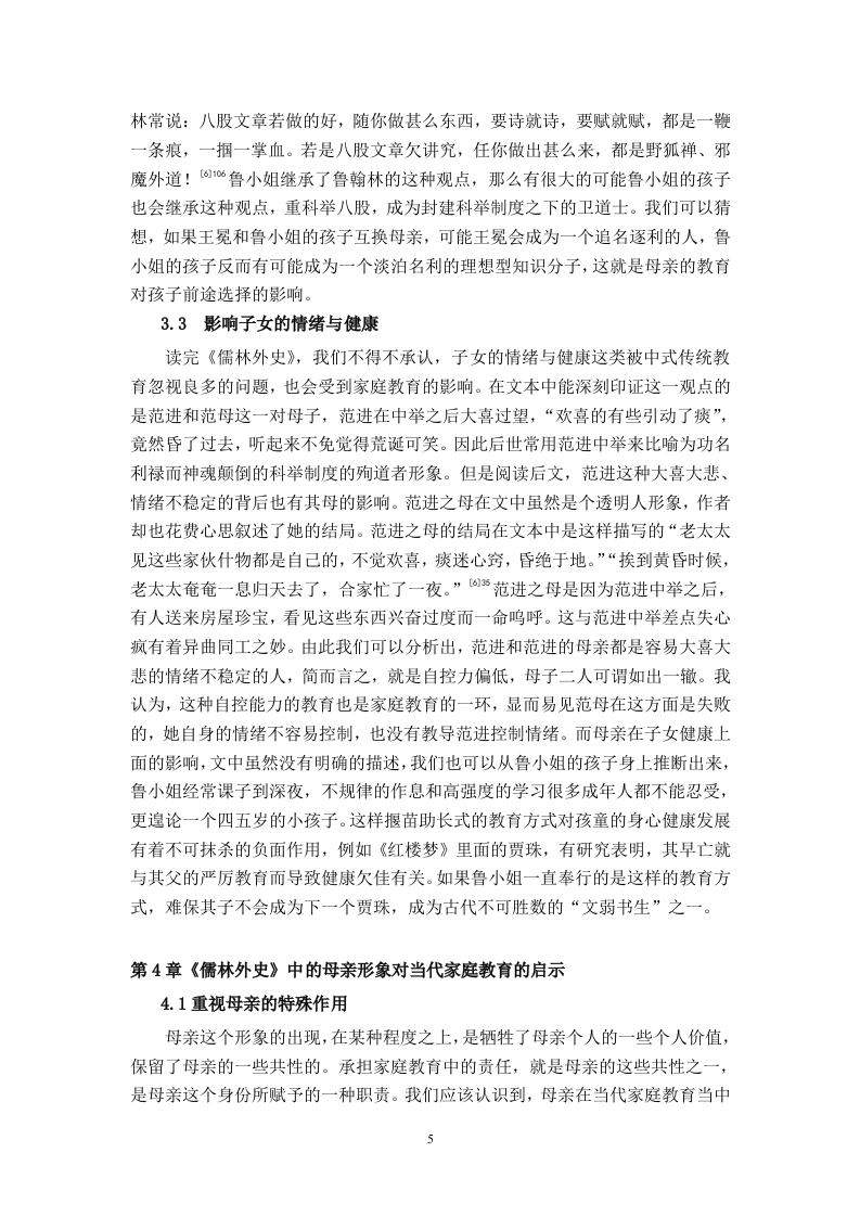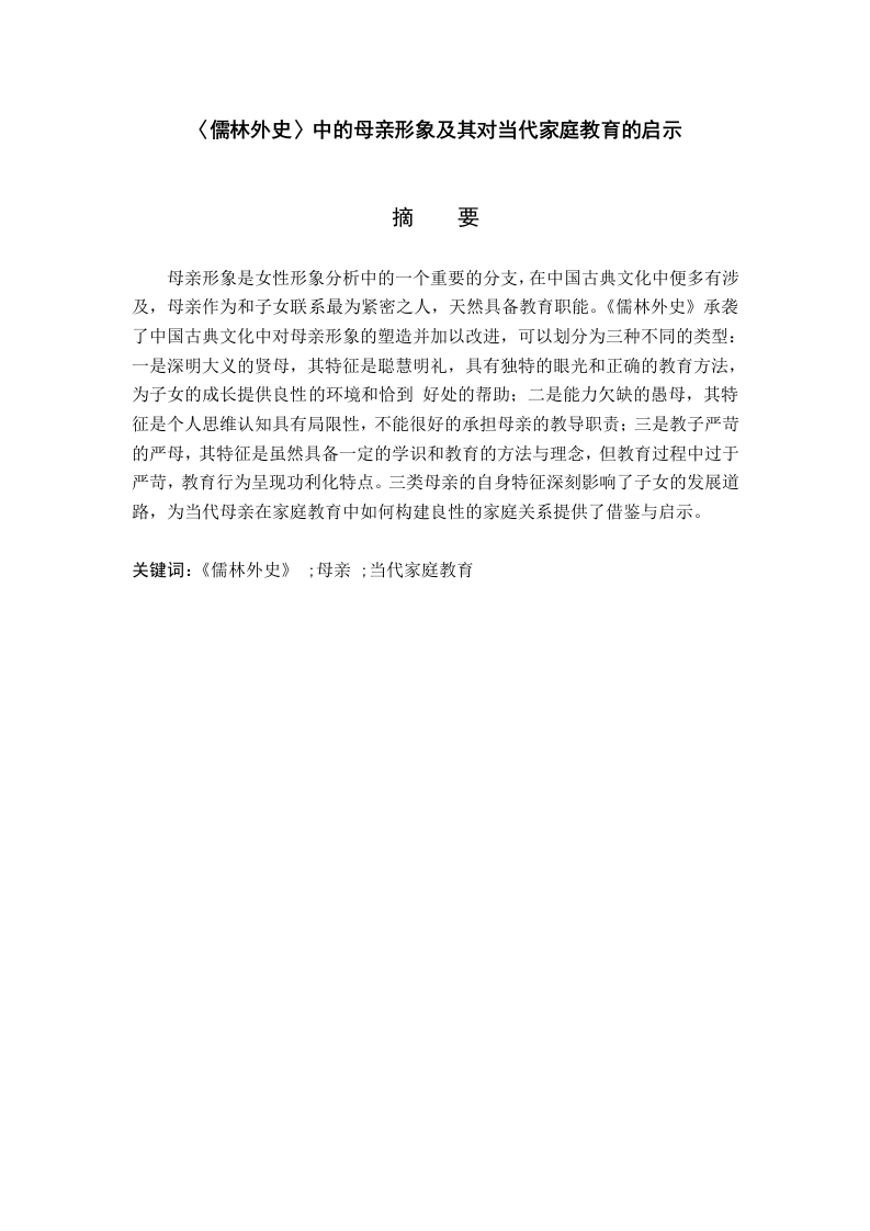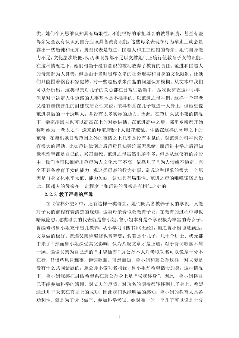 《儒林外史〉中的母亲形象及其对当代家庭教育的启示摘要母亲形象是女性形象分析中的一个重要的分支,在中国古典文化中便多有涉及,母亲作为和子女联系最为紧密之人,天然具备教育职能。《儒林外史》承袭了中国古典文化中对母亲形象的塑造并加以改进,可以划分为三种不同的类型:一是深明大义的贤母,其特征是聪慧明礼,具有独特的眼光和正确的教育方法,为子女的成长提供良性的环境和恰到好处的帮助:二是能力欠缺的愚母,其特征是个人思维认知具有局限性,不能很好的承担母亲的教导职责;三是教子严苛的严母,其特征是虽然具备一定的学识和教育的方法与理念,但教育过程中过于严苛,教育行为呈现功利化特点。三类母亲的自身特征深刻影响了子女的发展道路,为当代母亲在家庭教育中如何构建良性的家庭关系提供了借鉴与启示。关键词:《儒林外史》:母亲:当代家庭教育目录引言…第1章中国古典文化中的母亲形象及其职能…1.1中国古典文化中著名的母亲形象1.2中国古典文化中母亲的职能第2章《儒林外史》中的母亲形象的特征.22.1《儒林外史》中母亲形象的共同特征.22.2《儒林外史》中母亲形象的差异性22.2.1深明大义的贤母…22.2.2能力欠缺的愚母.22.2.3教子严苛的严母.….3第3章《儒林外史》中母亲形象对子女的影响.43.1影响子女的性格与人品…43.2影响子女的前途与命运…43.3影响子女的情绪与健康5第4章《儒林外史》中的母亲形象对当代家庭教育的启示.54.1重视母亲的特殊作用.54.2提高母亲的综合素质.….64.3建全社会保障机制6结论.7参考文献.8引言《儒林外史》作为清代著名文学家吴敬梓的代表作品,深刻描述了科举制度对知识分子的毒害与禁锢,反映了官场腐败的风气,对后世研究明清时期士人众生相提供了丰富的资料。同时,《儒林外史》也是一部颇具典型意义的讽刺小说,具有很高的文学价值和史学价值。近些年来,学界对《儒林外史》中的人物形象研究十分丰富,其中母亲形象由于对现代家庭教育具备一定的启示意义而逐渐为学界所探讨。“七一勋章”的获得者、华坪女子高级中学的校长张桂梅曾经说过:一个女孩受教育,她可以改变三代人。这句话足以看出母亲在家庭教育中起着至关重要的作用。因此,笔者将目光聚焦在《儒林外史》中的几位母亲身上,以明清时期的家庭教育为背景,探寻她们在家庭教育中所发挥的作用,并希望对当代家庭教育有所启示。第1章中国古典文化中的母亲形象及其职能1.1中国古典文化中著名的母亲形象中国古典文学中的正面母亲形象不胜枚举,《列女传》中便描述了许多优秀的母亲形象,从“清静专一”的弃母姜嫄到“教以事理,推恩有德,契为帝辅,盖母有力”的契母简狄,这些母亲凭借自身的才智教导辅佐了出众的首领,为后世所歌颂。又比如我们耳熟能详的贤母孟母以及岳母,孟母三迁和岳母刺字的故事家喻户晓。如孟母三迁,孟母深知周围环境在子女成长过程中有着不可忽视的作用,三次易居,最终孟子“学六艺,卒成大儒之名”更离不开孟母的悉心教导。上述事例也可以佐证,母亲的个人品德和教育方式对于子女的性格养成有着不可忽视的作用。1.2中国古典文化中母亲的职能母亲这一形象的出现,往往会带有一些共性,其中母亲的职能就是社会与天性共同赋予母亲的。纵观中国古典文化,母职为古代所重视。西汉思想家贾谊在《新书》中说道:“谨为子孙婚妻嫁女,必择孝悌世世有行义者”0。娶妻娶贤的观念在古代极为盛行,贤良淑德可以称之为女子安身立命的根本,其缘由也是有贤能的女性在辅助丈夫和教育子女中发挥重要的作用。也是在西汉,经学家刘向写作《列女传》一书,其中《母仪篇》的序言中说:“所取乎母仪者,为其守礼知义,端严善教,以为后世法者也”,这是说这些母亲遵守礼法,通晓道义,端庄严谨,善于教子,可作为后人学习的榜样,所以为她们立传。后世在撰写《烈女传》,无不赞美歌颂教子有方的母亲形象。母亲的职能更多的体现在养和育两个方面,养,顾名思义,就是养育、照顾之意,是指母亲有照料子女生活起居的责任,而育,则更倾向于教育,教育职能是母亲的核心职能之一,也是本文要重点论述的一项职能。第2章《儒林外史》中的母亲形象的特征2.1《儒林外史》中母亲形象的共同特征观《儒林外史》中的母亲形象,有生活困顿的贫穷老妇,也有家境优渥的富家小姐,有不通书文的乡下媪,也有知书达理的官家女,她们身份各异,所受教育不同,人生际遇更是千差万别,但是如果抛去这些外在的世俗眼光,仅把这些人物形象归为母亲这一身份来看待,我们就可以发现,这些母亲身上也存在着一些共有的特征,其中表现得最为明显且不可磨灭的就是深厚的母爱。母爱是一切生灵的天性,在人类社会中也展现的淋漓尽致。《儒林外史》中的几位母亲对子女的疼爱就是母爱最好的诠释。王冕之母临终之时不愿王冕入朝为官,认为王冕性情高傲,官场又十分凶险,害怕他弄出祸事来,最终没有好下场。放弃功名利禄,飞黄腾达的机会,只希望孩子能够平安、快乐,这正是母爱最深刻的体现,不掺杂任何个人的私欲。范进之母和匡超人虽然没有王冕之母的一番见识,但是对子女的关爱之情也是毫不逊色,范进之母在范进中举喜极失去意识之后,害怕胡屠夫真的伤到儿子,专门赶出来告诉胡屠夫“亲
