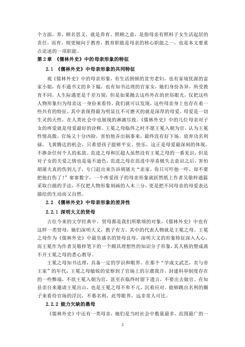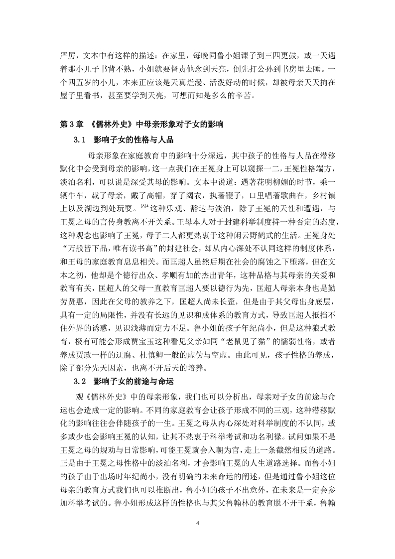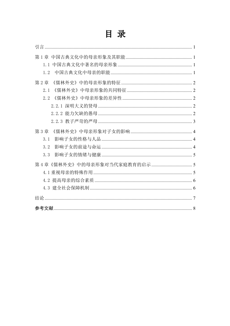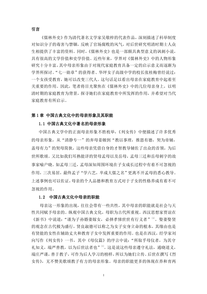 《儒林外史〉中的母亲形象及其对当代家庭教育的启示摘要母亲形象是女性形象分析中的一个重要的分支,在中国古典文化中便多有涉及,母亲作为和子女联系最为紧密之人,天然具备教育职能。《儒林外史》承袭了中国古典文化中对母亲形象的塑造并加以改进,可以划分为三种不同的类型:一是深明大义的贤母,其特征是聪慧明礼,具有独特的眼光和正确的教育方法,为子女的成长提供良性的环境和恰到好处的帮助:二是能力欠缺的愚母,其特征是个人思维认知具有局限性,不能很好的承担母亲的教导职责;三是教子严苛的严母,其特征是虽然具备一定的学识和教育的方法与理念,但教育过程中过于严苛,教育行为呈现功利化特点。三类母亲的自身特征深刻影响了子女的发展道路,为当代母亲在家庭教育中如何构建良性的家庭关系提供了借鉴与启示。关键词:《儒林外史》:母亲:当代家庭教育目录引言…第1章中国古典文化中的母亲形象及其职能…1.1中国古典文化中著名的母亲形象1.2中国古典文化中母亲的职能第2章《儒林外史》中的母亲形象的特征.22.1《儒林外史》中母亲形象的共同特征.22.2《儒林外史》中母亲形象的差异性22.2.1深明大义的贤母…22.2.2能力欠缺的愚母.22.2.3教子严苛的严母.….3第3章《儒林外史》中母亲形象对子女的影响.43.1影响子女的性格与人品…43.2影响子女的前途与命运…43.3影响子女的情绪与健康5第4章《儒林外史》中的母亲形象对当代家庭教育的启示.54.1重视母亲的特殊作用.54.2提高母亲的综合素质.….64.3建全社会保障机制6结论.7参考文献.8引言《儒林外史》作为清代著名文学家吴敬梓的代表作品,深刻描述了科举制度对知识分子的毒害与禁锢,反映了官场腐败的风气,对后世研究明清时期士人众生相提供了丰富的资料。同时,《儒林外史》也是一部颇具典型意义的讽刺小说,具有很高的文学价值和史学价值。近些年来,学界对《儒林外史》中的人物形象研究十分丰富,其中母亲形象由于对现代家庭教育具备一定的启示意义而逐渐为学界所探讨。“七一勋章”的获得者、华坪女子高级中学的校长张桂梅曾经说过:一个女孩受教育,她可以改变三代人。这句话足以看出母亲在家庭教育中起着至关重要的作用。因此,笔者将目光聚焦在《儒林外史》中的几位母亲身上,以明清时期的家庭教育为背景,探寻她们在家庭教育中所发挥的作用,并希望对当代家庭教育有所启示。第1章中国古典文化中的母亲形象及其职能1.1中国古典文化中著名的母亲形象中国古典文学中的正面母亲形象不胜枚举,《列女传》中便描述了许多优秀的母亲形象,从“清静专一”的弃母姜嫄到“教以事理,推恩有德,契为帝辅,盖母有力”的契母简狄,这些母亲凭借自身的才智教导辅佐了出众的首领,为后世所歌颂。又比如我们耳熟能详的贤母孟母以及岳母,孟母三迁和岳母刺字的故事家喻户晓。如孟母三迁,孟母深知周围环境在子女成长过程中有着不可忽视的作用,三次易居,最终孟子“学六艺,卒成大儒之名”更离不开孟母的悉心教导。上述事例也可以佐证,母亲的个人品德和教育方式对于子女的性格养成有着不可忽视的作用。1.2中国古典文化中母亲的职能母亲这一形象的出现,往往会带有一些共性,其中母亲的职能就是社会与天性共同赋予母亲的。纵观中国古典文化,母职为古代所重视。西汉思想家贾谊在《新书》中说道:“谨为子孙婚妻嫁女,必择孝悌世世有行义者”0。娶妻娶贤的观念在古代极为盛行,贤良淑德可以称之为女子安身立命的根本,其缘由也是有贤能的女性在辅助丈夫和教育子女中发挥重要的作用。也是在西汉,经学家刘向写作《列女传》一书,其中《母仪篇》的序言中说:“所取乎母仪者,为其守礼知义,端严善教,以为后世法者也”,这是说这些母亲遵守礼法,通晓道义,端庄严谨,善于教子,可作为后人学习的榜样,所以为她们立传。后世在撰写《烈女传》,无不赞美歌颂教子有方的母亲形象。母亲的职能更多的体现在养和育两个方面,养,顾名思义,就是养育、照顾之意,是指母亲有照料子女生活起居的责任,而育,则更倾向于教育,教育职能是母亲的核心职能之一,也是本文要重点论述的一项职能。第2章《儒林外史》中的母亲形象的特征2.1《儒林外史》中母亲形象的共同特征观《儒林外史》中的母亲形象,有生活困顿的贫穷老妇,也有家境优渥的富家小姐,有不通书文的乡下媪,也有知书达理的官家女,她们身份各异,所受教育不同,人生际遇更是千差万别,但是如果抛去这些外在的世俗眼光,仅把这些人物形象归为母亲这一身份来看待,我们就可以发现,这些母亲身上也存在着一些共有的特征,其中表现得最为明显且不可磨灭的就是深厚的母爱。母爱是一切生灵的天性,在人类社会中也展现的淋漓尽致。《儒林外史》中的几位母亲对子女的疼爱就是母爱最好的诠释。王冕之母临终之时不愿王冕入朝为官,认为王冕性情高傲,官场又十分凶险,害怕他弄出祸事来,最终没有好下场。放弃功名利禄,飞黄腾达的机会,只希望孩子能够平安、快乐,这正是母爱最深刻的体现,不掺杂任何个人的私欲。范进之母和匡超人虽然没有王冕之母的一番见识,但是对子女的关爱之情也是毫不逊色,范进之母在范进中举喜极失去意识之后,害怕胡屠夫真的伤到儿子,专门赶出来告诉胡屠夫“亲