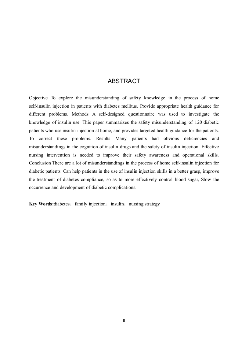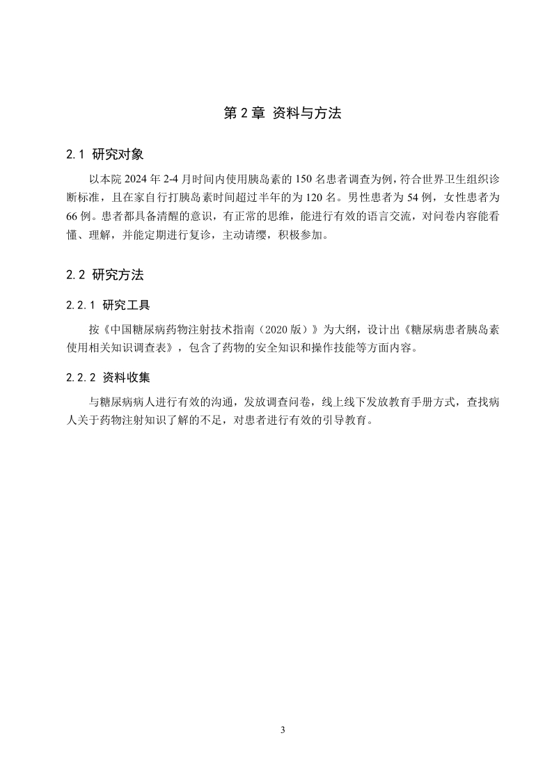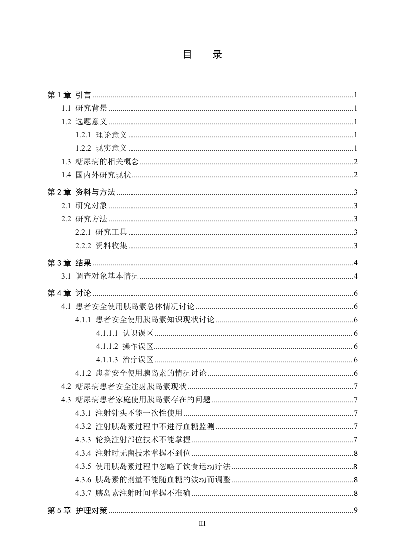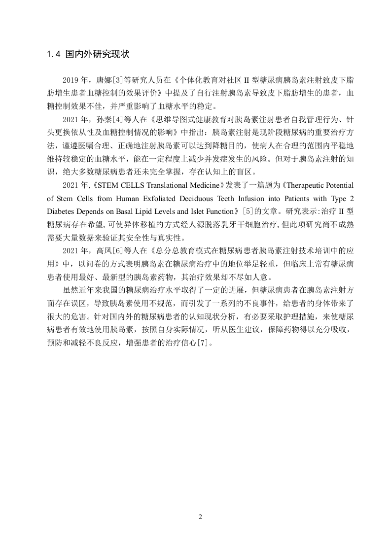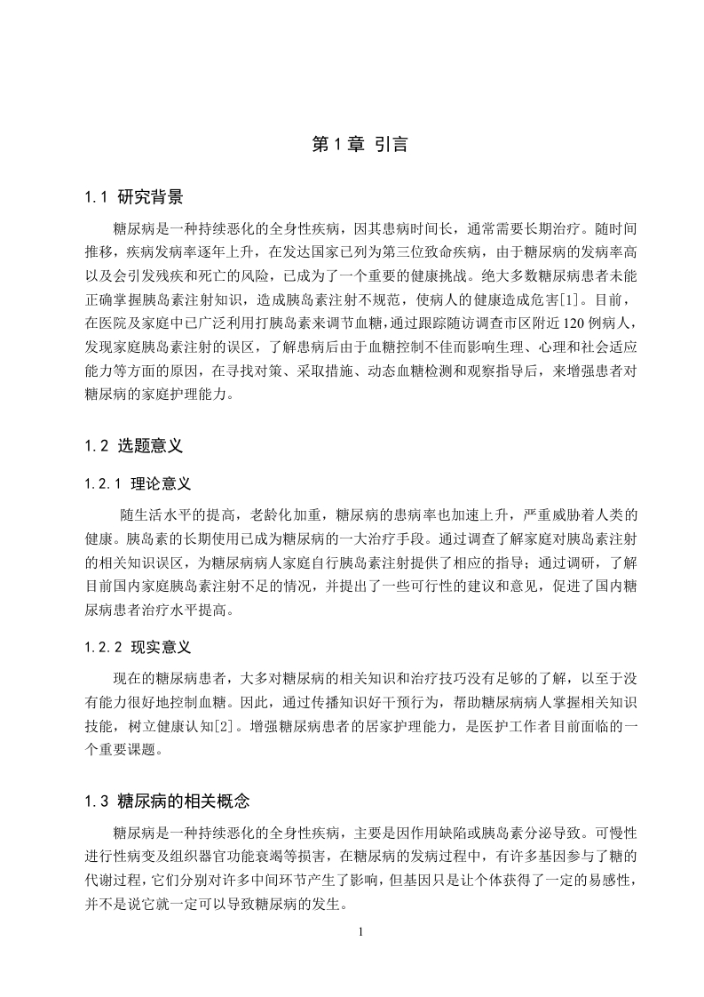 家庭注射胰岛素的问题调查分析及护理对策摘要目的探讨糖尿病患者在家庭自行胰岛素注射过程中所存在的安全知识误区,针对不同的问题提供相应的健康指导。方法通过自行设计的胰岛素使用相关知识调查表来进行调查,总结出了120例在家庭中使用胰岛素注射的糖尿病患者的安全知识误区,为患者提供了有针对性的健康指导,以纠正这些问题。结果许多患者在胰岛素药物的认知和胰岛素注射使用操作安全等方面存在明显的不足和误区,需通过有效的护理干预,提高他们的安全意识和操作技能。结论糖尿病病人在家庭自行胰岛素注射过程中存在了大量的误区,进行有效地针对性的护理教育,可以帮助患者在胰岛素的注射使用技巧中更好的掌握,提高糖尿病的治疗依从性,从而更有效地控制血糖,减缓糖尿病并发症的发生和发展。关键词:糖尿病:家庭注射:胰岛素:护理对策ABSTRACTObjective To explore the misunderstanding of safety knowledge in the process of homeself-insulin injection in patients with diabetes mellitus.Provide appropriate health guidance fordifferent problems.Methods A self-designed questionnaire was used to investigate theknowledge of insulin use.This paper summarizes the safety misunderstanding of 120 diabeticpatients who use insulin injection at home,and provides targeted health guidance for the patientsTo correct these problems.Results Many patients had obvious deficiencies andmisunderstandings in the cognition of insulin drugs and the safety of insulin injection.Effectivenursing intervention is needed to improve their safety awareness and operational skills.Conclusion There are a lot of misunderstandings in the process of home self-insulin injection fordiabetic patients.Can help patients in the use of insulin injection skills in a better grasp,improvethe treatment of diabetes compliance,so as to more effectively control blood sugar,Slow theoccurrence and development of diabetic complications.Key Words:diabetes;family injection;insulin;nursing strategy∥目录第1章引言…1.1研究背景.1.2选题意义1.2.1理论意义1.2.2现实意义1.3糖尿病的相关概念.21.4国内外研究现状..2第2章资料与方法.32.1研究对象….32.2研究方法32.2.1研究工具.32.2.2资料收集.…。.3第了章结果0.43.1调查对象基本情况…0.4第4章讨论….64.1患者安全使用胰岛素总体情况讨论.64.1.1患者安全使用胰岛素知识现状讨论.64.1.1.1认识误区……64.1.1.2操作误区.64.1.1.3治疗误区.…64.1.2患者安全使用胰岛素的情况讨论.….64.2糖尿病患者安全注射胰岛素现状…74.3糖尿病患者家庭使用胰岛素存在的问题.74.3.1注射针头不能一次性使用.74.3.2注射胰岛素过程中不进行血糖监测..74.3.3轮换注射部位技术不能掌握.….74.3.4注射时无菌技术掌握不到位84.3.5使用胰岛素过程中忽略了饮食运动疗法84.3.6胰岛素的剂量不能随血糖的波动而调整,.84.3.7胰岛素注射时间掌握不准确.8第5章护理对策…95.1医护人员利用一切机会向病人灌输针头使用知识.95.2向病人强调自我检测血糖的重要性t.44a95.3为病人设置合理的注射部位轮换方法….95.4重视对病人的充分评估,及时加强再教育105.5加强出院回访…10结论11参考文献….12致谢.13附录糖尿病患者胰岛素使用相关知识调查表.14IV