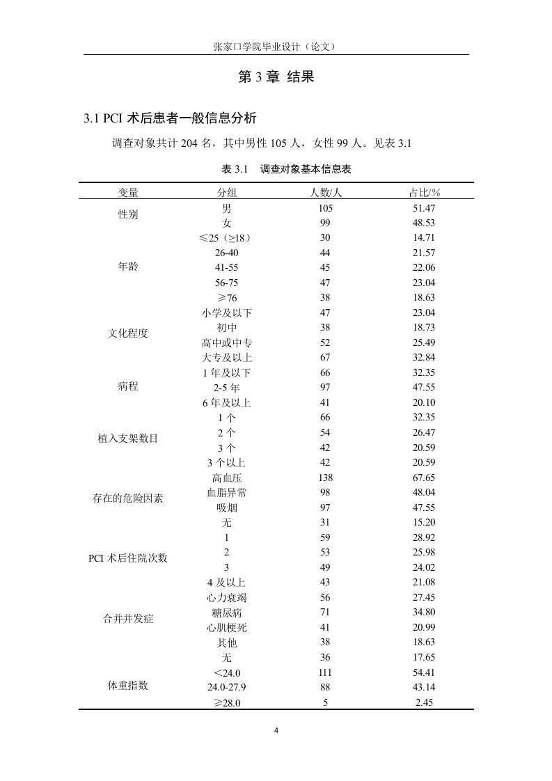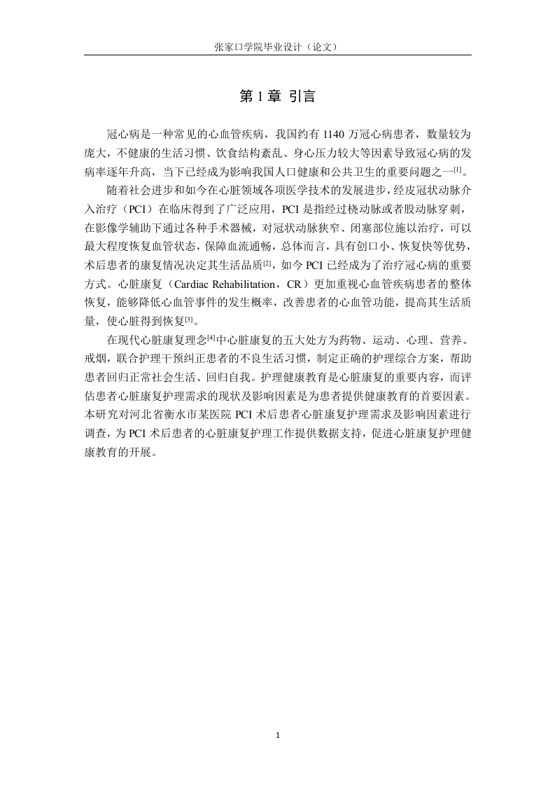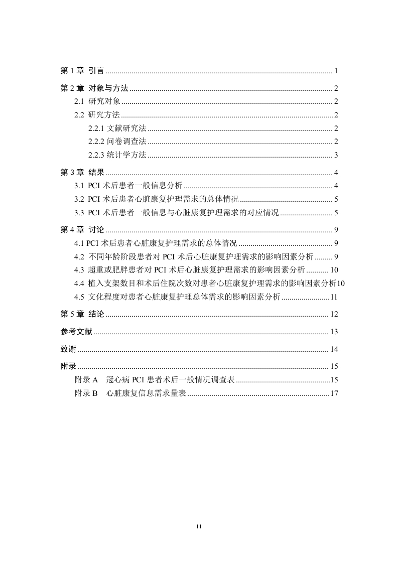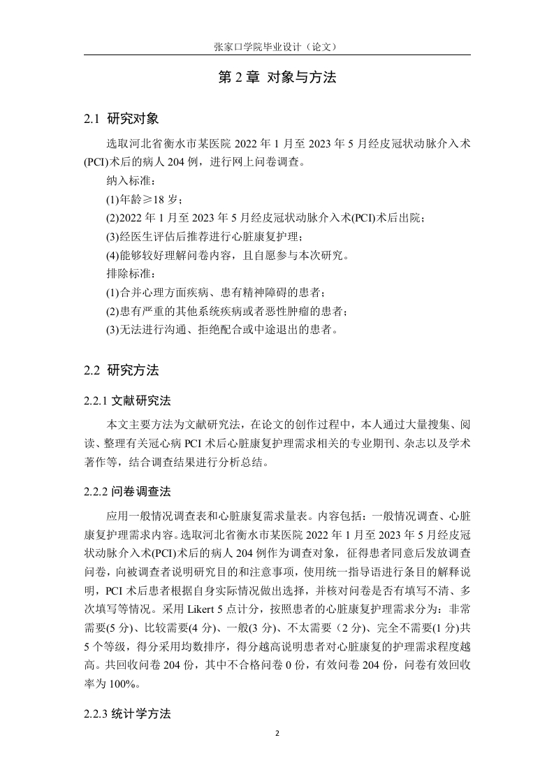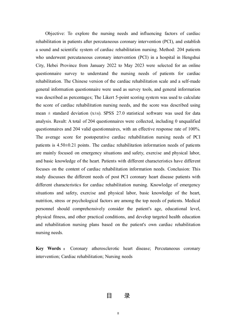 冠心病PCI术后心脏康复护理需求的调查研究以衡水市某医院为例摘要目的:探索经皮冠状动脉介入治疗(PCI)术后患者心脏康复的护理需求及影响因素,建立科学系统的心脏康复护理体系。方法:选取河北省衡水市某医院2022年1月至2023年5月经皮冠状动脉介入治疗(PCI)术后的病人204例,进行网上问卷调查,了解患者心脏康复护理需求现状,采用中文版心脏康复量表和自制的一般资料调查表对患者进行调查,用百分比描述一般资料:采用Likert5点计分计算心脏康复护理需求内容得分,并用均数士标准差(x士s)对得分进行描述,采用SPSS27.0进行数据分析。结果:共回收问卷204份,有效问卷204份,问卷有效回收率为100%。PCI术后患者心脏康复护理需求平均得分为4.50士0.21分,患者心脏康复信息需求以紧急情况与安全、运动锻炼和体力劳动、心脏基础知识等为主,不同特点的病人对心脏康复护理需求的内容侧重点存在差异。结论:本研究讨论了不同特点的冠心病PCI术后患者对心脏康复护理的不同需求,紧急情况与安全知识、运动锻炼和体力劳动等方面知识位于患者需求前列。医务人员应综合考虑患者的年龄、文化程度、身体素质等现实情况,根据患者自身的心脏康复护理需求,制定具有针对性的康复护理计划。关键词:冠状动脉粥样硬化性心脏病:经皮冠状动脉介入术:心脏康复:护理需求ABSTRACTObjective:To explore the nursing needs and influencing factors of cardiacrehabilitation in patients after percutaneous coronary intervention (PCD),and establisha sound and scientific system of cardiac rehabilitation nursing.Method:204 patientswho underwent percutaneous coronary intervention (PCI)in a hospital in HengshuiCity,Hebei Province from January 2022 to May 2023 were selected for an onlinequestionnaire survey to understand the nursing needs of patients for cardiacrehabilitation.The Chinese version of the cardiac rehabilitation scale and a self-madegeneral information questionnaire were used as survey tools,and general informationwas described as percentages;The Likert 5-point scoring system was used to calculatethe score of cardiac rehabilitation nursing needs,and the score was described usingmean standard deviation (x+s).SPSS 27.0 statistical software was used for dataanalysis.Result:A total of 204 questionnaires were collected,including 0 unqualifiedquestionnaires and 204 valid questionnaires,with an effective response rate of 100%The average score for postoperative cardiac rehabilitation nursing needs of PCIpatients is 4.50+0.21 points.The cardiac rehabilitation information needs of patientsare mainly focused on emergency situations and safety,exercise and physical labor,and basic knowledge of the heart.Patients with different characteristics have differentfocuses on the content of cardiac rehabilitation information needs.Conclusion:Thisstudy discusses the different needs of post PCI coronary heart disease patients withdifferent characteristics for cardiac rehabilitation nursing.Knowledge of emergencysituations and safety,exercise and physical labor,basic knowledge of the heart,nutrition,stress or psychological factors are among the top needs of patients.Medicalpersonnel should comprehensively consider the patient's age,educational level,physical fitness,and other practical conditions,and develop targeted health educationand rehabilitation nursing plans based on the patient's own cardiac rehabilitationnursing needs.Key Words Coronary atherosclerotic heart disease;Percutaneous coronaryintervention;Cardiac rehabilitation;Nursing needs目录第1章引言…第2章对象与方法22.1研究对象…22.2研究方法.….22.2.1文献研究法22.2.2问卷调查法,22.2.3统计学方法…3第3章结果43.1PCI术后患者一般信息分析.43.2PCI术后患者心脏康复护理需求的总体情况…53.3PCI术后患者一般信息与心脏康复护理需求的对应情况5第4章讨论4.1P℃I术后患者心脏康复护理需求的总体情况.94.2不同年龄阶段患者对PCI术后心脏康复护理需求的影响因素分析94.3超重或肥胖患者对PCI术后心脏康复护理需求的影响因素