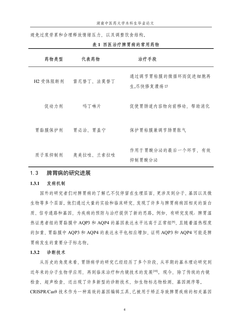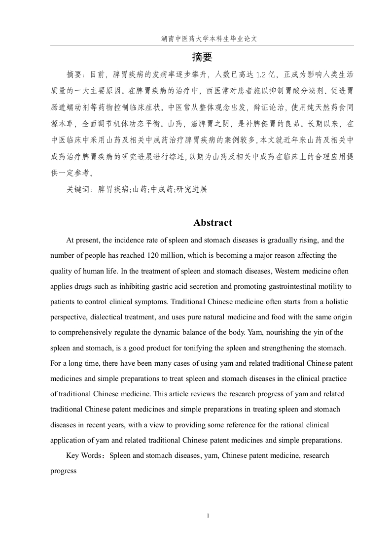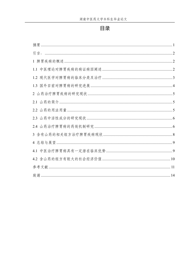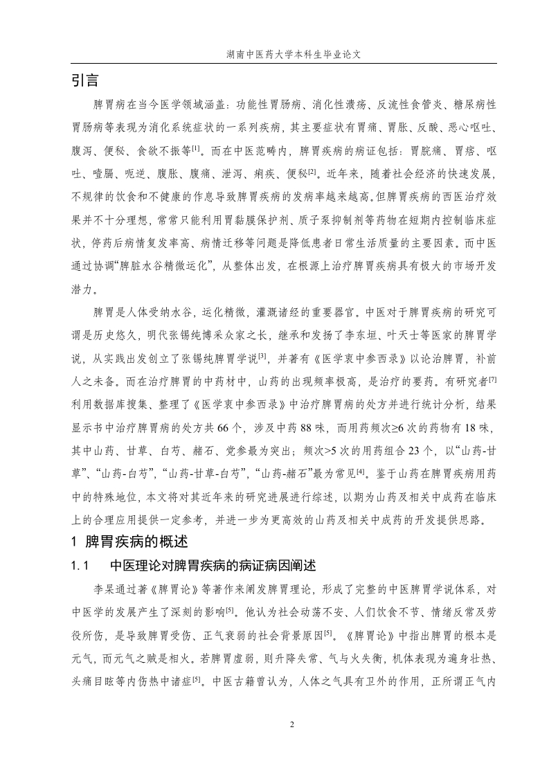 明和中翳藜大HHUNAN UNIVERSITY OF CHINESE MEDICINE本科生毕业论文山药及相关中成药治疗脾胃疾病的研究进展院:药学院学年专班姓学级:2020级业:中药学级:2020级中药专升本2班名:钱丽妃号:202009090224指导老师:徐菲二O二四年三月湖南中医药大学本科生毕业论文本科毕业论文原创性及知识产权声明本人郑重声明:所呈交的毕业论文是本人在导师的指导下取得的成果。对本论文的研究做出重要贡献的个人和集体,均已在文中以明确方式标明。因本论文引起的法律结果完全由本人承担。本毕业论文成果归湖南中医药大学所有。特此声明。毕业论文作者签名:20年月日湖南中医药大学本科生毕业论文目录要.引言:.21脾胃疾病的概述21.1中医理论对脾胃疾病的病证病因阐述.21.2现代医学对脾胃病的临床分类及治疗…31.3国外目前对脾胃病的研究进展.2山药治疗脾胃疾病的研究现状52.1山药的简介.52.2山药的用法用量..52.3山药中活性成分的研究现状...62.4山药治疗脾胃病的药效机制研究.63含有山药的相关组方治疗脾胃疾病现状84总结与展望….94.1中医治疗脾胃病具有一定潜在临床优势94.2含山药的组方有较大的社会经济价值10参考文献…11致谢14湖南中医药大学本科生毕业论文摘要摘要:目前,脾胃疾病的发病率逐步攀升,人数已高达12亿,正成为影响人类生活质量的一大主要原因。在脾胃疾病的治疗中,西医常对患者施以抑制胃酸分泌剂、促进胃肠道蠕动剂等药物控制临床症状。中医常从整体观念出发,辩证论治,使用纯天然药食同源本草,全面调节机体动态平衡。山药,滋脾胃之阴,是补脾健胃的良品。长期以来,在中医临床中采用山药及相关中成药治疗脾胃疾病的案例较多,本文就近年来山药及相关中成药治疗脾胃疾病的研究进展进行综述,以期为山药及相关中成药在临床上的合理应用提供一定参考。关键词:脾胃疾病;山药;中成药;研究进展AbstractAt present,the incidence rate of spleen and stomach diseases is gradually rising,and thenumber of people has reached 120 million,which is becoming a major reason affecting thequality of human life.In the treatment of spleen and stomach diseases,Western medicine oftenapplies drugs such as inhibiting gastric acid secretion and promoting gastrointestinal motility topatients to control clinical symptoms.Traditional Chinese medicine often starts from a holisticperspective,dialectical treatment,and uses pure natural medicine and food with the same originto comprehensively regulate the dynamic balance of the body.Yam,nourishing the yin of thespleen and stomach,is a good product for tonifying the spleen and strengthening the stomach.For a long time,there have been many cases of using yam and related traditional Chinese patentmedicines and simple preparations to treat spleen and stomach diseases in the clinical practiceof traditional Chinese medicine.This article reviews the research progress of yam and relatedtraditional Chinese patent medicines and simple preparations in treating spleen and stomachdiseases in recent years,with a view to providing some reference for the rational clinicalapplication of yam and related traditional Chinese patent medicines and simple preparations.Key Words:Spleen and stomach diseases,yam,Chinese patent medicine,researchprogress