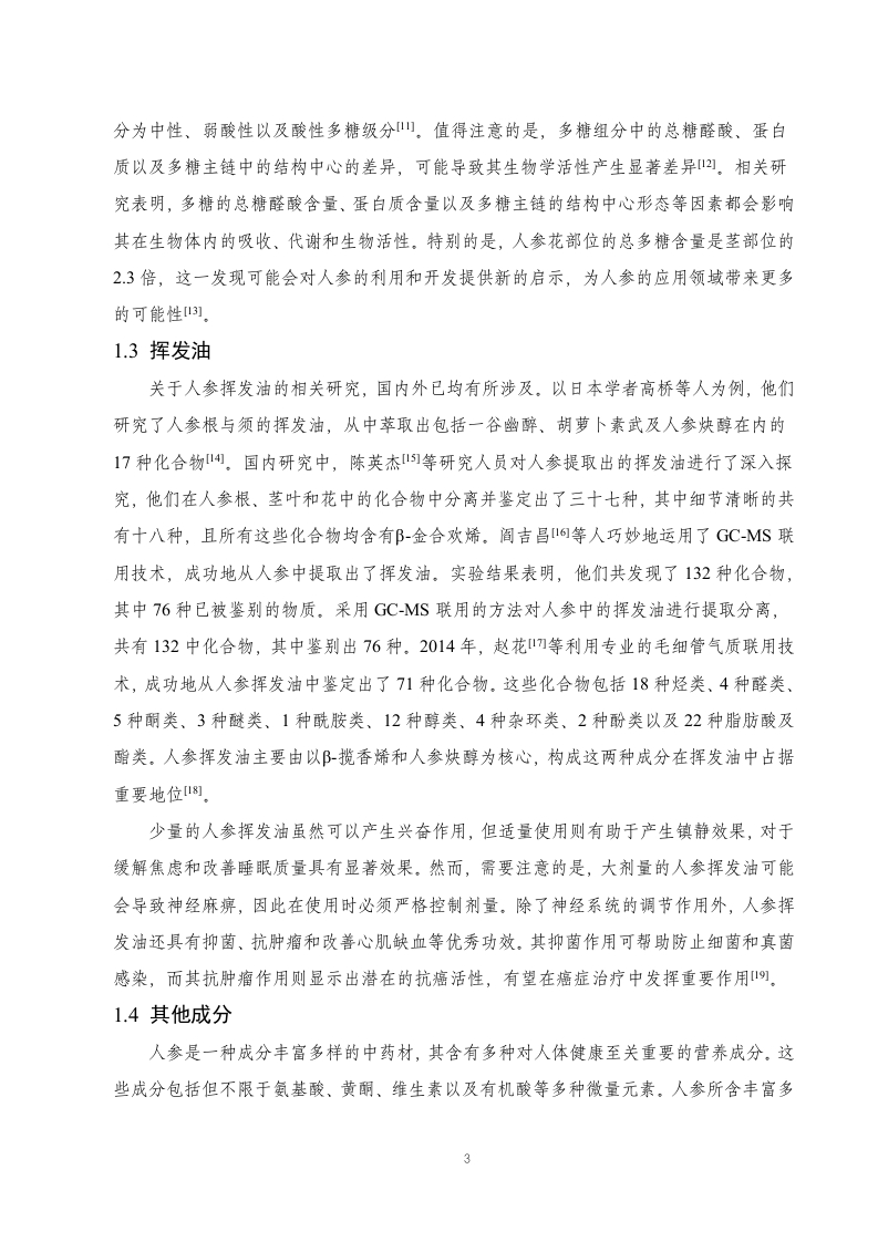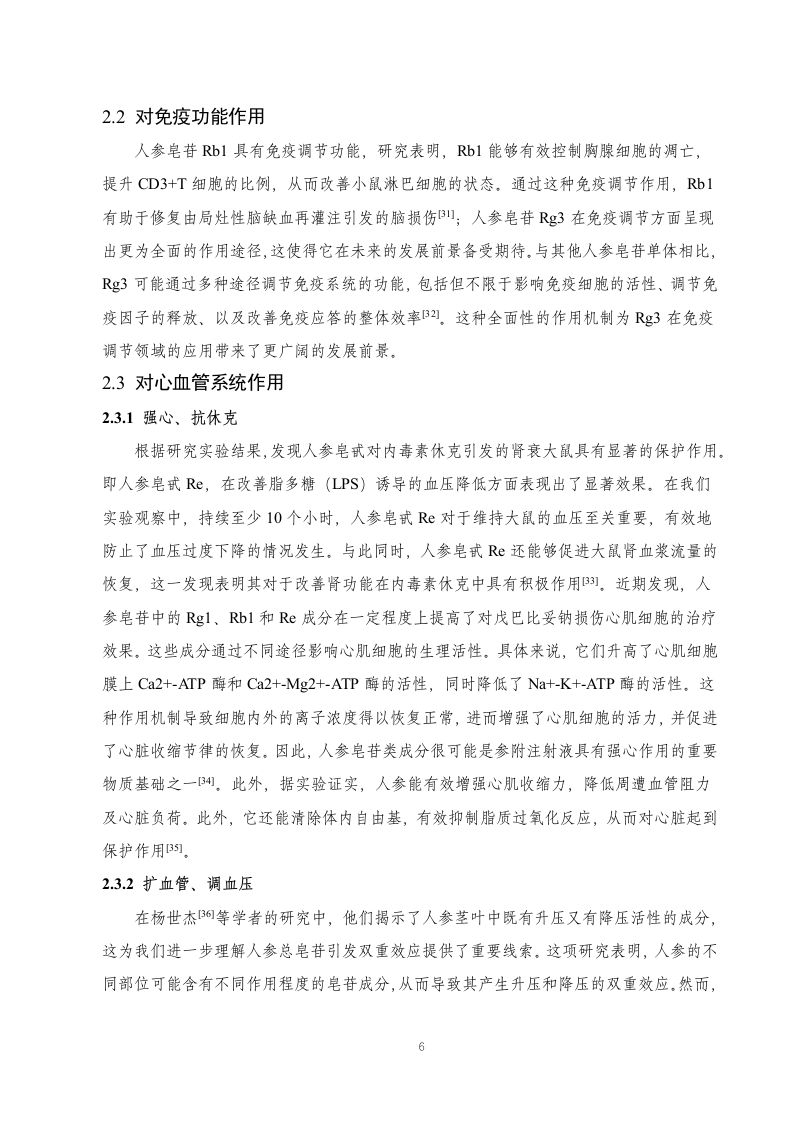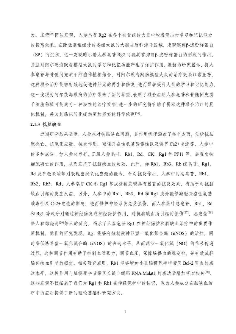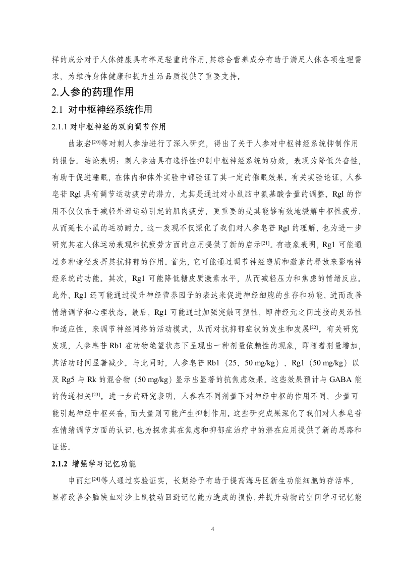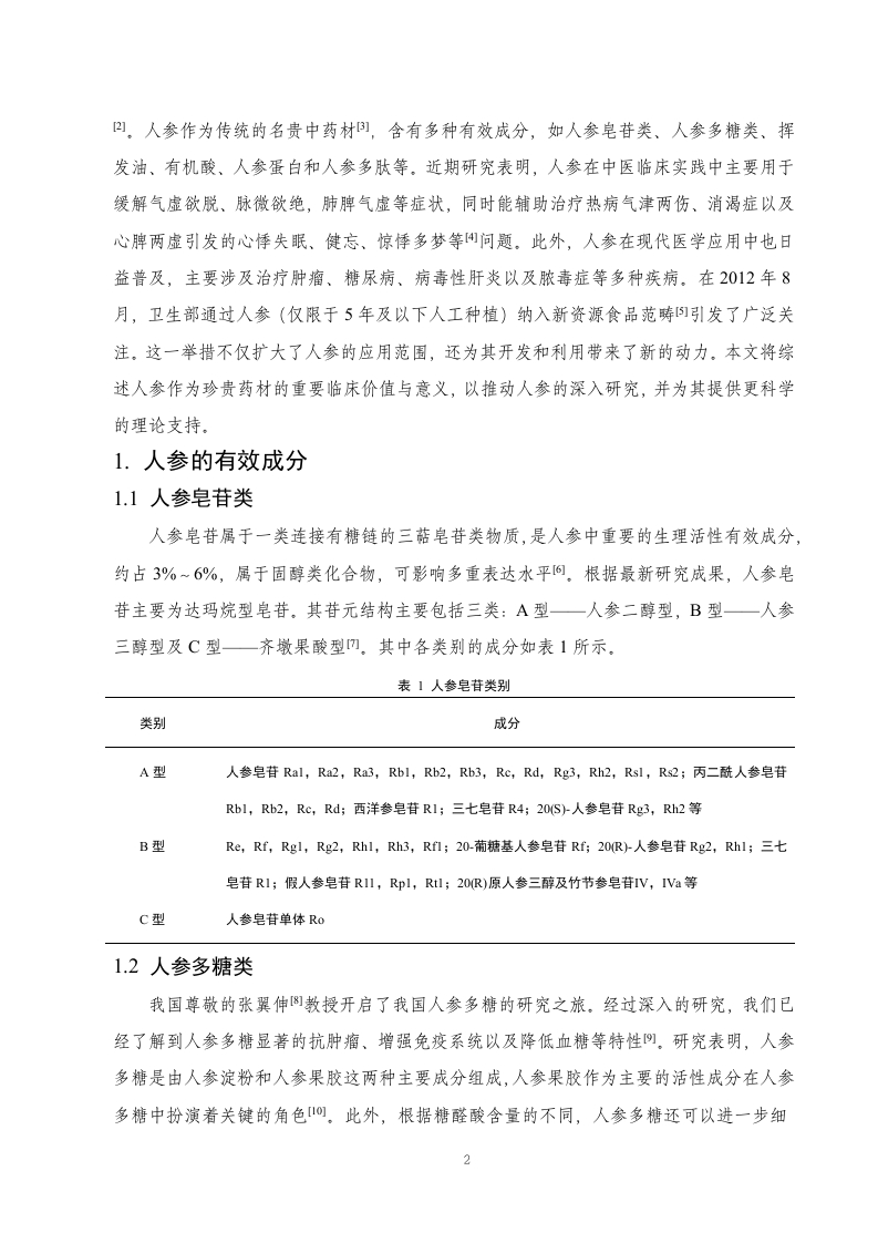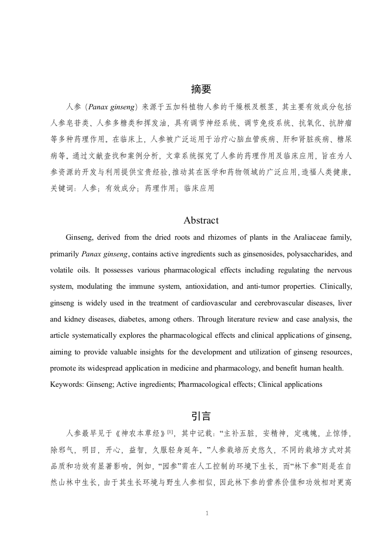 人参的药理作用及临床应用研究进展目录摘要,..3引言….41.人参的有效成分1.1人参皂苷类.51.2人参多糖类…1.3挥发油.61.4其他成分.…62.人参的药理作用72.1对中枢神经系统作用.72.2对免疫功能作用.92.3对心血管系统作用.…92.4物质代谢作用.…112.5抗肿瘤作用…112.6其他药理作用123.人参的临床应用123.1治疗心脑血管疾病123.2治疗肝和肾脏疾病123.3治疗糖尿病133.4其他临床应用134.讨论与小结.14参考文献.15致谢…..19摘要人参(Panax ginseng)来源于五加科植物人参的干燥根及根茎,其主要有效成分包括人参皂苷类、人参多糖类和挥发油,具有调节神经系统、调节免疫系统、抗氧化、抗肿瘤等多种药理作用。在临床上,人参被广泛运用于治疗心脑血管疾病、肝和肾脏疾病、糖尿病等。通过文献查找和案例分析,文章系统探究了人参的药理作用及临床应用,旨在为人参资源的开发与利用提供宝贵经验,推动其在医学和药物领域的广泛应用,造福人类健康。关键词:人参;有效成分;药理作用;临床应用AbstractGinseng,derived from the dried roots and rhizomes of plants in the Araliaceae family,primarily Panax ginseng,contains active ingredients such as ginsenosides,polysaccharides,andvolatile oils.It possesses various pharmacological effects including regulating the nervoussystem,modulating the immune system,antioxidation,and anti-tumor properties.Clinically,ginseng is widely used in the treatment of cardiovascular and cerebrovascular diseases,liverand kidney diseases,diabetes,among others.Through literature review and case analysis,thearticle systematically explores the pharmacological effects and clinical applications of ginseng,aiming to provide valuable insights for the development and utilization of ginseng resources,promote its widespread application in medicine and pharmacology,and benefit human health.Keywords:Ginseng;Active ingredients;Pharmacological effects;Clinical applications引言人参最早见于《神农本草经》山,其中记载:“主补五脏,安精神,定魂魄,止惊悸,除邪气,明目,开心,益智,久服轻身延年。”人参栽培历史悠久,不同的栽培方式对其品质和功效有显著影响。例如,“园参”需在人工控制的环境下生长,而“林下参”则是在自然山林中生长,由于其生长环境与野生人参相似,因此林下参的营养价值和功效相对更高1四。人参作为传统的名贵中药材),含有多种有效成分,如人参皂苷类、人参多糖类、挥发油、有机酸、人参蛋白和人参多肽等。近期研究表明,人参在中医临床实践中主要用于缓解气虚欲脱、脉微欲绝,肺脾气虚等症状,同时能辅助治疗热病气津两伤、消渴症以及心脾两虚引发的心悸失眠、健忘、惊悸多梦等问题。此外,人参在现代医学应用中也日益普及,主要涉及治疗肿瘤、糖尿病、病毒性肝炎以及脓毒症等多种疾病。在2012年8月,卫生部通过人参(仅限于5年及以下人工种植)纳入新资源食品范畴们引发了广泛关注。这一举措不仅扩大了人参的应用范围,还为其开发和利用带来了新的动力。本文将综述人参作为珍贵药材的重要临床价值与意义,以推动人参的深入研究,并为其提供更科学的理论支持1.人参的有效成分1.1人参皂苷类人参皂苷属于一类连接有糖链的三菇皂苷类物质,是人参中重要的生理活性有效成分,约占3%~6%,属于固醇类化合物,可影响多重表达水平阿。根据最新研究成果,人参皂苷主要为达玛烷型皂苷。其苷元结构主要包括三类:A型一人参二醇型,B型一人参三醇型及C型一齐墩果酸型。其中各类别的成分如表1所示。表1人参皂苷类别类别成分A型人参皂苷Ral,Ra2,Ra3,Rbl,Rb2,Rb3,Rc,Rd,Rg3,Rh2,Rsl,Rs2;丙二酰人参皂苷Rbl,Rb2,Rc,Rd;西洋参皂苷RI;三七皂苷R4;20S人参皂苷Rg3,Rh2等B型Re,Rf,Rgl,Rg2,Rhl,Rh3,Rf1;20-葡糖基人参皂苷Rf20R)人参皂苷Rg2,Rhl;三七皂苷RI;假人参皂苷RI1,Rpl,Rtl;20R)原人参三醇及竹节参皂苷IV,IVa等C型人参皂苷单体R01.2人参多糖类我国尊敬的张翼伸例教授开启了我国人参多糖的研究之旅。经过深入的研究,我们已经了解到人参多糖显著的抗肿瘤、增强免疫系统以及降低血糖等特性阿。研究表明,人参多糖是由人参淀粉和人参果胶这两种主要成分组成,人参果胶作为主要的活性成分在人参多糖中扮演着关键的角色1。此外,根据糖醛酸含量的不同,人参多糖还可以进一步细2分为中性、弱酸性以及酸性多糖级分山。值得注意的是,多糖组分中的总糖醛酸、蛋白质以及多糖主链中的结构中心的差异,可能导致其生物学活性产生显著差异]。相关研究表明,多糖的总糖醛酸含量、蛋白质含量以及多糖主链的结构中心形态等因素都会影响其在生物体内的吸收、代谢和生物活性。特别的是,人参花部位的总多糖含量是茎部位的23倍,这一发现可能会对人参的利用和开发提供新的启示,为人参的应用领域带来更多的可能性l)。1.3挥发油关于人参挥发油的相关研究,国内外已均有所涉及。以日本学者高桥等人为例,他们研究了人参根与须的挥发油,从中萃取出包括一谷幽醉、胡萝卜素武及人参炔醇在内的17种化合物4。国内研究中,陈英杰]等研究人员对人参提取出的挥发油进行了深入探究,他们在人参根、茎叶和花中的化合物中分离并鉴定出了三十七种,其中细节清晰的共有十八种,且所有这些化合物均含有B-金合欢烯。阎吉昌6等人巧妙地运用了GC-MS联用技术,成功地从人参中提取出了挥发油。实验结果表明,他们共发现了132种化合物,其中76种已被鉴别的物质。采用GC-MS联用的方