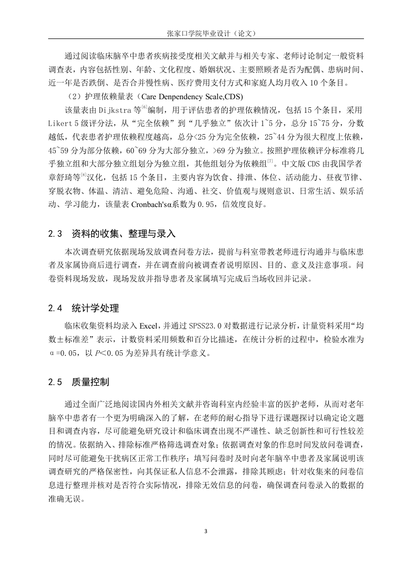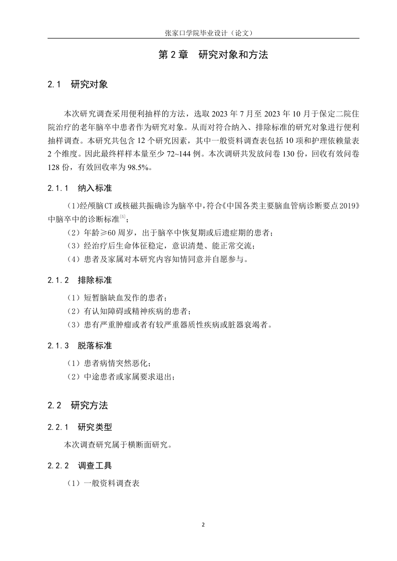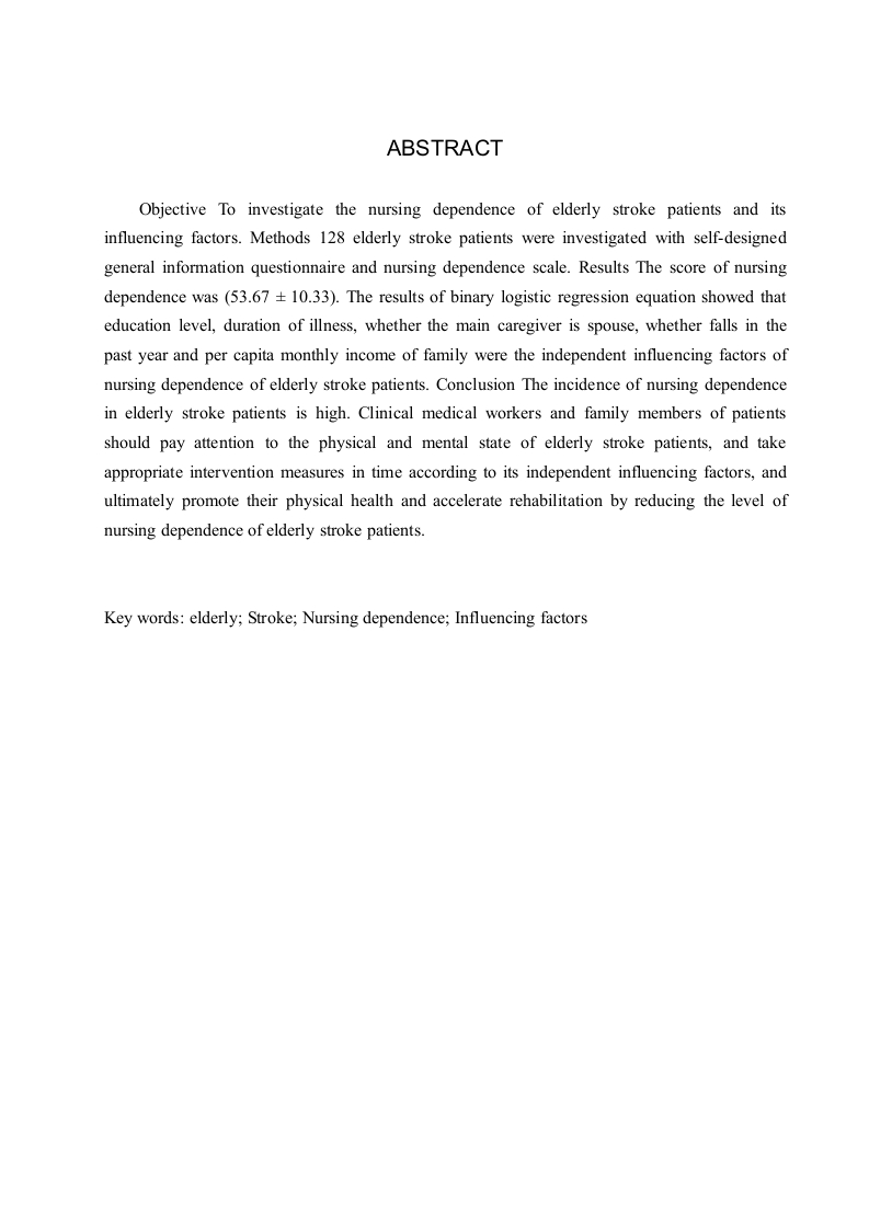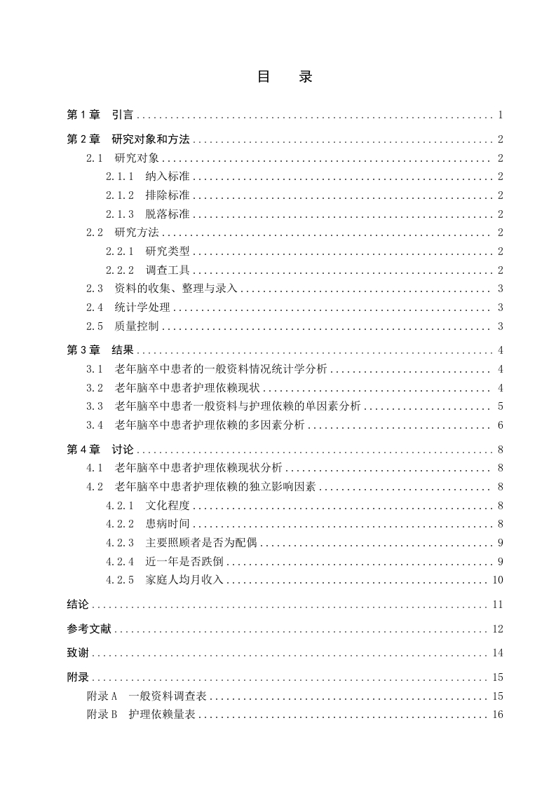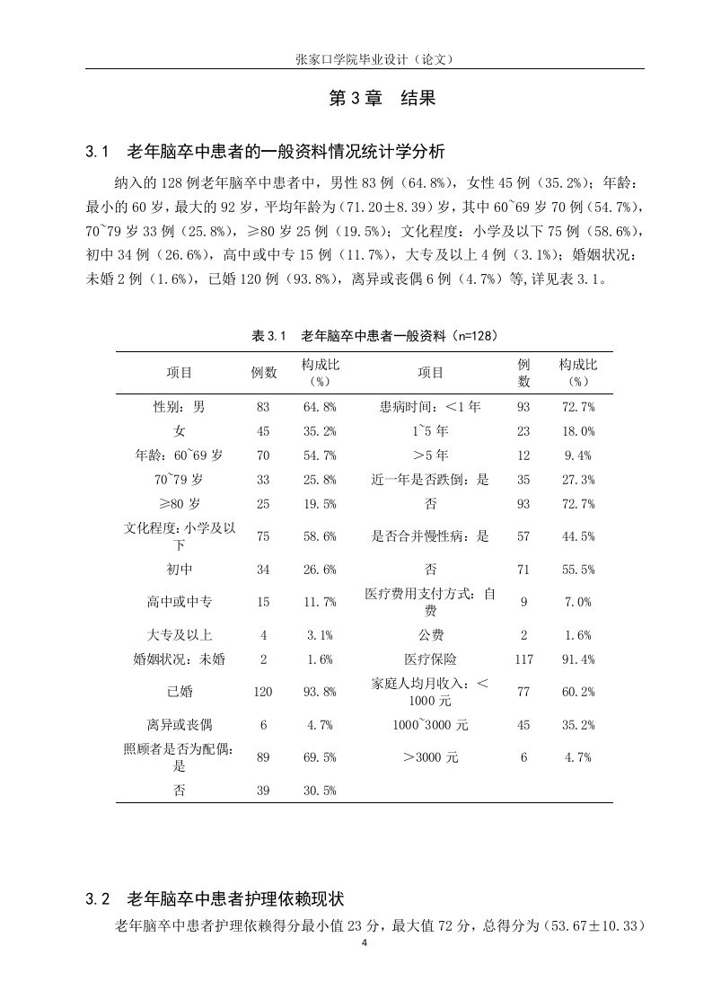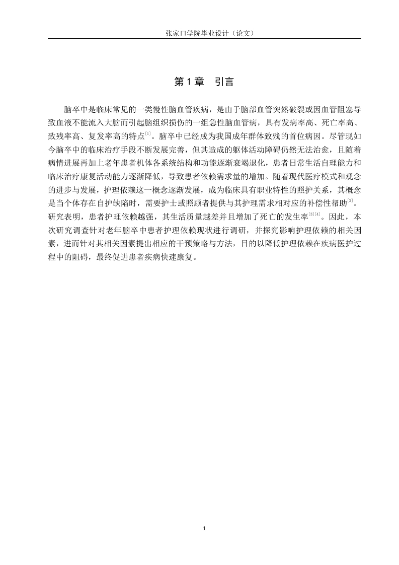 老年脑卒中患者护理依赖现状及影响因素分析摘要目的探讨老年脑卒中患者护理依赖度现状及影响因素,为今后老年脑卒中患者采取针对性干预措施提供有效的参考依据。方法采用自行设计的一般资料调查表与护理依赖量表对128例老年脑卒中患者进行调查。结果老年脑卒中患者护理依赖得分为(53.67±10.33)分。二分类Logistic回归方程分析结果显示文化程度、患病时间、主要照顾者是否为配偶、近一年是否跌倒和家庭人均月收入是老年脑卒中患者护理依赖的独立影响因素。结论临床老年脑卒中患者的护理依赖发生率较高。临床医护工作者及患者家属应着重关注老年脑卒中患者的疾病身心状态,针对其独立影响因素而及时采取相应引导干预措施,最终通过降低老年脑卒中患者护理依赖水平促进其躯体健康加速康复。关键词:老年人;脑卒中:护理依赖:影响因素ABSTRACTObjective To investigate the nursing dependence of elderly stroke patients and itsinfluencing factors.Methods 128 elderly stroke patients were investigated with self-designedgeneral information questionnaire and nursing dependence scale.Results The score of nursingdependence was (53.67 10.33).The results of binary logistic regression equation showed thateducation level,duration of illness,whether the main caregiver is spouse,whether falls in thepast year and per capita monthly income of family were the independent influencing factors ofnursing dependence of elderly stroke patients.Conclusion The incidence of nursing dependencein elderly stroke patients is high.Clinical medical workers and family members of patientsshould pay attention to the physical and mental state of elderly stroke patients,and takeappropriate intervention measures in time according to its independent influencing factors,andultimately promote their physical health and accelerate rehabilitation by reducing the level ofnursing dependence of elderly stroke patients.Key words:elderly;Stroke;Nursing dependence;Influencing factors目录第1章引言..…第2章研究对象和方法.2.1研究对象....22.1.1纳入标准.2.1.2排除标准.......22.1.3脱落标准..22.2研究方法....22.2.1研究类型....22.2.2调查工具.....P2.3资料的收集、整理与录入32.4统计学处理。。。32.5质量控制...........第3章结果3.1老年脑卒中患者的一般资料情况统计学分析.......43.2老年脑卒中患者护理依赖现状.....…….43.3老年脑卒中患者一般资料与护理依赖的单因素分析.…53.4老年脑卒中患者护理依赖的多因素分析.·6第4章讨论....4.1老年脑卒中患者护理依赖现状分析...84.2老年脑卒中患者护理依赖的独立影响因素.....84.2.1文化程度...........84.2.2患病时间...4.2.3主要照顾者是否为配偶4.2.4近一年是否跌倒..….94.2.5家庭人均月收入10结论11参考文献12致谢..14附录15附录A一般资料调查表15附录B护理依赖量表...16张家口学院毕业设计(论文)第1章引言脑卒中是临床常见的一类慢性脑血管疾病,是由于脑部血管突然破裂或因血管阻塞导致血液不能流入大脑而引起脑组织损伤的一组急性脑血管病,具有发病率高、死亡率高、致残率高、复发率高的特点。脑卒中已经成为我国成年群体致残的首位病因。尽管现如今脑卒中的临床治疗手段不断发展完善,但其造成的躯体活动障碍仍然无法治愈,且随着病情进展再加上老年患者机体各系统结构和功能逐渐衰竭退化,患者日常生活自理能力和临床治疗康复活动能力逐渐降低,导致患者依赖需求量的增加。随着现代医疗模式和观念的进步与发展,护理依赖这一概念逐渐发展,成为临床具有职业特性的照护关系,其概念是当个体存在自护缺陷时,需要护士或照顾者提供与其护理需求相对应的补偿性帮助②。研究表明,患者护理依赖越强,其生活质量越差并且增加了死亡的发生率。因此,本次研究调查针对老年脑卒中患者护理依赖现状进行调研,并探究影响护理依赖的相关因素,进而针对其相关因素提出相应的干预策略与方法,目的以降低护理依赖在疾病医护过程中的阻碍,最终促进患者疾病快速康复。