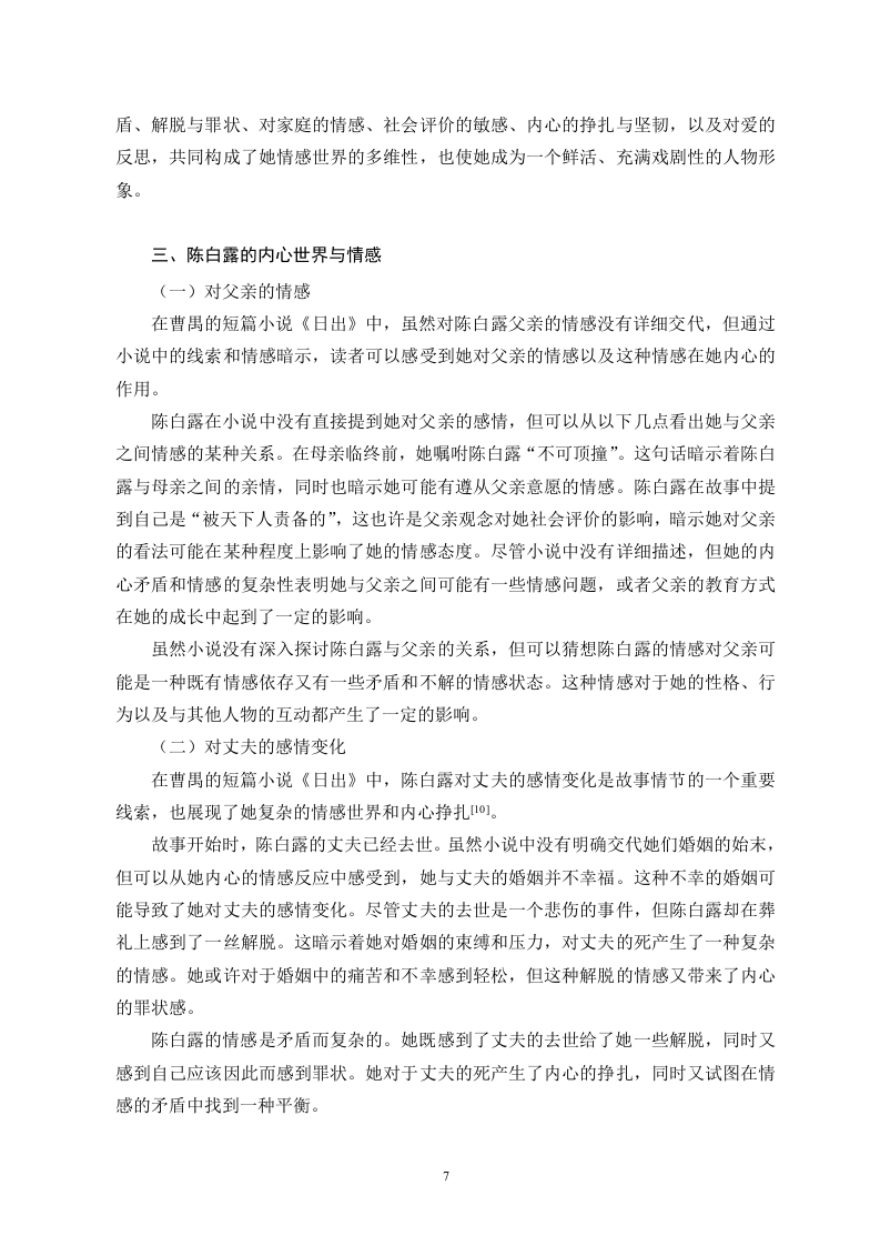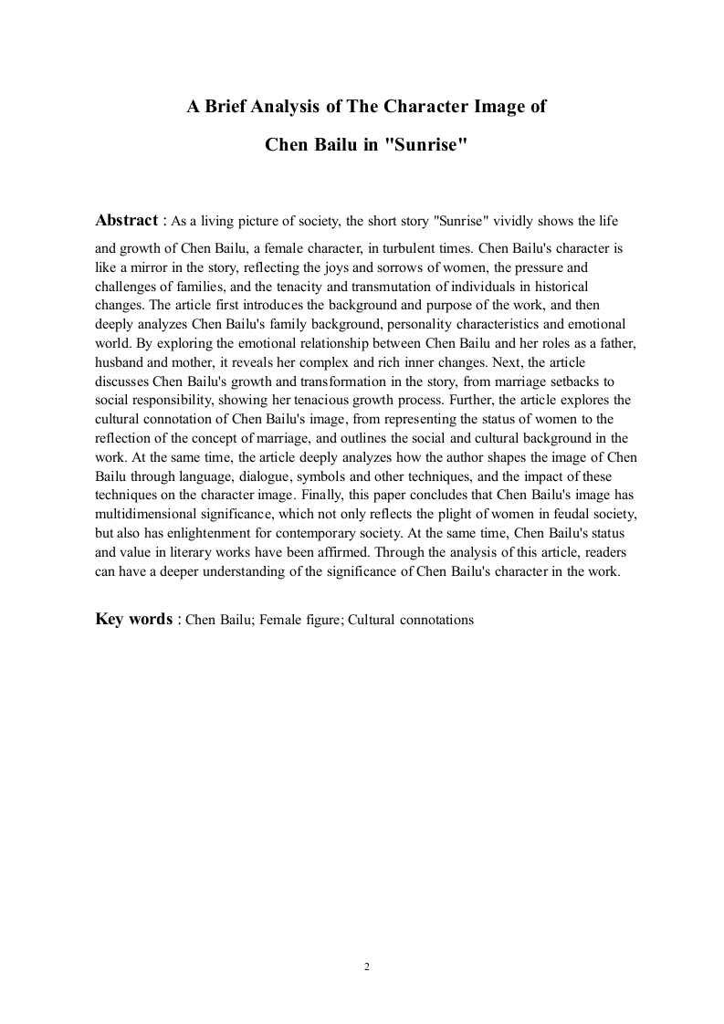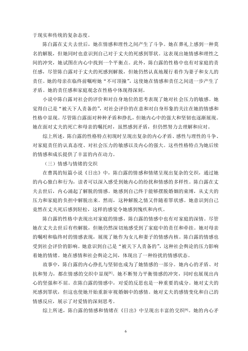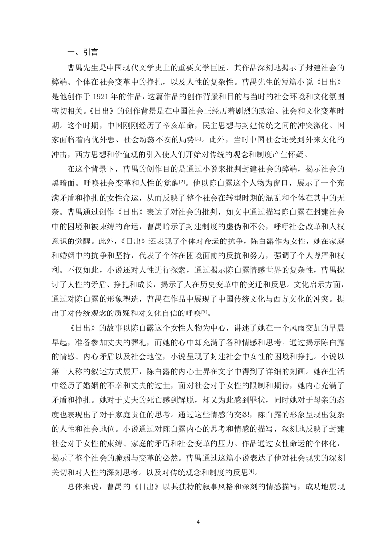 浅析《日出》陈白露的人物形象摘要:短篇小说《日出》作为一幅鲜活的社会画卷,生动地展示了陈白露这一女性角色在动荡时代中的生活与成长。陈白露的人物形象在故事中犹如一枚镜子,映照出女性的悲欢离合、家庭的压力与挑战、以及个体在历史变革中的坚韧与嬗变。文章首先介绍了作品的背景和目的,随后深入剖析了陈白露的家庭背景、性格特点以及情感世界。通过对陈白露与父亲、丈夫、母亲角色之间的情感关系进行探讨,揭示了她复杂而丰富的内心变化。接着,文章讨论了陈白露在故事中的成长与转变,从婚姻挫折到社会担当,呈现了她坚韧的成长过程。进一步,文章探讨了陈白露形象所蕴含的文化内涵,从代表女性地位到婚烟观念的反思,勾勒出了作品中的社会文化背景。同时,文章深入分析了作者通过语言、对话、符号等手法如何塑造了陈白露这一形象,以及这些手法对人物形象的影响。最终,本文得出结论,陈白露的形象具有多维意义,不仅反映了封建社会女性的困境,也对当代社会产生了启示。同时,陈白露在文学作品中的地位与价值得到了肯定。通过本文的分析,读者可以更深刻地理解陈白露这一人物形象在作品中的重要意义。关键词:陈白露:女性形象:文化内涵1A Brief Analysis of The Character Image ofChen Bailu in "Sunrise"Abstract As a living picture of society,the short story "Sunrise"vividly shows the lifeand growth of Chen Bailu,a female character,in turbulent times.Chen Bailu's character islike a mirror in the story,reflecting the joys and sorrows of women,the pressure andchallenges of families,and the tenacity and transmutation of individuals in historicalchanges.The article first introduces the background and purpose of the work,and thendeeply analyzes Chen Bailu's family background,personality characteristics and emotionalworld.By exploring the emotional relationship between Chen Bailu and her roles as a father,husband and mother,it reveals her complex and rich inner changes.Next,the articlediscusses Chen Bailu's growth and transformation in the story,from marriage setbacks tosocial responsibility,showing her tenacious growth process.Further,the article explores thecultural connotation of Chen Bailu's image,from representing the status of women to thereflection of the concept of marriage,and outlines the social and cultural background in thework.At the same time,the article deeply analyzes how the author shapes the image of ChenBailu through language,dialogue,symbols and other techniques,and the impact of thesetechniques on the character image.Finally,this paper concludes that Chen Bailu's image hasmultidimensional significance,which not only reflects the plight of women in feudal society,but also has enlightenment for contemporary society.At the same time,Chen Bailu's statusand value in literary works have been affirmed.Through the analysis of this article,readerscan have a deeper understanding of the significance of Chen Bailu's character in the work.Key words Chen Bailu;Female figure;Cultural connotations2目录一、言...二、陈白露的背景与性格描写6(一)家庭背景与社会环境。。。。。6(二)性格特点的初现6(三)情感与情绪的交织............7三、陈白露的内心世界与情感8(一)对父亲的情感.....8(二)对丈夫的感情变化..6(三)母亲角色的心路历程...··9四、陈白露的成长与转变9(一)婚姻生活的挫折与奋斗9(二)社会角色的转变与担当10(三)对抗与坚韧的成长过程10五、陈白露的形象意义与文化内涵..·....11(一)代表女性在封建社会的地位11(二)对婚姻观念的反思与启示12(三)对时代背景的文化映射12六、结论.13参考文献:132一、引言曹禺先生是中国现代文学史上的重要文学巨匠,其作品深刻地揭示了封建社会的弊端、个体在社会变革中的挣扎,以及人性的复杂性。曹禺先生的短篇小说《日出》是他创作于1921年的作品,这篇作品的创作背景和目的与当时的社会环境和文化氛围密切相关。《日出》的创作背景是在中国社会正经历着剧烈的政治、社会和文化变革时期。这个时期,中国刚刚经历了辛亥革命,民主思想与封建传统之间的冲突激化。国家面临着内忧外患、社会动荡不安的局势山。此外,当时中国社会还受到外来文化的冲击,西方思想和价值观的引入使人们开始对传统的观念和制度产生怀疑。在这个背景下,曹禺的创作目的是通过小说来批判封建社会的弊端,揭示社会的黑暗面。呼唤社会变革和人性的觉醒。他以陈白露这个人物为窗口,展示了一个充满矛盾和挣扎的女性命运,从而反映了整个社会在转型时期的混乱和个体在其中的无奈。曹禺通过创作《日出》表达了对社会的批判,如文中通过描写陈白露在封建社会中的困境和被束缚的命运,曹禺暗示了封建制度的虚伪和不公,呼吁社会改革和