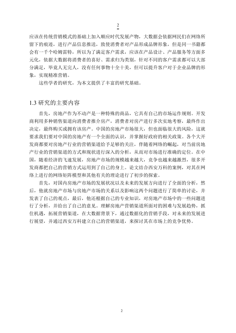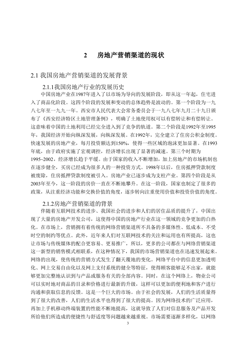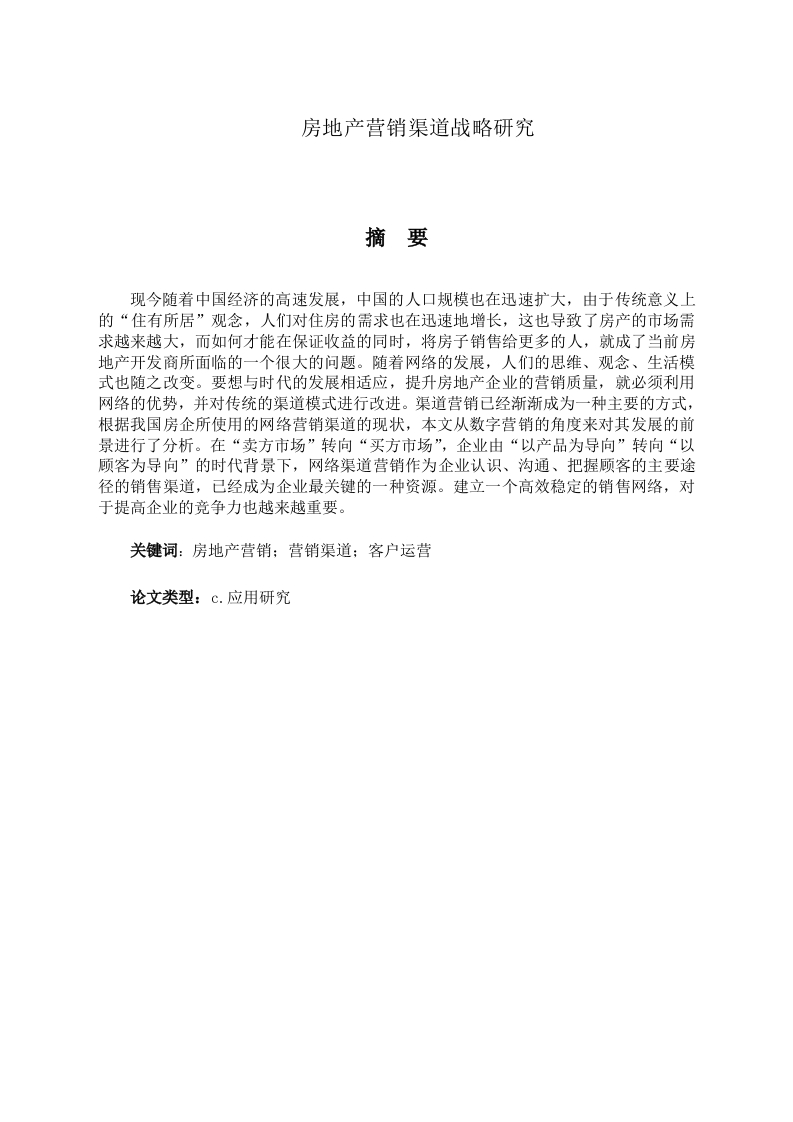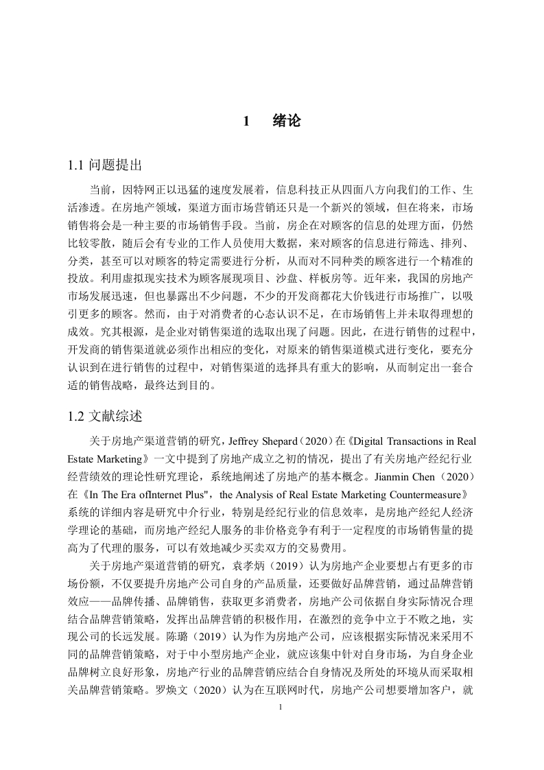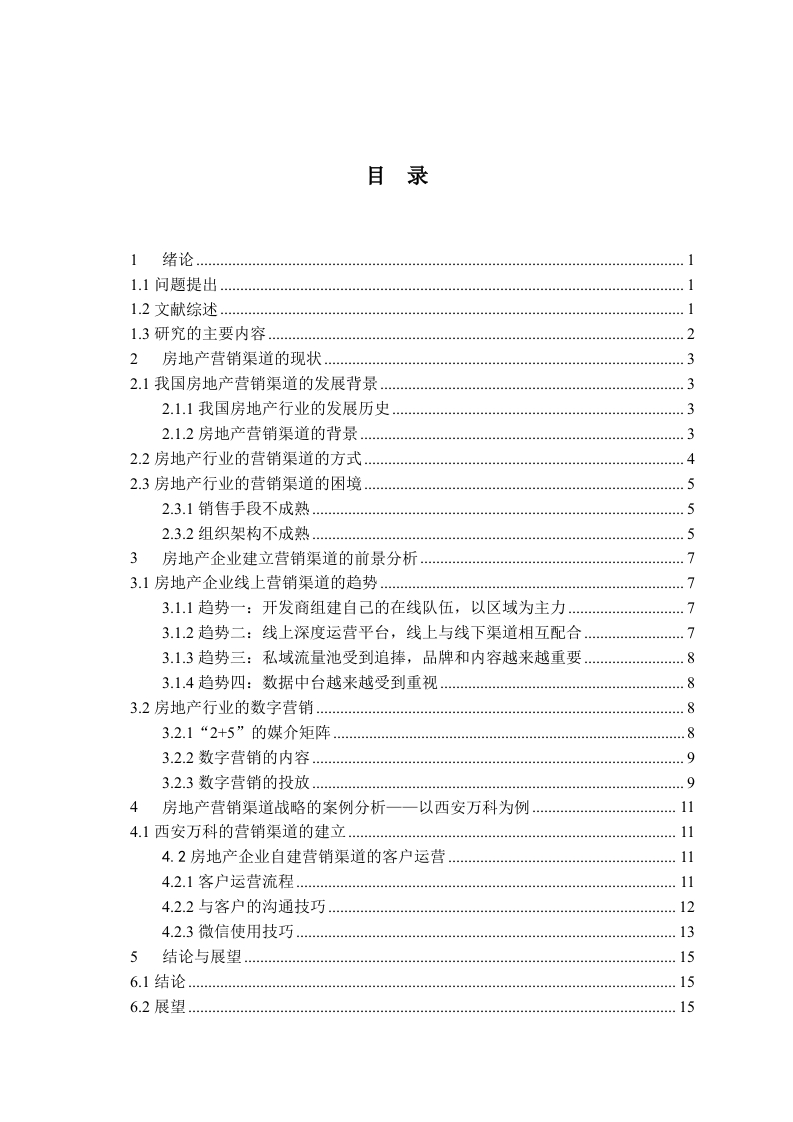 房地产营销渠道战略研究摘要现今随着中国经济的高速发展,中国的人口规模也在迅速扩大,由于传统意义上的“住有所居”观念,人们对住房的需求也在迅速地增长,这也导致了房产的市场需求越来越大,而如何才能在保证收益的同时,将房子销售给更多的人,就成了当前房地产开发商所面临的一个很大的问题。随着网络的发展,人们的思维、观念、生活模式也随之改变。要想与时代的发展相适应,提升房地产企业的营销质量,就必须利用网络的优势,并对传统的渠道模式进行改进。渠道营销已经渐渐成为一种主要的方式,根据我国房企所使用的网络营销渠道的现状,本文从数字营销的角度来对其发展的前景进行了分析。在“卖方市场”转向“买方市场”,企业由“以产品为导向”转向“以顾客为导向”的时代背景下,网络渠道营销作为企业认识、沟通、把握顾客的主要途径的销售渠道,已经成为企业最关键的一种资源。建立一个高效稳定的销售网络,对于提高企业的竞争力也越来越重要。关键词:房地产营销:营销渠道;客户运营论文类型:C.应用研究目录1绪论1.1问题提出11.2文献综述1.3研究的主要内容.…。2房地产营销渠道的现状…32.1我国房地产营销渠道的发展背景.32.1.1我国房地产行业的发展历史32.1.2房地产营销渠道的背景.32.2房地产行业的营销渠道的方式…2.3房地产行业的营销渠道的困境.52.3.1销售手段不成熟2.3.2组织架构不成熟53房地产企业建立营销渠道的前景分析.73.1房地产企业线上营销渠道的趋势.73.1.1趋势一:开发商组建自己的在线队伍,以区域为主力..73.1.2趋势二:线上深度运营平台,线上与线下渠道相互配合…73.1.3趋势三:私域流量池受到追捧,品牌和内容越来越重要.83.1.4趋势四:数据中台越来越受到重视83.2房地产行业的数字营销.83.2.1“2+5”的媒介矩阵.83.2.2数字营销的内容93.2.3数字营销的投放.94房地产营销渠道战略的案例分析一一以西安万科为例114.1西安万科的营销渠道的建立114.2房地产企业自建营销渠道的客户运营114.2.1客户运营流程114.2.2与客户的沟通技巧124.2.3微信使用技巧.135结论与展望156.1结论….156.2展望.15致谢16文献444444.本人负责因论文成果不实产生的法律纠纷。18毕业论文知识产权权属声明..18