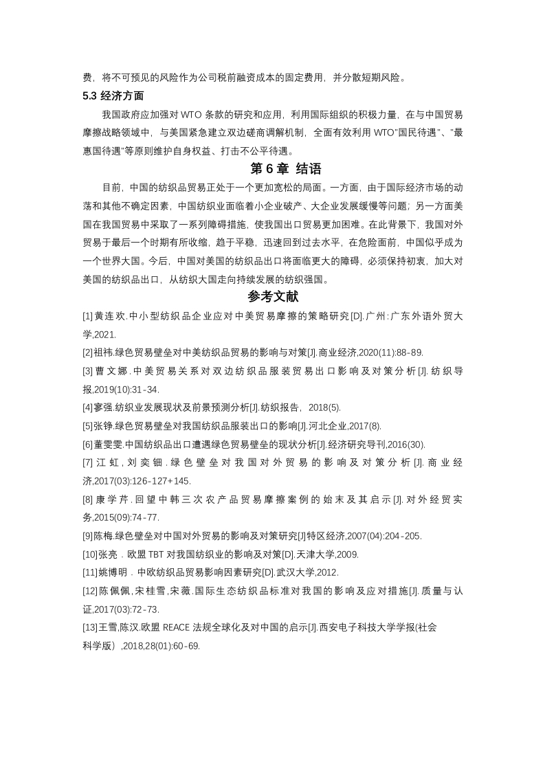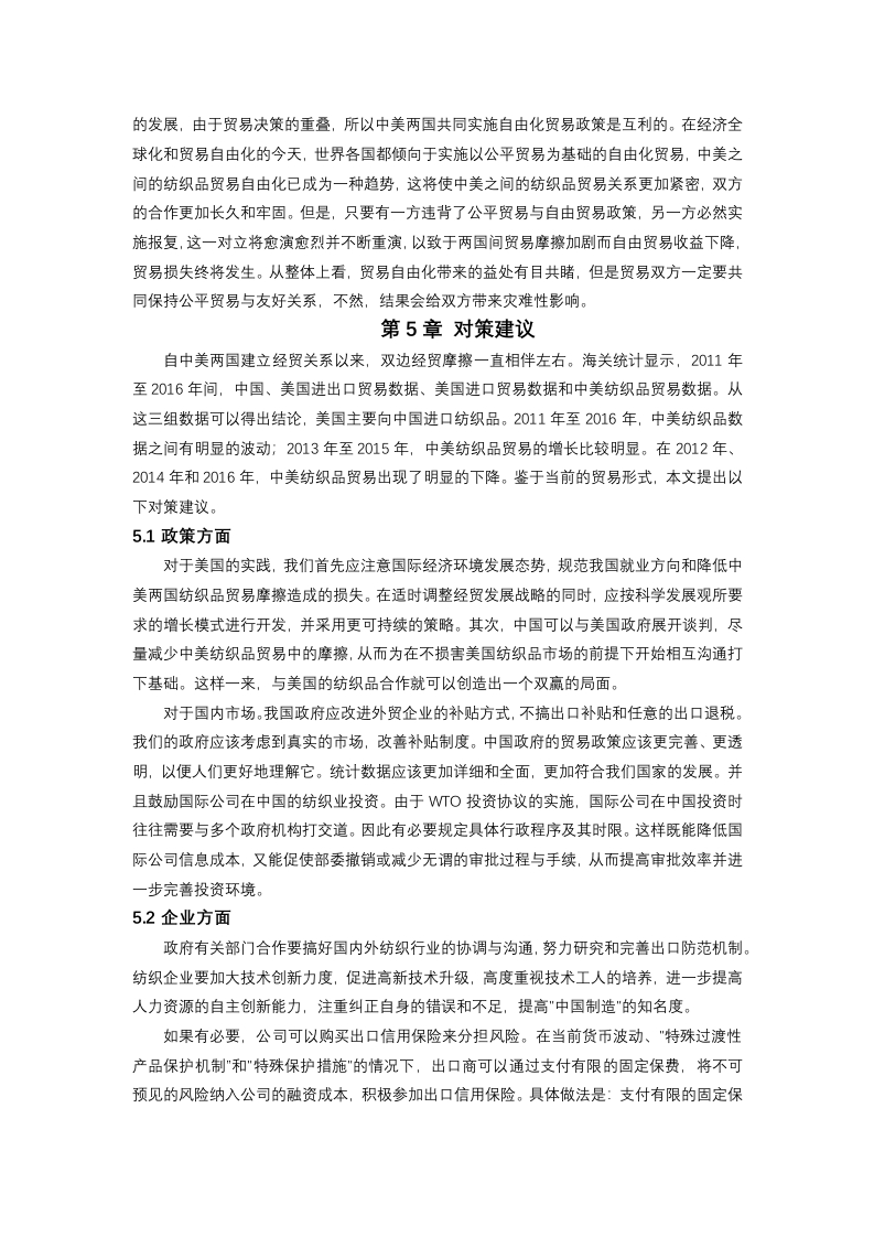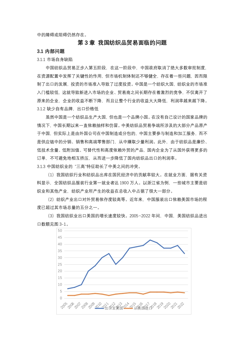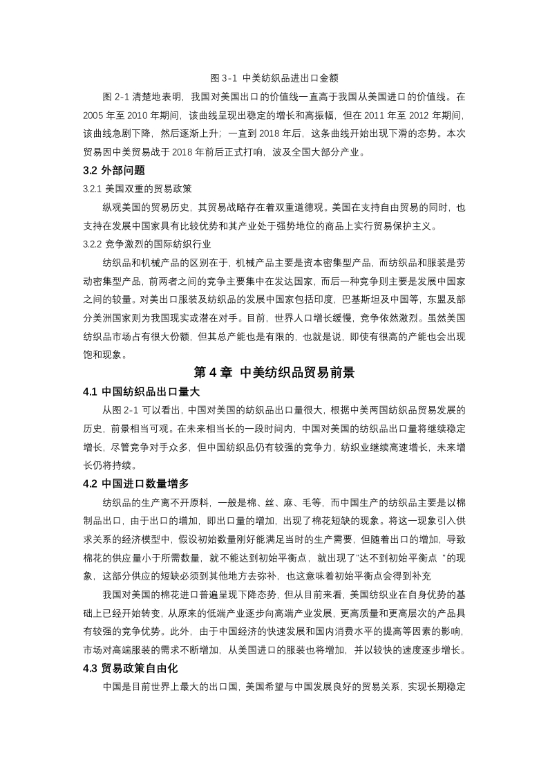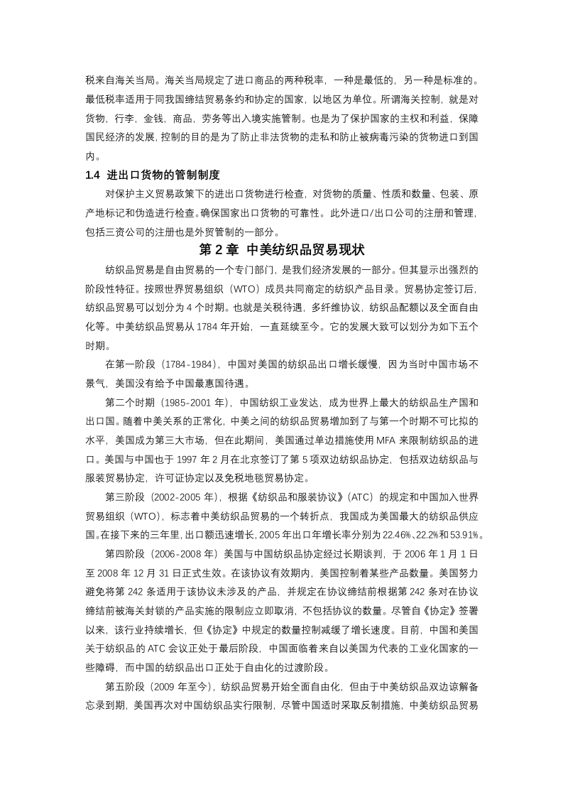中美纺织品贸易现状分析摘要自20世纪90年代以来,中国的经济发展取得了重大进展。其中,对外贸易的增长空间加大。中国与美国的纺织品贸易占了其中的一部分。纺织业是中国的一个优势传统产业。在过去的二十年里,中国的纺织业不断扩大,在全球纺织品和服装贸易中发挥着重要作用,出口地区达到二百多个国家。然而,随着2005年1月1日《纺织品与服装协议》(ATC)的废除,中国的纺织品与服装贸易发生了变化。2005年1月1日《纺织品与服装协议》的废除,标志着中国纺织品出口行业开始进入"后配额时代”。美国一再对中国纺织品出口施加特别保障措施和技术壁垒。近年来,中国也受到了来自人民币汇率的压力。在此背景下,文章分析了中美之间纺织品贸易的现状和前景。关键词:纺织品;中美贸易;现状分析AbstractSince the 1990s,China has made significant progress in its economic development.Amongthese,there has been increased scope for growth in foreign trade.China's textile trade withthe United States accounts for some of this.However,With the abrogation of the Agreementon Textiles and Clothing on 1 January 2005,trade in textiles and clothing in China's trade haschanged.The abrogation of the Agreement on Textiles and Clothing on 1 January 2005marked the beginning of the "post-quota era"for China's textile export industry.The UnitedStates has repeatedly imposed special safeguard measures and technical barriers on China'stextile exports.In recent years.China has also come under pressure from the exchange rateof the Renminbi.Against this background,the article analyses the current situation andprospects of textile trade between the US and China.Keywords:textiles;China-US trade;analysis of the current situation第1章中美纺织品贸易相关法律制度1.1进出口许可制度等所有部门,单位和个人进口或者出口的材料,都必须符合规定。除可豁免进出口许可证(Export/import license)外,都要办理进出口许可证。海关以许可证及有关文件经检查后方可释放。1.2外汇管制制度等对于外汇,采取国家集中管理,统一管理的方针。集中管理就是外汇管理权由中央集中统一管理的意思。所有外汇、贵金属买卖,都在国家规定银行进行。钞票是按照国家外汇管理局的统一标准发行的。还提出汇率过高或过低都会引起国内外的震荡。1.3保障性关税和海关监管制度保障性关税主要指进口关税。为保护国内市场及有关行业,对外进口产品加征关税。关税来自海关当局。海关当局规定了进口商品的两种税率,一种是最低的,另一种是标准的。最低税率适用于同我国缔结贸易条约和协定的国家,以地区为单位。所谓海关控制,就是对货物,行李,金钱,商品,劳务等出入境实施管制。也是为了保护国家的主权和利益,保障国民经济的发展,控制的目的是为了防止非法货物的走私和防止被病毒污染的货物进口到国内。1.4进出口货物的管制制度对保护主义贸易政策下的进出口货物进行检查,对货物的质量、性质和数量、包装、原产地标记和伪造进行检查。确保国家出口货物的可靠性。此外进口/出口公司的注册和管理,包括三资公司的注册也是外贸管制的一部分。第2章中美纺织品贸易现状纺织品贸易是自由贸易的一个专门部门,是我们经济发展的一部分。但其显示出强烈的阶段性特征。按照世界贸易组织(WTO)成员共同商定的纺织产品目录。贸易协定签订后纺织品贸易可以划分为4个时期。也就是关税待遇,多纤维协议,纺织品配额以及全面自由化等。中美纺织品贸易从1784年开始,一直延续至今。它的发展大致可以划分为如下五个时期。在第一阶段(1784-1984),中国对美国的纺织品出口增长缓慢,因为当时中国市场不景气,美国没有给予中国最惠国待遇。第二个时期(1985-2001年),中国纺织工业发达,成为世界上最大的纺织品生产国和出口国。随着中美关系的正常化,中美之间的纺织品贸易增加到了与第一个时期不可比拟的水平,美国成为第三大市场,但在此期间,美国通过单边措施使用MFA来限制纺织品的进口。美国与中国也于1997年2月在北京签订了第5项双边纺织品协定,包括双边纺织品与服装贸易协定,许可证协定以及免税地毯贸易协定。第三阶段(2002-2005年),根据《纺织品和服装协议》(ATC)的规定和中国加入世界贸易组织(WTO),标志着中美纺织品贸易的一个转折点,我国成为美国最大的纺织品供应国。在接下来的三年里,出口额迅速增长,2005年出口年增长率分别为22.46%、22.2%和53.91%。第四阶段(2006-2008年)美国与中国纺织品协定经过长期谈判,于2006年1月1日至2008年12月31日正式生效。在该协议有效期内,美国控制着某些产品数量。美国努力避免将第242条适用于该协议未涉及的产品,并规定在协议缔结前根据第242条对在协议缔结前被海关封锁的产品实施的限制应立即取消,不包括协议的数量。尽管自《协定》签署以来,该行业持续增长,但《协定》中规定的数量控制减缓了增长速度。目前,中国和美国关于纺织品的ATC会议正处于最后阶段,中国面临着来自以美国为代表的工业化国家的一些障碍,而中国的纺织品出口正处于自由化的过渡阶段。第五阶段(2009年至今),纺织品贸易开始全面自由化,但由于中美纺织品双边谅解备忘录到期,美国再次对中国纺织品实行限制,尽管中国适时采取反制措施,中美纺织品贸易中的障碍或阻碍仍然存在。第3章我国纺织品贸易面临的问题3.1内部问题3.1.1市场自身缺陷中国纺织品贸易正步入第五