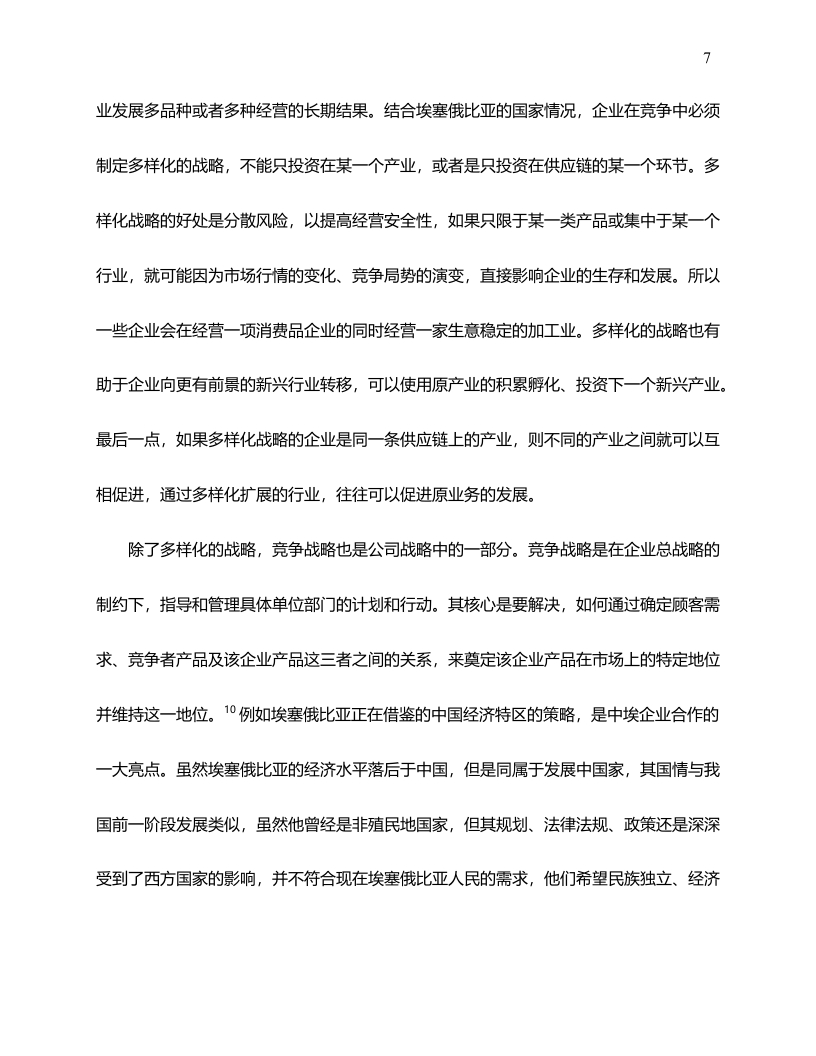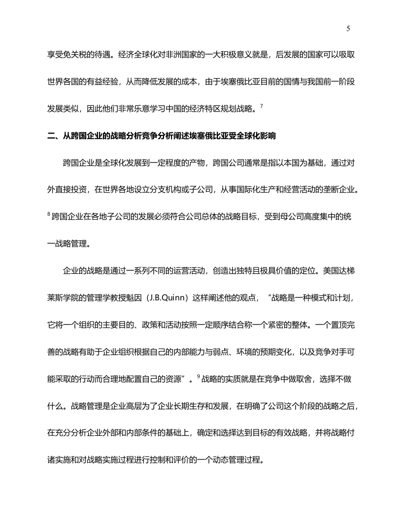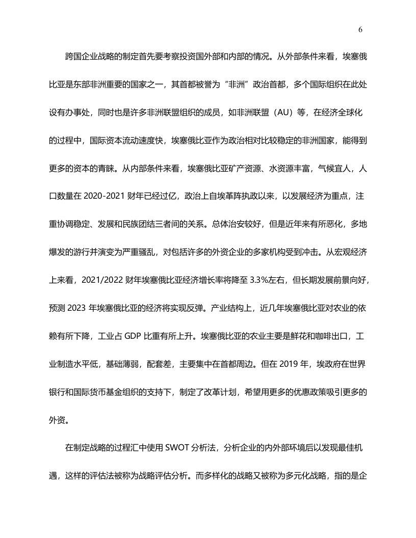 试论全球化对埃塞俄比亚国家影响摘要全球化是当今世界经济发展的主要特点和趋势,越来越多的国家借助全球化浪潮提供的历史机遇,加快了经济发展的步伐。但在过去几十年中,在全球化浪潮的冲击下,非洲国家的经济发展普遍出现了停滞、衰退、甚至恶化的局面。这当然和非洲历史有内在的关联,曾经的非洲各国遭受长期的殖民统治,有很多的国家目前还使用法语作为其官方语言,因此在独立后不可能在短期内立刻拥有完善的民主和繁荣的经济,在这种情况下盲目地冲入全球化的浪潮,就造成了非洲在国际政治、经济生活中日益边缘化。埃塞俄比亚位于非洲东部,是一个具有3000多年历史的文明古国,也是非洲人口第二大国,其首都在非洲具有独特的政治地位。货物与资本的跨国流动是全球化的最初形态,在此过程中出现了地区性、国际性的经济管理组织与跨国企业,本文首先从埃塞俄比亚的国情,经济发展现状出发,论述在埃塞俄比亚的跨国组织的战略及竞争态势,以及在组织治理中应遵循的法律和道德考虑,进而从跨国组织在非洲的发展及对非洲产生的影响,分析全球化如何影响这个国家。关键词:全球化埃塞俄比亚跨国组织战略2试论全球化对埃塞俄比亚国家影响“全球化”这一思想首先出现于西方学者于1960年提出的"地球村”(globalvillage)概念。那时指的是由于通信技术的发展,地球上的人们能够克服自然因素的障碍,可以自由地传递信息。1到了20世纪80年代上半期,美国经济学家泰奥多尔莱维特(Theodore Levitt)第一次使用了"全球化”这个词汇在其发表的《谈市场全球化》一文中。文中的对“全球化”这个概念,他是这样描述的:“涉及到国际贸易,特别是跨国公司的全球化管理以及它们在世界各地建立工厂并销售自己的商品的能力问题.…全球化意味着市场的融合,意味着跨国企业可在全球任何地方以同一方式销售自己的产品”。这个时候的全球化还被局限在某一个公司经历跨国化。2“全球化”作为一个超越国家和民族界限的概念,还没有一个统一的定义,从物质形态看,全球化是指货物与资本跨境流动,在此过程中,出现了相应的地区性、国际性的经济管理组织与经济实体,以及文化生活方式、价值观念、意识形态等精神力量的跨国交流、碰撞、冲突与融合。3一、全球化对非洲及埃塞俄比亚的影响20世纪80年以来的经济全球化,加快了国际资本在国家间的流动速度,使得发展中国家吸收到大量资本。在这一过程中有一种联合自强的道路思想在当时很有影响,塞内3加尔经济学家马马杜·迪亚将是这样描述的:“在发展经济过程中,非洲国家单打独斗不足以使效率最大化,只有建立区域经济体或实现非洲统一方能使有限的资源大道合理有效的优化配置,进而通过降低成本使非洲国家迅速摆脱不发达状态。”4在一定程度上全球化强化了经济一体化,从而带动了这块大陆的政治一体化,至少已经激发了非洲国家内的知识分子谋求独立发展的念头。跨国公司在非洲也得到了迅猛的发展,大笔国际资金的涌入,一定程度上弥补了非洲国家重建过程中的资金不足,促进了经济总量的增长。但向对应的,本该属于非洲国家的利润也在大量外流。“跨国企业的涌入对非洲国家产业结构的优化和升级起到引导和催化的作用。”5就非洲自然条件来说,矿产资源丰富,采矿业比较发达,制造业落后,经济结构单一,在国际上的商品流通受到限制,国内的经济发展依赖国际市场。而跨国企业进入后,带来先进技术,投资非洲的基础设施例如铁路、通信、能源等,为非洲产业结构调整创造了基础。其次,跨国企业在非洲通过承包工程、兴办合营企业,将技术转移给当地工人,特别是将先进的技术转移给在当地的子公司,这也对产业结构的升级起到了积极作用。但同时,由于国际资本是以效益为导向,注重高效生产,会偏重投资在政治相对稳定,基础设施较好,或者矿产资源更丰富的国家,而且会偏重在商业中心、矿山、港口等基础设施建设,从而导致非洲不同国家之间的收入差距越拉越大,政治越稳定的国家,接收到4的国际资本投资就更多,经济发展就越繁荣;在单个国家内则不利于非洲地区之间的商品交流,也不利于形成全国统一市场。非洲国家的工业原先就是在各种保护措施下成长起来的民族工业,竞争意识差,缺乏活力。当跨国公司拿到国家国有企业私有化的优惠政策,在跨国公司的要求下,相关产业的非洲企业必然会想办法降低产品的成本,从而提高效率,结果必然激发这些企业的活力。但跨国公司的国际经营具有垄断性和独占性,必然会使用自身优势挤压本土小企业的发展空间,从而在一定程度上制约非洲国家民族工业的发展,综上所述,全球化对非洲国家的发展既有积极影响,也有消极影响,非洲要实现独立和经济繁荣还将面临严峻的挑战,本文尝试分析埃塞俄比亚的探索和经济现状成果来展示非洲国家可以选择的一条参与全球化的道路。埃塞俄比亚的经济发展现状从宏观上来讲是快速发展中的非洲低收入国家。从地理上看,埃塞俄比亚位于非洲东北部,是非洲之角的核心,国内23的地形为高原,东北大裂谷将埃塞俄比亚高地分割成南北两个部分,矿产资源和水资源丰富。在2020-2021财年,该国的人口数量过亿,国内生产总值(GDP)约为1112.7亿美元,增长率为6.3%。在全球化的经济浪潮中,埃塞俄比亚