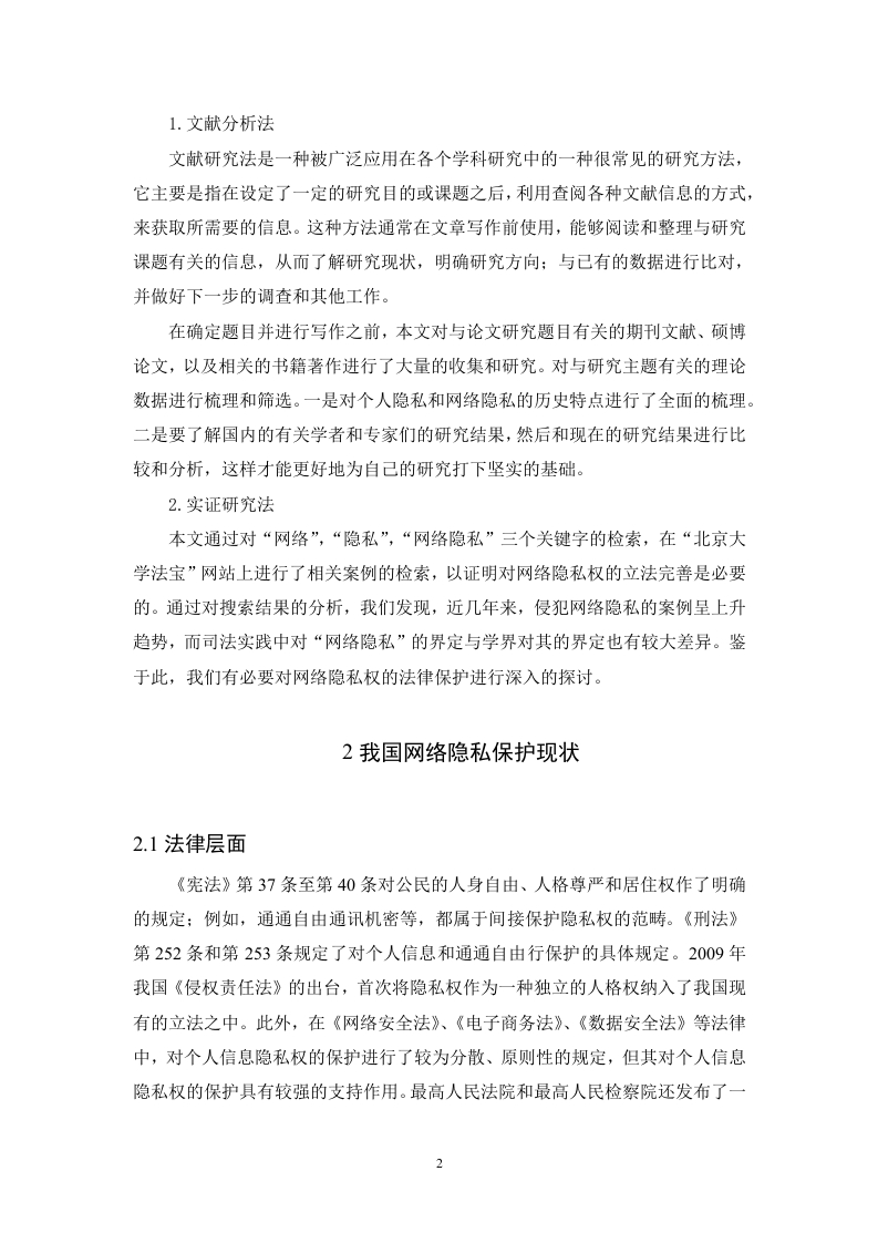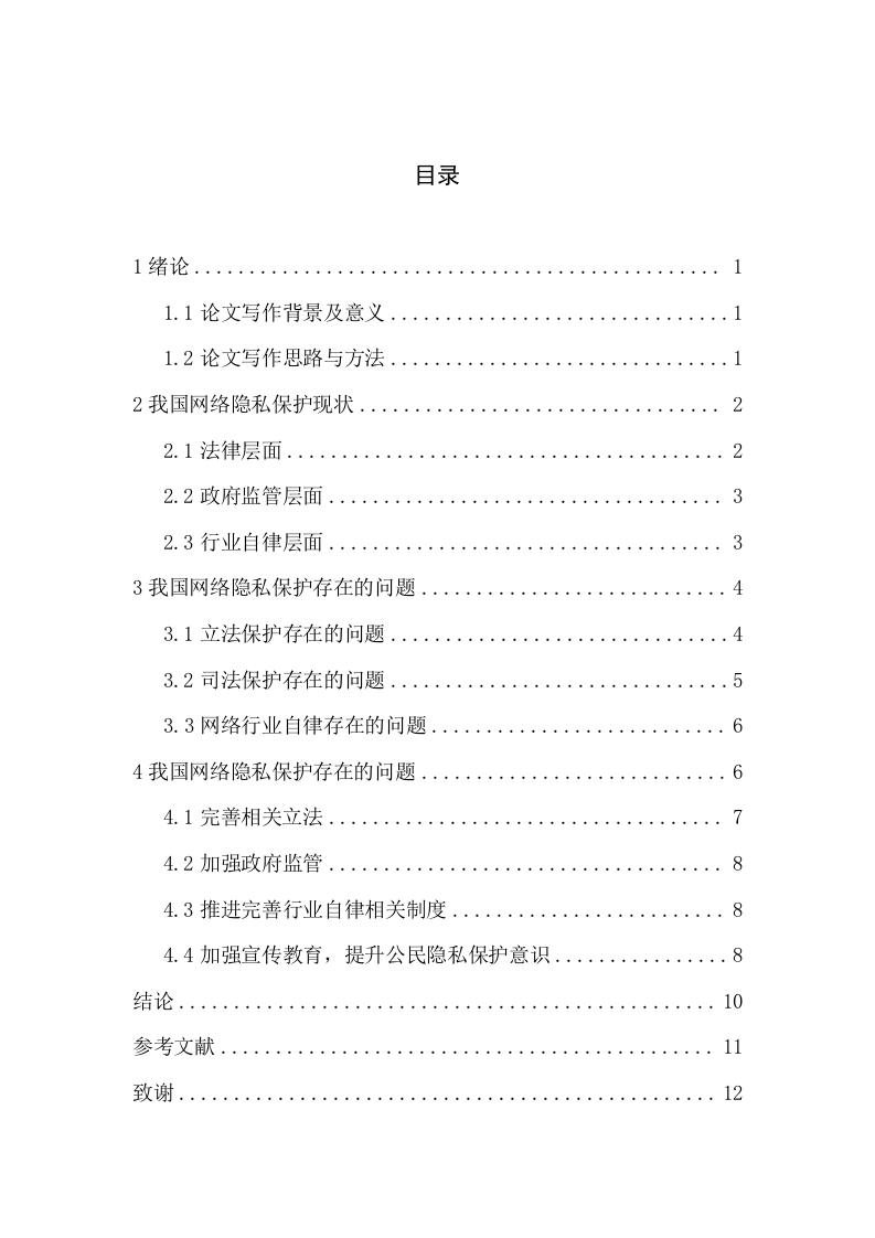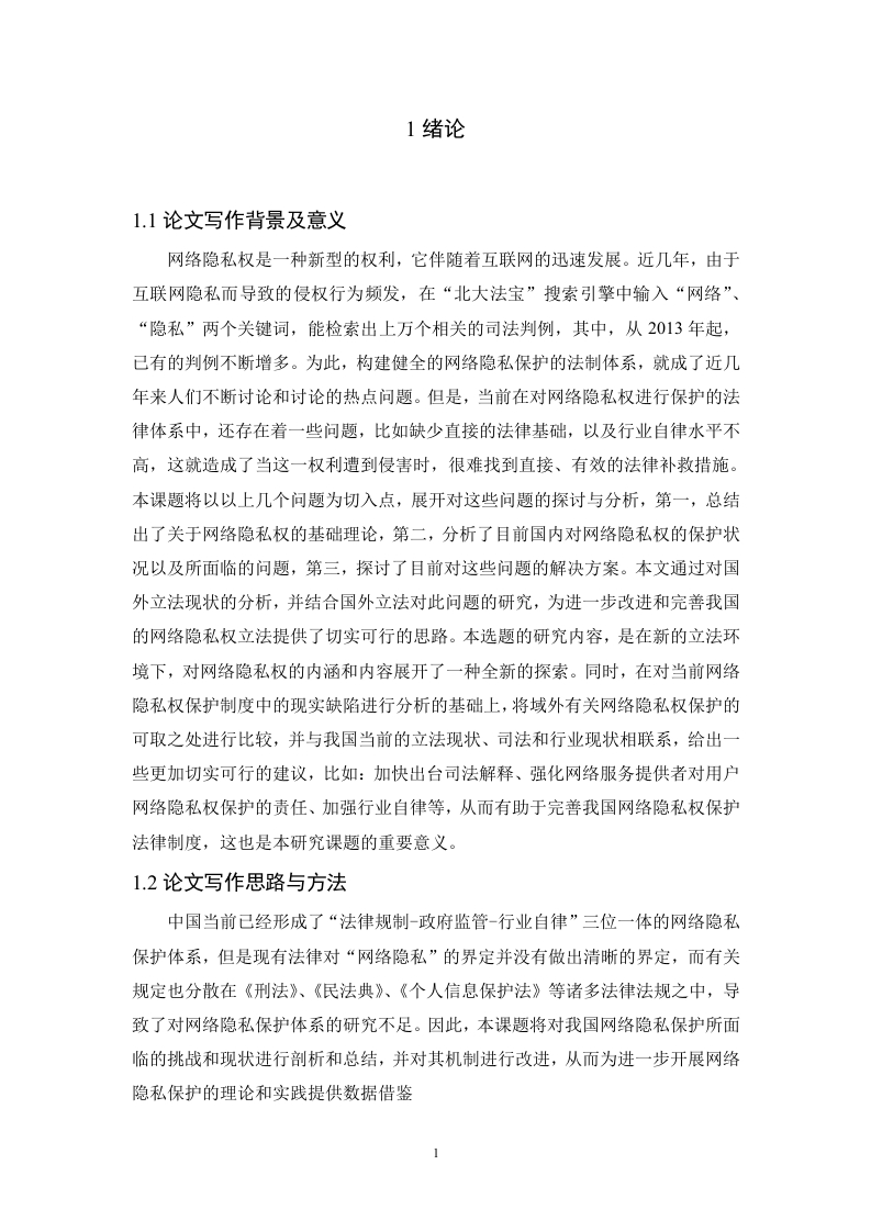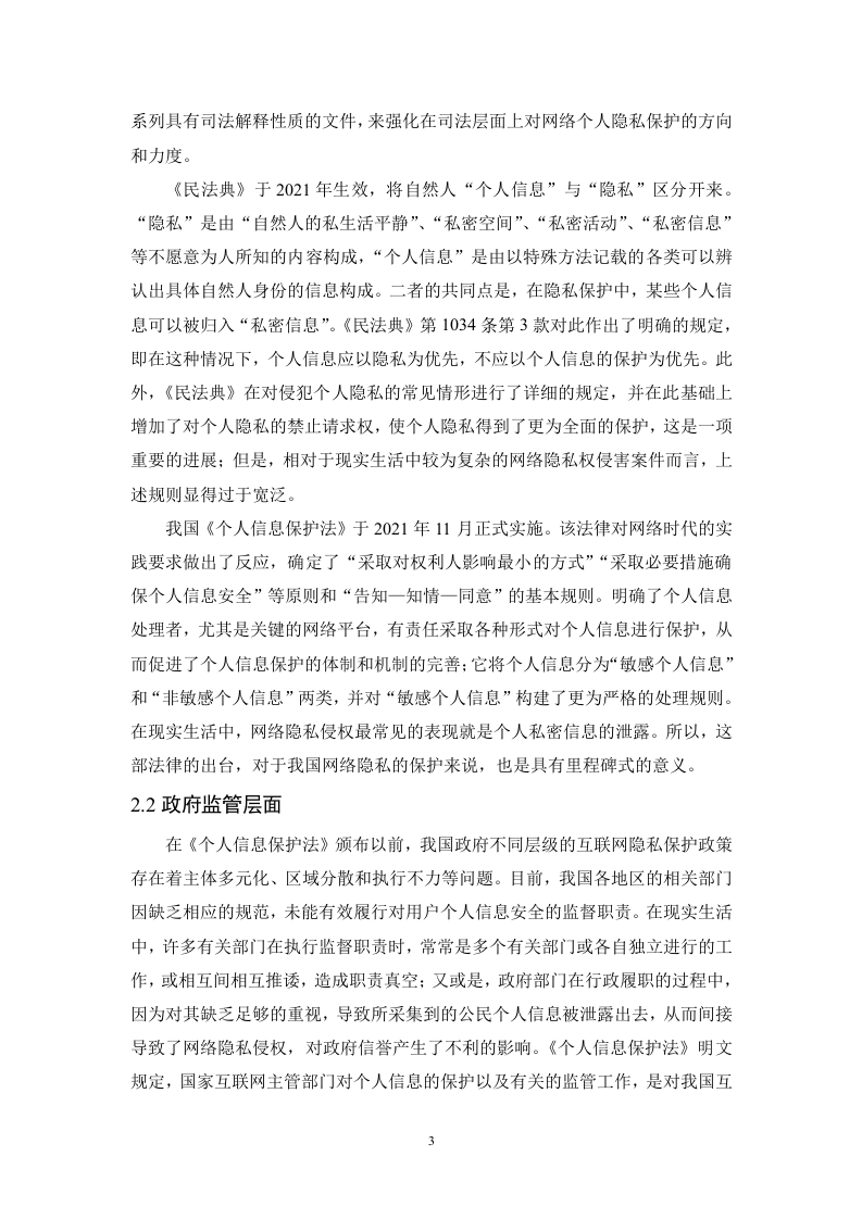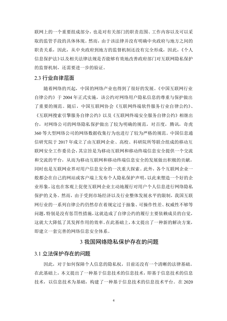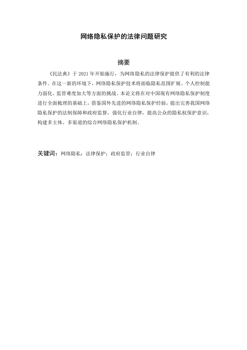 网络隐私保护的法律问题研究摘要《民法典》于2021年开始施行,为网络隐私的法律保护提供了有利的法律条件。在这一新的环境下,网络隐私保护技术将面临隐私范围扩展、个人控制能力弱化、监管难度加大等方面的挑战。本论文将在对中国现有网络隐私保护制度进行全面梳理的基础上,借鉴国外先进的网络隐私保护经验,提出完善我国网络隐私保护的法制保障和政府监督,强化行业自律,提高公众的隐私权保护意识,构建多主体、多渠道的综合网络隐私保护机制。关键词:网络隐私:法律保护:政府监管:行业自律目录1绪论...1.1论文写作背景及意义.....1.2论文写作思路与方法....2我国网络隐私保护现状..22.1法律层面.....22.2政府监管层面....32.3行业自律层面......33我国网络隐私保护存在的问题...43.1立法保护存在的问题....。3.2司法保护存在的问题...3.3网络行业自律存在的问题..·.64我国网络隐私保护存在的问题64.1完善相关立法.......4.2加强政府监管..84.3推进完善行业自律相关制度64.4加强宣传教育,提升公民隐私保护意识..··.8结论..10参考文献...11致谢..121绪论1.1论文写作背景及意义网络隐私权是一种新型的权利,它伴随着互联网的迅速发展。近几年,由于互联网隐私而导致的侵权行为频发,在“北大法宝”搜索引擎中输入“网络”、“隐私”两个关键词,能检索出上万个相关的司法判例,其中,从2013年起,已有的判例不断增多。为此,构建健全的网络隐私保护的法制体系,就成了近几年来人们不断讨论和讨论的热点问题。但是,当前在对网络隐私权进行保护的法律体系中,还存在着一些问题,比如缺少直接的法律基础,以及行业自律水平不高,这就造成了当这一权利遭到侵害时,很难找到直接、有效的法律补救措施。本课题将以以上几个问题为切入点,展开对这些问题的探讨与分析,第一,总结出了关于网络隐私权的基础理论,第二,分析了目前国内对网络隐私权的保护状况以及所面临的问题,第三,探讨了目前对这些问题的解决方案。本文通过对国外立法现状的分析,并结合国外立法对此问题的研究,为进一步改进和完善我国的网络隐私权立法提供了切实可行的思路。本选题的研究内容,是在新的立法环境下,对网络隐私权的内涵和内容展开了一种全新的探索。同时,在对当前网络隐私权保护制度中的现实缺陷进行分析的基础上,将域外有关网络隐私权保护的可取之处进行比较,并与我国当前的立法现状、司法和行业现状相联系,给出一些更加切实可行的建议,比如:加快出台司法解释、强化网络服务提供者对用户网络隐私权保护的责任、加强行业自律等,从而有助于完善我国网络隐私权保护法律制度,这也是本研究课题的重要意义。1.2论文写作思路与方法中国当前已经形成了“法律规制-政府监管-行业自律”三位一体的网络隐私保护体系,但是现有法律对“网络隐私”的界定并没有做出清晰的界定,而有关规定也分散在《刑法》、《民法典》、《个人信息保护法》等诸多法律法规之中,导致了对网络隐私保护体系的研究不足。因此,本课题将对我国网络隐私保护所面临的挑战和现状进行剖析和总结,并对其机制进行改进,从而为进一步开展网络隐私保护的理论和实践提供数据借鉴