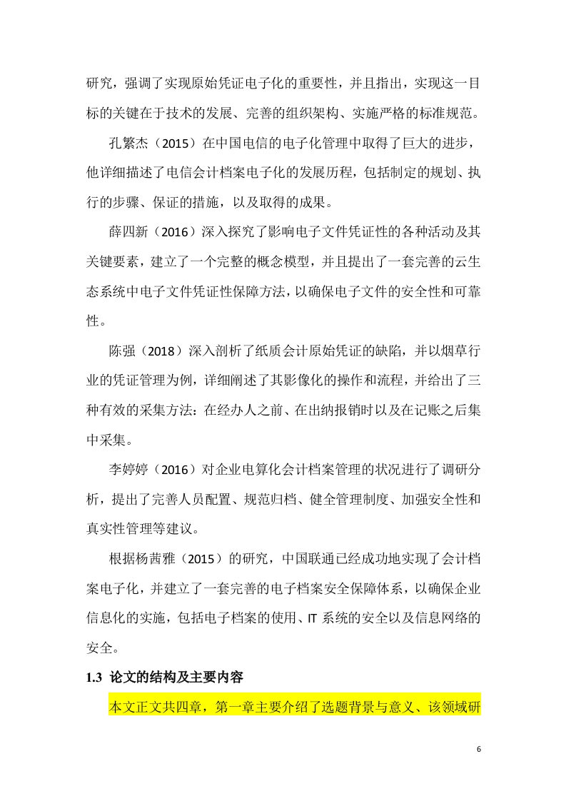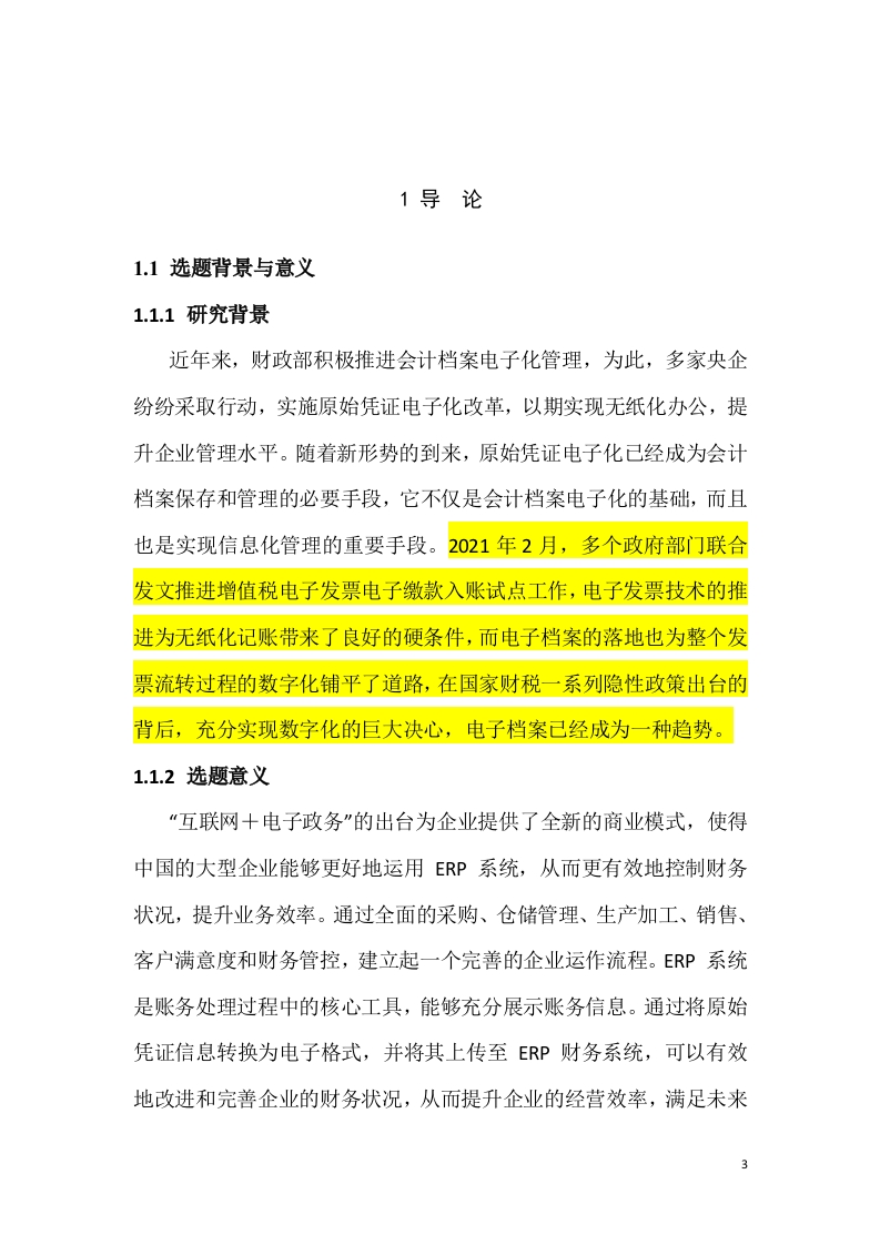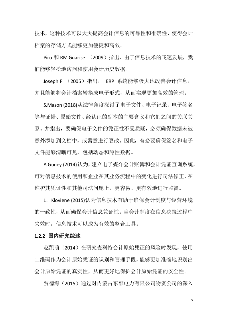 试析大数据时代电子凭证应用问题及推广思路摘要近些年,随着大数据技术的飞速发展,数字技术不仅可以收集、分析海量数据,还可以应用于各行各业,尤其是会计信息化时代,它极大地改变了会计凭证使用和保存的方式,极大地提高了会计审计工作的效率和准确性。因此,大数据在会计信息化时代的重要性日益凸显,本文将深入探讨大数据环境下的电子会计凭证的推广和应用。为了更好地进行研究,本论文以大学会计档案电子化的应用为主要研究对象,通过文献研究法、案例分析法等方法研究其会计档案管理电子化平台的建设、应用和推广。大数据时代的到来使得会计行业发展迅猛,但也伴随着一些挑战和困难。本文将深入探讨如何有效地利用电子会计凭证来解决这些问题。首先,收集和总结了国内外现有的关于会计档案电子化管理的研究成果和相关理论,并将其作为本研究的理论基础。其次,电子会计凭证己经成为一种新兴的证明方式,它与传统的凭证形成了鲜明的对比。我们来比较纸质会计凭证和电子会计凭证的不同之处。通过这些比较,我们可以看出,电子会计凭证的发展是不可避免的。它是时代发展的结果,为会计行业带来了巨大的帮助。但也存在一些障碍,我们需要寻找解决方案。经过深入研究,我们可以得出结论:尽管电子会计凭证的普及仍有许多挑战和难题,但它在会计领域的发展是不可避免的。最后,国家关于电子会计凭证推出一系列政策,但政策和现实之间还存在着一系列问题,本文将进行深入探讨,以期电子凭证在大数据时代中取得进一步发展,实现更加有效的管理和运营。关键词:大数据时代:电子会计凭证:政策和现实差距y目录1导论……11.1选题背景与意义…112国内外文献综述…113论文的结构及主要内容…21.4论文的研究方法…22会计凭证与时代发展的适应性分析…21电子会计凭证应用的发展历程与现实选择…42.2电子会计凭证与纸质会计凭证的区别与联系523大数据时代凭证处理程序与方式对比分析…63国家关于电子凭证的政策和现实的差距问题分析…84关于适应电子凭证业务处理模式的具体建议…114.1完善电子会计凭证信息系统…1142定期检查数据,做好数据维护工作…1143做好备份,同时改善保存环境……1l4.4专业化会计公司提供服务…124.5加强电子凭证宣传教育…12结语…14参考文献15致谢…161导论1.1选题背景与意义1.1.1研究背景近年来,财政部积极推进会计档案电子化管理,为此,多家央企纷纷采取行动,实施原始凭证电子化改革,以期实现无纸化办公,提升企业管理水平。随着新形势的到来,原始凭证电子化已经成为会计档案保存和管理的必要手段,它不仅是会计档案电子化的基础,而且也是实现信息化管理的重要手段。2021年2月,多个政府部门联合发文推进增值税电子发票电子缴款入账试点工作,电子发票技术的推进为无纸化记账带来了良好的硬条件,而电子档案的落地也为整个发票流转过程的数字化铺平了道路,在国家财税一系列隐性政策出台的背后,充分实现数字化的巨大决心,电子档案已经成为一种趋势。1.1.2选题意义“互联网十电子政务”的出台为企业提供了全新的商业模式,使得中国的大型企业能够更好地运用EP系统,从而更有效地控制财务状况,提升业务效率。通过全面的采购、仓储管理、生产加工、销售、客户满意度和财务管控,建立起一个完善的企业运作流程。ERP系统是账务处理过程中的核心工具,能够充分展示账务信息。通过将原始凭证信息转换为电子格式,并将其上传至EP财务系统,可以有效地改进和完善企业的财务状况,从而提升企业的经营效率,满足未来企业财务管理的需求。随着科技的进步,电子会计凭证的使用越来越广泛,它们可以满足电子商务、电子政务的需求。这些举措将有助于提升财务管理的效率,促进财务信息的共享,并且可以规范基本的会计工作,实施文件的电子化归档,从而使整个报销、入账、归档流程都变得更加便捷。随着现代信息网络技术的飞速发展,传统的纸质会计凭证的印刷成本过高、开具效率过慢、管理缺乏规范性以及难以实施有效的监督检查,这些问题正在逐渐显现。随着“互联网十”、移动智能等信息技术的不断普及,我们必须加强对电子会计凭证的使用,以满足当今时代的财政制度改革和信息化发展的需求,并且不断完善传统的财务工作模式,最终实现财务信息化。另外,随着现代科学技术的日益发展,会计研究者也与时俱进,从最初的电算化到现在的智能财务平台,由于财务信息管理的研究相对成熟,但在会计档案信息管理领域,大部分研究还处于初级阶段。目前的会计档案管理研究大多还是基于传统的纸质会计档案管理,而对于电子会计档案管理信息平台这种新的会计档案管理方式的研究相对较少,为此,本文以中铁建设集团电子会计档案信息化管理为主要研究对象,以期丰富国内电子会计档案管理的研究理论,为会计档案信息化管理的实施过程提供支持。1.2国内外文献综述1.2.1国外研究综述在国外,Zybery1(2015)等认为未来的会计档案将更加依赖于电子