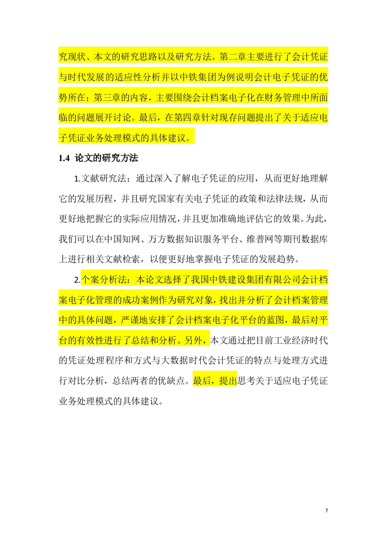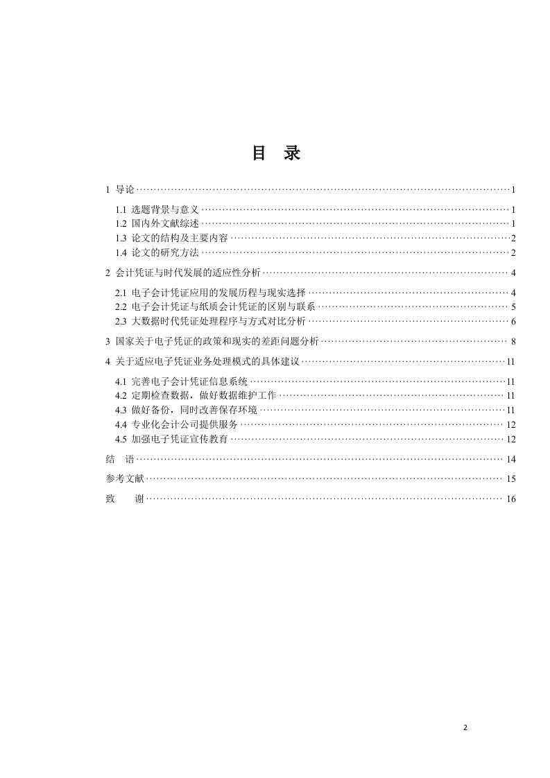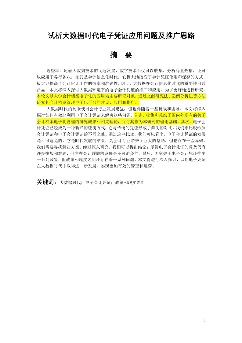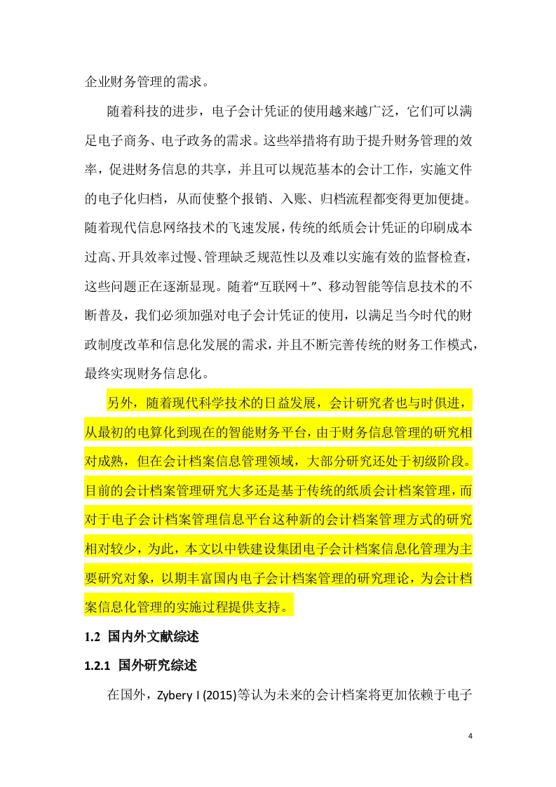 试析大数据时代电子凭证应用问题及推广思路摘要近些年,随着大数据技术的飞速发展,数字技术不仅可以收集、分析海量数据,还可以应用于各行各业,尤其是会计信息化时代,它极大地改变了会计凭证使用和保存的方式,极大地提高了会计审计工作的效率和准确性。因此,大数据在会计信息化时代的重要性日益凸显,本文将深入探讨大数据环境下的电子会计凭证的推广和应用。为了更好地进行研究,本论文以大学会计档案电子化的应用为主要研究对象,通过文献研究法、案例分析法等方法研究其会计档案管理电子化平台的建设、应用和推广。大数据时代的到来使得会计行业发展迅猛,但也伴随着一些挑战和困难。本文将深入探讨如何有效地利用电子会计凭证来解决这些问题。首先,收集和总结了国内外现有的关于会计档案电子化管理的研究成果和相关理论,并将其作为本研究的理论基础。其次,电子会计凭证己经成为一种新兴的证明方式,它与传统的凭证形成了鲜明的对比。我们来比较纸质会计凭证和电子会计凭证的不同之处。通过这些比较,我们可以看出,电子会计凭证的发展是不可避免的。它是时代发展的结果,为会计行业带来了巨大的帮助。但也存在一些障碍,我们需要寻找解决方案。经过深入研究,我们可以得出结论:尽管电子会计凭证的普及仍有许多挑战和难题,但它在会计领域的发展是不可避免的。最后,国家关于电子会计凭证推出一系列政策,但政策和现实之间还存在着一系列问题,本文将进行深入探讨,以期电子凭证在大数据时代中取得进一步发展,实现更加有效的管理和运营。关键词:大数据时代:电子会计凭证:政策和现实差距y目录1导论……11.1选题背景与意义…112国内外文献综述…113论文的结构及主要内容…21.4论文的研究方法…22会计凭证与时代发展的适应性分析…21电子会计凭证应用的发展历程与现实选择…42.2电子会计凭证与纸质会计凭证的区别与联系523大数据时代凭证处理程序与方式对比分析…63国家关于电子凭证的政策和现实的差距问题分析…84关于适应电子凭证业务处理模式的具体建议…114.1完善电子会计凭证信息系统…1142定期检查数据,做好数据维护工作…1143做好备份,同时改善保存环境……1l4.4专业化会计公司提供服务…124.5加强电子凭证宣传教育…12结语…14参考文献15致谢…161导论1.1选题背景与意义1.1.1研究背景近年来,财政部积极推进会计档案电子化管理,为此,多家央企纷纷采取行动,实施原始凭证电子化改革,以期实现无纸化办公,提升企业管理水平。随着新形势的到来,原始凭证电子化已经成为会计档案保存和管理的必要手段,它不仅是会计档案电子化的基础,而且也是实现信息化管理的重要手段。2021年2月,多个政府部门联合发文推进增值税电子发票电子缴款入账试点工作,电子发票技术的推进为无纸化记账带来了良好的硬条件,而电子档案的落地也为整个发票流转过程的数字化铺平了道路,在国家财税一系列隐性政策出台的背后,充分实现数字化的巨大决心,电子档案已经成为一种趋势。1.1.2选题意义“互联网十电子政务”的出台为企业提供了全新的商业模式,使得中国的大型企业能够更好地运用EP系统,从而更有效地控制财务状况,提升业务效率。通过全面的采购、仓储管理、生产加工、销售、客户满意度和财务管控,建立起一个完善的企业运作流程。ERP系统是账务处理过程中的核心工具,能够充分展示账务信息。通过将原始凭证信息转换为电子格式,并将其上传至EP财务系统,可以有效地改进和完善企业的财务状况,从而提升企业的经营效率,满足未来企业财务管理的需求。随着科技的进步,电子会计凭证的使用越来越广泛,它们可以满足电子商务、电子政务的需求。这些举措将有助于提升财务管理的效率,促进财务信息的共享,并且可以规范基本的会计工作,实施文件的电子化归档,从而使整个报销、入账、归档流程都变得更加便捷。随着现代信息网络技术的飞速发展,传统的纸质会计凭证的印刷成本过高、开具效率过慢、管理缺乏规范性以及难以实施有效的监督检查,这些问题正在逐渐显现。随着“互联网十”、移动智能等信息技术的不断普及,我们必须加强对电子会计凭证的使用,以满足当今时代的财政制度改革和信息化发展的需求,并且不断完善传统的财务工作模式,最终实现财务信息化。另外,随着现代科学技术的日益发展,会计研究者也与时俱进,从最初的电算化到现在的智能财务平台,由于财务信息管理的研究相对成熟,但在会计档案信息管理领域,大部分研究还处于初级阶段。目前的会计档案管理研究大多还是基于传统的纸质会计档案管理,而对于电子会计档案管理信息平台这种新的会计档案管理方式的研究相对较少,为此,本文以中铁建设集团电子会计档案信息化管理为主要研究对象,以期丰富国内电子会计档案管理的研究理论,为会计档案信息化管理的实施过程提供支持。1.2国内外文献综述1.2.1国外研究综述在国外,Zybery1(2015)等认为未来的会计档案将更加依赖于电子