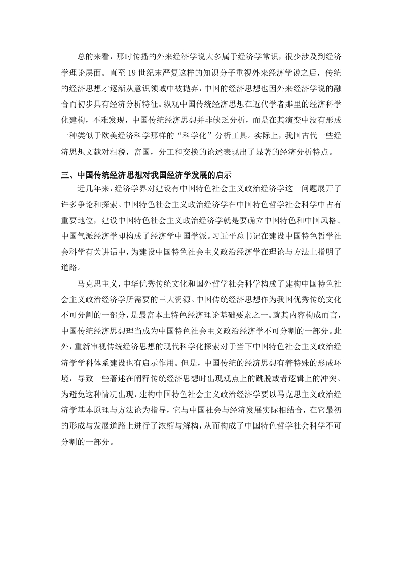 浅析中国古代经济思想对当代经济学发展的启示一、中国古代经济思想概述经济思想是人们对现实经济生活的一种意识反映,在人类还未分析过经济现象时,经济现象早已经出现。中国经济传说可上溯到公元前30世纪。这些传说集中在农业方面。西周时期经济思想注重农业生产,并认识到商业对于社会经济的影响。中国传统经济思想在春秋时期就已产生了“义利”“轻重”“黜奢崇俭”等思想、范式或者原则。春秋末期至战国时期,各诸侯国间兼并战争此起彼伏,国家进行变法改革,持不同观点的学派相继形成,相互争鸣,相互攻击,各个学派也派生出各种派别,其经济主张中蕴涵着大量经济思想。秦汉时期,儒家开始汲取其他流派的意见以巩固其文化地位,中国传统经济思想渐趋保守。汉元帝时,重本抑末,贵义贱利,黜奢崇俭成为封建正统的经济观念。自三国、两晋、南北朝至清代中叶,历代王朝基本都采取相同的传统思想文化来维护国家社会经济秩序。正因为如此,虽然在个别时期还会有少数非正统反传统经济思想产生,但是中国经济思想中的主流却是承袭了以前封建正统经济思想。当代少数几位西方经济思想史学者意识到了中国传统经济思想的科学性,他们甚至认为先秦时期一些著述可与欧美早期经济科学典籍相媲美。二、中国传统经济思想中的“科学化”特征中国古代很长一段时间是“以农立国”,农业是经济结构的主体。经济思想所附庸的经济基础以农业经济为主,所以中国传统经济思想几千年来未有大的转变,有关生产,消费和交换等、分配等方面的探讨继续停留于前科学阶段而没有像西方经济思想一样演变为18世纪中后期的经济科学。近代之后,外来工业文明对本土农业文明产生冲击,中国传统经济思想所附庸的经济基础发生根本性动摇。第一次鸦片战争以后,西方资本主义继续攫取中国经济利益,中国自然经济日趋解体,被迫被卷入世界资本主义体系之中。部分士人提倡向西方富国强兵之术学习,自上而下地进行变革,重新审视原有经济政策和价值观念,从而出现“学习西方”思潮。学习西方,注重商业发展和鼓励私营的经济思想为洋务派,改良派和革命派所传承,并且不断地赋予其新的含义。总的来看,那时传播的外来经济学说大多属于经济学常识,很少涉及到经济学理论层面。直至19世纪末严复这样的知识分子重视外来经济学说之后,传统的经济思想才逐渐从意识领域中被抛弃,中国的经济思想也因外来经济学说的融合而初步具有经济分析特征。纵观中国传统经济思想在近代学者那里的经济科学化建构,不难发现,中国传统经济思想并非缺乏分析,而是在其演变中没有形成一种类似于欧美经济科学那样的“科学化”分析工具。实际上,我国古代一些经济思想文献对租税,富国,分工和交换的论述表现出了显著的经济分析特点。三、中国传统经济思想对我国经济学发展的启示近几年来,经济学界对建设有中国特色社会主义政治经济学这一问题展开了许多争论和探索。中国特色社会主义政治经济学在中国特色哲学社会科学中占有重要地位,建设中国特色社会主义政治经济学就是要确立中国特色和中国风格、中国气派经济学即构成了经济学中国学派。习近平总书记在建设中国特色哲学社会科学有关讲话中,为建设中国特色社会主义政治经济学在理论与方法上指明了道路。马克思主义,中华优秀传统文化和国外哲学社会科学构成了建构中国特色社会主义政治经济学所需要的三大资源。中国传统经济思想作为我国优秀传统文化不可分割的一部分,是最富本土特色经济理论基础要素之一。就其内容构成而言,中国传统经济思想理当成为中国特色社会主义政治经济学不可分割的一部分。此外,重新审视传统经济思想的现代科学化探索对于当下中国特色社会主义政治经济学学科体系建设也有启示作用。但是,中国传统的经济思想有着特殊的形成环境,导致一些著述在阐释传统经济思想时出现观点上的跳脱或者逻辑上的冲突。为避免这种情况出现,建构中国特色社会主义政治经济学要以马克思主义政治经济学基本原理与方法论为指导,它与中国社会与经济发展实际相结合,在它最初的形成与发展道路上进行了浓缩与解构,从而构成了中国特色哲学社会科学不可分割的一部分。