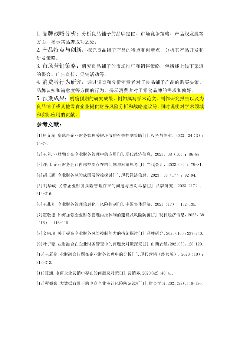 企业的财务风险分析及防范一以良品铺子为例一、课题的目的及意义良品铺子股份有限公司(以下简称良品铺子)从全球30个国家、地区选取好原料,旨在为消费者提供高端零食。对良品铺子一些年份的股东权益比率、资产结构、资本结构、股权结构等分别进行分析,并与良品铺子股份有限公司(以下简称良品铺子)的数据进行对比分析,指出良品铺子在公司财务管理方面存在的问题及原因,并提出相应的优化建议。理论意义:本文以良品铺子为例,从企业财务风险出发,对此进行研究讨论,分析现阶段不同因素对财务风险的影响程度,争取为将来相关行业财务风险控制的研究提供新思路。在企业经营投资的实施过程中,财务风险是难以避免的。本文以良品铺子近三年的财务状况表现为出发点,丰富了现有的电商零食企业的财务风险研究现实意义:在全球经济普遍下行的背景之下,我国虽然大力推行各种简政放权政策,助推各类民营企业发展,但是由于企业内部存在的各种不稳定性因素,如所有权转移、资金周转效率低下等导致结果仍然差强人意。本文研究的重点是企业在投资经营的实施过程中如何避免财务风险的负面影响。通常情况下,企业的财务状况不仅受到宏观经济的制约,也与企业经营战略息息相关。在所处行业宏观环境压力较大、竞争激烈的情况下,本研究为其他电商零售企业提供参考。同时也为其他企业迅速适应发展节奏提供帮助,以带动整个行业良性竞争。二、课题任务、重点研究内容及实现途径(一)背景介绍:在背景介绍中,需要简要介绍良品铺子的发展历程、品牌定位、产品特点以及市场竞争情况。说明为什么选择良品铺子作为研究对象,并对该领域现有研究进行概述。(二)目标与意义:明确研究的目标和意义,例如通过研究良品铺子,可以了解到中国零食市场的发展趋势以及品牌在市场中的竞争地位,对良品铺子当前存在的财务风险进行分析,以期提供一定的应对策略。这样的研究有助于提供有效的市场分析与战略建议,促进企业的发展和竞争优势。同时为同行业的其他企业提供借鉴,提升全行业应对财务风险的能力,促进零食行业健康发展。(三)研究方法:描述研究方法的选择与操作流程,例如可以采用文献综述、市场调查和数据分析等方法来收集相关数据和信息。同时要注意合法合规性,确保数据来源的可靠性和准确性。(四)研究内容:列出具体的研究内容,以良品铺子为研究对象,可以从以下几个方面展开研究:1.品牌战略分析:分析良品铺子的品牌定位、市场竞争策略、产品线发展等方面,揭示其品牌成功之处。2.产品特点与创新:探究良品铺子产品的特点和创新点,分析其产品开发和研发策略。3.市场营销策略:研究良品铺子的市场推广和销售策略,包括线上线下渠道的整合、广告宣传、促销活动等。4.消费者行为研究:通过调查和分析消费者对于良品铺子产品的购买决策、品牌认知和满意度等方面的行为,揭示消费者对于零食品牌的需求和偏好。5.预期成果:明确预期的研究成果,例如撰写学术论文、制作研究报告以及为良品铺子或其他零食企业提供财务风险分析和战略建议等。同时说明对学术领域和实际应用的贡献。参考文献:[1]唐义军.房地产企业财务管理关键环节的有效控制策略[J小.投资与创业,2023,34(3):72-74.[2]王芳.业财融合在企业财务管理中的应用[J刀.现代经济信息,2023,38(10):86-88.[3]许川.企业财务会计内部控制存在的问题与对策思考[J].当代会计,2023(2):7981.[4]胡玉颗.企业财务风险成因及管控探讨[J刀.现代经济信总,2023,38(17):9294.[5]刘华成.民营企业财务风险管理存在的问题与应对举措[J刀.品牌研究,2023(17):214-216.[6]王燕儿.企业财务管理信息化与风险控制[].中国集体经济,2023(17):132-135.[7]霍敬德.如何加强企业财务管理内控体制的建设及风险防范[J].现代经济信息,2023,38(16):116-118.[8]金宗瑞.关于提高企业财务风险控制能力的措施探讨[J刀.品牌研究,2023(16):237-240.[9]叶子豪.业财融合在企业财务管理中的问题及对策探究[J].山西农经,2021(5):128-129.[10]王彩艳.业财融合问题在企业财务管理中的分析[J刀.现代营销(经营版),2020(10):212-213[11]陈通.电商企业营销中存在的问题及对策[J].营销界,2020(42):40-41.[12]程巍巍.大数据背景下的电商企业审计风险防范浅析[J刀.财会学习,2021(22):118-120.[13]何迅培.财务共享服务模式下的大数据审计效果观察[J刀.财会学习,2020(19):123-124.[14]匡芬芬,陶智南.大数据背景下企业内部审计面临的机遇与挑战[J刀.审计与理财,2020(06):12-14.[15]黎照宇.大数据技术在审计领域中的应用[J刀.江苏商论,2020(06):29-32.[16]张散伟,王迎军.商业模式与战略关系辨析一兼论商业模式研究的意义[J刀.外国经济与管理,2011,33(04):10-18.[17]张新民.财务报表分析的新视角一资产负债表与企业战略信总揭示[J].财务与会计.2015,(21):14-16.[18]张新民.从报表看企业:数字背后的秘密[].中国人民大学出版社.2012.[19]张雅莎.商业模式驱动企业财务战略研究一以杭氧企业股份有限公司为例[D].浙江工商大学.2014.[20]赵明辉.顾客价值主张对商业模式创新绩效的影响[J刀.商业时代.2019,(02):93-96.[21]赵荣荣.上市公司盈利能力分析[J].经济师,2009,(01):109-110.[22]赵卫宏.网络零售中的顾客价值及其对店铺忠诚的影响[J小.经济管理.2010,32(05):74-87.[23]赵振.“互联网+”跨界经营:创造性破坏视