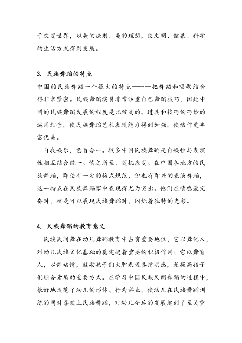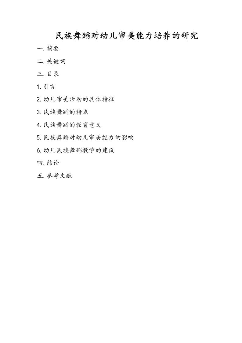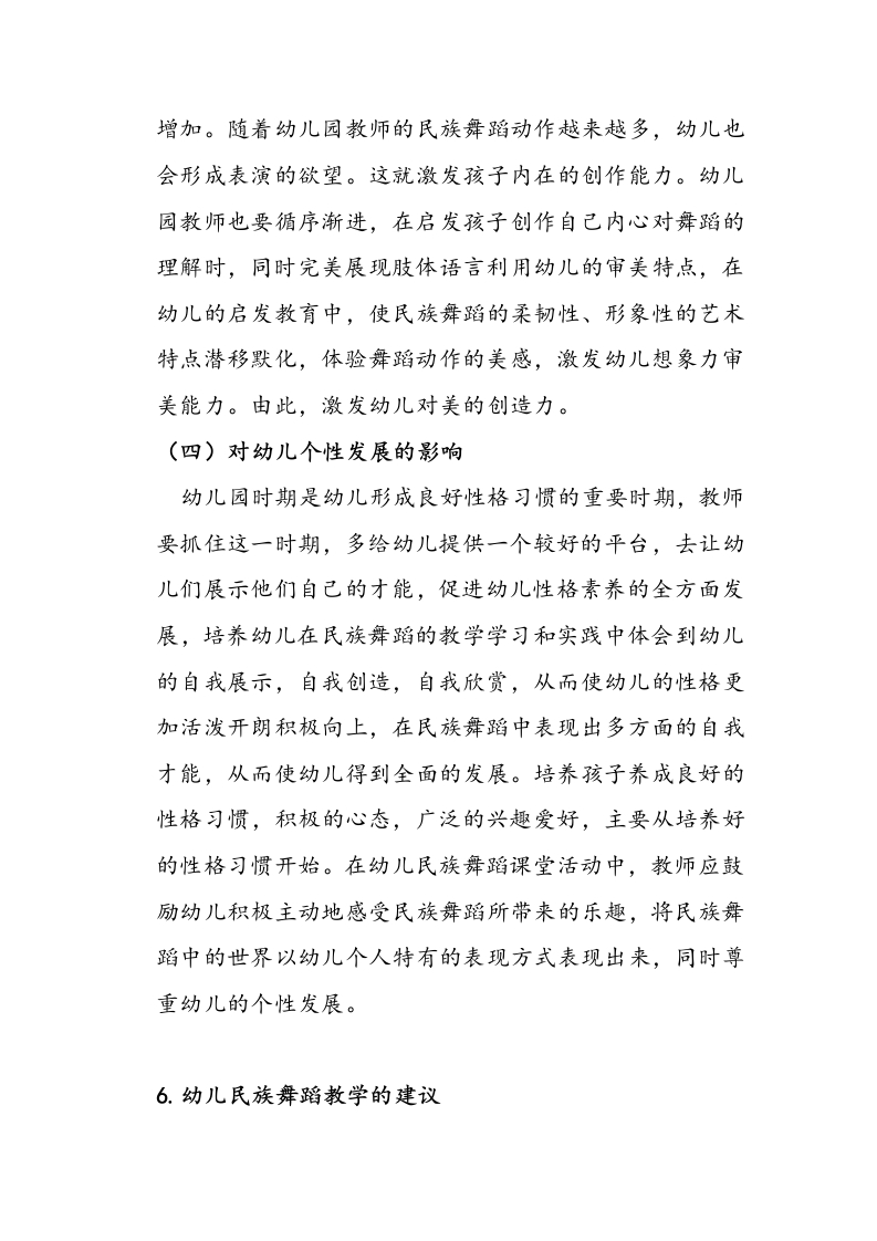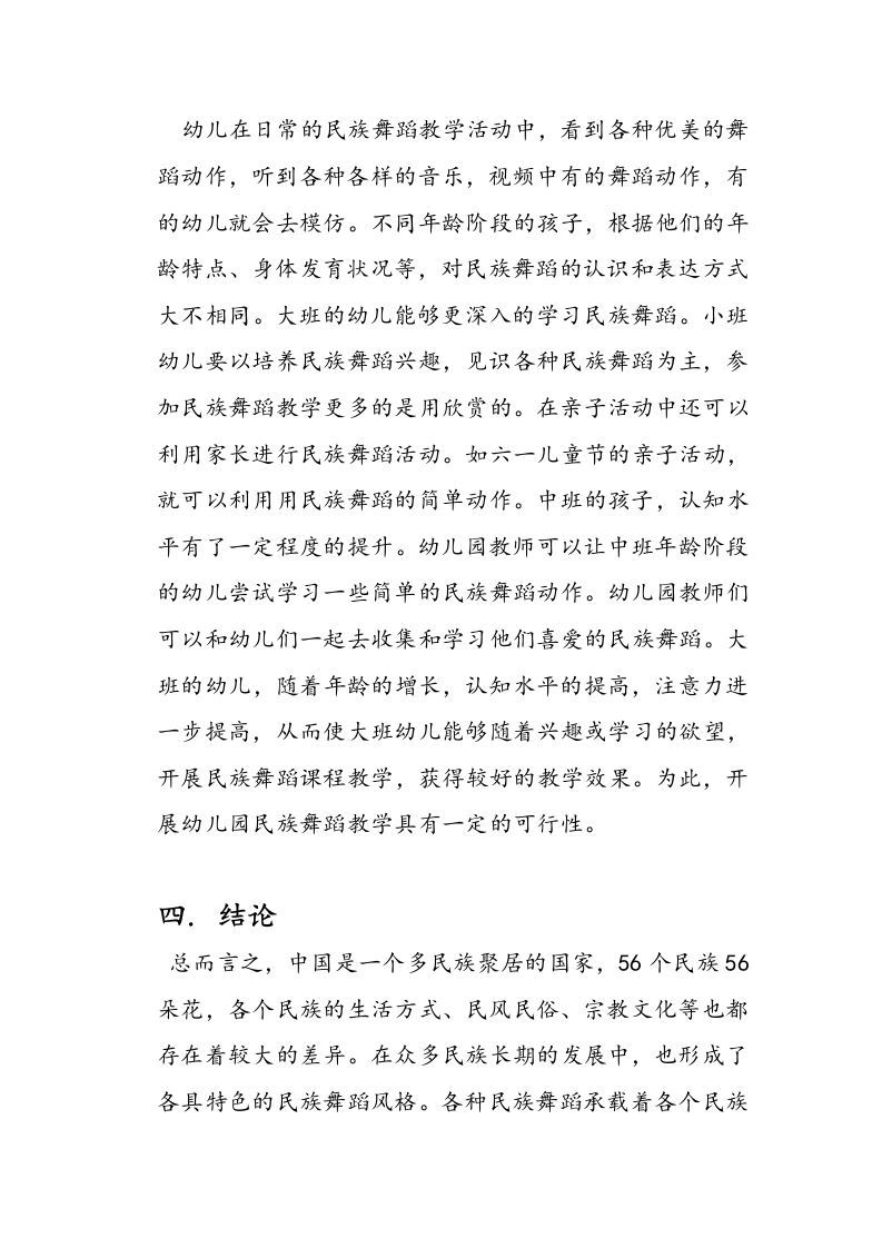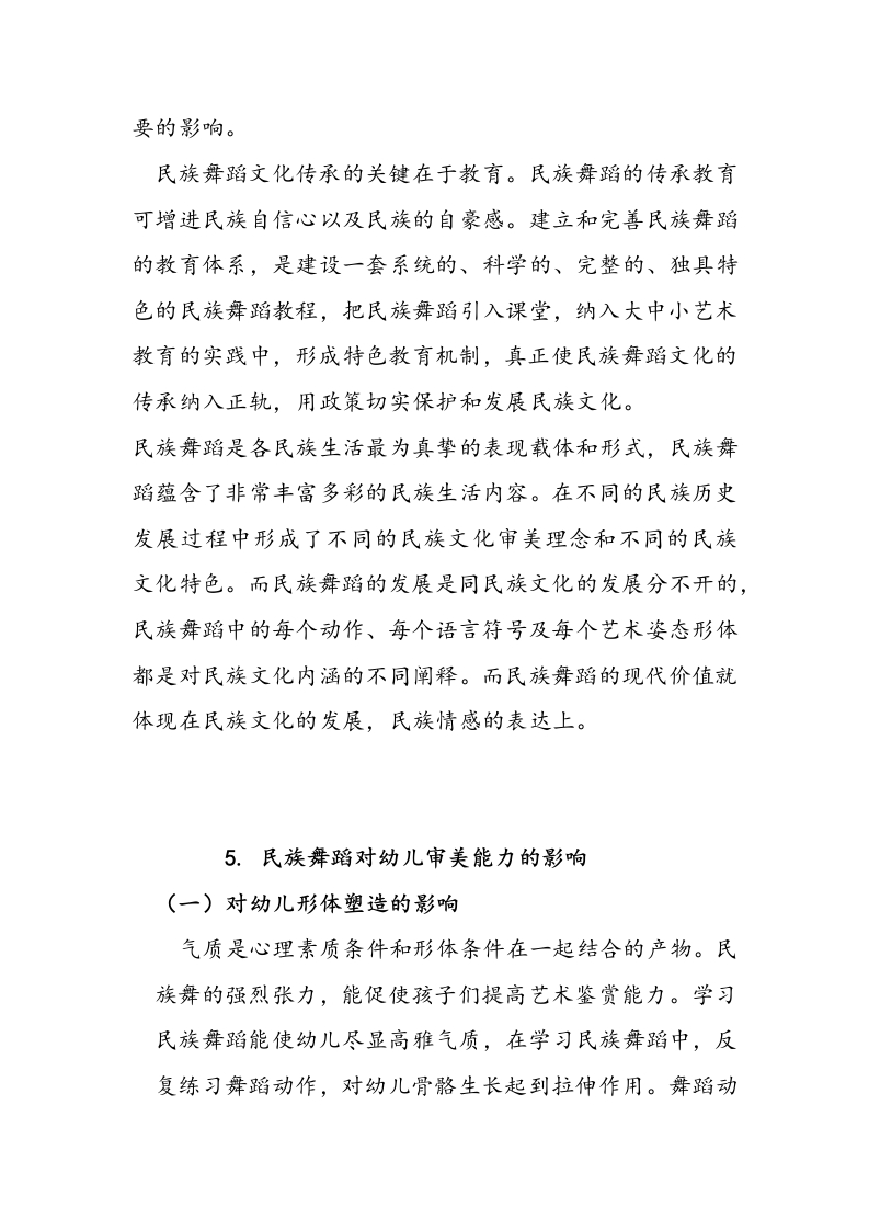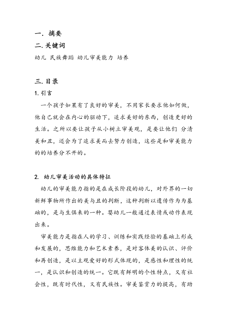 民族舞蹈对幼儿审美能力培养的研究一.摘要二.关键词三.目录1.引言2.幼儿审美活动的具体特征3.民族舞蹈的特点4.民族舞蹈的教育意义5.民族舞蹈对幼儿审美能力的影响6.幼儿民族舞蹈教学的建议四.结论五,参考文献一.摘要二.关键词幼儿民族舞蹈幼儿审美能力培养三.目录1.引言一个孩子如果有了良好的审美,不用家长要求他如何做,他自己就会在内心的驱动下,追求美好的东西,创造更好的生活。之所以要让孩子从小树立审美观,是要让他们分清美和丑,还会为了追求美而去努力创造,这些是和审美能力的的培养分不开的。2.幼儿审美活动的具体特征幼儿的审美能力指的是在成长阶段的幼儿,对外界的一切新鲜事物所作出的美与丑的判断,这种判断以遗传作为为基础的,是与生俱来的一种。婴幼儿一般通过表情或动作表现出来。审美能力是指在人的学习、训练和实践经验的基础上形成和发展的,思维能力和艺术素养,是对客体美的认识、评价和再创造,是以主观爱好的形式体现的,是感性和理性的统一,是认识和创造的统一。它既有鲜明的个性特点,又有社会性,既有时代性,又有民族性。审美鉴赏力的提高,有助于改变世界,以美的法则、美的理想,使文明、健康、科学的生活方式得到发展。3.民族舞蹈的特点中国的民族舞蹈一个很大的特点一-一把舞蹈和唱歌结合得非常紧密。民族舞蹈演员非常注重自己舞蹈技巧,因此中国的民族舞蹈发展的程度是比较高的。道具和技巧的巧妙的运用结合,使民族舞蹈艺术表现能力得到加强,使动作更丰富优美。自我娱乐,意旨合一。较多中国民族舞蹈是自娱性与表演性相互结合统一。情之所至,随机应变。在中国各地方的民族舞蹈,即使有一定的格式规范,但也有即兴的表演舞蹈,这一特点在民族舞蹈家中表现得尤为突出。他们在情感最亢奋时,就是可以展现民族舞蹈时,闪烁着独特的光彩。4.民族舞蹈的教育意义民族民间舞在幼儿舞蹈教育中占有重要地位,它以舞化人,对幼儿民族文化基础的奠定起着重要的积极作用;它以舞育人,以舞动情,鼓励孩子们大胆表现真情实感,是提高孩子们综合素质的重要方式。在学习中国民族民间舞蹈的过程中,很好地规范了幼儿的形体、行为举止,使幼儿在民族舞蹈训练的同时喜欢上民族舞蹈,对幼儿今后的发展起到了至关重要的影响。民族舞蹈文化传承的关键在于教育。民族舞蹈的传承教育可增进民族自信心以及民族的自豪感。建立和完善民族舞蹈的教育体系,是建设一套系统的、科学的、完整的、独具特色的民族舞蹈教程,把民族舞蹈引入课堂,纳入大中小艺术教育的实践中,形成特色教育机制,真正使民族舞蹈文化的传承纳入正轨,用政策切实保护和发展民族文化。民族舞蹈是各民族生活最为真挚的表现载体和形式,民族舞蹈蕴含了非常丰富多彩的民族生活内容。在不同的民族历史发展过程中形成了不同的民族文化审美理念和不同的民族文化特色。而民族舞蹈的发展是同民族文化的发展分不开的,民族舞蹈中的每个动作、每个语言符号及每个艺术姿态形体都是对民族文化内涵的不同阐释。而民族舞蹈的现代价值就体现在民族文化的发展,民族情感的表达上。5.民族舞蹈对幼儿审美能力的影响(一)对幼儿形体塑造的影响气质是心理素质条件和形体条件在一起结合的产物。民族舞的强烈张力,能促使孩子们提高艺术鉴赏能力。学习民族舞蹈能使幼儿尽显高雅气质,在学习民族舞蹈中,反复练习舞蹈动作,对幼儿骨骼生长起到拉伸作用。舞蹈动