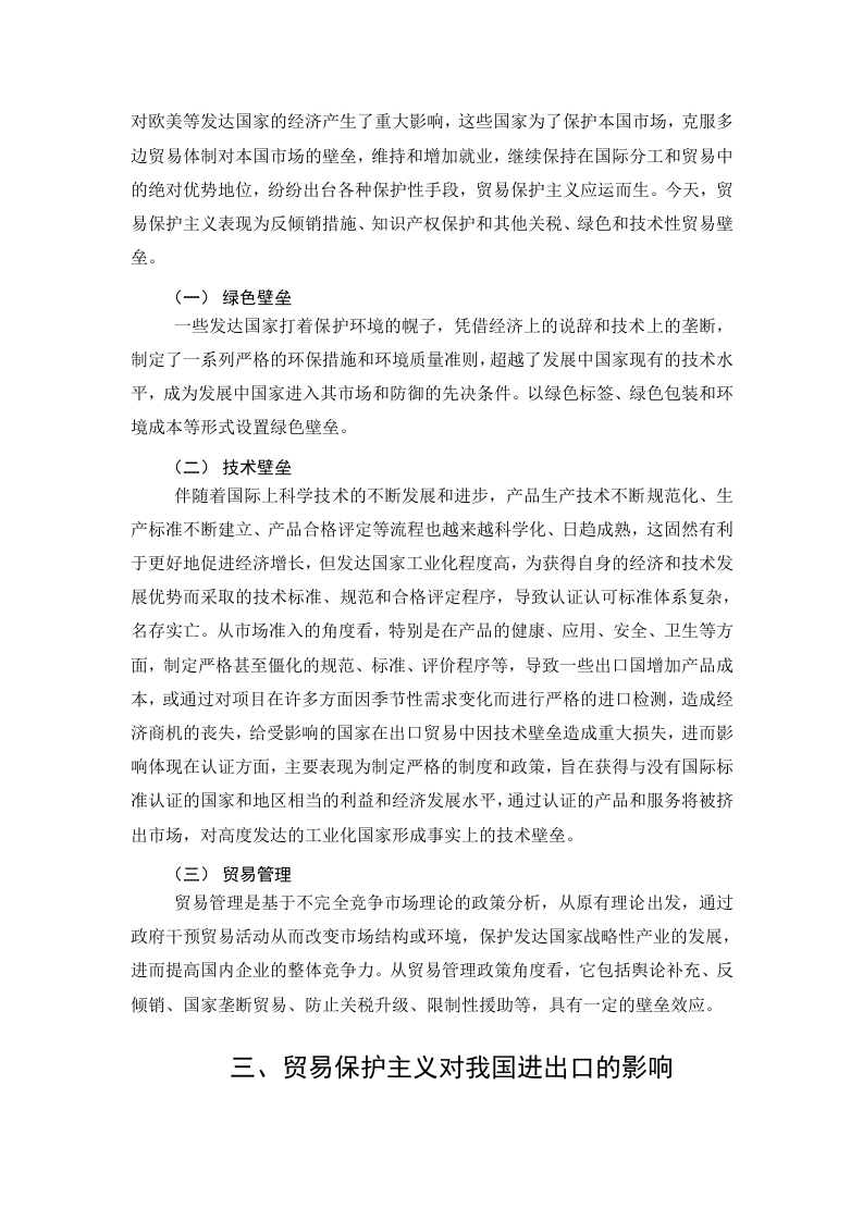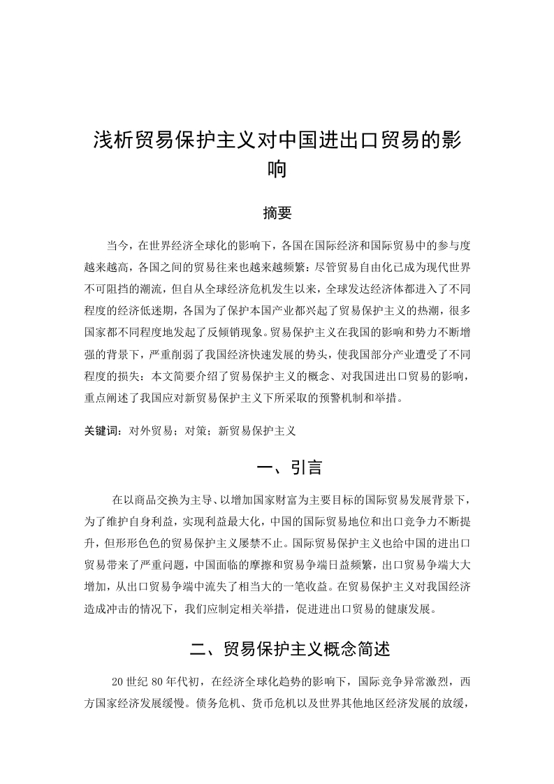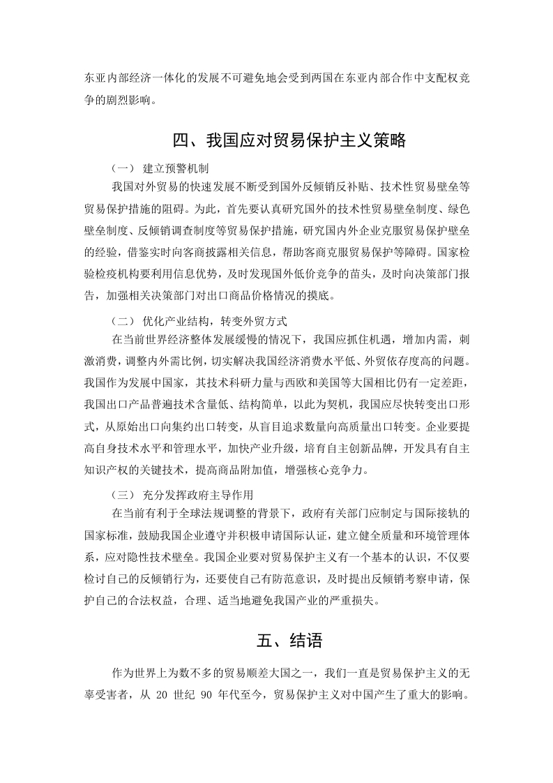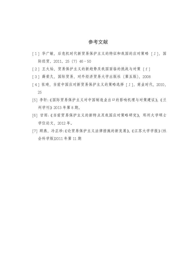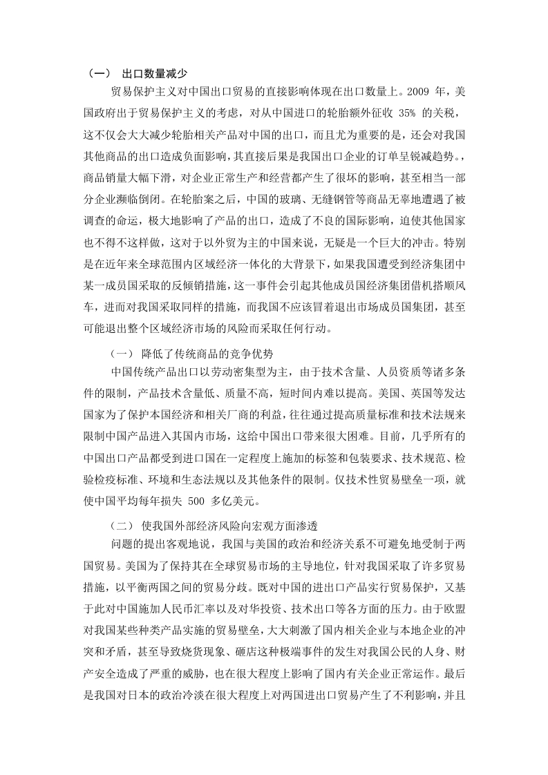 目录贸易保护主义概念简述4(一)绿色壁坐4(二)技术4壁垒4(三)7易管理.11111.5三、贸易保护主义对我国进出口的影响.5(一)出口数量减少.5(二)降低了传统商品的竞争优势.5(三)使我国外部经济风险向宏观方面渗透.6四、我国应对贸易保护主义策略6()建立预警机制.6(二)优化产业结构,转变外贸方式6(三)充分发挥政府主导作用7五、结语..7参考文献.8浅析贸易保护主义对中国进出口贸易的影响摘要当今,在世界经济全球化的影响下,各国在国际经济和国际贸易中的参与度越来越高,各国之间的贸易往来也越来越频繁:尽管贸易自由化已成为现代世界不可阻挡的潮流,但自从全球经济危机发生以来,全球发达经济体都进入了不同程度的经济低迷期,各国为了保护本国产业都兴起了贸易保护主义的热潮,很多国家都不同程度地发起了反倾销现象。贸易保护主义在我国的影响和势力不断增强的背景下,严重削弱了我国经济快速发展的势头,使我国部分产业遭受了不同程度的损失:本文简要介绍了贸易保护主义的概念、对我国进出口贸易的影响,重点阐述了我国应对新贸易保护主义下所采取的预警机制和举措。关键词:对外贸易:对策:新贸易保护主义一、引言在以商品交换为主导、以增加国家财富为主要目标的国际贸易发展背景下,为了维护自身利益,实现利益最大化,中国的国际贸易地位和出口竞争力不断提升,但形形色色的贸易保护主义屡禁不止。国际贸易保护主义也给中国的进出口贸易带来了严重问题,中国面临的摩擦和贸易争端日益频繁,出口贸易争端大大增加,从出口贸易争端中流失了相当大的一笔收益。在贸易保护主义对我国经济造成冲击的情况下,我们应制定相关举措,促进进出口贸易的健康发展。二、贸易保护主义概念简述20世纪80年代初,在经济全球化趋势的影响下,国际竞争异常激烈,西方国家经济发展缓慢。债务危机、货币危机以及世界其他地区经济发展的放缓,对欧美等发达国家的经济产生了重大影响,这些国家为了保护本国市场,克服多边贸易体制对本国市场的壁垒,维持和增加就业,继续保持在国际分工和贸易中的绝对优势地位,纷纷出台各种保护性手段,贸易保护主义应运而生。今天,贸易保护主义表现为反倾销措施、知识产权保护和其他关税、绿色和技术性贸易壁垒。(一)绿色壁垒一些发达国家打着保护环境的幌子,凭借经济上的说辞和技术上的垄断,制定了一系列严格的环保措施和环境质量准则,超越了发展中国家现有的技术水平,成为发展中国家进入其市场和防御的先决条件。以绿色标签、绿色包装和环境成本等形式设置绿色壁垒。(二)技术壁垒伴随着国际上科学技术的不断发展和进步,产品生产技术不断规范化、生产标准不断建立、产品合格评定等流程也越来越科学化、日趋成熟,这固然有利于更好地促进经济增长,但发达国家工业化程度高,为获得自身的经济和技术发展优势而采取的技术标准、规范和合格评定程序,导致认证认可标准体系复杂,名存实亡。从市场准入的角度看,特别是在产品的健康、应用、安全、卫生等方面,制定严格甚至僵化的规范、标准、评价程序等,导致一些出口国增加产品成本,或通过对项目在许多方面因季节性需求变化而进行严格的进口检测,造成经济商机的丧失,给受影响的国家在出口贸易中因技术壁垒造成重大损失,进而影响体现在认证方面,主要表现为制定严格的制度和政策,旨在获得与没有国际标准认证的国家和地区相当的利益和经济发展水平,通过认证的产品和服务将被挤出市场,对高度发达的工业化国家形成事实上的技术壁垒。(三)贸易管理贸易管理是基于不完全竞争市场理论的政策分析,从原有理论出发,通过政府干预贸易活动从而改变市场结构或环境,保护发达国家战略性产业的发展,进而提高国内企业的整体竞争力。从贸易管理政策角度看,它包括舆论补充、反倾销、国家垄断贸易、防止关税升级、限制性援助等,具有一定的壁垒效应。三、贸易保护主义对我国进出口的影响(一)出口数量减少贸易保护主义对中国出口贸易的直接影响体现在出口数量上。2009年,美国政府出于贸易保护主义的考虑,对从中国进口的轮胎额外征收35%的关税,这不仅会大大减少轮胎相关产品对中国的出口,而且尤为重要的是,还会对我国其他商品的出口造成负面影响,其直接后果是我国出口企业的订单呈锐减趋势。,商品销量大幅下滑,对企业正常生产和经营都产生了很坏的影响,甚至相当一部分企业濒临倒闭。在轮胎案之后,中国的玻璃、无缝钢管等商品无辜地遭遇了被调查的命运,极大地影响了产品的出口,造成了不良的国际影响,迫使其他国家也不得不这样做,这对于以外贸为主的中国来说,无疑是一个巨大的冲击。特别是在近年来全球范围内区域经济一体化的大背景下,如果我国遭受到经济集团中某一成员国采取的反倾销措施,这一事件会引起其他成员国经济集团借机搭顺风车,进而对我国采取同样的措施,而我国不应该冒着退出市场成员国集团,甚至可能退出整个区域经济市场的风险而采取任何行动。(一)降低了传统商品的竞争优势中国传统产品出口以劳动密集型为主,由于技术含量、人员资质等诸多条件的限制,产品技术含量低、质量不高,短时间内难以提高。美国、英国等发达国家为了保护本国经济和相关厂商的利益