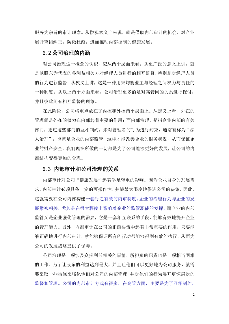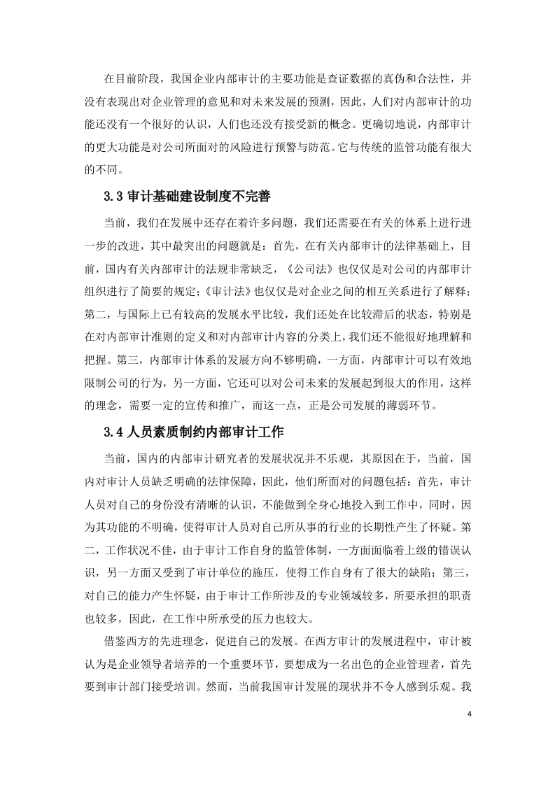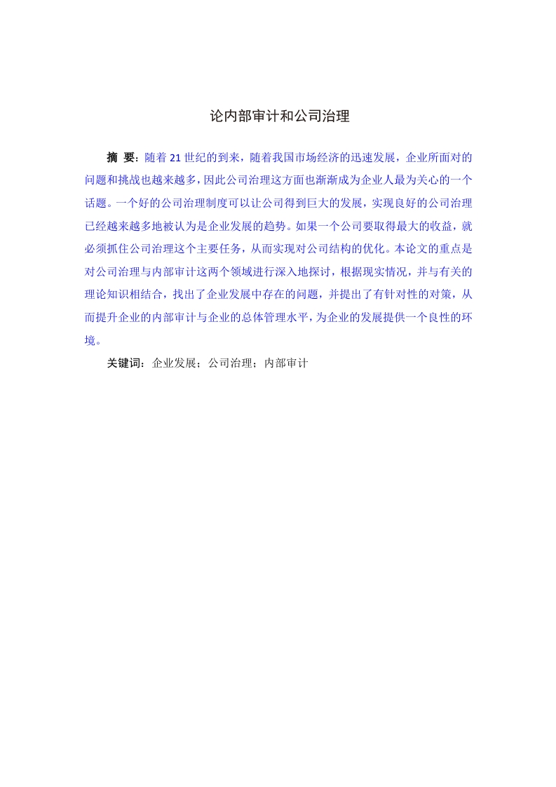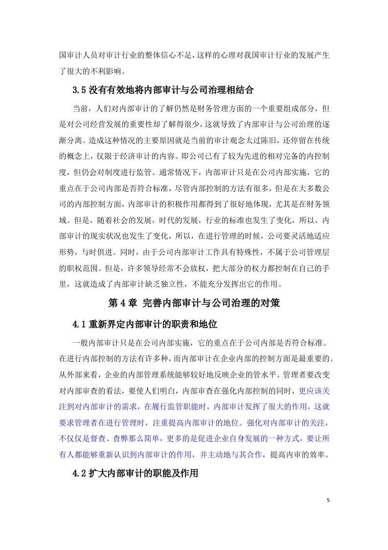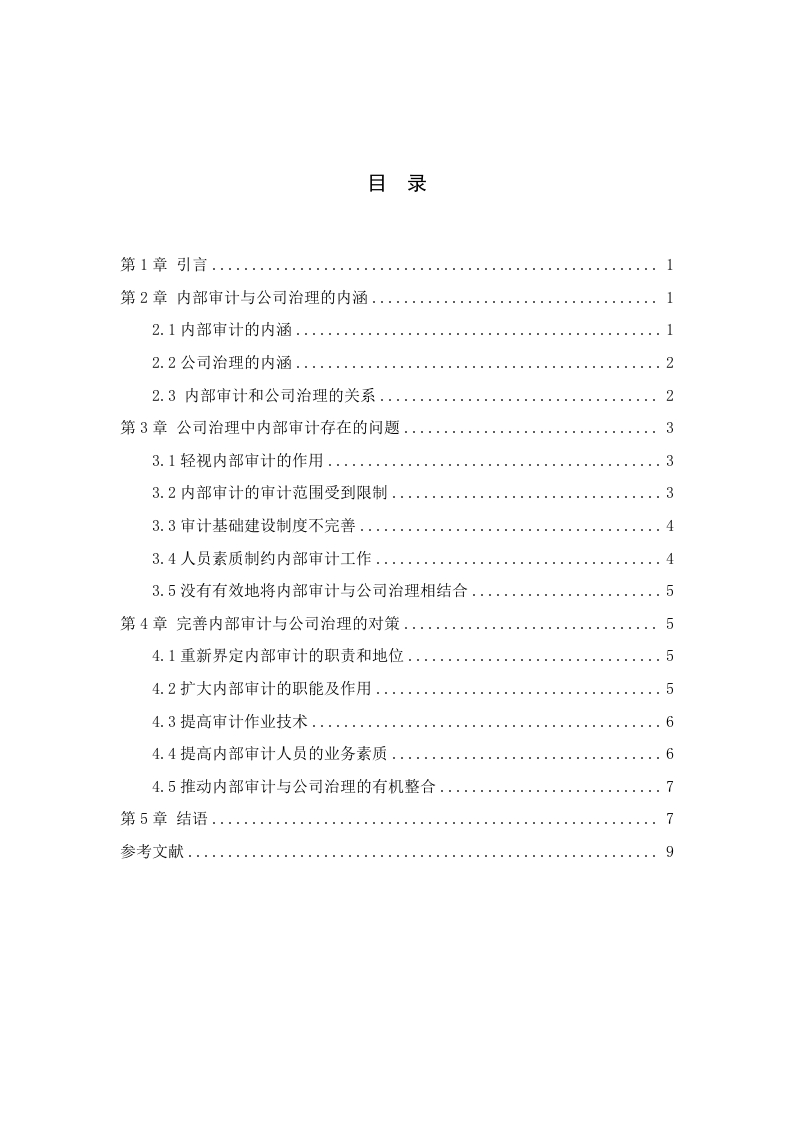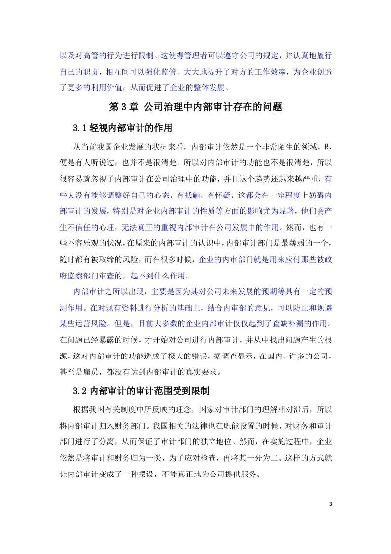 论内部审计和公司治理摘要:随着21世纪的到来,随着我国市场经济的迅速发展,企业所面对的问题和挑战也越来越多,因此公司治理这方面也渐渐成为企业人最为关心的一个话题。一个好的公司治理制度可以让公司得到巨大的发展,实现良好的公司治理已经越来越多地被认为是企业发展的趋势。如果一个公司要取得最大的收益,就必须抓住公司治理这个主要任务,从而实现对公司结构的优化。本论文的重点是对公司治理与内部审计这两个领域进行深入地探讨,根据现实情况,并与有关的理论知识相结合,找出了企业发展中存在的问题,并提出了有针对性的对策,从而提升企业的内部审计与企业的总体管理水平,为企业的发展提供一个良性的环境。关键词:企业发展:公司治理:内部审计目录第1章引言.......第2章内部审计与公司治理的内涵......12.1内部审计的内涵.....2.2公司治理的内涵........…22.3内部审计和公司治理的关系.............2第3章公司治理中内部审计存在的问题...........33.1轻视内部审计的作用.....3.2内部审计的审计范围受到限制........…33.3审计基础建设制度不完善....3.4人员素质制约内部审计工作.......3.5没有有效地将内部审计与公司治理相结合............5第4章完善内部审计与公司治理的对策.....….54.1重新界定内部审计的职责和地位..….54.2扩大内部审计的职能及作用................54.3提高审计作业技术......4.4提高内部审计人员的业务素质....…64.5推动内部审计与公司治理的有机整合........7第5章结语....·参考文献……9第1章引言随着我国市场经济的迅速发展,企业所处的外部环境日益恶劣,更多的公司开始重视公司的内部控制,并对公司的内部审计进行整合,对公司的整体治理进行重构。在这种情况下,公司治理问题日益受到学术界的关注。一个公司要想有好的发展,一个好的治理方案是非常关键的一步。好的治理方案不仅能够保证公司的良好发展,还能够保证公司的稳定,提高公司的竞争力,构建并完善有关审计方面的制度等,这对公司的资产和资金安全有着很大的影响。同时,我们也不能只注重内控与内审的功能,更要注意内控与内审的功能,更要注意内控与内审的功能,更好地发挥公司治理的功能,促进公司的结构优化。本文既是对“内部审计”“公司治理”两个概念的简要阐释,并对这两个概念的相互联系进行了初步探讨,分析了当前公司治理结构中的一些问题,并针对这些问题,给出了一些对策。第2章内部审计与公司治理的内涵2.1内部审计的内涵内部审计是对公司自身进行审核和监督的一种行为,而与之相适应的审计人员又是企业的内审主体。内审的作用是评价其他的内控行为。内部审计是通过对现有数据的科学分析,来预见和判定公司在发展中所遇到的潜在的危险和危机,并根据这些危险和危机,来制订出行之有效的对策。利用这种方式,能够对公司治理情况进行更加系统的、规范的评估,实现公司利益的最大化,使公司的发展更加的透明,减少了不必要的损失,从而提高了公司在整体行业中的竞争力。内部审计的作用不明确。它既要对要起到监督的作用,也要为企业提供服务,所以它的真实性一般都比较高,一方面担负着法律法规赋予的监督、审查的权力,另一方面又为企业的发展作出自己的贡献。这种责任,需要内审部有自己的原则性,有自己的原则,有自己的底线,并不只是按照法律和规定来做事,更重要的是,他们要当好公司的“守护人”,协助上级决策,加强对公司的监管,坚持以y服务为宗旨的审计理念。从微观意义上来说,就是借助内部审计的机会,对企业展开查错纠正,防微杜渐,进而推动内部控制的健康发展。2.2公司治理的内涵对公司治理这一概念的认识,应从两个层面来看。从更广泛的意义上讲,就是以股东为代表的各利益相关方对经理人员进行的相互监督,特别是对经理人员的行为进行监督:从狭义上讲,这是一种用来均衡业主与经理之间权力与责任的一种制度。从以上两个方面来看,公司治理更多的是对高管间的关系进行探讨,并且彼此间有相互监督的现象。在此阶段,公司将重点放在了内控和外控两个层面上。从定义上看,外在的管理就是外在的权力在内部起着主要的作用:而内部治理,是指企业内部的有关部门,通过这些部门的互相制约,来对管理者的行为进行约束,通常被称为“法人治理”,也就是企业的内部监管,这样才能改善企业的财务状况,从而保证企业的财产安全。我们现在所做的一切都是为了公司能够更好的发展,让公司的内部结构变得更加的合理。2.3内部审计和公司治理的关系内部审计对公司“健康发展”起着举足轻重的影响。因为企业自身的发展需求,内部审计必须具备一定的可操作性,并能最大限度地促进公司的决策,因此,这就需要在公司内部构建一套行之有效的内审制度。企业的治理行为与企业的发展紧密相关,尤其是在很大程度上影响着企业的监管职能的发挥,而企业的内部监管又是企业强化管理的需要,它是一套相互联系的手段,能够有效地提升企业的管理能力。另外,内部审计在公司的正确决策中起着非常重要的作用,只要能够正确地进行内部审计,就能够保证所有的行动都能够得到有效的执行,从而为公司的发展战略提供了保障。公司治理是一项涉及众多利益相关的事情,所担负的职责也是一项相当困难的工作。