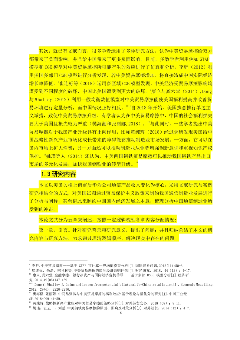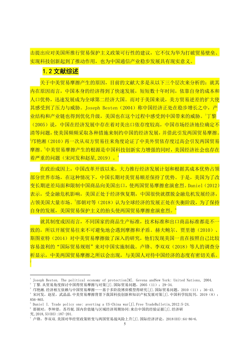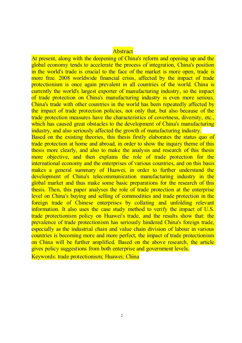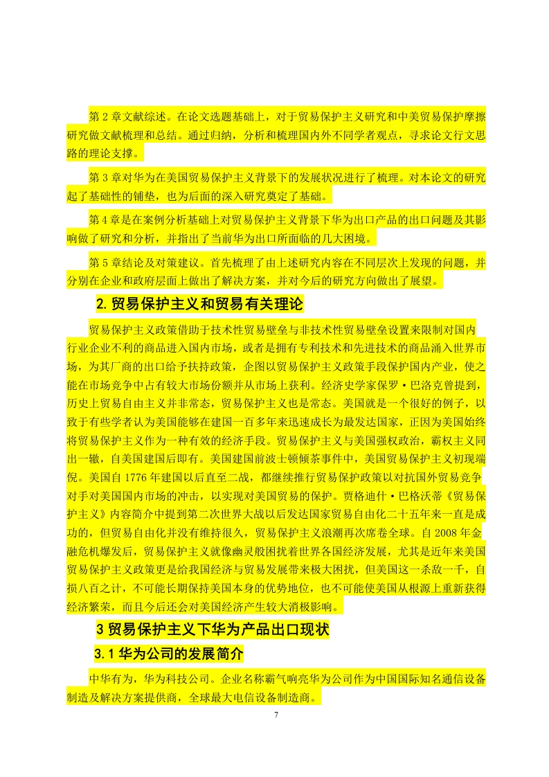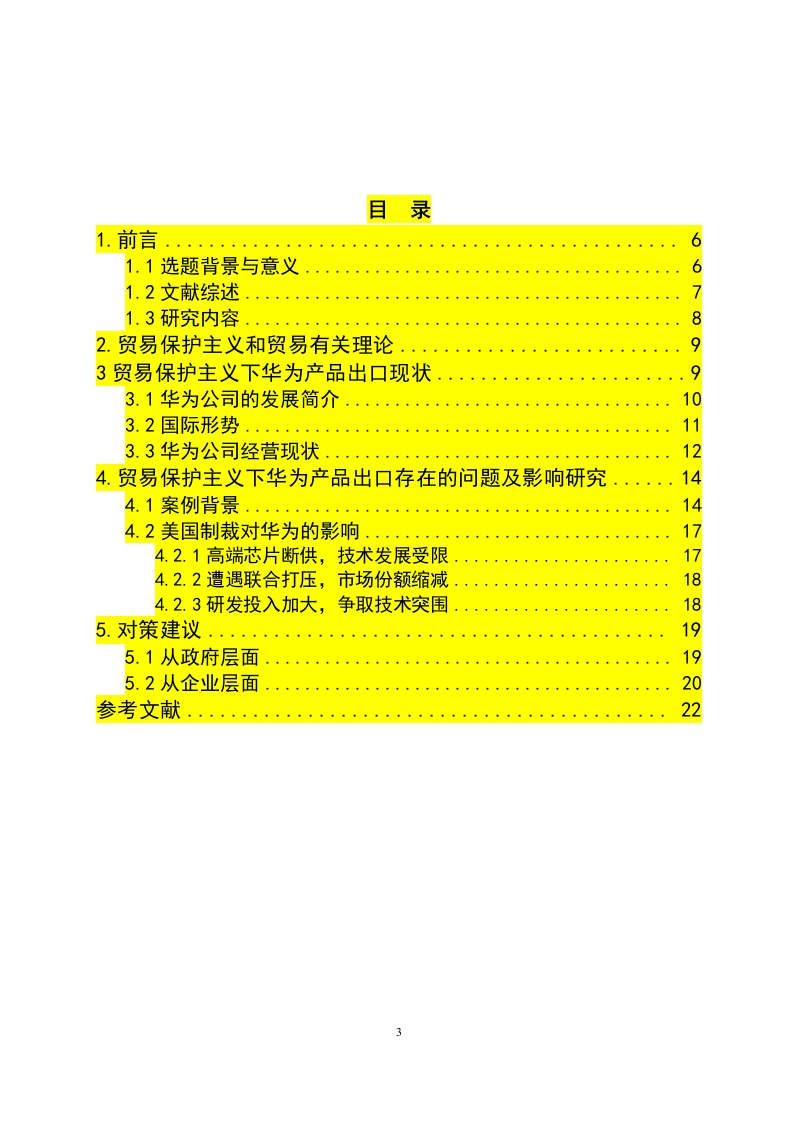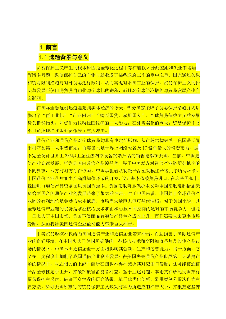 易保护主义对中国进出口企业影响研究摘要当前,伴随着我国改革开放的不断深入以及全球经济趋向一体化进程的日益加快,我国在世界各国贸易中的地位至关重要,面对市场更开放,贸易更自由。2008年世界范围内发生金融危机,受此影响贸易保护主义再次在世界各国盛行。中国目前是世界制造业第一大出口国,以贸易保护对于中国制造业的冲击就更加严重了。中国同世界各国的贸易一再受到贸易保护政策的冲击,不但如此,还因为贸易保护措施具有隐蔽性、多样性等特点,给我国制造业发展造成很大障碍,也严重地影响着制造业成长。本论文以已有理论为基础,先阐述国内外贸易保护现状,为更加清晰地展现本论文的探究主题,也使得本论文的分析和研究更加客观,然后说明贸易保护对于国际经济和各国企业所产生的作用,并在此基础上对华为公司做一个概括性的总结,以进一步认识中国通信制造业在全球市场上的发展状况,从而为本论文的研究做一些基础准备工作。然后,本文通过对相关资料进行整理和展开,分析贸易保护在企业层面上对中国为商品买卖和贸易保护在中国企业对外贸易中的作用。并运用案例分析法验证美国贸易保护主义政策对华为公司贸易的影响,结果表明:贸易保护主义盛行已经严重阻碍中国对外贸易,特别是各国产业链与价值链分工日益完善,贸易保护主义给我国带来的冲击将进一步放大。基于上述研究,文章从企业和政府两个层面给出了政策建议。关键词:贸易保护主义;华为:中国1AbstractAt present,along with the deepening of China's reform and opening up and theglobal economy tends to accelerate the process of integration,China's positionin the world's trade is crucial to the face of the market is more open,trade ismore free.2008 worldwide financial crisis,affected by the impact of tradeprotectionism is once again prevalent in all countries of the world.China iscurrently the world's largest exporter of manufacturing industry,so the impactof trade protection on China's manufacturing industry is even more serious.China's trade with other countries in the world has been repeatedly affected bythe impact of trade protection policies,not only that,but also because of thetrade protection measures have the characteristics of covertness,diversity,etc.,which has caused great obstacles to the development of China's manufacturingindustry,and also seriously affected the growth of manufacturing industry.Based on the existing theories,this thesis firstly elaborates the status quo oftrade protection at home and abroad,in order to show the inquiry theme of thisthesis more clearly,and also to make the analysis and research of this thesismore objective,and then explains the role of trade protection for theinternational economy and the enterprises of various countries,and on this basismakes a general summary of Huawei,in order to further understand thedevelopment of China's telecommunication manufacturing industry in theglobal market and thus make some basic preparations for the research of thisthesis.Then,this paper analyses the role of trade protection at the enterpriselevel on China's buying and selling of commodities and trade protection in theforeign trade of Chinese enterprises by collating and unfolding relevantinformation.It also uses the case study method to verify the impact of U.S.trade protectionism policy on Huawei's trade,and the results show that:theprevalence of trade protectionism has seriously hindered China's foreign trade,especially as the industrial chain and value chain division of labour in variouscountries is becoming more and more perfect,the impact of trade protectionismon China will be further amplified.Based on the above research,the articlegives policy suggestions from both enterprise and government levels.Keywords:trade protectionism;Huawei;China2目录1.前言....1.1选题背景与意义1.2文献综述71.3研究内容....82.贸易保护主义和贸易有关理论93贸易保护主义下华为产品出口现状93.1华为公司的发展简介