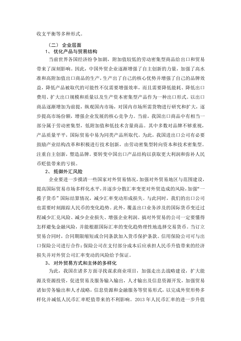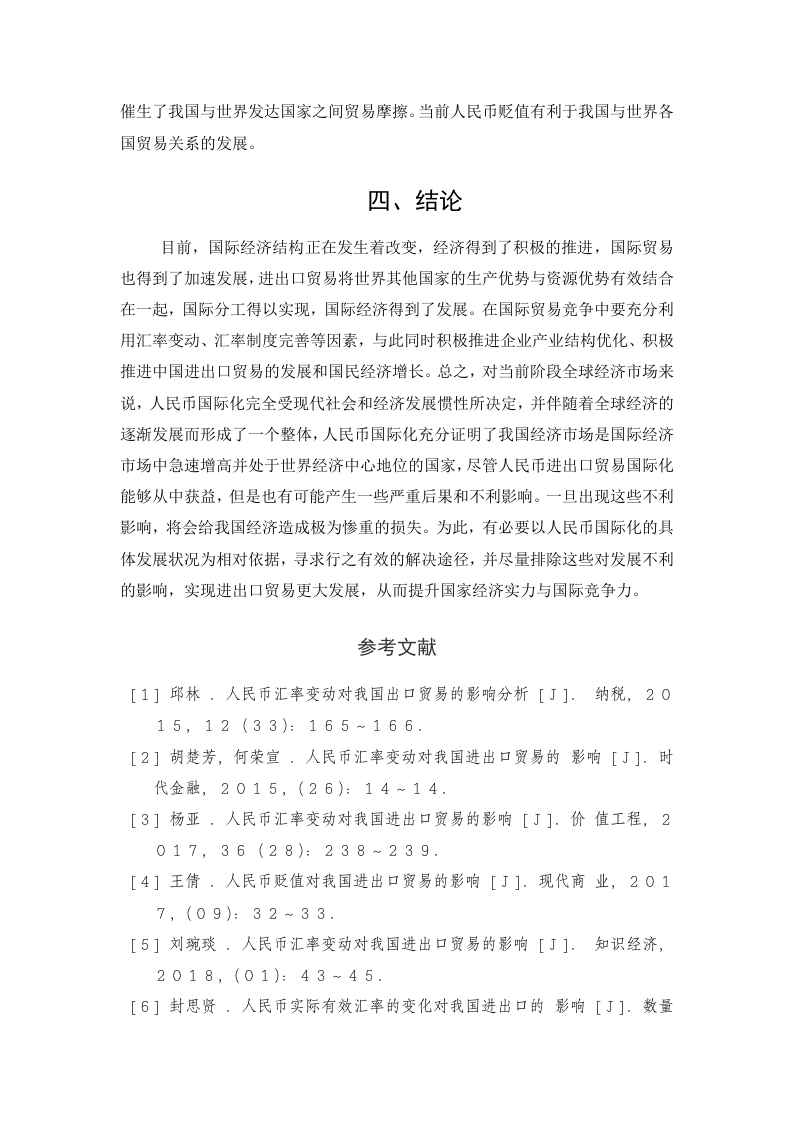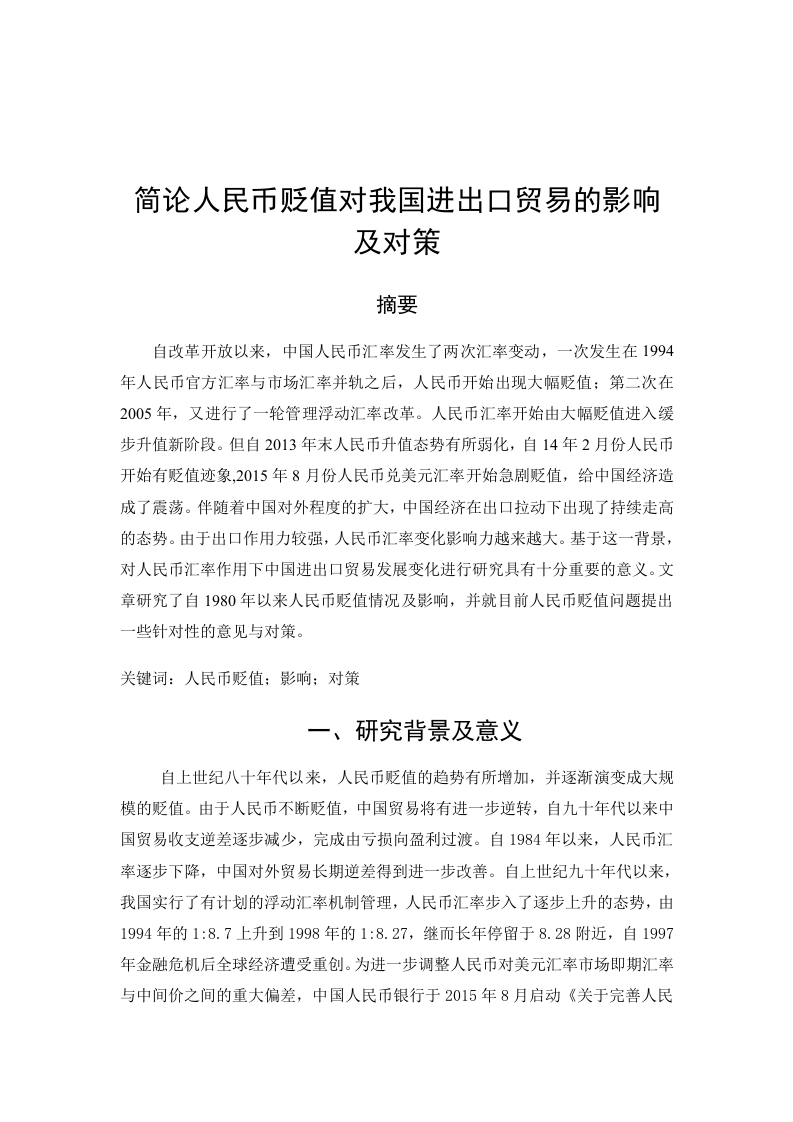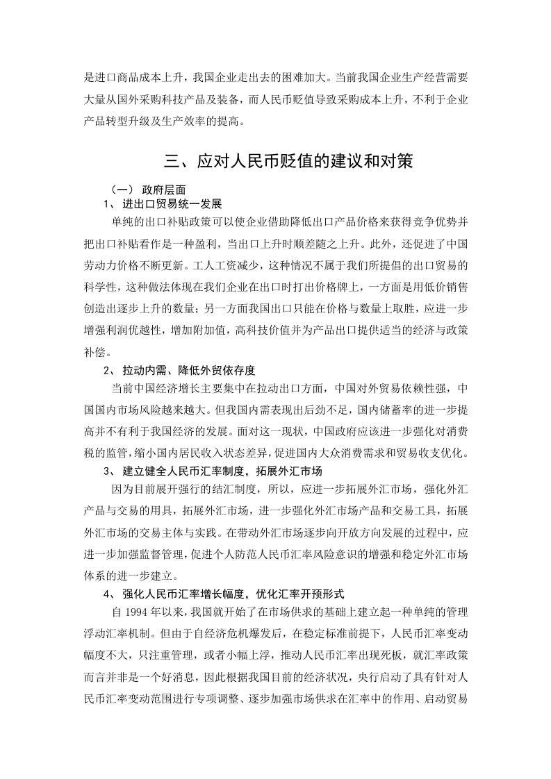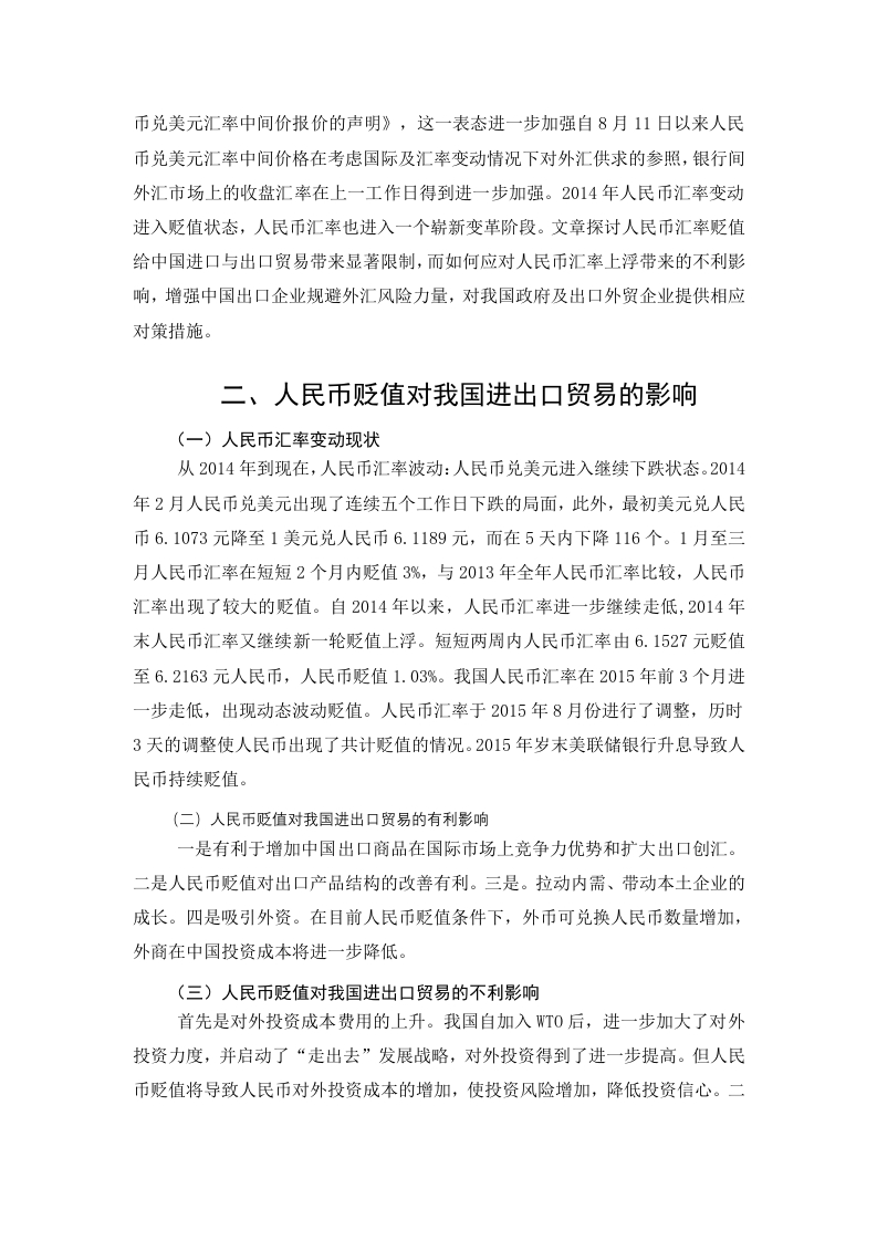 目录研究背景及意义.3人民币贬值对我国进出口贸易的影响4(一)人民币汇率变动现状4(二)人民币贬值对我国进出口贸易的有利影响4(三)人民币贬值对我国进出口贸易的不利影响4三、应对人民币贬值的建议和对策5(一)攻府层面51、进出口贸易统一发展.52、拉动内需、降低外贸依存度.53、建立健全人民币汇率制度,拓展外汇市场.54、强化人民币汇率增长幅度,优化汇率开预形式.5(二)企业层面51、优化产品与贸易结构.53抵御外汇风险.63、对外贸易方式和主体的多样化6四、结论6参考文献7简论人民币贬值对我国进出口贸易的影响及对策摘要自改革开放以来,中国人民币汇率发生了两次汇率变动,一次发生在1994年人民币官方汇率与市场汇率并轨之后,人民币开始出现大幅贬值:第二次在2005年,又进行了一轮管理浮动汇率改革。人民币汇率开始由大幅贬值进入缓步升值新阶段。但自2013年末人民币升值态势有所弱化,自14年2月份人民币开始有贬值迹象,2015年8月份人民币兑美元汇率开始急剧贬值,给中国经济造成了震荡。伴随着中国对外程度的扩大,中国经济在出口拉动下出现了持续走高的态势。由于出口作用力较强,人民币汇率变化影响力越来越大。基于这一背景,对人民币汇率作用下中国进出口贸易发展变化进行研究具有十分重要的意义。文章研究了自1980年以来人民币贬值情况及影响,并就目前人民币贬值问题提出一些针对性的意见与对策。关键词:人民币贬值;影响;对策一、研究背景及意义自上世纪八十年代以来,人民币贬值的趋势有所增加,并逐渐演变成大规模的贬值。由于人民币不断贬值,中国贸易将有进一步逆转,自九十年代以来中国贸易收支逆差逐步减少,完成由亏损向盈利过渡。自1984年以来,人民币汇率逐步下降,中国对外贸易长期逆差得到进一步改善。自上世纪九十年代以来,我国实行了有计划的浮动汇率机制管理,人民币汇率步入了逐步上升的态势,由1994年的1:8.7上升到1998年的1:8.27,继而长年停留于8.28附近,自1997年金融危机后全球经济遭受重创。为进一步调整人民币对美元汇率市场即期汇率与中间价之间的重大偏差,中国人民币银行于2015年8月启动《关于完善人民币兑美元汇率中间价报价的声明》,这一表态进一步加强自8月11日以来人民币兑美元汇率中间价格在考虑国际及汇率变动情况下对外汇供求的参照,银行间外汇市场上的收盘汇率在上一工作日得到进一步加强。2014年人民币汇率变动进入贬值状态,人民币汇率也进入一个崭新变革阶段。文章探讨人民币汇率贬值给中国进口与出口贸易带来显著限制,而如何应对人民币汇率上浮带来的不利影响,增强中国出口企业规避外汇风险力量,对我国政府及出口外贸企业提供相应对策措施。二、人民币贬值对我国进出口贸易的影响(一)人民币汇率变动现状从2014年到现在,人民币汇率波动:人民币兑美元进入继续下跌状态。2014年2月人民币兑美元出现了连续五个工作日下跌的局面,此外,最初美元兑人民币6.1073元降至1美元兑人民币6.1189元,而在5天内下降116个。1月至三月人民币汇率在短短2个月内贬值3%,与2013年全年人民币汇率比较,人民币汇率出现了较大的贬值。自2014年以来,人民币汇率进一步继续走低,2014年末人民币汇率又继续新一轮贬值上浮。短短两周内人民币汇率由6.1527元贬值至6.2163元人民币,人民币贬值1.03%。我国人民币汇率在2015年前3个月进一步走低,出现动态波动贬值。人民币汇率于2015年8月份进行了调整,历时3天的调整使人民币出现了共计贬值的情况。2015年岁末美联储银行升息导致人民币持续贬值。(二)人民币贬值对我国进出口贸易的有利影响一是有利于增加中国出口商品在国际市场上竞争力优势和扩大出口创汇。二是人民币贬值对出口产品结构的改善有利。三是。拉动内需、带动本土企业的成长。四是吸引外资。在目前人民币贬值条件下,外币可兑换人民币数量增加,外商在中国投资成本将进一步降低。(三)人民币贬值对我国进出口贸易的不利影响首先是对外投资成本费用的上升。我国自加入WT0后,进一步加大了对外投资力度,并启动了“走出去”发展战略,对外投资得到了进一步提高。但人民币贬值将导致人民币对外投资成本的增加,使投资风险增加,降低投资信心。二是进口商品成本上升,我国企业走出去的困难加大。当前我国企业生产经营需要大量从国外采购科技产品及装备,而人民币贬值导致采购成本上升,不利于企业产品转型升级及生产效率的提高。三、应对人民币贬值的建议和对策(一)政府层面1、进出口贸易统一发展单纯的出口补贴政策可以使企业借助降低出口产品价格来获得竞争优势并把出口补贴看作是一种盈利,当出口上升时顺差随之上升。此外,还促进了中国劳动力价格不断更新。工人工资减少,这种情况不属于我们所提倡的出口贸易的科学性,这种做法体现在我们企业在出口时打出价格牌上,一方面是用低价销售创造出逐步上升的数量:另一方面我国出口只能在价格与数量上取胜,应进一步增强利润优越性,增加附加值,高科技价值并为产品出口提供适当的经济与政策补偿。2、拉动内需、降低外贸依存度当前中国经济增长主要集中在拉动出口方面,中国对外贸易依赖性强,中国国内市场风险越来越大。但我国内需表现出后劲不足,国内储蓄率的进一步提高并不