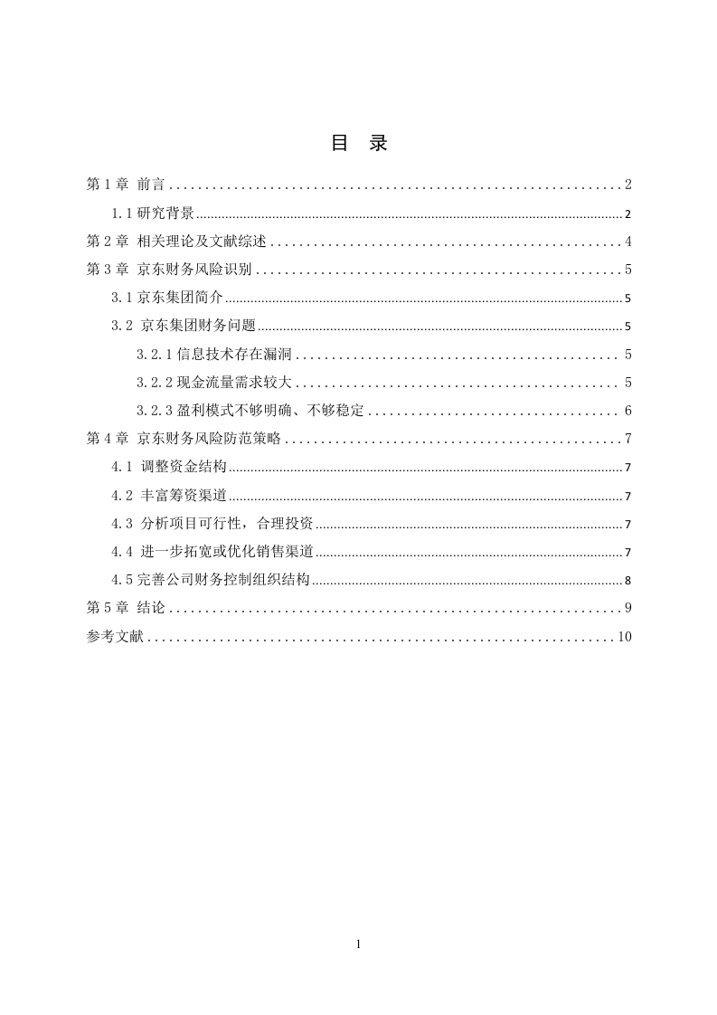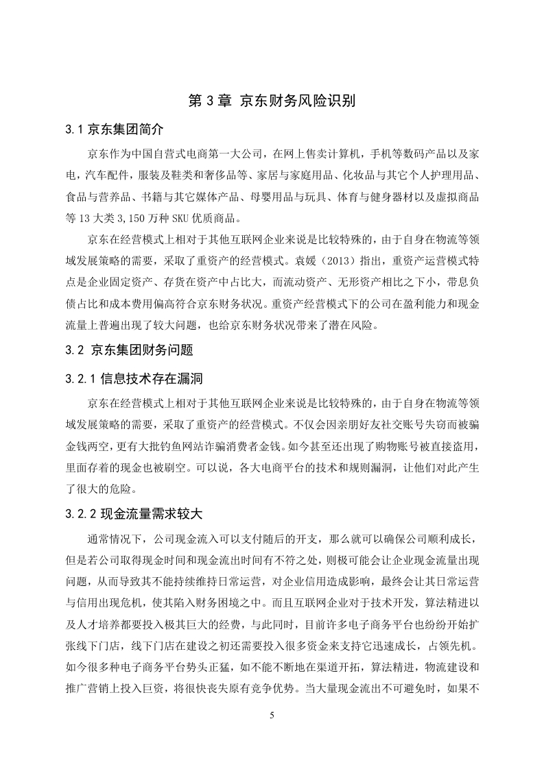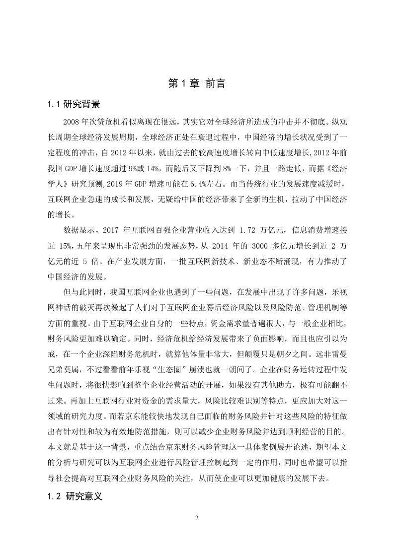 题目:京东集团财务风险管理研究摘要如今我国的经济已经从高速发展阶段步入稳步调整的阶段。而在此期间中小民营企业扮演着重要角色,它为经济发展提供动力和有力支持,使得我国经济持续稳定增长。但应该注意到,随着中国资本市场的发展,上市公司财务风险问题日益严重,公司应该怎样站在自己业务管理的立场上,以不断加强对财务风险的控制,促进其财务制度不断完善已成为上市公司必须持续考虑的一个问题。京东作为一家赴美上市公司,其本身也取得了各个方面的进步,文章对企业财务风险防范机制的构建途径进行了深入探讨,能在理论上丰富国内财务风险建设研究成果。关键词:财务风险:风险管理:电商企业:京东集团目录第1章前言.....1.1研究背景.02第2章相关理论及文献综述..第3章京东财务风险识别......3.1京东集团简介….53.2京东集团财务问题….53.2.1信息技术存在漏洞3.2.2现金流量需求较大53.2.3盈利模式不够明确、不够稳定6第4章京东财务风险防范策略......……74.1调整资金结构。.74.2丰富筹资渠道.74.3分析项目可行性,合理投资.74.4进一步拓宽或优化销售渠道.74.5完善公司财务控制组织结构第5章结论..........参考文献........…….10第1章前言1.1研究背景2008年次贷危机看似离现在很远,其实它对全球经济所造成的冲击并不彻底。纵观长周期全球经济发展周期,全球经济正处在衰退过程中,中国经济的增长状况受到了一定程度的冲击,自2012年以来,就由过去的较高速度增长转向中低速度增长,2012年前我国GDP增长速度超过9%或14%,而随后又下降到8%一下,并且一路走低,而据《经济学人》研究预测,2019年GDP增速可能在6.4%左右。而当传统行业的发展速度减缓时,互联网企业急速的成长和发展,无疑给中国的经济带来了全新的生机,拉动了中国经济的增长。数据显示,2017年互联网百强企业营业收入达到1.72万亿元,信息消费增速接近15%,五年来呈现出非常强劲的发展态势,从2014年的3000多亿元增长到近2万亿元的近5倍。在产业发展方面,一批互联网新技术、新业态不断涌现,有力推动了中国经济的发展。但与此同时,我国互联网企业也遇到了一些问题,在发展中出现了许多问题,乐视网神话的破灭再次激起了人们对于互联网企业幕后经济风险以及风险防范、管理机制等方面的重视。由于互联网企业自身的一些特点,资金需求量普遍很大,与一般企业相比,财务风险更加难以确定。同时,经济危机给经济发展带来了负面影响,而且也应引以为戒,在一个企业深陷财务危机时,就算他体量非常大,但颠覆只是朝夕之间。远非雷曼兄弟莫属,不过看看前年乐视“生态圈”崩溃也就一朝间了。企业在财务运转过程中发生问题时,将很快影响到整个企业经营活动的开展,如果没有其他助力,极有可能翻不过来。再加上互联网行业对资金的需求量大,风险比较难识别等特点,更应加大对这一领域的研究力度。而若京东能较快地发现自己面临的财务风险并针对这些风险的特征做出有针对性和较为有效地防范措施,则可以减少企业财务风险并达到顺利经营的目的。本文就是基于这一背景,重点结合京东财务风险管理这一具体案例展开论述,期望本文的分析与研究可以为互联网企业进行风险管理控制起到一定的作用,同时也希望可以指导社会提高对互联网企业财务风险的关注,从而使企业可以更加健康的发展下去。1.2研究意义2本论文选取京东集团(后文简称京东)为案例分析对象,开展了后续定性与定量研究工作,京东长远发展计划及其核心竞争力始终谋划得较为明确,在同类型电商平台中凭借其便捷快速的物流以及更好的购物体验为优势,近年来不断注重自身物流体系的开发与完善,也开拓金融业务。但直到今天,京东虽仍能赢得投资者的信赖,拿到钱,但经营状况一直亏损,对金融,物流以及线下门店投资不断加大,同时费用又比同行业竞争对手要高,这种情况下京东财务风险很大,若不加以注意,很容易造成巨大的损失。