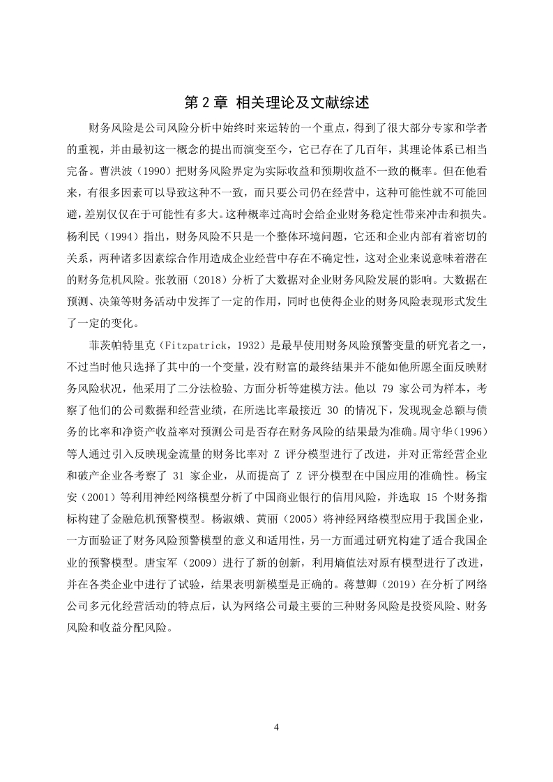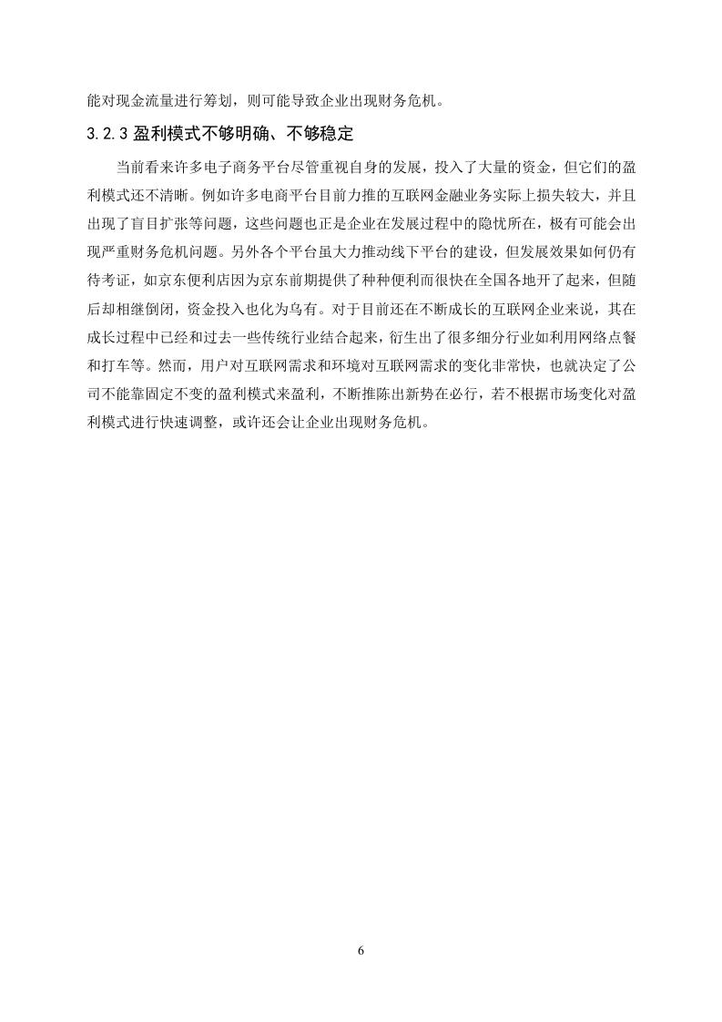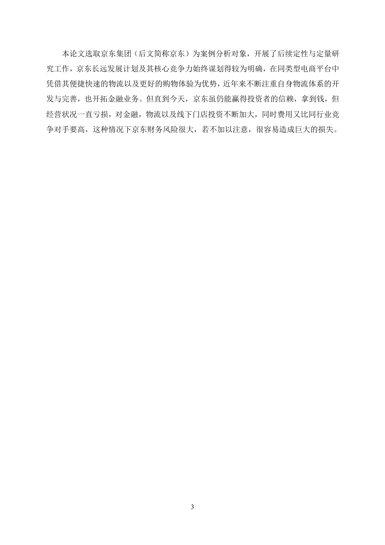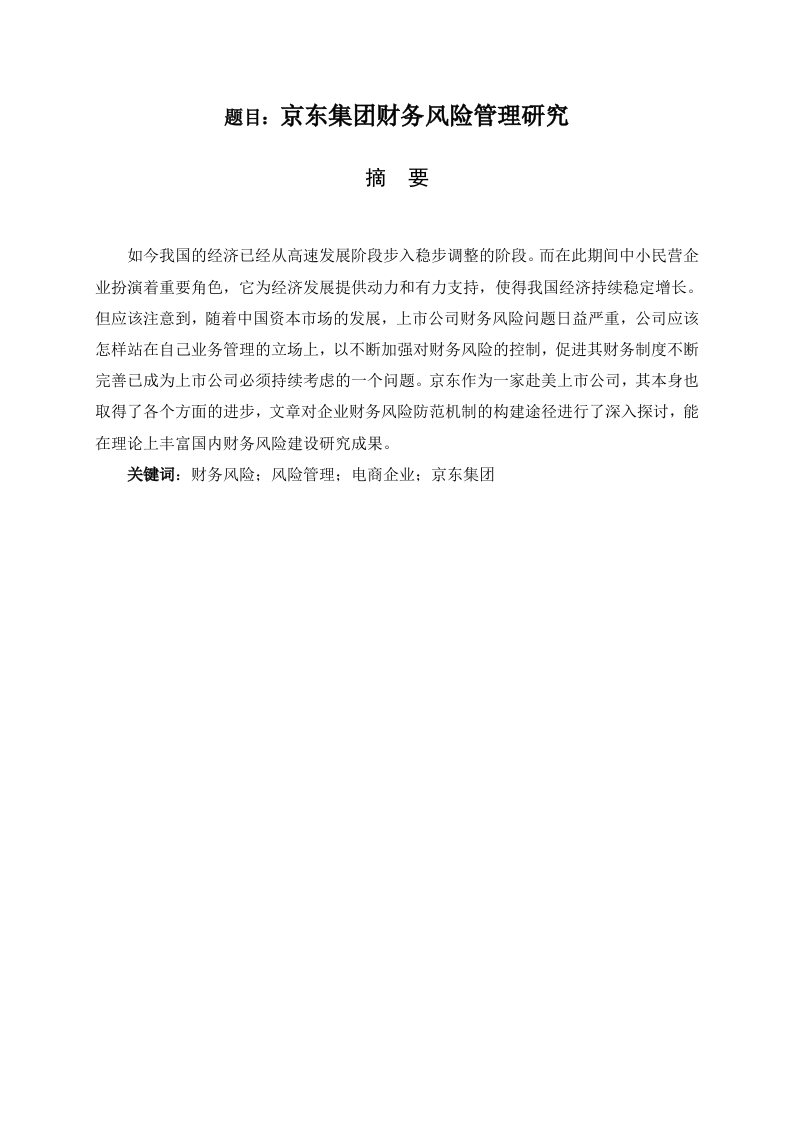 题目:京东集团财务风险管理研究摘要如今我国的经济已经从高速发展阶段步入稳步调整的阶段。而在此期间中小民营企业扮演着重要角色,它为经济发展提供动力和有力支持,使得我国经济持续稳定增长。但应该注意到,随着中国资本市场的发展,上市公司财务风险问题日益严重,公司应该怎样站在自己业务管理的立场上,以不断加强对财务风险的控制,促进其财务制度不断完善已成为上市公司必须持续考虑的一个问题。京东作为一家赴美上市公司,其本身也取得了各个方面的进步,文章对企业财务风险防范机制的构建途径进行了深入探讨,能在理论上丰富国内财务风险建设研究成果。关键词:财务风险:风险管理:电商企业:京东集团目录第1章前言.....1.1研究背景.02第2章相关理论及文献综述..第3章京东财务风险识别......3.1京东集团简介….53.2京东集团财务问题….53.2.1信息技术存在漏洞3.2.2现金流量需求较大53.2.3盈利模式不够明确、不够稳定6第4章京东财务风险防范策略......……74.1调整资金结构。.74.2丰富筹资渠道.74.3分析项目可行性,合理投资.74.4进一步拓宽或优化销售渠道.74.5完善公司财务控制组织结构第5章结论..........参考文献........…….10第1章前言1.1研究背景2008年次贷危机看似离现在很远,其实它对全球经济所造成的冲击并不彻底。纵观长周期全球经济发展周期,全球经济正处在衰退过程中,中国经济的增长状况受到了一定程度的冲击,自2012年以来,就由过去的较高速度增长转向中低速度增长,2012年前我国GDP增长速度超过9%或14%,而随后又下降到8%一下,并且一路走低,而据《经济学人》研究预测,2019年GDP增速可能在6.4%左右。而当传统行业的发展速度减缓时,互联网企业急速的成长和发展,无疑给中国的经济带来了全新的生机,拉动了中国经济的增长。数据显示,2017年互联网百强企业营业收入达到1.72万亿元,信息消费增速接近15%,五年来呈现出非常强劲的发展态势,从2014年的3000多亿元增长到近2万亿元的近5倍。在产业发展方面,一批互联网新技术、新业态不断涌现,有力推动了中国经济的发展。但与此同时,我国互联网企业也遇到了一些问题,在发展中出现了许多问题,乐视网神话的破灭再次激起了人们对于互联网企业幕后经济风险以及风险防范、管理机制等方面的重视。由于互联网企业自身的一些特点,资金需求量普遍很大,与一般企业相比,财务风险更加难以确定。同时,经济危机给经济发展带来了负面影响,而且也应引以为戒,在一个企业深陷财务危机时,就算他体量非常大,但颠覆只是朝夕之间。远非雷曼兄弟莫属,不过看看前年乐视“生态圈”崩溃也就一朝间了。企业在财务运转过程中发生问题时,将很快影响到整个企业经营活动的开展,如果没有其他助力,极有可能翻不过来。再加上互联网行业对资金的需求量大,风险比较难识别等特点,更应加大对这一领域的研究力度。而若京东能较快地发现自己面临的财务风险并针对这些风险的特征做出有针对性和较为有效地防范措施,则可以减少企业财务风险并达到顺利经营的目的。本文就是基于这一背景,重点结合京东财务风险管理这一具体案例展开论述,期望本文的分析与研究可以为互联网企业进行风险管理控制起到一定的作用,同时也希望可以指导社会提高对互联网企业财务风险的关注,从而使企业可以更加健康的发展下去。1.2研究意义2本论文选取京东集团(后文简称京东)为案例分析对象,开展了后续定性与定量研究工作,京东长远发展计划及其核心竞争力始终谋划得较为明确,在同类型电商平台中凭借其便捷快速的物流以及更好的购物体验为优势,近年来不断注重自身物流体系的开发与完善,也开拓金融业务。但直到今天,京东虽仍能赢得投资者的信赖,拿到钱,但经营状况一直亏损,对金融,物流以及线下门店投资不断加大,同时费用又比同行业竞争对手要高,这种情况下京东财务风险很大,若不加以注意,很容易造成巨大的损失。