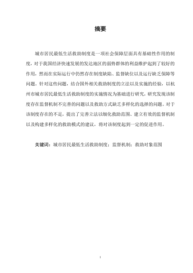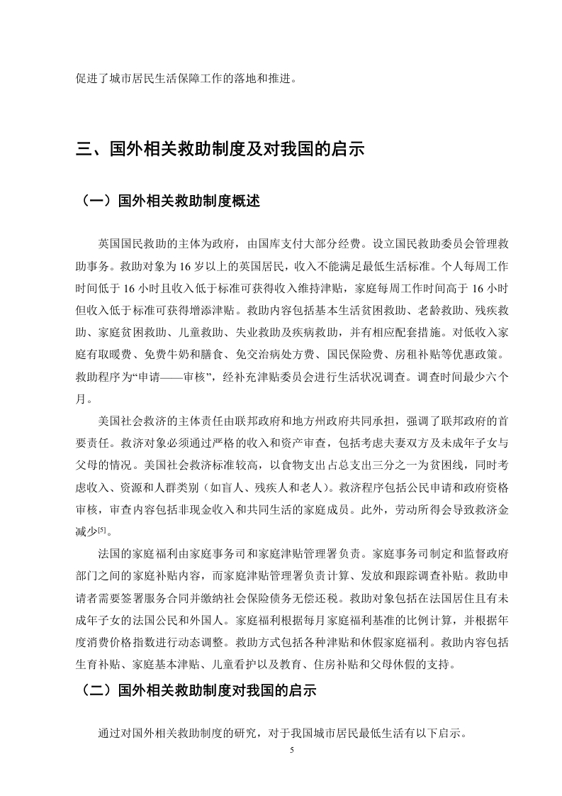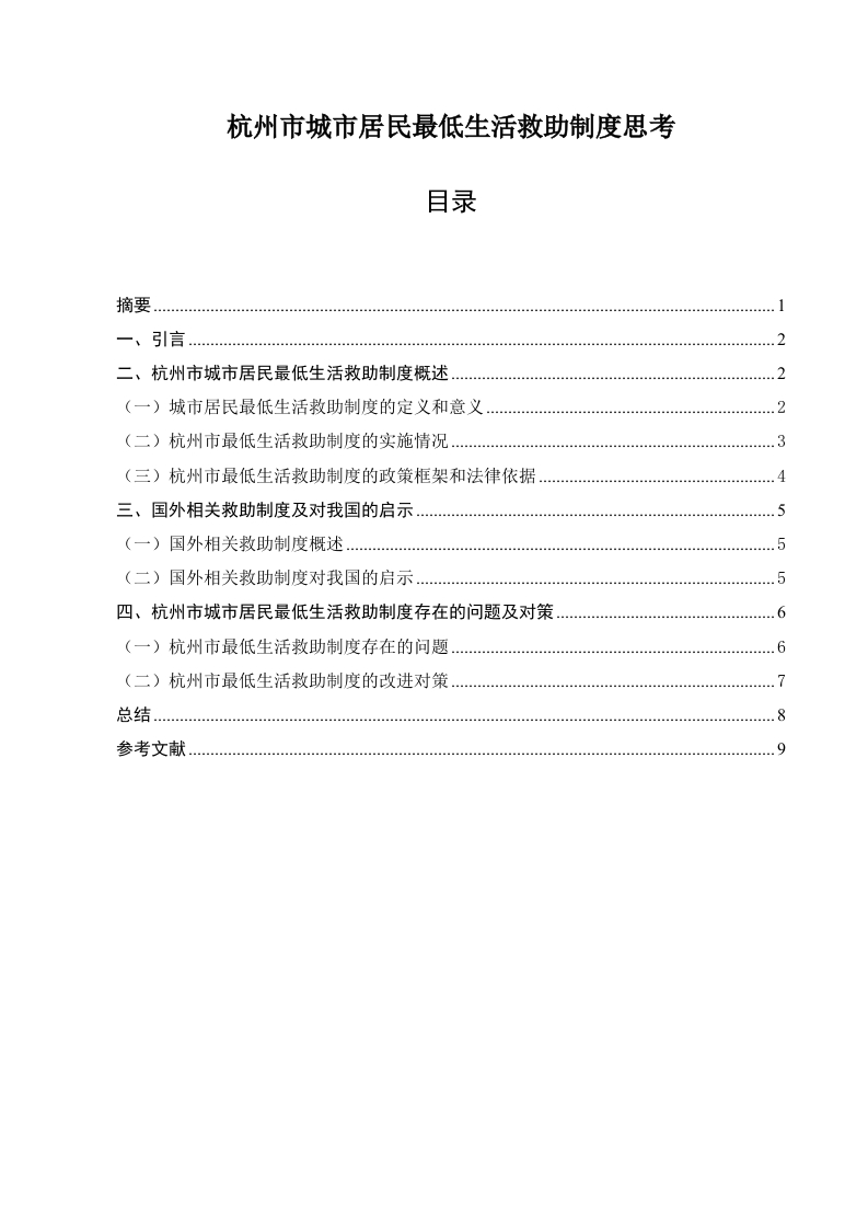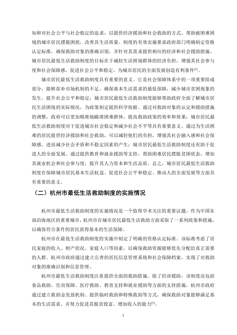 杭州市城市居民最低生活救助制度思考目录摘要、引言.2二、杭州市城市居民最低生活救助制度概述2(一)城市居民最低生活救助制度的定义和意义2(二)杭州市最低生活救助制度的实施情况t2a444444444444444444444444444444444443(三)杭州市最低生活救助制度的政策框架和法律依据.4三、国外相关救助制度及对我国的启示5(一)国外相关救助制度概述,5(二)国外相关救助制度对我国的启示.5四、杭州市城市居民最低生活救助制度存在的问题及对策.6(一)杭州市最低生活救助制度存在的问题.6(二)杭州市最低生活救助制度的改进对策.7总结】8参考文献9摘要城市居民最低生活救助制度是一项社会保障层面具有基础性作用的制度,对于我国经济快速发展的发达地区的弱势群体的利益维护起到了较好的作用,然而在实际运行中仍然存在制度缺陷、监督缺位以及运行缺乏保障等问题。针对这些问题,结合国外相关救助制度的立法以及实施的经验,以杭州市城市居民最低生活救助制度的实施情况为基础进行研究,研究发现该制度存在监督机制不完善的问题以及救助方式缺乏多样化的选择的问题。对于该制度存在的不足,提出了完善立法以细化救助范围、建立有效的监督机制以及构建多样化的救助模式的建议,将对该制度起到一定的促进作用。关键词:城市居民最低生活救助制度:监督机制:救助对象范围1一、引言随着中国社会经济的快速发展和城市化进程的加速推进,城市居民群体的生活水平普遍提高。然而,在城市中依然存在一部分居民生活水平较低,无法满足基本生活需求的困境。为了解决这一问题,中国各级政府积极推动建立和完善城市居民最低生活救助制度,其中杭州市作为浙江省的省会和经济中心,也在不断探索和改进相关政策。杭州市是中国东南沿海地区的重要城市,具有较高的经济发展水平和社会资源。然而,城市居民之间的收入差距以及社会福利分配不均等问题依然存在。尽管杭州市已经实施了一系列扶贫和救助政策,但仍有部分居民生活水平较低,面临生活困境。因此,研究杭州市城市居民最低生活救助制度,深入了解其实施情况和效果,具有重要的现实意义。首先,研究城市居民最低生活救助制度可以帮助政府和相关部门全面了解当前救助政策的运行情况,评估政策的有效性和可持续性,为政府改进和优化政策提供科学依据。其次,通过研究可以深入分析杭州市城市居民生活困境的原因和特点,揭示收入分配不均、就业问题、社会保障体系不完善等方面存在的问题,为解决城市贫困问题提供参考山。此外,研究城市居民最低生活教助制度对于促进社会公平和稳定具有重要意义。通过建立健全的救助制度,可以减少社会不公和贫困问题,增强城市居民的社会保障感和幸福感,促进社会的和谐发展。综上所述,研究杭州市城市居民最低生活救助制度,既具有实践意义,也具有理论意义。通过深入分析和研究,可以为政府决策提供科学依据,为杭州市及其他城市的社会保障体系建设和扶贫工作提供有益借鉴。二、杭州市城市居民最低生活救助制度概述(一)城市居民最低生活救助制度的定义和意义城市居民最低生活救助制度是指为解决城市居民中处于生活困境的特定群体而设立的一套制度安排,该制度通过确定明确的资格认定标准和提供相应的补助措施,旨在确保符合条件的城市居民能够获取基本的生活保障。这些保障措施包括但不限于食品、住房、医疗、教育和就业援助等方面的支持。该制度的设立基于对城市居民生活困境的认、3知和对社会公平与社会稳定的追求,以提供经济援助和社会救助的方式,帮助被困难困境的城市居民摆脱困扰,改善其生活质量。制度的有效实施要求政府部门明确制定资格认定标准,确保救助对象的准确识别,并针对其需求提供相应的经济和社会援助措施。城市居民最低生活救助制度的目标在于减轻生活困境群体的经济负担,增强其社会参与度和社会保障感,促进社会公平和稳定,为城市居民的全面发展创造有利条件2。城市居民最低生活救助制度具有重要的意义。它是社会保障体系中的一项重要组成部分,能够弥补市场机制的不足,确保基本生活需求的最低保障,减少城市贫困现象的发生,提升社会公平和稳定:城市居民最低生活救助制度能够帮助政府全面了解城市居民生活困境的实际情况,为政策制定提供科学依据。通过对救助对象的认定和援助措施的调整,政府可以更加精准地瞄准困难群体,提高救助政策的效率和效果:城市居民最低生活救助制度对于促进城市社会稳定和减少社会不平等具有重要意义。通过为生活困难的居民提供经济援助和社会救助,可以减轻他们的负担,增强其社会融入感和社会保障感,进而减少社会矛盾和不稳定因素的产生:城市居民最低生活救助制度还有助于促进人的全面发展。通过提供教育和就业援助等支持,帮助困难居民摆脱贫困状态,增加其就业机会和社会参与度,提升其人力资本和生活品质。总之,城市居民最低生活救助制度在保障城市居民基本生活权益、促进社会公平和稳定、推动人的全面发展等方面具有重要的意义。(二)杭州市最低生活救助制度的实施情况杭州市最低生活救助制度的实施情况是一个值得学术关注的重要议题。作为中国东南沿海地区的重要城市,杭州市在城市居民最低生活救助方面
