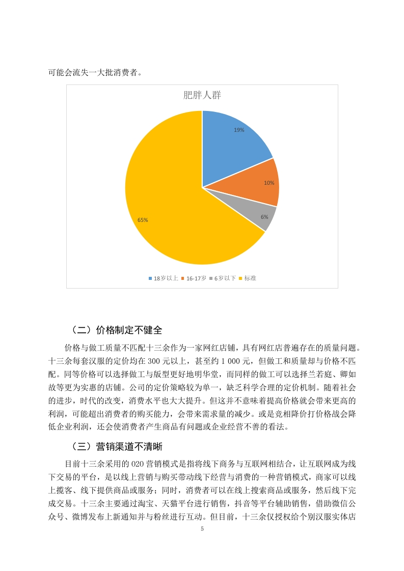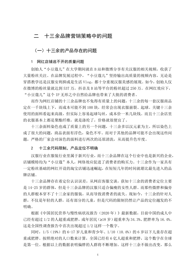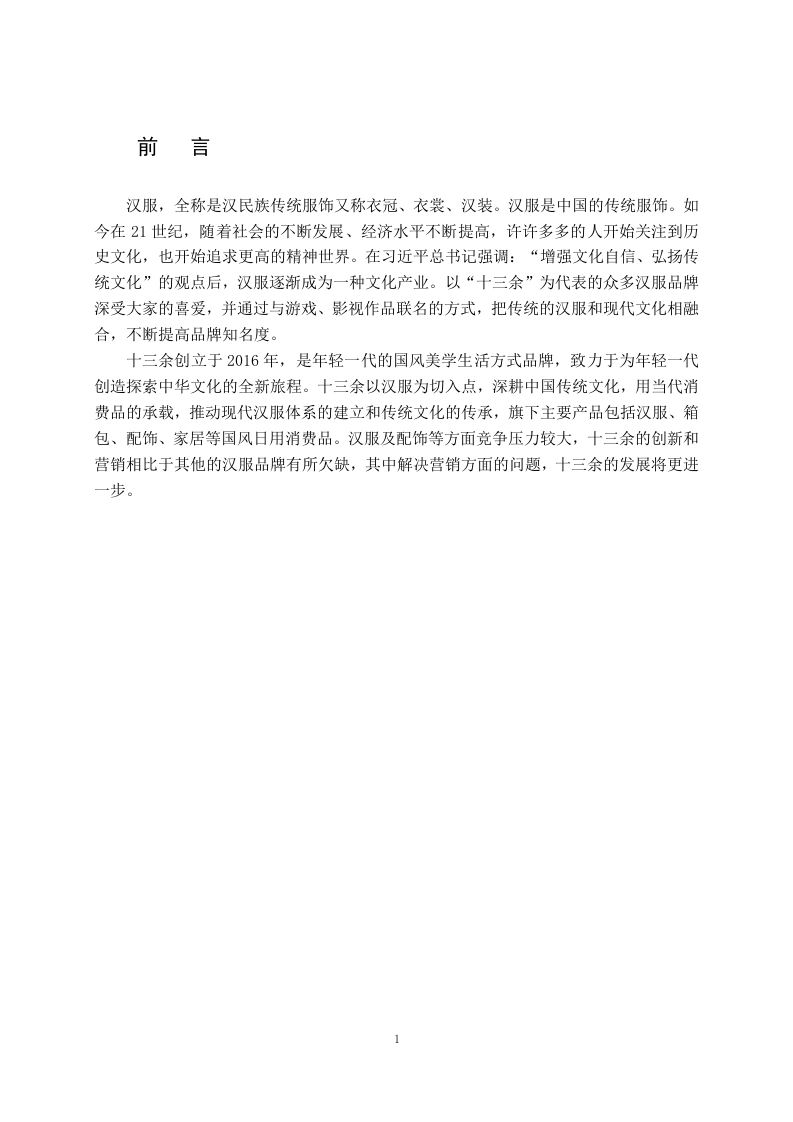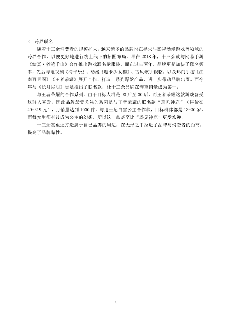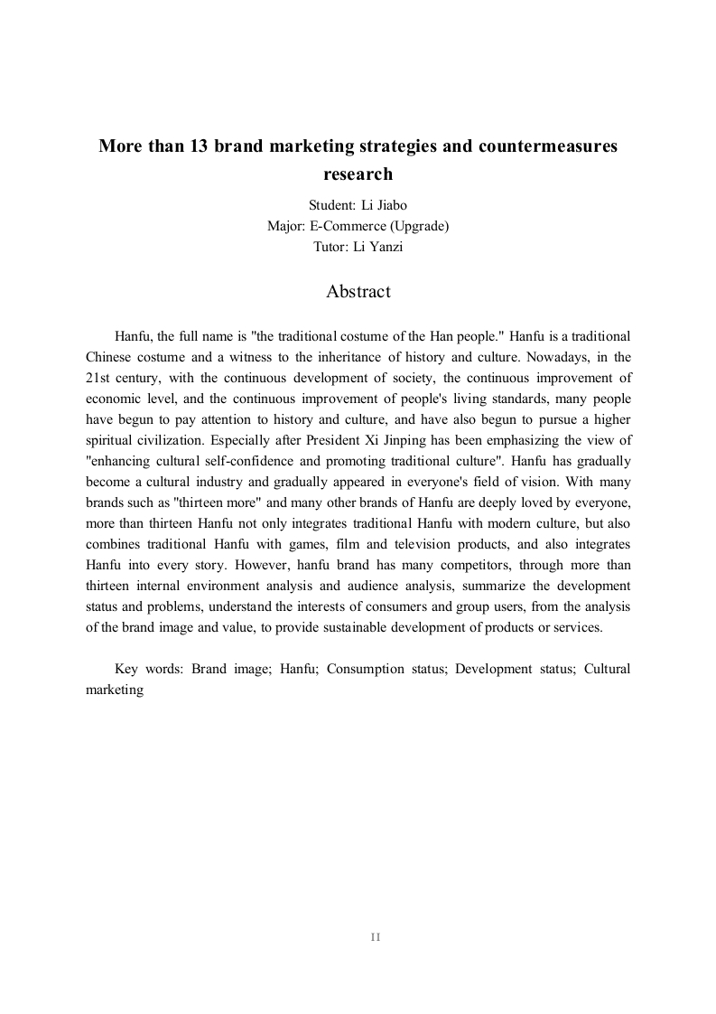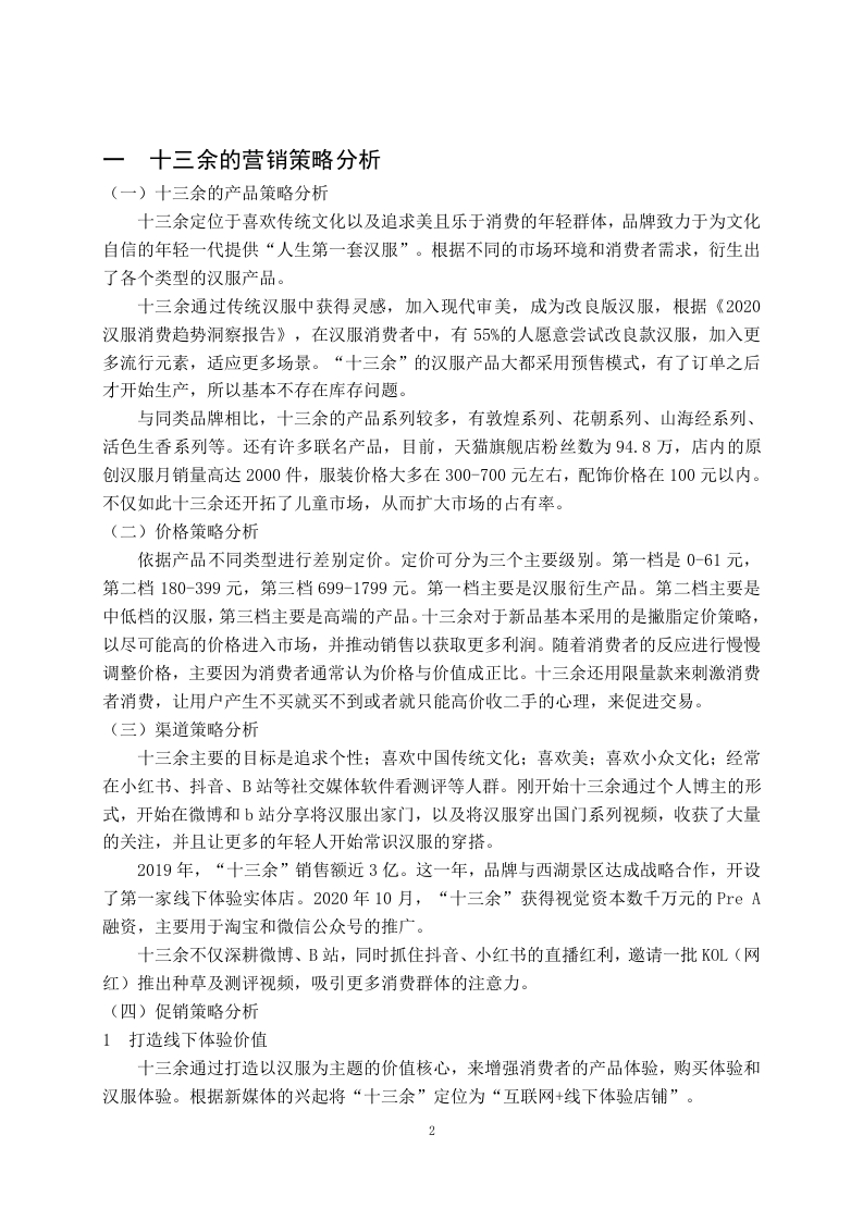 汉服品牌十三余的营销策略研究摘要汉服,全称是汉民族传统服饰。汉服是中国的传统服饰,也是见证历史文化的传承。如今在21世纪,随着社会的不断发展、经济水平不断提高,人们的生活水平不断提升,许许多多的人开始关注到历史文化,也开始追求更高的精神文明。尤其是习近平主席一直在强调:“增强文化自信、弘扬传统文化”的观点后。汉服逐渐成为一种文化产业,渐渐出现在大家的视野中。以“十三余”等众多的品牌汉服深受大家的喜爱,十三余的汉服不仅把传统的汉服和现代文化相融合,还把传统的汉服和游戏、影视品相结合,而且还把汉服融入了每一个故事。然而汉服品牌的竞争对手较多,通过对十三余内部环境分析以及受众分析,总结发展现状与问题,了解消费者及团体用户的利益点,从分析品牌的形象及价值,为产品或服务提供持续发展的动力。关键词:品牌形象:汉服:消费状况:发展现状:文化营销More than 13 brand marketing strategies and countermeasuresresearchStudent:Li JiaboMajor:E-Commerce (Upgrade)Tutor:Li YanziAbstractHanfu,the full name is "the traditional costume of the Han people."Hanfu is a traditionalChinese costume and a witness to the inheritance of history and culture.Nowadays,in the21st century,with the continuous development of society,the continuous improvement ofeconomic level,and the continuous improvement of people's living standards,many peoplehave begun to pay attention to history and culture,and have also begun to pursue a higherspiritual civilization.Especially after President Xi Jinping has been emphasizing the view of"enhancing cultural self-confidence and promoting traditional culture".Hanfu has graduallybecome a cultural industry and gradually appeared in everyone's field of vision.With manybrands such as "thirteen more"and many other brands of Hanfu are deeply loved by everyone,more than thirteen Hanfu not only integrates traditional Hanfu with modern culture,but alsocombines traditional Hanfu with games,film and television products,and also integratesHanfu into every story.However,hanfu brand has many competitors,through more thanthirteen internal environment analysis and audience analysis,summarize the developmentstatus and problems,understand the interests of consumers and group users,from the analysisof the brand image and value,to provide sustainable development of products or services.Key words:Brand image;Hanfu;Consumption status;Development status;CulturalmarketingII前言汉服,全称是汉民族传统服饰又称衣冠、衣裳、汉装。汉服是中国的传统服饰。如今在21世纪,随着社会的不断发展、经济水平不断提高,许许多多的人开始关注到历史文化,也开始追求更高的精神世界。在习近平总书记强调:“增强文化自信、弘扬传统文化”的观点后,汉服逐渐成为一种文化产业。以“十三余”为代表的众多汉服品牌深受大家的喜爱,并通过与游戏、影视作品联名的方式,把传统的汉服和现代文化相融合,不断提高品牌知名度。十三余创立于2016年,是年轻一代的国风美学生活方式品牌,致力于为年轻一代创造探索中华文化的全新旅程。十三余以汉服为切入点,深耕中国传统文化,用当代消费品的承载,推动现代汉服体系的建立和传统文化的传承,旗下主要产品包括汉服、箱包、配饰、家居等国风日用消费品。汉服及配饰等方面竞争压力较大,十三余的创新和营销相比于其他的汉服品牌有所欠缺,其中解决营销方面的问题,十三余的发展将更进一步。一十三余的营销策略分析(一)十三余的产品策略分析十三余定位于喜欢传统文化以及追求美且乐于消费的年轻群体,品牌致力于为文化自信的年轻一代提供“人生第一套汉服”。根据不同的市场环境和消费者需求,衍生出了各个类型的汉服产品。十三余通过传统汉服中获得灵感,加入现代审美,成为改良版汉服,根据《2020汉服消费趋势洞察报告》,在汉服消费者中,有55%的人愿意尝试改良款汉服,加入更多流行元素,适应更多场景。“十三余”的汉服产品大都采用预售模式,有了订单之后才开始生产,所以基本不存在库存问题。与同类品牌相比,十三余的产品系列较多,有敦煌系列、花朝系列、山海经系列、活色生香系列等。还有许多联名产品,目前,天猫旗舰店粉丝数为94.8万,店内的原创汉服月销量高达2000件,服装价格大多在300-700元左右,配饰价格在100元以内。不仅如此十三余还开拓了儿童市场,从而扩大市场的占有率。(二)价格策略分析依据产品不同类型进行差别定价。定价可分为三个主要级别。第一档是0-61元,第二档180-399元,第三档699-1799元。第一档主要是汉服衍生产品。第二档主要是中低档的汉服,第三档主要是高端的产品。十三余对于新品基本采用的是撇脂定价策略,以尽可能高的价格进入市场,并推动销售以获取更多利润。随着消费者的反应进行慢慢调整价格,主要因为消费者通常认为价格与价值成正比。十三余还用限量款来刺激消费者消费,让用户产生不买就买不到或者就只能高价收二手的心理,来促进交易。(三)渠道策略分析十三余主要的目标是追求个性:喜欢中国传统文化:喜欢美:喜欢小众文化:经常在小红书、抖音、B站等社交媒体软件看测评等人群。刚开始