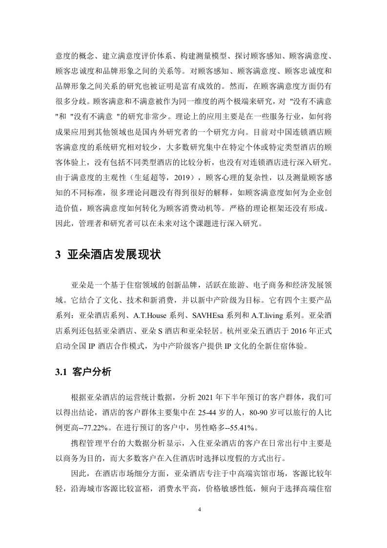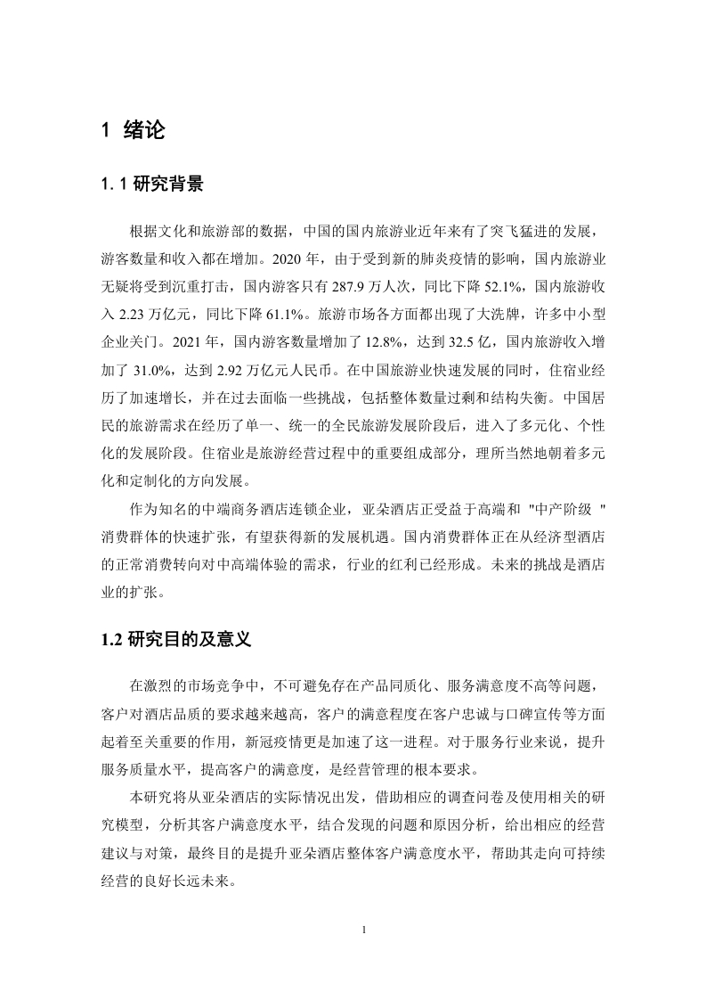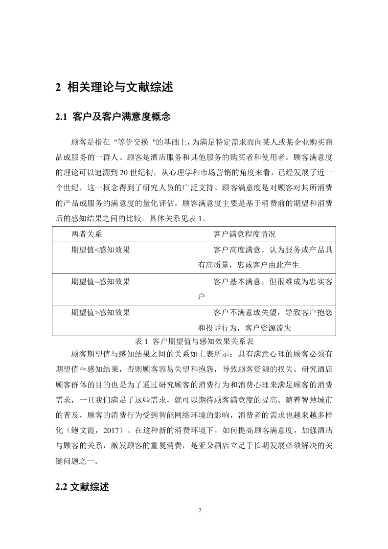 亚朵酒店客户满意度提升的研究目录摘要1绪论1.1f研究背景112研究目的及意义12相关理论与文献综述.221客户及客户满意度概念…22.2文献综述3亚朵酒店发展现状33.1客户分析134亚朵酒店客户满意度问题及成因分析44.1网络口碑维护力度不足,导致品牌形象污损44.2客户期望和实际体验的差距,降低客户满意度…44.3员工服务能力参差不齐,有待进一步提高…55亚朵酒店客户满意度提升策略.551加强企业文化建设,获得客户认同…155.2服务标准统一化,减少客户心理落差66结论7参考文献9致谢.EEEEEEEEEEEEEEEEEEEEEEEEEEEEEE E10摘要经济的发展和技术的进步带来了消费更新的新阶段,消费者的需求进一步提高,但也产生了更大的差异化,从简单的物质需求到文化精神需求、服务和品牌体验,满足消费者的需求,不断提升转型。在实际运营过程中,顾客的满意度可以保证酒店降低获客成本,减少营销投入,并通过口碑影响,提高酒店入住率,为酒店带来利润。特别是在移动互联网发达的时代,短视频全面普及,网络红人的影响力更加明显,推动了客户对每一次入住的满意度。为顾客创造价值是提高顾客满意度的核心。应用高峰法则为顾客创造价值,满足顾客的个性化需求,亚朵酒店专注于三个方面:一是全面的设施,二是富有成效的服务,三是个性化的体验。这使得每一位到亚朵旅游的顾客都能成为亚朵品牌的忠实拥护者。关键词:消费升级/差异化需求/满意度/亚朵酒店1绪论1.1研究背景根据文化和旅游部的数据,中国的国内旅游业近年来有了突飞猛进的发展,游客数量和收入都在增加。2020年,由于受到新的肺炎疫情的影响,国内旅游业无疑将受到沉重打击,国内游客只有287.9万人次,同比下降52.1%,国内旅游收入2.23万亿元,同比下降61.1%。旅游市场各方面都出现了大洗牌,许多中小型企业关门。2021年,国内游客数量增加了12.8%,达到32.5亿,国内旅游收入增加了31.0%,达到2.92万亿元人民币。在中国旅游业快速发展的同时,住宿业经历了加速增长,并在过去面临一些挑战,包括整体数量过剩和结构失衡。中国居民的旅游需求在经历了单一、统一的全民旅游发展阶段后,进入了多元化、个性化的发展阶段。住宿业是旅游经营过程中的重要组成部分,理所当然地朝着多元化和定制化的方向发展。作为知名的中端商务酒店连锁企业,亚朵酒店正受益于高端和"中产阶级”消费群体的快速扩张,有望获得新的发展机遇。国内消费群体正在从经济型酒店的正常消费转向对中高端体验的需求,行业的红利已经形成。未来的挑战是酒店业的扩张。1.2研究目的及意义在激烈的市场竞争中,不可避免存在产品同质化、服务满意度不高等问题,客户对酒店品质的要求越来越高,客户的满意程度在客户忠诚与口碑宣传等方面起着至关重要的作用,新冠疫情更是加速了这一进程。对于服务行业来说,提升服务质量水平,提高客户的满意度,是经营管理的根本要求。本研究将从亚朵酒店的实际情况出发,借助相应的调查问卷及使用相关的研究模型,分析其客户满意度水平,结合发现的问题和原因分析,给出相应的经营建议与对策,最终目的是提升亚朵酒店整体客户满意度水平,帮助其走向可持续经营的良好长远未来。2相关理论与文献综述2.1客户及客户满意度概念顾客是指在"等价交换"的基础上,为满足特定需求而向某人或某企业购买商品或服务的一群人。顾客是酒店服务和其他服务的购买者和使用者。顾客满意度的理论可以追溯到20世纪初,从心理学和市场营销的角度来看,已经发展了近一个世纪,这一概念得到了研究人员的广泛支持。顾客满意度是对顾客对其所消费的产品或服务的满意度的量化评估。顾客满意度主要是基于消费前的期望和消费后的感知结果之间的比较。具体关系见表1。两者关系客户满意程度情况期望值<感知效果客户高度满意,认为服务或产品具有高质量,忠诚客户由此产生期望值=感知效果客户基本满意,但很难成为忠实客期望值>感知效果客户不满意或失望,导致客户抱怨和投诉行为,客户资源流失表1客户期望值与感知效果关系表顾客期望值与感知结果之间的关系如上表所示:具有满意心理的顾客必须有期望值≈感知结果,否则顾客容易失望和抱怨,导致顾客资源的损失。研究酒店顾客群体的目的也是为了通过研究顾客的消费行为和消费心理来满足顾客的消费需求,一旦我们满足了这些需求,就可以期待顾客满意度的提高。随着智慧城市的普及,顾客的消费行为受到智能网络环境的影响,消费者的需求也越来越多样化(鲍文霞,2017)。在这种新的消费环境下,如何提高顾客满意度,加强酒店与顾客的关系,激发顾客的重复消费,是亚朵酒店立足于长期发展必须解决的关键问题之一。2.2文献综述2