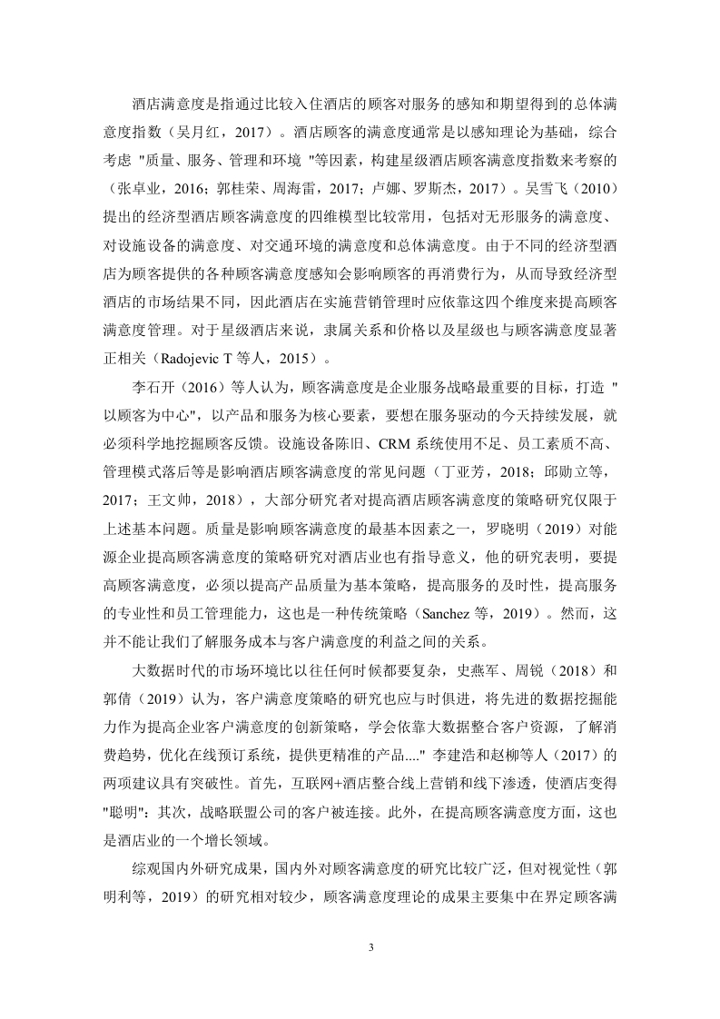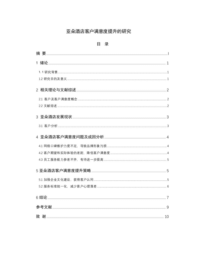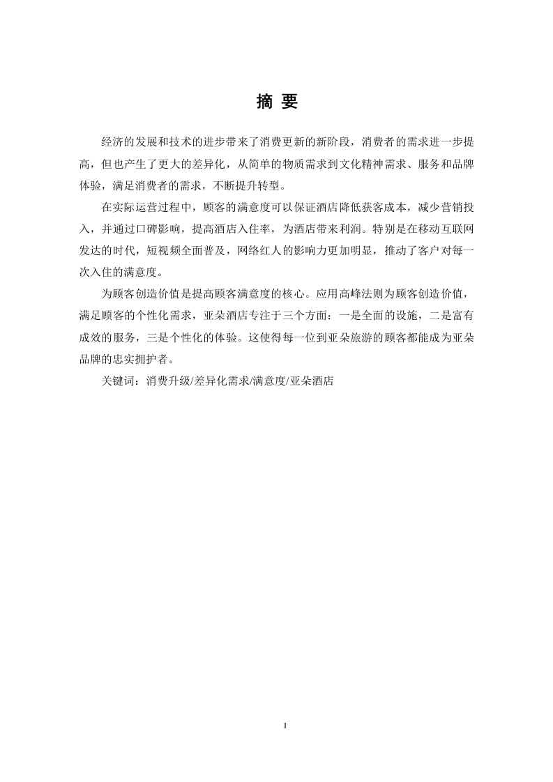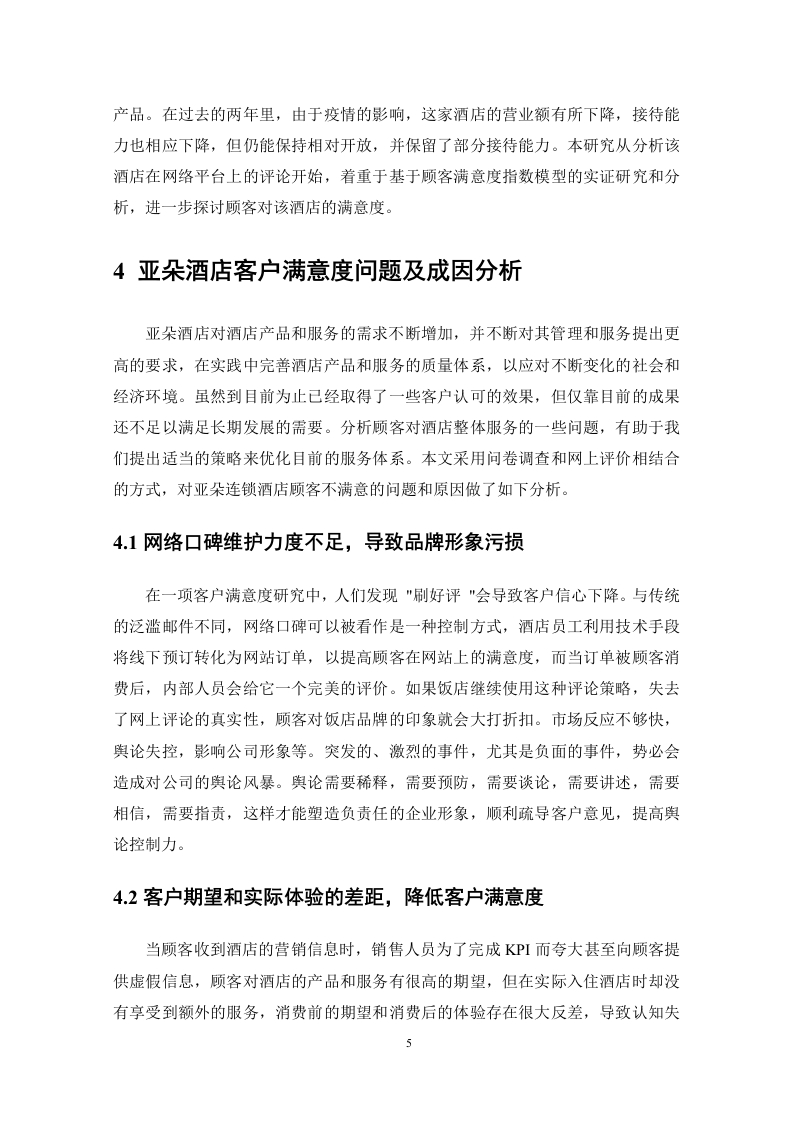 亚朵酒店客户满意度提升的研究目录摘要1绪论1.1f研究背景112研究目的及意义12相关理论与文献综述.221客户及客户满意度概念…22.2文献综述3亚朵酒店发展现状33.1客户分析134亚朵酒店客户满意度问题及成因分析44.1网络口碑维护力度不足,导致品牌形象污损44.2客户期望和实际体验的差距,降低客户满意度…44.3员工服务能力参差不齐,有待进一步提高…55亚朵酒店客户满意度提升策略.551加强企业文化建设,获得客户认同…155.2服务标准统一化,减少客户心理落差66结论7参考文献9致谢.EEEEEEEEEEEEEEEEEEEEEEEEEEEEEE E10摘要经济的发展和技术的进步带来了消费更新的新阶段,消费者的需求进一步提高,但也产生了更大的差异化,从简单的物质需求到文化精神需求、服务和品牌体验,满足消费者的需求,不断提升转型。在实际运营过程中,顾客的满意度可以保证酒店降低获客成本,减少营销投入,并通过口碑影响,提高酒店入住率,为酒店带来利润。特别是在移动互联网发达的时代,短视频全面普及,网络红人的影响力更加明显,推动了客户对每一次入住的满意度。为顾客创造价值是提高顾客满意度的核心。应用高峰法则为顾客创造价值,满足顾客的个性化需求,亚朵酒店专注于三个方面:一是全面的设施,二是富有成效的服务,三是个性化的体验。这使得每一位到亚朵旅游的顾客都能成为亚朵品牌的忠实拥护者。关键词:消费升级/差异化需求/满意度/亚朵酒店1绪论1.1研究背景根据文化和旅游部的数据,中国的国内旅游业近年来有了突飞猛进的发展,游客数量和收入都在增加。2020年,由于受到新的肺炎疫情的影响,国内旅游业无疑将受到沉重打击,国内游客只有287.9万人次,同比下降52.1%,国内旅游收入2.23万亿元,同比下降61.1%。旅游市场各方面都出现了大洗牌,许多中小型企业关门。2021年,国内游客数量增加了12.8%,达到32.5亿,国内旅游收入增加了31.0%,达到2.92万亿元人民币。在中国旅游业快速发展的同时,住宿业经历了加速增长,并在过去面临一些挑战,包括整体数量过剩和结构失衡。中国居民的旅游需求在经历了单一、统一的全民旅游发展阶段后,进入了多元化、个性化的发展阶段。住宿业是旅游经营过程中的重要组成部分,理所当然地朝着多元化和定制化的方向发展。作为知名的中端商务酒店连锁企业,亚朵酒店正受益于高端和"中产阶级”消费群体的快速扩张,有望获得新的发展机遇。国内消费群体正在从经济型酒店的正常消费转向对中高端体验的需求,行业的红利已经形成。未来的挑战是酒店业的扩张。1.2研究目的及意义在激烈的市场竞争中,不可避免存在产品同质化、服务满意度不高等问题,客户对酒店品质的要求越来越高,客户的满意程度在客户忠诚与口碑宣传等方面起着至关重要的作用,新冠疫情更是加速了这一进程。对于服务行业来说,提升服务质量水平,提高客户的满意度,是经营管理的根本要求。本研究将从亚朵酒店的实际情况出发,借助相应的调查问卷及使用相关的研究模型,分析其客户满意度水平,结合发现的问题和原因分析,给出相应的经营建议与对策,最终目的是提升亚朵酒店整体客户满意度水平,帮助其走向可持续经营的良好长远未来。2相关理论与文献综述2.1客户及客户满意度概念顾客是指在"等价交换"的基础上,为满足特定需求而向某人或某企业购买商品或服务的一群人。顾客是酒店服务和其他服务的购买者和使用者。顾客满意度的理论可以追溯到20世纪初,从心理学和市场营销的角度来看,已经发展了近一个世纪,这一概念得到了研究人员的广泛支持。顾客满意度是对顾客对其所消费的产品或服务的满意度的量化评估。顾客满意度主要是基于消费前的期望和消费后的感知结果之间的比较。具体关系见表1。两者关系客户满意程度情况期望值<感知效果客户高度满意,认为服务或产品具有高质量,忠诚客户由此产生期望值=感知效果客户基本满意,但很难成为忠实客期望值>感知效果客户不满意或失望,导致客户抱怨和投诉行为,客户资源流失表1客户期望值与感知效果关系表顾客期望值与感知结果之间的关系如上表所示:具有满意心理的顾客必须有期望值≈感知结果,否则顾客容易失望和抱怨,导致顾客资源的损失。研究酒店顾客群体的目的也是为了通过研究顾客的消费行为和消费心理来满足顾客的消费需求,一旦我们满足了这些需求,就可以期待顾客满意度的提高。随着智慧城市的普及,顾客的消费行为受到智能网络环境的影响,消费者的需求也越来越多样化(鲍文霞,2017)。在这种新的消费环境下,如何提高顾客满意度,加强酒店与顾客的关系,激发顾客的重复消费,是亚朵酒店立足于长期发展必须解决的关键问题之一。2.2文献综述2