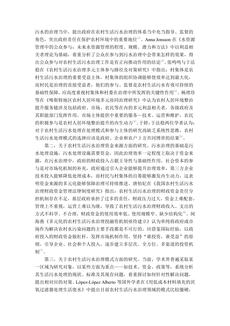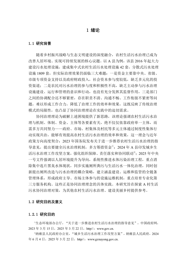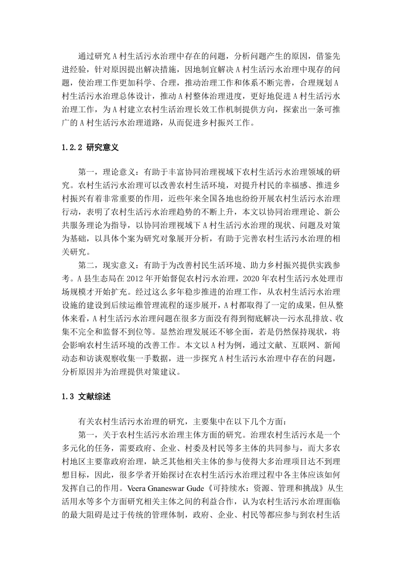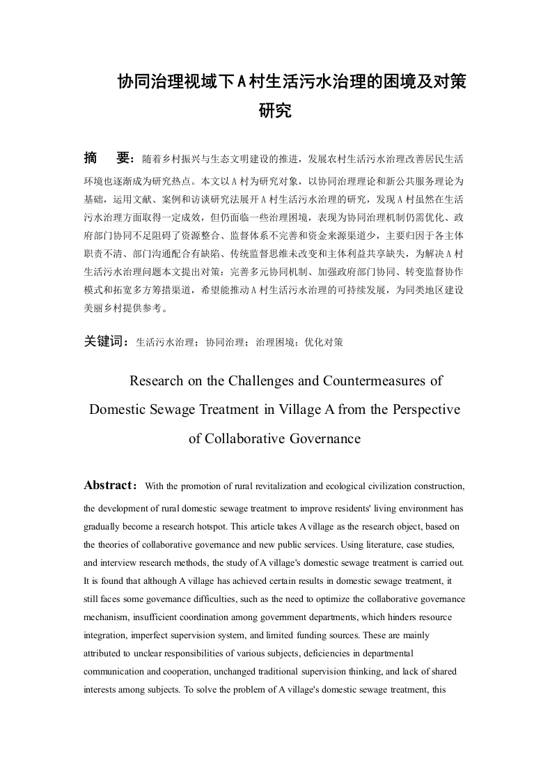 协同治理视域下A村生活污水治理的困境及对策研究目录摘要.…5Abstract.·.51绪论.71.1研究背景.1.2研究目的及意义...1.2.1研究目的....1.2.2研究意义1.3文献综述...081.4研究内容与方法.·..111.4.1研究内容....111.4.2研究方法...112基本概念和相关理论...·132.1基本概念….132.1.1农村生活污水..132.1.2农村生活污水治理132.2相关理论.…132.2.1协同治理理论.....132.2.2新公共服务理论....。143协同治理视域下A村生活污水治理现状.·.·153.1A村简介.…153.2A村生活污水治理现状......153.2.1A村污水产生排放情况.153.2.2A村生活污水处理模式与措施...153.3A村生活污水治理取得的成效....163.3.1政府治理方式逐渐改变..。163.3.2生活环境有所改善......163.3.3村民环保意识增强.…164协同治理视域下A村生活污水治理中存在的问题.·.·.184.1协同治理机制仍需优化..184.2政府部门协同不足阻碍了资源整合184.3监督体系不完善..194.4资金米源渠道少.….195协同治理视域下A村生活污水治理问题原因分析....…205.1治理制度不明确和各主体职责不清205.2部门沟通配合有缺陷..205.3传统监督思维未转变.205.4主体利益共享缺失...216协同治理视域下A村生活污水治理的对策建议.…226.1完善多元协同机制...226.2加强政府组织领导.226.3转变监督协作模式.….236.4拓宽多方筹措渠道237结论.24参考文献…25附录2致谢.28协同治理视域下A村生活污水治理的困境及对策研究摘要:随着乡村振兴与生态文明建设的推进,发展农村生活污水治理改善居民生活环境也逐渐成为研究热点。本文以A村为研究对象,以协同治理理论和新公共服务理论为基础,运用文献、案例和访谈研究法展开A村生活污水治理的研究,发现A村虽然在生活污水治理方面取得一定成效,但仍面临一些治理困境,表现为协同治理机制仍需优化、政府部门协同不足阻碍了资源整合、监督体系不完善和资金来源渠道少,主要归因于各主体职责不清、部门沟通配合有缺陷、传统监督思维未改变和主体利益共享缺失,为解决A村生活污水治理问题本文提出对策:完善多元协同机制、加强政府部门协同、转变监督协作模式和拓宽多方筹措渠道,希望能推动A村生活污水治理的可持续发展,为同类地区建设美丽乡村提供参考。关键词:生活污水治理:协同治理:治理困境:优化对策Research on the Challenges and Countermeasures ofDomestic Sewage Treatment in Village A from the Perspectiveof Collaborative GovernanceAbstract:With the promotion of rural revitalization and ecological civilization construction,the development of rural domestic sewage treatment to improve residents'living environment hasgradually become a research hotspot.This article takes A village as the research object,based onthe theories of collaborative govemance and new public services.Using literature,case studies,and interview research methods,the study ofA village's domestic sewage treatment is carried out.It is found that although A village has achieved certain results in domestic sewage treatment,itstill faces some govemance difficulties,such as the need to optimize the collaborative govemancemechanism,insufficient coordination among goverment departments,which hinders resourceintegration,imperfect supervision system,and limited funding sources.These are mainlyattributed to unclear responsibilities of various subjects,deficiencies in departmentalcommunication and cooperation,unchanged traditional supervision thinking,and lack of sharedinterests among subjects.To solve the problem of A village's domestic sewage treatment,thisarticle proposes countermeasures:improve the diversified collaborative mechanism,strengthengovemment department coordination,transform the supervision and cooperation mode,andbroaden multi-party fundraising channels.It is hoped that this can promote A village's daily life.The sustainable development of sewage treatment,Provide reference for building beautifulcountryside in similar regions.Key words:Domestic sewage govemance:collaborative govemance:govemance dilemma:optimization countermeasures