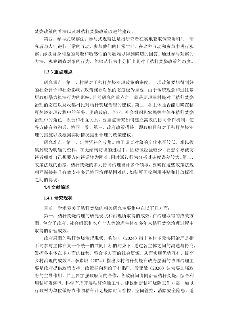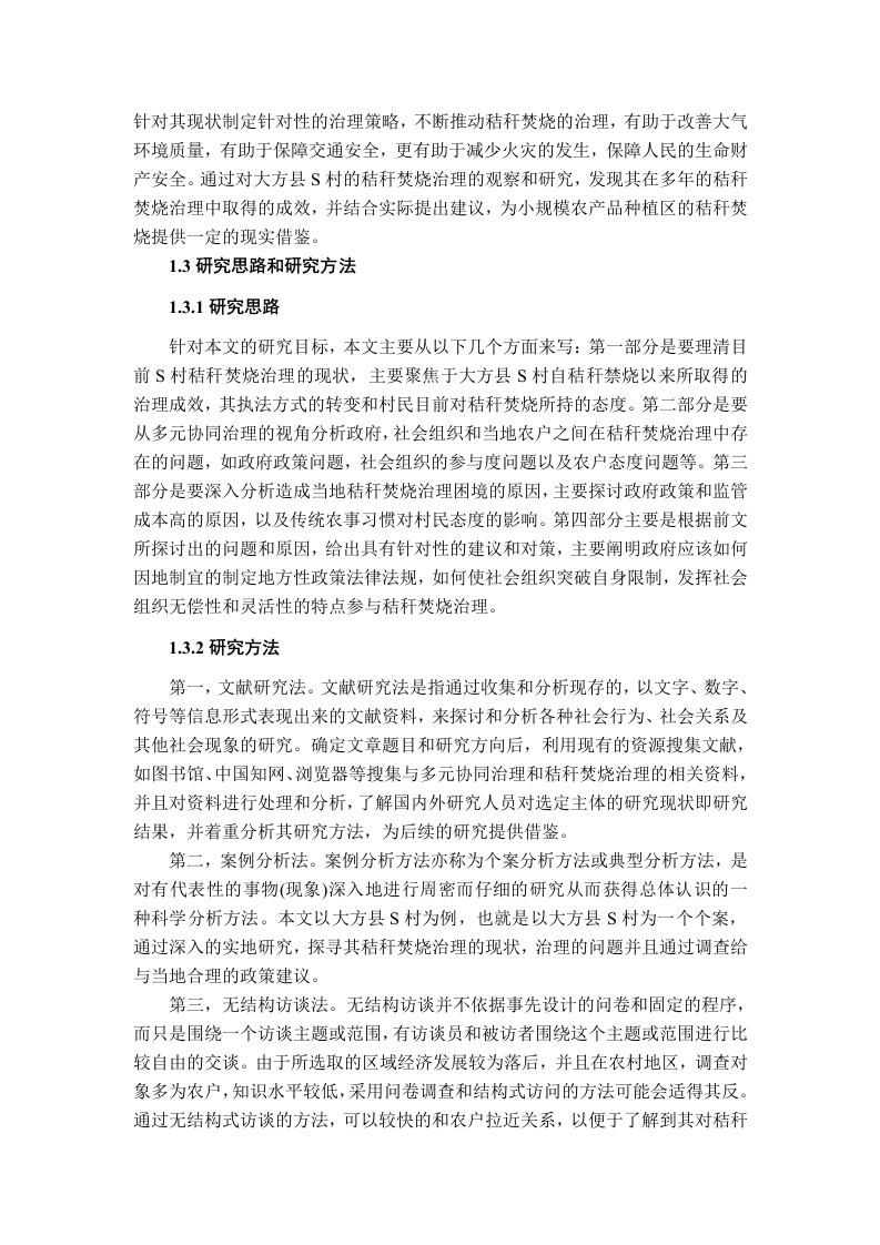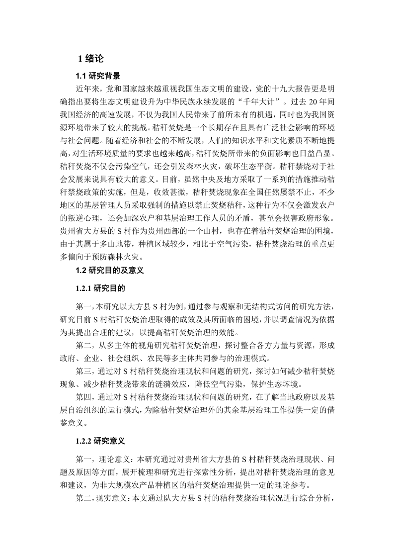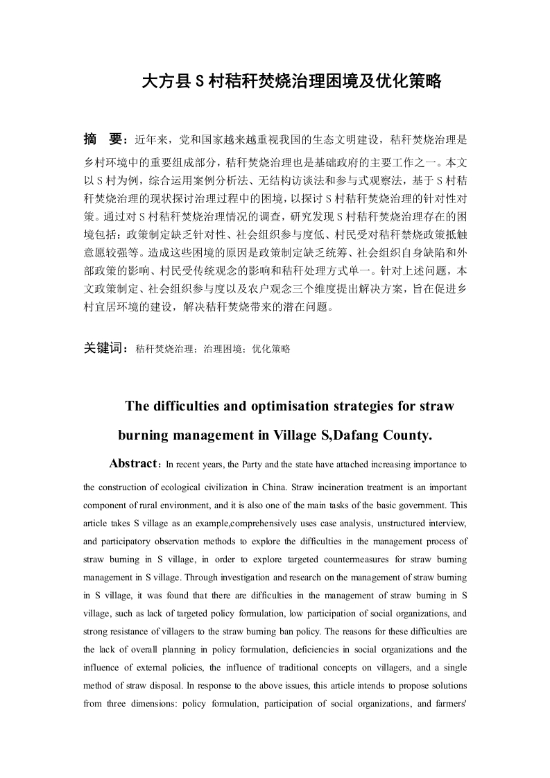 大方县$村秸秆焚烧治理困境及优化策略目录摘要Abstract............1绪论.1.1研究背景…1.2研究目的及意义......。81.3研究思路和研究方法1.4文献综述......102核心概念和理论基础…132.1核心概念.…132.2理论基础.143大方县$村秸秆焚烧治理现状分析·..163.1大方县S村简介.....163.2大方县S村秸秆焚烧治理的现状164大方县S村秸秆焚烧治理存在的问题..........184.1政策缺乏针对性,监管成本高且效率低184.2社会组织参与度低,宣传教育手段单一1843农户对秸秆焚烧政策抵触意愿较强.…195大方县S村秸秆焚烧治理存在问题的原因......205.1政策制定缺乏统筹,政府监管手段落后...205.2社会组织自身缺陷和外部政策的缺失215.3农户价值观念影响及秸秆处理方式单一.....216大方县S村秸秆焚烧治理的对策建议.…236.1制定针对性的政策体系,创新监察方式........236.2加大政策支持力度,鼓励社会组织参与...236.3加强宣传教育,创新秸秆处理技术.247总结与展望.….267.1总结267.2展望.26参考文献…27致谢…29大方县$村秸秆焚烧治理困境及优化策略摘要:近年来,党和国家越来越重视我国的生态文明建设,秸秆焚烧治理是乡村环境中的重要组成部分,秸秆焚烧治理也是基础政府的主要工作之一。本文以S村为例,综合运用案例分析法、无结构访谈法和参与式观察法,基于S村秸秆焚烧治理的现状探讨治理过程中的困境,以探讨S村秸秆焚烧治理的针对性对策。通过对S村秸秆焚烧治理情况的调查,研究发现S村秸秆焚烧治理存在的困境包括:政策制定缺乏针对性、社会组织参与度低、村民受对秸秆禁烧政策抵触意愿较强等。造成这些困境的原因是政策制定缺乏统筹、社会组织自身缺陷和外部政策的影响、村民受传统观念的影响和秸秆处理方式单一。针对上述问题,本文政策制定、社会组织参与度以及农户观念三个维度提出解决方案,旨在促进乡村宜居环境的建设,解决秸秆焚烧带来的潜在问题。关键词:秸秆焚烧治理:治理困境:优化策略The difficulties and optimisation strategies for strawburning management in Village S,Dafang County.Abstract:In recent years,the Party and the state have attached increasing importance tothe construction of ecological civilization in China.Straw incineration treatment is an importantcomponent of rural environment,and it is also one of the main tasks of the basic goverment.Thisarticle takes S village as an example,comprehensively uses case analysis,unstructured interview,and participatory observation methods to explore the difficulties in the management process ofstraw buming in S village,in order to explore targeted countermeasures for straw bumingmanagement in S village.Through investigation and research on the management of straw bumingin S village,it was found that there are difficulties in the management of straw buming in Svillage,such as lack of targeted policy formulation,low participation of social organizations,andstrong resistance of villagers to the straw buming ban policy.The reasons for these difficulties arethe lack of overall planning in policy formulation,deficiencies in social organizations and theinfluence of extemal policies,the influence of traditional concepts on villagers,and a singlemethod of straw disposal.In response to the above issues,this article intends to propose solutionsfrom three dimensions:policy formulation,participation of social organizations,and farmers'attitudes,with the aim of promoting the construction of livable rural environments and addressingpotential problems caused by straw buming.Key words:Straw buming management;Governance dilemma;optimization strategy attitude