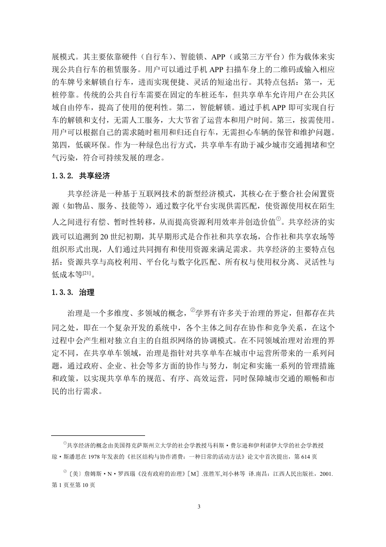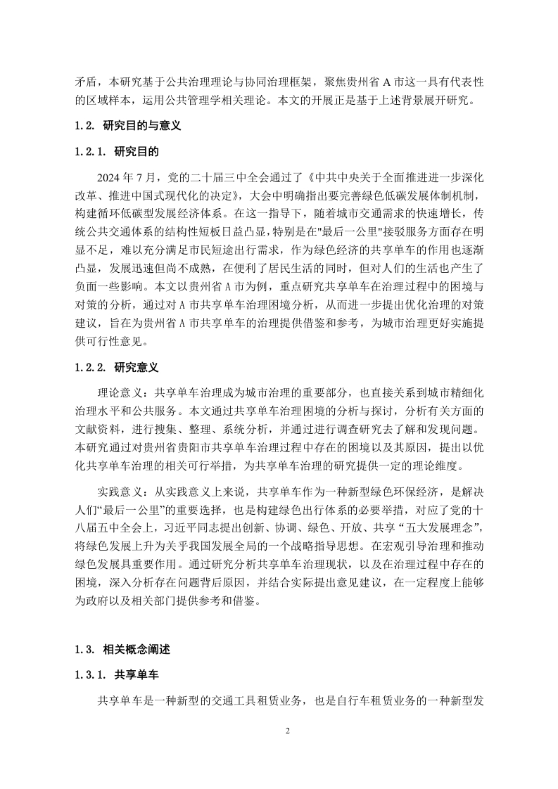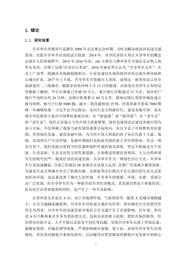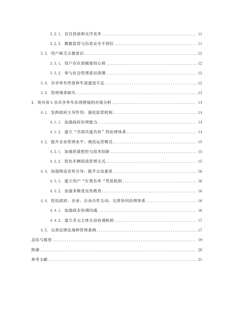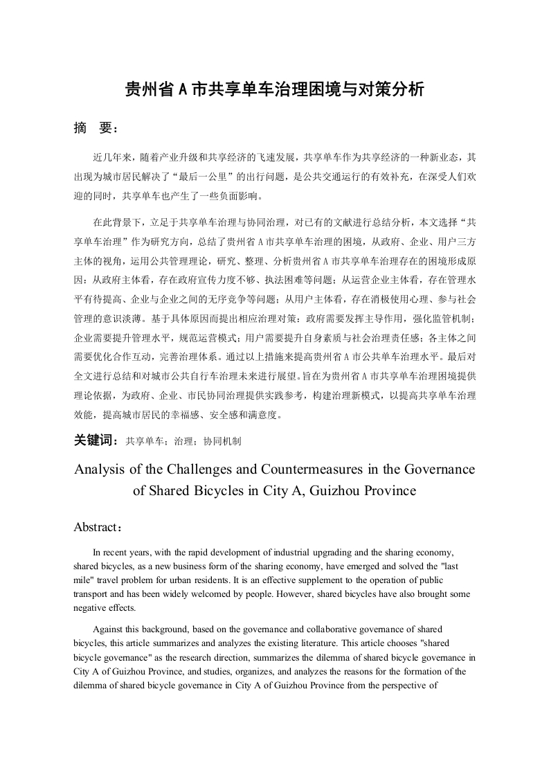 目录1.绪论.…1.1.研究背景.…11.2.研究目的与意义.…21.2.1.研究目的..。1.22.研究意义。。。。。,。。。。。。。。。。。。。。。。。。。21.3.相关概念阐述...1.3.1.共享单车..1.3.2.共享经济....1.3.3.治理.1.4.研究方法概述....1.5.文献综述1.5.1.国内研究综述....1.5.2.国外研究现状........51.5.3.国内外研究述评...。52.贵州省A市共享单车治理困境。。72.1.共享单车停放乱象...。72.2.用户私自加锁,占用共享单车....2.3.用户缴纳押金的安全性问题..2.4.共享单车被恶意损毁现象...82.5.共享单车被贴虚假二维码现象..3.贵州省A市共享单车治理困境的原因分析.·。103.1.政府引导和监管不足...103.1.1.政府引导宣传力度不足.103.1.2.监督执法困难.…103.2.企业管理和服务水平有待提高..113.2.1.盲目投放和无序竞争........113.2.2.数据监管与信息安全不到位..113.3.用户缺乏公德意识.....................123.3.1.用户存在消极使用心理..123.3.2.参与社会管理意识淡薄...123.4.共享单车停放和车道建设不足.....。.123.5.管理规章缺失...134.贵州省A市共享单车治理困境的对策分析.·..1441.发挥政府主导作用,强化监管机制…144.1.1.加强政府治理能力.....144.1.2.建立“共商共建共治”的治理体系..144.2.提升企业管理水平,规范运营模式...154.2.1.加强质量把控与技术创新...154.2.2.优化车辆投放管理方式....154.3.加强舆论宣传引导,提升公众素质......4.3.1.建立用户“红黑名单“奖惩机制......1643.2.加强多维度宣传教育.…164.4.优化政府、企业、公众合作互动,完善协同治理体系.…164.4.1.加强政企协调沟通..164.4.2.建立多元主体互动协调机制.…4.5.完善法律法规和管理条例......17总结与展望.…19致谢.…20参考文献…21贵州省A市共享单车治理困境与对策分析摘要:近几年来,随着产业升级和共享经济的飞速发展,共享单车作为共享经济的一种新业态,其出现为城市居民解决了“最后一公里”的出行问题,是公共交通运行的有效补充,在深受人们欢迎的同时,共享单车也产生了一些负面影响。在此背景下,立足于共享单车治理与协同治理,对已有的文献进行总结分析,本文选择“共享单车治理”作为研究方向,总结了贵州省A市共享单车治理的困境,从政府、企业、用户三方主体的视角,运用公共管理理论,研究、整理、分析贵州省A市共享单车治理存在的困境形成原因:从政府主体看,存在政府宣传力度不够、执法困难等问题:从运营企业主体看,存在管理水平有待提高、企业与企业之间的无序竞争等问题:从用户主体看,存在消极使用心理、参与社会管理的意识淡薄。基于具体原因而提出相应治理对策:政府需要发挥主导作用,强化监管机制:企业需要提升管理水平,规范运营模式:用户需要提升自身素质与社会治理责任感:各主体之间需要优化合作互动,完善治理体系。通过以上措施来提高贵州省A市公共单车治理水平。最后对全文进行总结和对城市公共自行车治理未来进行展望。旨在为贵州省A市共享单车治理困境提供理论依据,为政府、企业、市民协同治理提供实践参考,构建治理新模式,以提高共享单车治理效能,提高城市居民的幸福感、安全感和满意度。关键词:共享单车:治理:协同机制Analysis of the Challenges and Countermeasures in the Governanceof Shared Bicycles in City A,Guizhou ProvinceAbstract:In recent years,with the rapid development of industrial upgrading and the sharing economy,shared bicycles,as a new business form of the sharing economy,have emerged and solved the "lastmile"travel problem for urban residents.It is an effective supplement to the operation of publictransport and has been widely welcomed by people.However,shared bicycles have also brought somenegative effects.Against this background,based on the govemance and collaborative govemance of sharedbicycles,this article summarizes and analyzes the existing literature.This article chooses "sharedbicycle govemance"as the research direction,summarizes the dilemma of shared bicycle govemance inCity A of Guizhou Province,and studies,organizes,and analyzes the reasons for the formation of thedilemma of shared bicycle govemance in City A of Guizhou Province from the perspective ofgovemment,enterprises,and users.The public management theory is used to study,organize,andanalyze the reasons for the formation of the dilemma of shared bicycle govemance in City A ofGuizhou Province:From the perspective of the govemment subject,there are problems such asinsufficient govemment propaganda and difficulties in law enforcement;from the perspective of theoperating enterprise subject,there are problems such as the need to improve management level and thedisorderly competition between enterprises;from