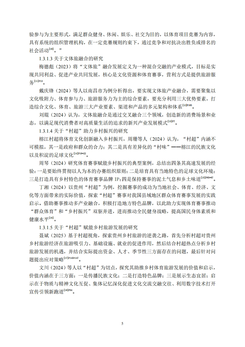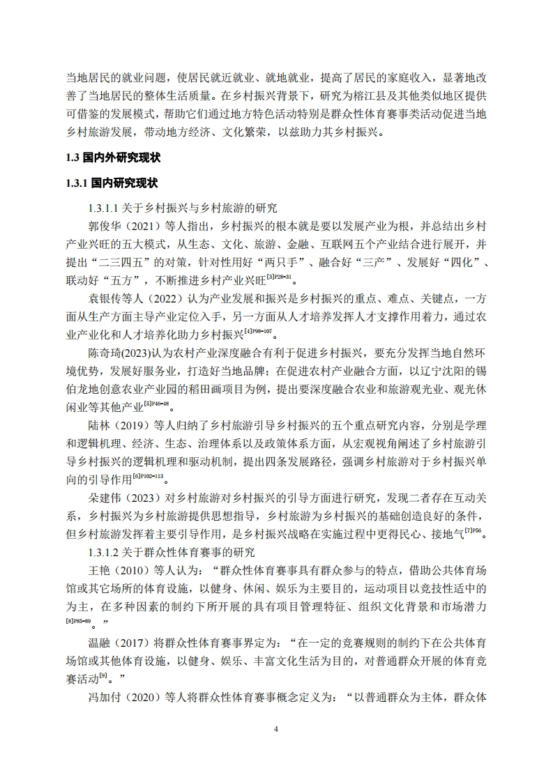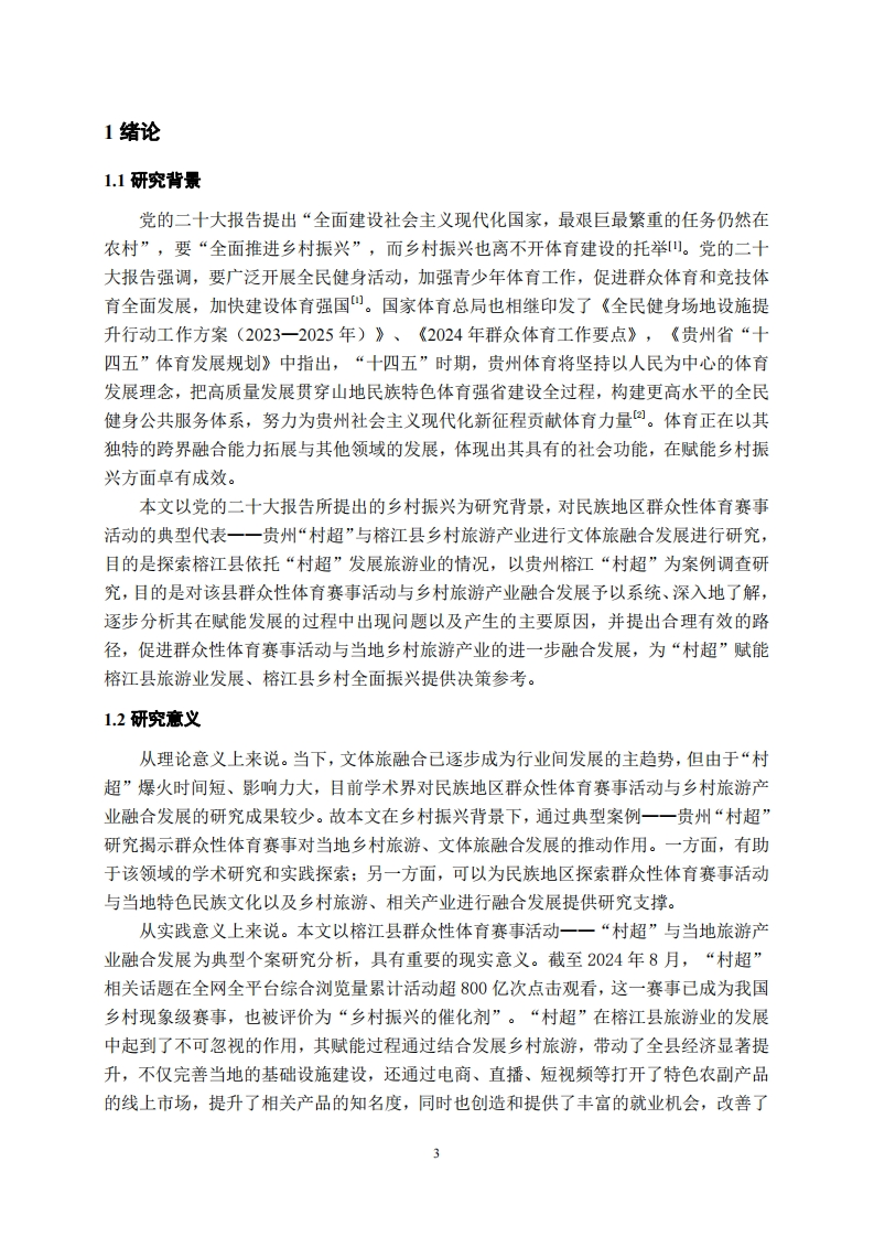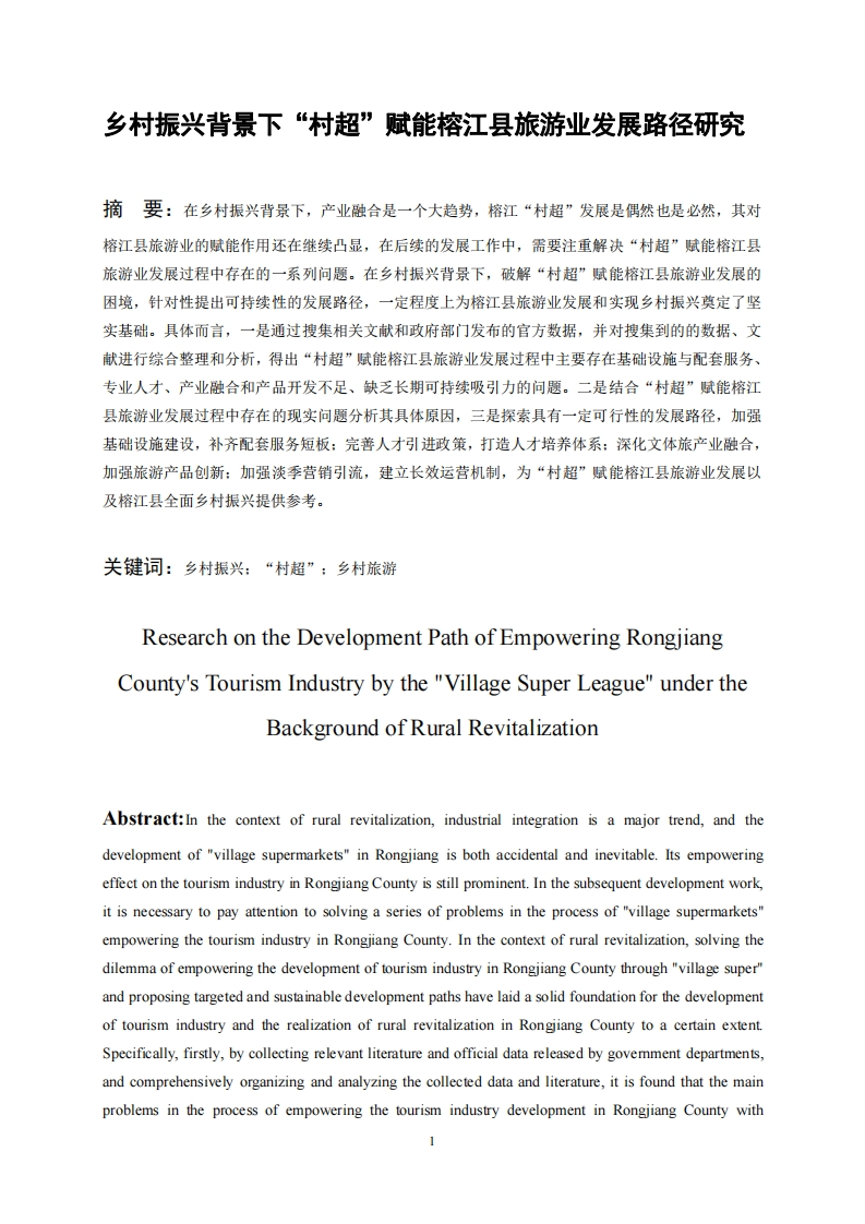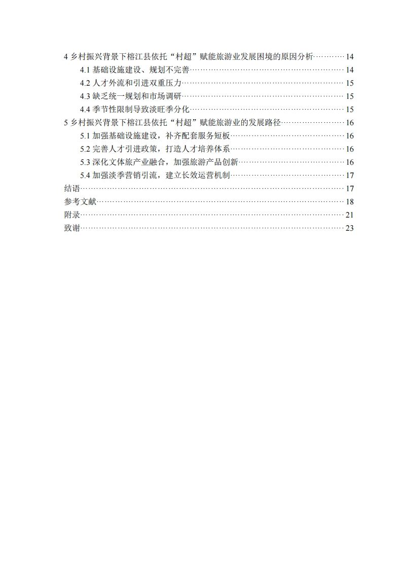目录摘要………………Abstract…………11绪论……31.1研究背景……31.2研究意义……………31.3国内外研究现状………41.3.1国内研究现状…41.3.2国外研究现状61.3.3研究现状评述.11.4研究方法……71.4.1文献研究法.11.4.2田野调查法…71.5相关概念界定和理论基础…81.5.1相关概念界定……81.52理论基础……………82榕江县依托“村超”赋能旅游业发展的现状、具体做法及成效92.1榕江县依托“村超”赋能旅游业发展的现状……………………92.1.1榕江县基本情况……92.1.2榕江县“村超”和旅游业基本情况……1022榕江县依托“村超”赋能旅游业发展的具体做法102.2.1历史沉淀传递健康精神…102.2.2农家腊味助阵乡风体验……102.2.3全媒体助推赛事传媒102.2.4文体旅搭建融合舞台…112.3榕江县依托“村超”赋能旅游业发展取得的成效112.3.1提升榕江“村超”知名度……112.3.2增加旅游服务业经济效益2.3.3推动民风民俗的宣传113乡村振兴背景下榕江县依托“村超”赋能旅游业发展的困境123.1基础设施与配套服务存在短板…………23.2专业人才匮乏…133.3产业融合与产品开发薄弱133.4缺乏常态化运营机制…………144乡村振兴背景下榕江县依托“村超”赋能旅游业发展困境的原因分析…144.1基础设施建设、规划不完善…144.2人才外流和引进双重压力………154.3缺乏统一规划和市场调研…154.4季节性限制导致淡旺季分化…55乡村振兴背景下榕江县依托“村超”赋能旅游业的发展路径165.1加强基础设施建设,补齐配套服务短板…1652完善人才引进政策,打造人才培养体系……………165.3深化文体旅产业融合,加强旅游产品创新…165.4加强淡季营销引流,建立长效运营机制…17结语……17参考文献…18附录…21致谢…23乡村振兴背景下“村超”赋能榕江县旅游业发展路径研究摘要:在乡村振兴背景下,产业融合是一个大趋势,榕江“村超”发展是偶然也是必然,其对榕江县旅游业的赋能作用还在继续凸显,在后续的发展工作中,需要注重解决“村超”赋能榕江县旅游业发展过程中存在的一系列问题。在乡村振兴背景下,破解“村超”赋能榕江县旅游业发展的困境,针对性提出可持续性的发展路径,一定程度上为榕江县旅游业发展和实现乡村振兴莫定了坚实基础。具体而言,一是通过搜集相关文献和政府部门发布的官方数据,并对搜集到的的数据、文献进行综合整理和分析,得出“村超”赋能榕江县旅游业发展过程中主要存在基础设施与配套服务、专业人才、产业融合和产品开发不足、缺乏长期可持续吸引力的问题。二是结合“村超”赋能榕江县旅游业发展过程中存在的现实问题分析其具体原因,三是探索具有一定可行性的发展路径,加强基础设施建设,补齐配套服务短板:完善人才引进政策,打造人才培养体系:深化文体旅产业融合,加强旅游产品创新:加强淡季营销引流,建立长效运营机制,为“村超”赋能榕江县旅游业发展以及榕江县全面乡村振兴提供参考。关键词:乡村振兴:“村超”:乡村旅游Research on the Development Path of Empowering RongjiangCounty's Tourism Industry by the "Village Super League"under theBackground of Rural RevitalizationAbstract:In the context of rural revitalization,industrial integration is a major trend,and thedevelopment of "village supermarkets"in Rongjiang is both accidental and inevitable.Its empoweringeffect on the tourism industry in Rongjiang County is still prominent.In the subsequent development work,it is necessary to pay attention to solving a series of problems in the process of "village supermarkets"empowering the tourism industry in Rongjiang County.In the context of rural revitalization,solving thedilemma of empowering the development of tourism industry in Rongjiang County through"village super"and proposing targeted and sustainable development paths have laid a solid foundation for the developmentof tourism industry and the realization of rural revitalization in Rongjiang County to a certain extent.Specifically,firstly,by collecting relevant literature and official data released by govemment departments,and comprehensively organizing and analyzing the collected data and literature,it is found that the mainproblems in the process of empowering the tourism industry development in Rongjiang County with1"village supermarkets"are insufficient infrastructure and supporting services,professional talents,industrial integration and product development,and lack of long-term sustainable attractiveness.Thesecond is to analyze the specific reasons for the practical problems that exist in the process ofempoweringthe tourism industry in Rongjiang County with "village supermarkets".The third is to explore feasibledevelopment paths,strengthen