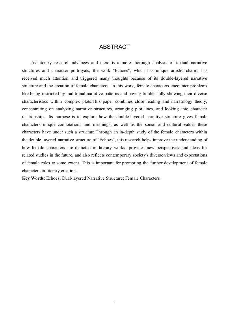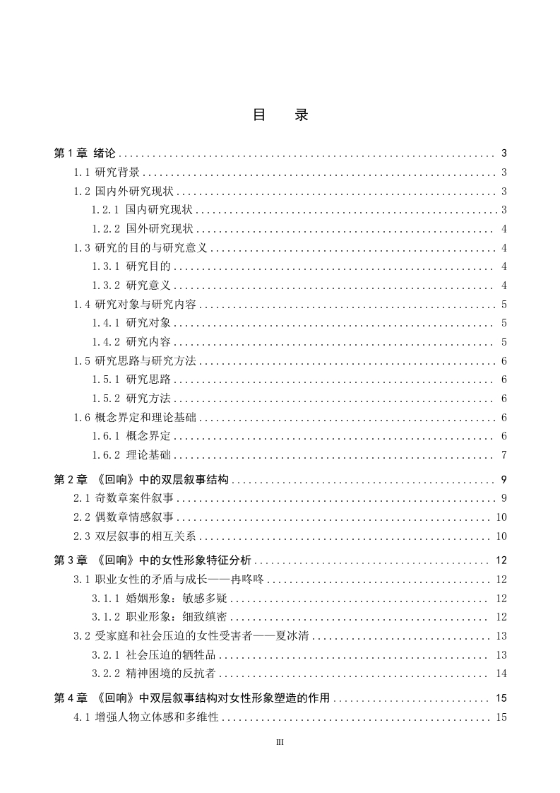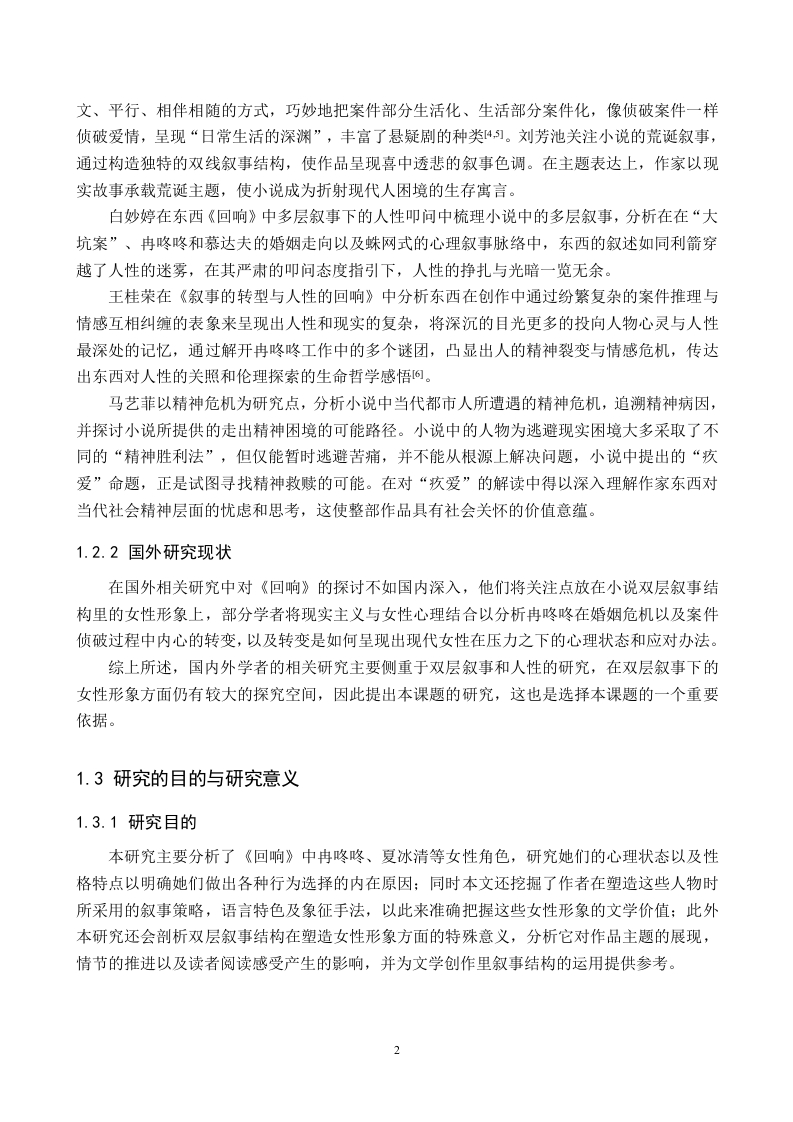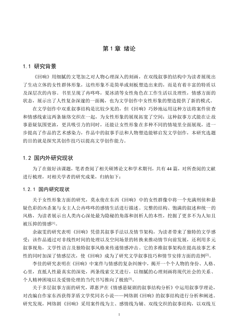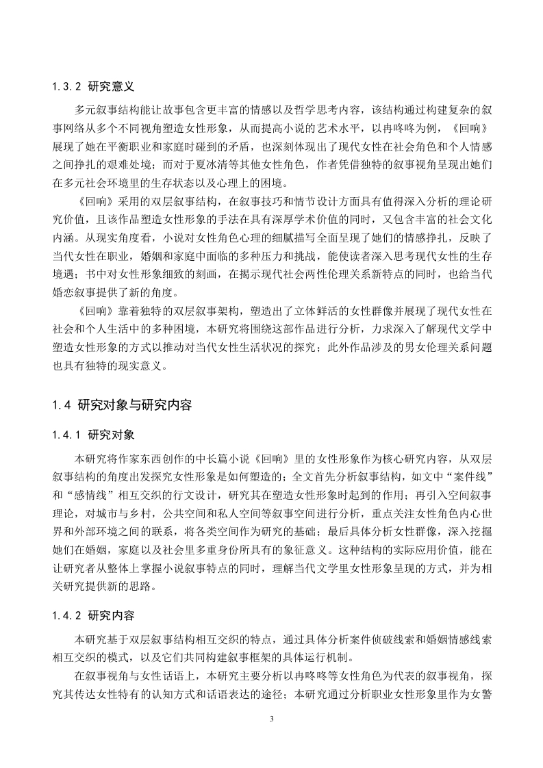 《回响》中双层叙事下的女性形象研究摘要在当今文学研究领域不断发展且对文本叙事结构及人物形象分析日益深入的大环境下,《回响》作为一部具有独特艺术魅力的作品,其双层叙事结构下的女性形象塑造引发了诸多关注和思考,该作品中女性形象面临着被传统叙事模式束缚以及在复杂情节中难以充分展现自身多元特质等问题。本文运用文本分析法与叙事学理论相结合的方法,从叙事结构来拆解,对情节线索梳理以及对人物关系分析等多方面出发,重点探究双层叙事结构是如何赋予女性形象独特内涵的,分析在这种结构下女性形象所承载的社会文化价值。研究《回响》中双层叙事结构下的女性形象有助于今后文学作品对女性形象的塑造,为后续相关研究提供新的视角与思路,也能在一定程度上反映当代社会对女性角色的多元认知与期待,对推动文学创作中女性形象的进一步发展具有重要意义。关键词:《回响》;双层叙事结构;女性形象ABSTRACTAs literary research advances and there is a more thorough analysis of textual narrativestructures and character portrayals,the work "Echoes",which has unique artistic charm,hasreceived much attention and triggered many thoughts because of its double-layered narrativestructure and the creation of female characters.In this work,female characters encounter problemslike being restricted by traditional narrative patterns and having trouble fully showing their diversecharacteristics within complex plots.This paper combines close reading and narratology theory,concentrating on analyzing narrative structures,arranging plot lines,and looking into characterrelationships.Its purpose is to explore how the double-layered narrative structure gives femalecharacters unique connotations and meanings,as well as the social and cultural values thesecharacters have under such a structure.Through an in-depth study of the female characters withinthe double-layered narrative structure of "Echoes",this research helps improve the understanding ofhow female characters are depicted in literary works,provides new perspectives and ideas forrelated studies in the future,and also reflects contemporary society's diverse views and expectationsof female roles to some extent.This is important for promoting the further development of femalecharacters in literary creation.Key Words:Echoes;Dual-layered Narrative Structure;Female Characters目录第1章绪论.....1.1研究背景.31.2国内外研究现状1.2.1国内研究现状.....31.2.2国外研究现状...41.3研究的目的与研究意义41.3.1研究目的....41.3.2研究意义.....41.4研究对象与研究内容1.4.1研究对象....51.4.2研究内容....51.5研究思路与研究方法...61.5.1研究思路..61.5.2研究方法....61.6概念界定和理论基础61.6.1概念界定....·61.6.2理论基础.....7第2章《回响》中的双层叙事结构...92.1奇数章案件叙事..…92.2偶数章情感叙事......102.3双层叙事的相互关系.....10第3章《回响》中的女性形象特征分析..·123.1职业女性的矛盾与成长一一冉咚咚123.1.1婚姻形象:敏感多疑..·..123.1.2职业形象:细致缜密......123.2受家庭和社会压迫的女性受害者一一夏冰清.....·133.2.1社会压迫的牺牲品.…133.2.2精神困境的反抗者.…14第4章《回响》中双层叙事结构对女性形象塑造的作用154.1增强人物立体感和多维性.…154.1.1刑事叙事中的“理性权威”164.1.2婚姻叙事中的“感性失控”…154.2揭示女性内心的深层次矛盾与挣扎..164.2.1职业身份与性别角色的撕裂.·。164.2.2案件真相与婚姻真相的冲击....164.3促进女性形象的成长与蜕变........174.3.1从“被规训者”到“反凝视者”174.3.2从“社会角色扮演”到“真实自我觉醒”..........18结论.19参考文献......20致谢.…21v