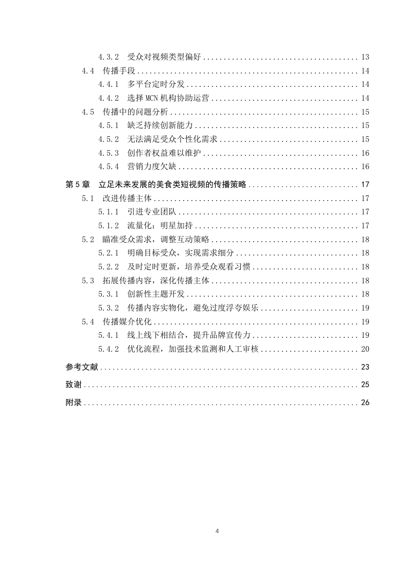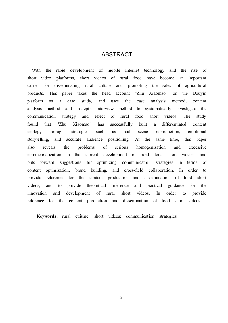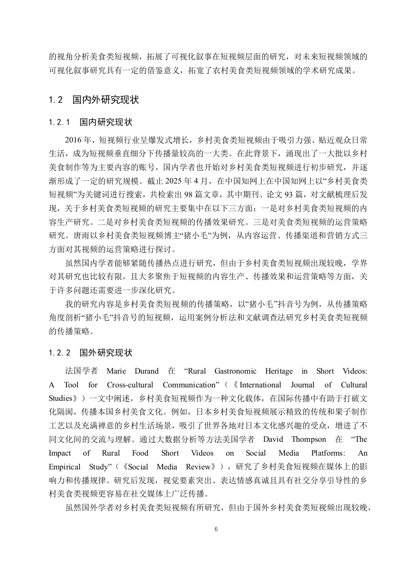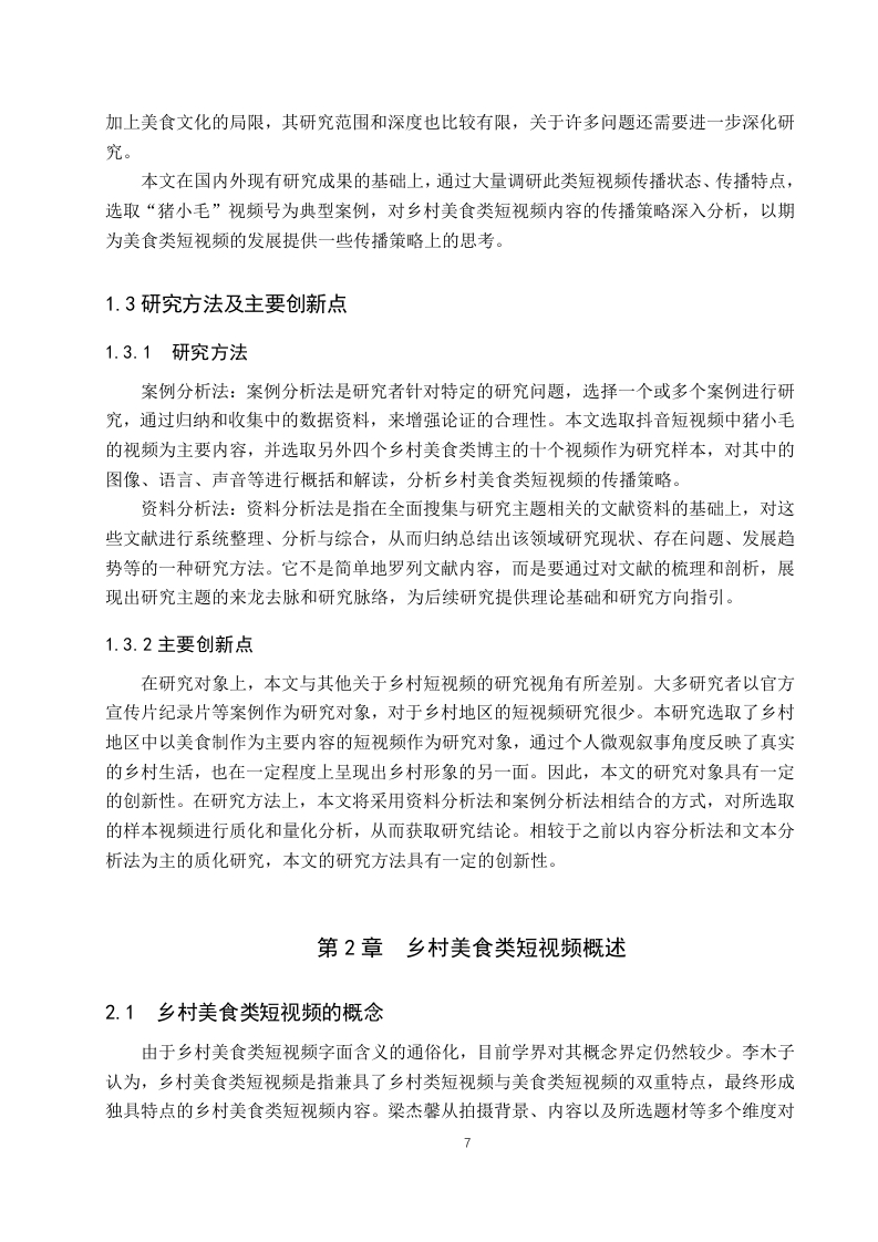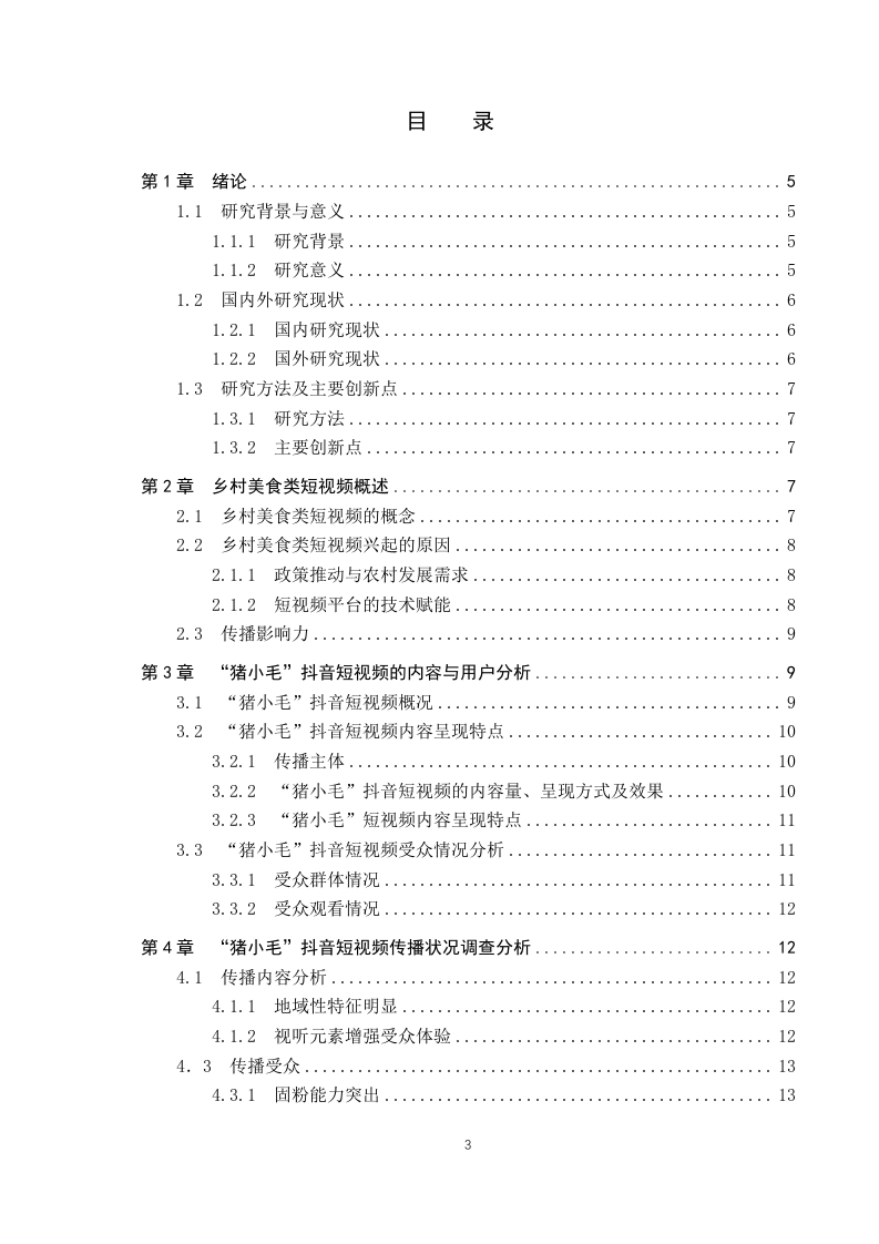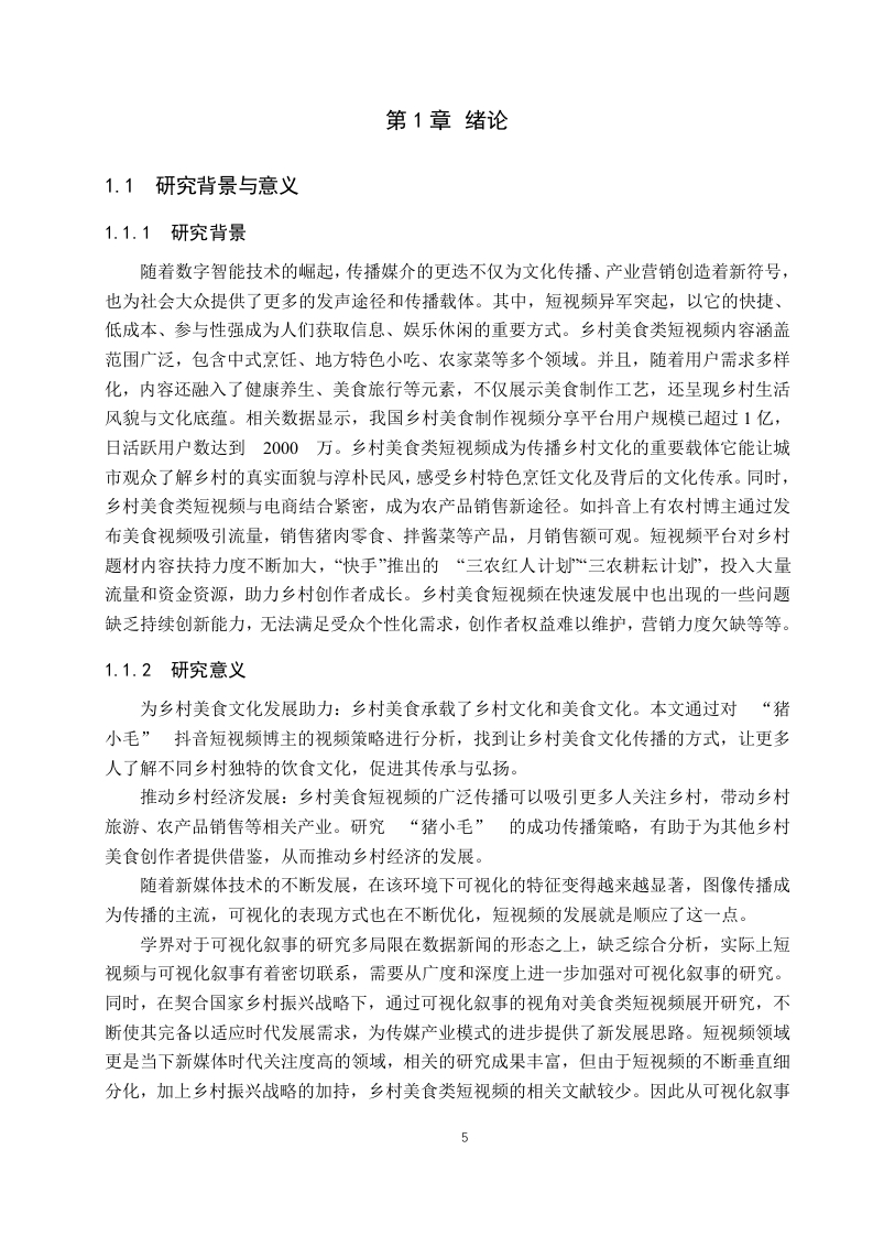 乡村美食类短视频的传播策略研究一一以“猪小毛”抖音号为例摘要随着移动互联网技术的快速发展和短视频平台的兴起,乡村美食类短视频已成为传播乡村文化、促进农产品销售的重要载体。本文以抖音平台账号“猪小毛”为研究案例,运用案例分析法、内容分析法和深度访谈法,系统考察了乡村美食类短视频的传播策略。研究发现,“猪小毛”通过真实场景再现、情感化叙事和精准受众定位等策略,成功构建了差异化内容生态。同时,本文也揭示了当前乡村美食类短视频发展中存在的同质化严重、商业化过度等问题,并在内容优化、品牌建设、跨领域协同合作等方面提出了优化传播策略的建议。以期能为美食类短视频的内容生产和传播提供借鉴和参考,同时为乡村类短视频的创新发展提供理论参考和实践指导,为美食类短视频的内容生产和传播提供借鉴和参考。关键词:乡村美食:短视频:传播策略1ABSTRACTWith the rapid development of mobile Internet technology and the rise ofshort video platforms,short videos of rural food have become animportantcarrier for disseminating rural culture and promoting the sales of agriculturalproducts.This paper takes the head account "Zhu Xiaomao"on the Douyinplatform as a case study,and uses the case analysis method,contentanalysis method and in-depth interview method to systematically investigate thecommunication strategy and effect of rural food short videos.The studyfound that"Zhu Xiaomao”has successfully built adifferentiatedcontentecologythrough strategies such as real scene reproduction.emotionalstorytelling,and accurate audience positioning.At the same time,this paperalsoreveals the problemsof serious homogenizationandexcessivecommercialization in the current development of rural food short videos,andputs forward suggestions for optimizing communication strategies in terms ofcontentoptimization,brand building,and cross-field collaboration.In order toprovide reference for the content production and dissemination of food shortvideos,and to provide theoretical reference and practical guidance for theinnovation and development of rural short videos.In order to providereference for the content production and dissemination of food short videos.Keywords:rural cuisine;short videos;communication strategies2目录第1章绪论...51.1研究背景与意义..1.1.1研究背景...51.1.2研究意义...1.2国内外研究现状....61.2.1国内研究现状..1.2.2国外研究现状..61.3研究方法及主要创新点..71.3.1研究方法...71.3.2主要创新点...7第2章乡村美食类短视频概述..·2.1乡村美食类短视频的概念...0…72.2乡村美食类短视频兴起的原因........82.1.1政策推动与农村发展需求..…82.1.2短视频平台的技术赋能...。.82.3传播影响力........……9第3章“猪小毛”抖音短视频的内容与用户分析.93.1“猪小毛”抖音短视频概况...................93.2“猪小毛”抖音短视频内容呈现特点...............103.2.1传播主体.103.2.2“猪小毛”抖音短视频的内容量、呈现方式及效果......103.2.3“猪小毛”短视频内容呈现特点..113.3“猪小毛”抖音短视频受众情况分析..·113.3.1受众群体情况.…113.3.2受众观看情况.....12第4章“猪小毛”抖音短视频传播状况调查分析.…124.1传播内容分析.........124.1.1地域性特征明显.......124.1.2视听元素增强受众体验.……124.3传播受众..….134.3.1固粉能力突出.........1334.3.2受众对视频类型偏好....134.4传播手段.......144.4.1多平台定时分发...144.4.2选择MCN机构协助运营...144.5传播中的问题分析........154.5.1缺乏持续创新能力...1545.2无法满足受众个性化需求.…154.5.3创作者权益难以维护..................164.5.4营销力度欠缺..16第5章立足未来发展的美食类短视频的传播策略.…·175.1改进传播主体..175.1.1引进专业团队....175.1.2流量化:明星加持..175.2瞄准受众需求,调整互动策略.....185.2.1明确目标受众,实现需求细分...............185.2.2及时定时更新,培养受众观看习惯..185.3拓展传播内容,深化传播主体.......185.3.1创新性主题开发..185.3.2传播内容实物化,避免过度浮夸娱乐..·195.4传播媒介优化......195.4.1线上线下相结合,提升品牌宣传力............195.4.2优化流程,加强技术监测和人工审核.............20参考文献..23致谢.…25附录..264