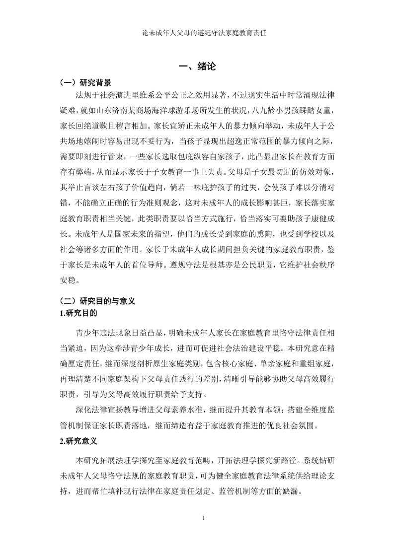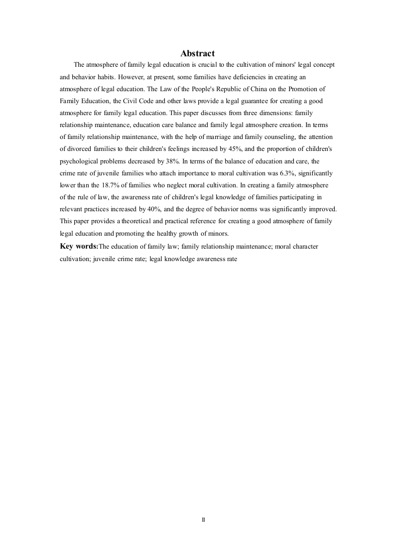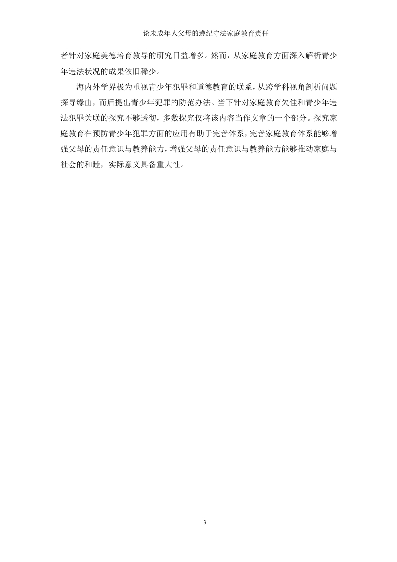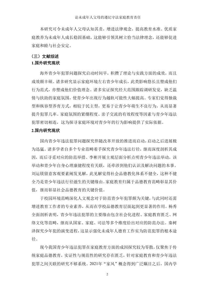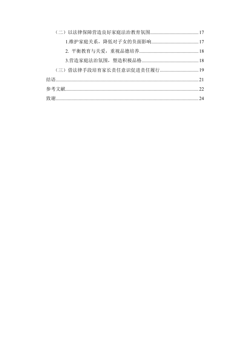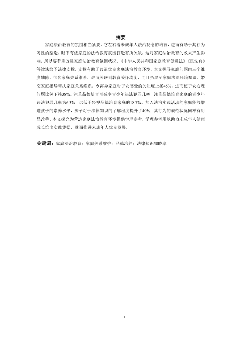 目录摘要Abstract.…一、绪论.(一)研究背景。(二)研究目的与意义.1.研究目的2.研究意义…(三)文献综述…21.国外研究现状.22.国内研究现状..2二、未成年人父母的遵纪守法家庭教育责任的法律基础.4(一)遵纪守法家庭教育责任的法律相关概念.4(二)遵纪守法家庭教育责任的法律基础教育.5三、未成年人父母遵纪守法家庭教育责任的现行履行状况剖析5(一)基于法律视角的家庭冲突问题诊断6(二)从法律要求出发强化家长情绪控制能力7(三)依据法律规范纠正家庭不良沟通模式.8四、未成年人父母遵纪守法家庭教育责任履行所遇困境探究.9(一)不同家庭结构衍生的责任履行困境.9(二)基于法律规定的家庭亲子关系恶化困境分析10(三)法律视野中家庭沟通方法失当困境解析11五、未成年人父母的遵纪守法家庭教育责任履行困境的原因13(一)法律规制下家庭结构残缺对责任履行的影响.13(二)从监护法律责任看家庭监护缺位问题14(三)基于法律标准的家庭教养不当成因剖析.15六、未成年人父母的遵纪守法家庭教育责任履行的优化路径…16(一)依法律指引提升家长素质与责任履行能力.16(二)以法律保障营造良好家庭法治教育氛围171.维护家庭关系,降低对子女的负面影响.172.平衡教育与关爱,重视品德培养..183营造家庭法治氛围,塑造积极品格.18(三)借法律手段培育家长责任意识促进责任履行.19结语2]参考文献22致谢….24摘要家庭法治教育的氛围相当紧要,它左右着未成年人法治观念的培育,进而有助于其行为习性的塑造。眼下有些家庭的法治教育氛围打造有所欠缺,这对家庭法治教育的效果产生影响,所以要着重改进家庭法治教育氛围状况。《中华人民共和国家庭教育促进法》《民法典》等律法给予法律支撑,支撑有助于营造优良家庭法治教育环境。本文探寻家庭问题由三个维度铺陈,包含家庭关系维系,进而关联到教育关怀均衡,而且拓展至家庭法治环境塑造。婚恋家庭指导帮扶家庭关系维系,令离异家庭对子女感受的关注度上扬45%,进而使子女心理问题比例下挫38%。注重品德培育可减少青少年违法犯罪几率,注重品德培育家庭的青少年违法犯罪几率为63%,远低于轻视品德培育家庭的18.7%。加入法治实践活动的家庭能够增进孩子的素养水平,孩子对于法律知识的了解程度提升了40%,其行为的规范状况同样有明显改善。本文探究为营造家庭法治教育环境提供学理参考,学理参考用以助力未成年人健康成长给出实践凭据,继而推进未成年人优良发展。关键词:家庭法治教育:家庭关系维护:品德培养:法律知识知晓率AbstractThe atmosphere of family legal education is crucial to the cultivation of minors'legal conceptand behavior habits.However,at present,some families have deficiencies in creating anatmosphere of legal education.The Law of the People's Republic of China on the Promotion ofFamily Education,the Civil Code and other laws provide a legal guarantee for creating a goodatmosphere for family legal education.This paper discusses from three dimensions:familyrelationship maintenance,education care balance and family legal atmosphere creation.In termsof family relationship maintenance,with the help of marriage and family counseling,the attentionof divorced families to their children's feelings increased by 45%,and the proportion of children'spsychological problems decreased by 38%.In terms of the balance of education and care,thecrime rate of juvenile families who attach importance to moral cultivation was 6.3%,significantlylower than the 18.7%of families who neglect moral cultivation.In creating a family atmosphereof the rule of law,the awareness rate of children's legal knowledge of families participating inrelevant practices increased by 40%,and the degree of behavior norms was significantly improved.This paper provides a theoretical and practical reference for creating a good atmosphere of familylegal education and promoting the healthy growth of minors.Key words:The education of family law;family relationship maintenance;moral charactercultivation;juvenile crime rate;legal knowledge awareness rate