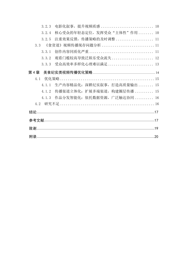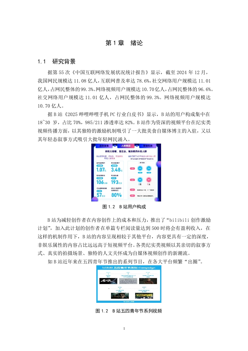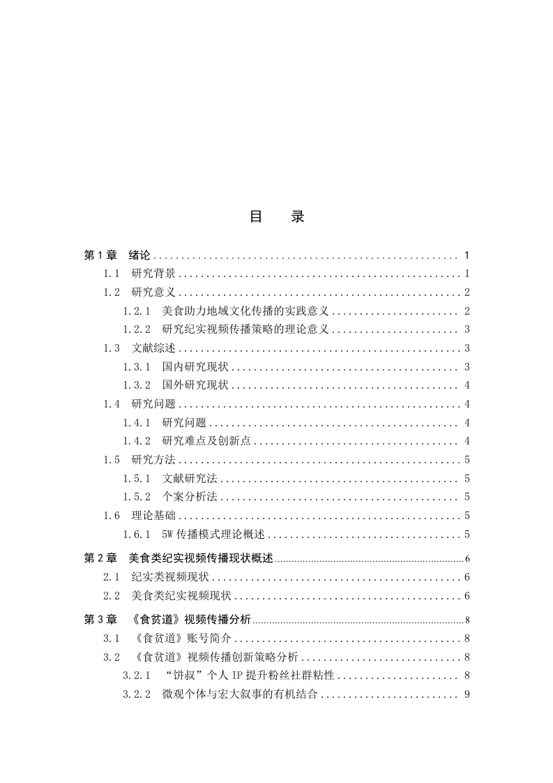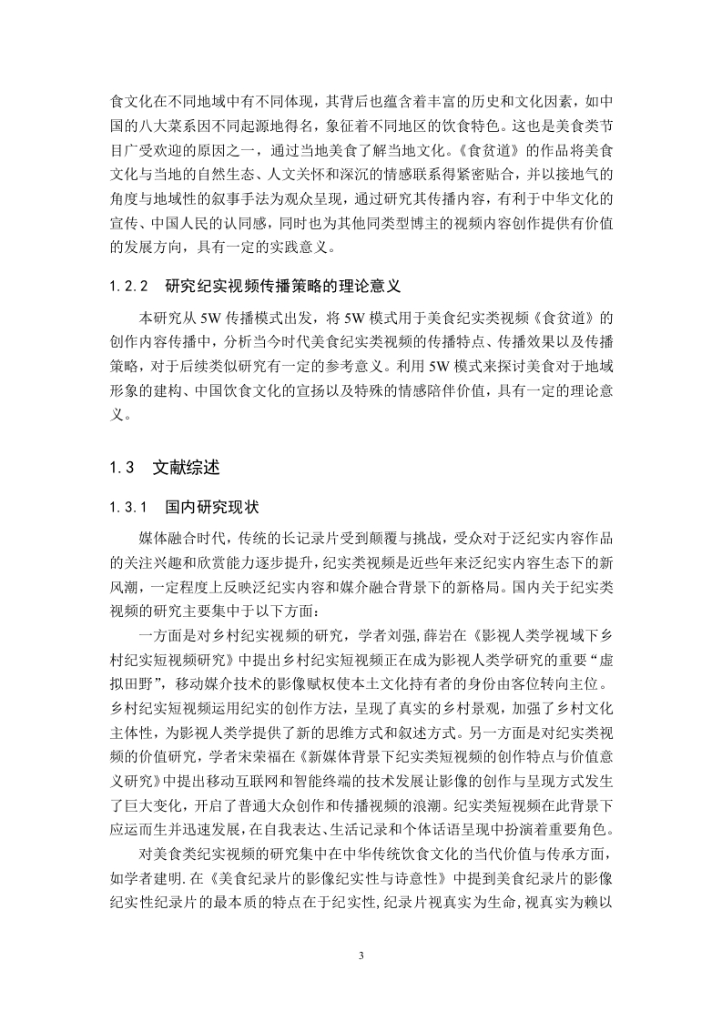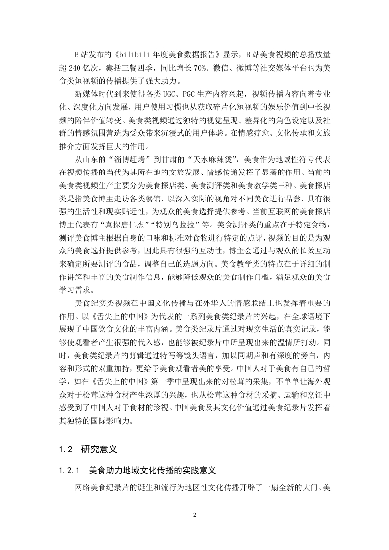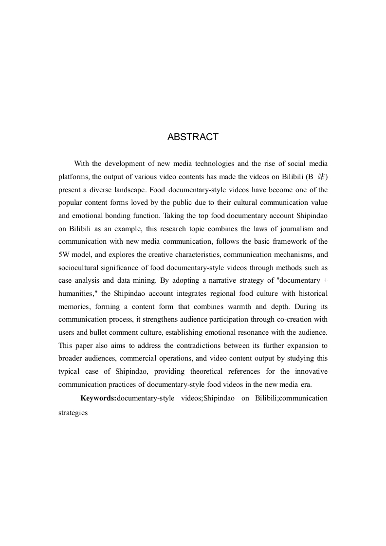美食纪实类视频传播策略研究一以B站食贫道为例摘要随着新媒体技术发展以及社交媒体平台的兴起,各式各样的视频内容输出使得B站视频呈现多样态,美食纪实类视频凭借其文化传播价值以及情感联结功能成为大众喜爱观看的内容形式之一。本选题以哔哩哔哩头部美食纪实类账号《食贫道》为例,结合新闻传播学以及新媒体传播规律,以5W框架为基本遵循,通过案例分析、数据挖掘等方法,探讨美食纪实类视频的创作特征、传播机制与社会文化意义。《食贫道》账号通过“纪实+人文”的叙事策略,将地域饮食文化与历史记忆融合,形成了兼具温度和深度的内容形态,其传播过程中通过与用户共创及弹幕文化强化了受众参与感,与用户之间形成情感共鸣。本论文也旨在通过研究《食贫道》这一典型案例,尝试解决其在进一步出圈、商业化运作与视频内容输出之间的矛盾,为新媒体时代纪实类美食视频传播实践创新提供理论参考。关键词:纪实类视频:B站《食贫道》:传播策略ABSTRACTWith the development of new media technologies and the rise of social mediaplatforms,the output of various video contents has made the videos on Bilibili (B)present a diverse landscape.Food documentary-style videos have become one of thepopular content forms loved by the public due to their cultural communication valueand emotional bonding function.Taking the top food documentary account Shipindaoon Bilibili as an example,this research topic combines the laws of journalism andcommunication with new media communication,follows the basic framework of the5W model,and explores the creative characteristics,communication mechanisms,andsociocultural significance of food documentary-style videos through methods such ascase analysis and data mining.By adopting a narrative strategy of "documentary+humanities,"the Shipindao account integrates regional food culture with historicalmemories,forming a content form that combines warmth and depth.During itscommunication process,it strengthens audience participation through co-creation withusers and bullet comment culture,establishing emotional resonance with the audience.This paper also aims to address the contradictions between its further expansion tobroader audiences,commercial operations,and video content output by studying thistypical case of Shipindao,providing theoretical references for the innovativecommunication practices of documentary-style food videos in the new media era.Keywords:documentary-style videos;Shipindao on Bilibili;communicationstrategies目录第1章绪论.……11.1研究背景1.2研究意义..21.2.1美食助力地域文化传播的实践意义..21.2.2研究纪实视频传播策略的理论意义…31.3文献综述.31.3.1国内研究现状....31.3.2国外研究现状...41.4研究问题...1.4.1研究问题...1.4.2研究难点及创新点...1.5研究方法.....。…51.5.1文献研究法....51.5.2个案分析法.......51.6理论基础...….·51.6.15W传播模式理论概述第2章美食类纪实视频传播现状概述.62.1纪实类视频现状....2.2美食类纪实视频现状....第3章《食贫道》视频传播分析83.1《食贫道》账号简介..………83.2《食贫道》视频传播创新策略分析.......·.83.2.1“饼叔”个人IP提升粉丝社群粘性.·83.2.2微观个体与宏大叙事的有机结合.…93.2.3电影化叙事,提升视频质感....……103.2.4核心受众的年轻态定位,发挥受众“主体性”作用....103.2.5注重效果反馈,传播策略的及时调整..........113.3《食贫道》视频传播现存问题分析........113.3.1创作内容同质化严重.…113.3.2观看门槛较高导致泛娱乐受众流失......。123.3.3受众高效率多样化心理难以满足.·13第4章美食纪实类视频传播优化策略.144.1优化策略..154.1.1生产内容精品化:深耕纪实叙事,打造高质量输出....·154.1.2传播渠道立体化:扩展多端渠道,构建圈层传播.…154.1.3作品分发智能化:依托数据资源,广泛触达协同......164.2研究不足.…16结论.17参考文献.17致谢19附录.20