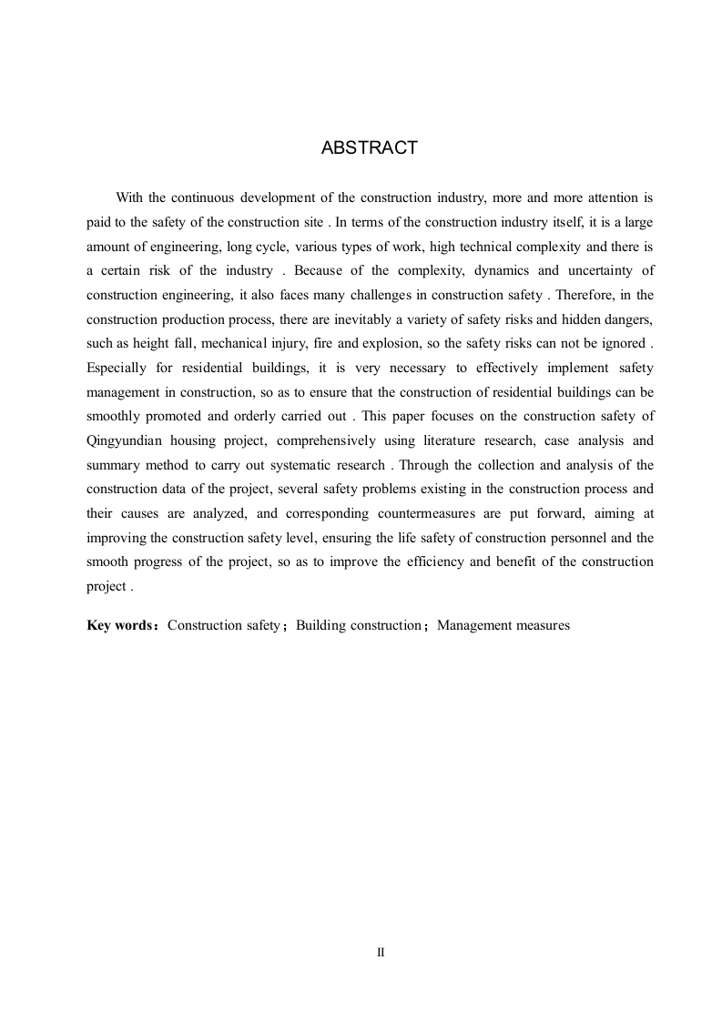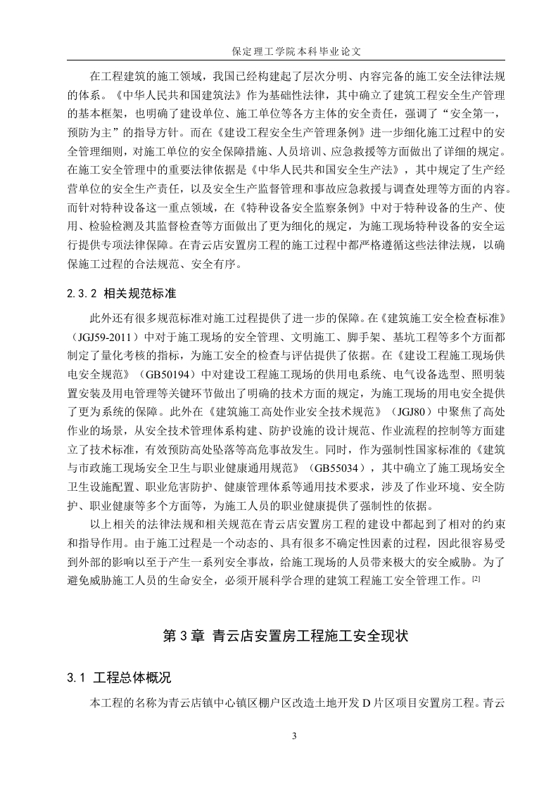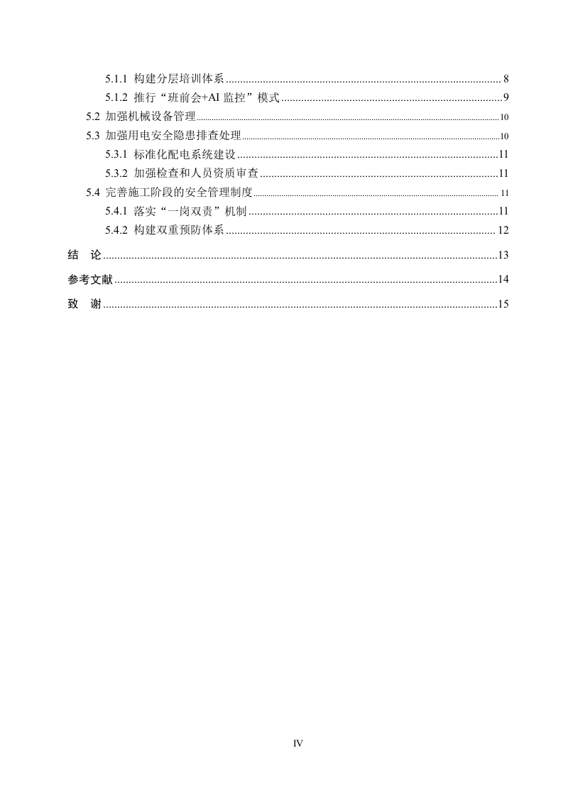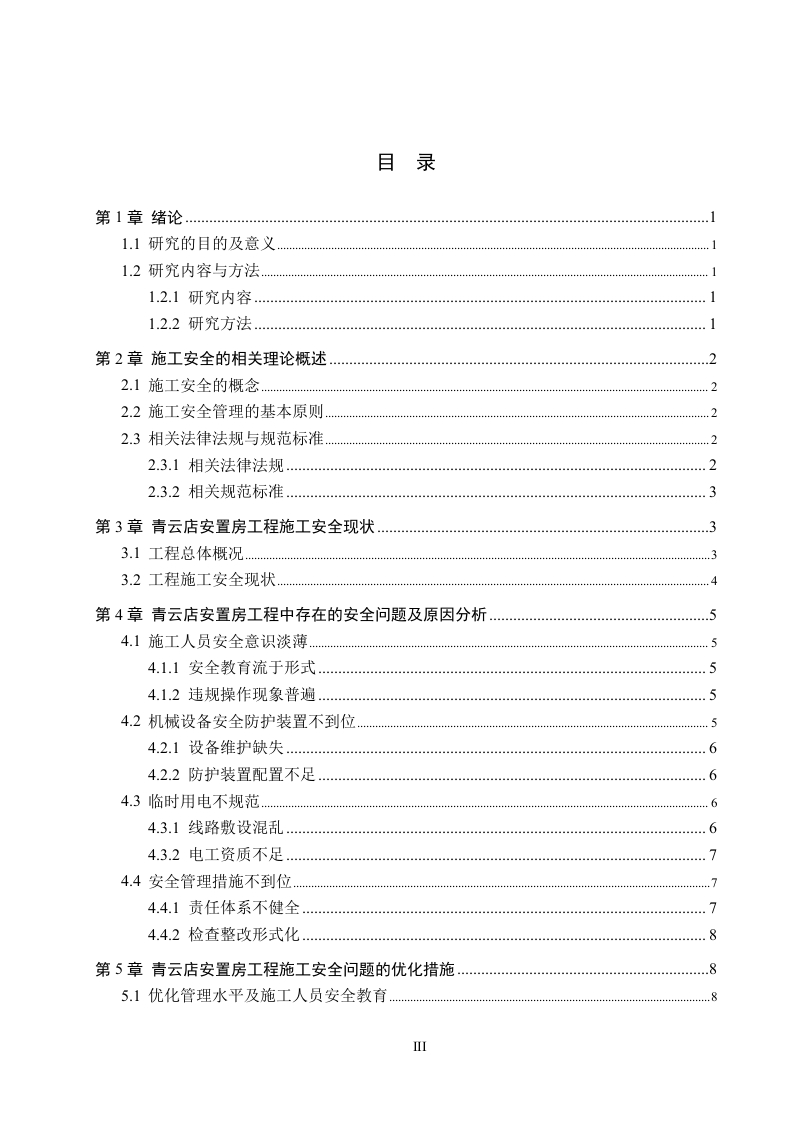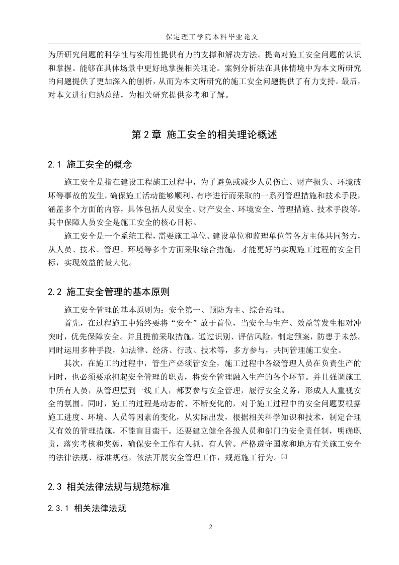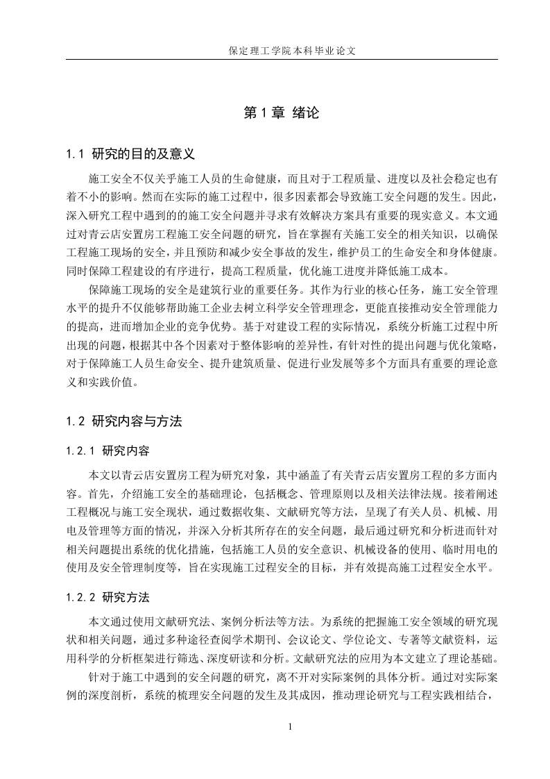 青云店安置房工程施工安全问题研究摘要随着建筑行业的不断发展,对于施工现场的安全状况也越来越重视。就建筑行业本身来讲,它就是一个工程量大、周期长、工种繁多、技术复杂度高且存在一定危险性的行业。由于建筑工程的复杂性、动态性及不确定性,在施工安全方面也面临诸多挑战。因此在建筑生产过程中,就不可避免地存在着各种安全风险和隐患,例如高处坠落、机械伤害、火灾爆炸等,因此安全风险不容忽视。尤其是对于住宅建筑来说,在建筑施工中有效落实安全管理是十分有必要的,这样才可以确保住宅建筑施工的工作能够顺利推进、有序开展。本论文聚焦于青云店安置房工程施工安全问题,综合使用文献研究法、案例分析法及归纳总结法进行展开系统研究。通过对该工程施工数据的收集与分析,剖析了施工过程中存在的几种安全问题及其成因,并相应提出了针对性的解决策略,旨在提升工程施工安全水平,保障施工人员的生命安全与工程的顺利推进,以提高建设工程的效率和效益。关键词:施工安全;建筑施工;管理措施ABSTRACTWith the continuous development of the construction industry,more and more attention ispaid to the safety of the construction site.In terms of the construction industry itself,it is a largeamount of engineering,long cycle,various types of work,high technical complexity and there isa certain risk of the industry.Because of the complexity,dynamics and uncertainty ofconstruction engineering,it also faces many challenges in construction safety.Therefore,in theconstruction production process,there are inevitably a variety of safety risks and hidden dangers,such as height fall,mechanical injury,fire and explosion,so the safety risks can not be ignored.Especially for residential buildings,it is very necessary to effectively implement safetymanagement in construction,so as to ensure that the construction of residential buildings can besmoothly promoted and orderly carried out.This paper focuses on the construction safety ofQingyundian housing project,comprehensively using literature research,case analysis andsummary method to carry out systematic research.Through the collection and analysis of theconstruction data of the project,several safety problems existing in the construction process andtheir causes are analyzed,and corresponding countermeasures are put forward,aiming atimproving the construction safety level,ensuring the life safety of construction personnel and thesmooth progress of the project,so as to improve the efficiency and benefit of the constructionproject.Key words:Construction safety;Building construction;Management measures目录第1章绪论1.1研究的目的及意义1.2研究内容与方法…。1.2.1研究内容.…1.2.2研究方法.第2章施工安全的相关理论概述22.1施工安全的概念.22.2施工安全管理的基本原则,22.3相关法律法规与规范标准,…223.1相关法律法规….22.3.2相关规范标准…。.3第3章青云店安置房工程施工安全现状.33.】工程总体概况….33.2工程施工安全现状.……4第4章青云店安置房工程中存在的安全问题及原因分析.54.1施工人员安全意识淡薄.54.1.1安全教育流于形式.4.1.2违规操作现象普遍.54.2机械设备安全防护装置不到位.54.2.1设备维护缺失….64.2.2防护装置配置不足.64.3临时用电不规范.64.3.1线路敷设混乱..64.3.2电工资质不足.74.4安全管理措施不到位.74.4.1责任体系不健全….74.4.2检查整改形式化….8第5章青云店安置房工程施工安全问题的优化措施85.1优化管理水平及施工人员安全教育..85.1.1构建分层培训体系.85.1.2推行“班前会十AI监控”模式95.2加强机械设备管理.…105.3加强用电安全隐患排查处理…105.3.1标准化配电系统建设…5.3.2加强检查和人员资质审查.15.4完善施工阶段的安全管理制度5.4.1落实“一岗双责”机制.…115.4.2构建双重预防体系.12结论.….13参考文献14致谢.15IV
