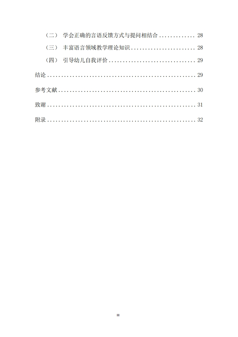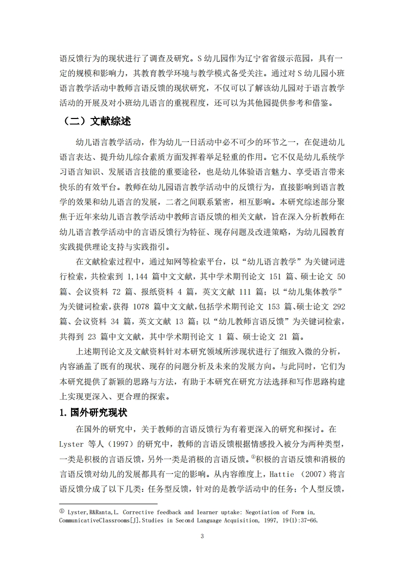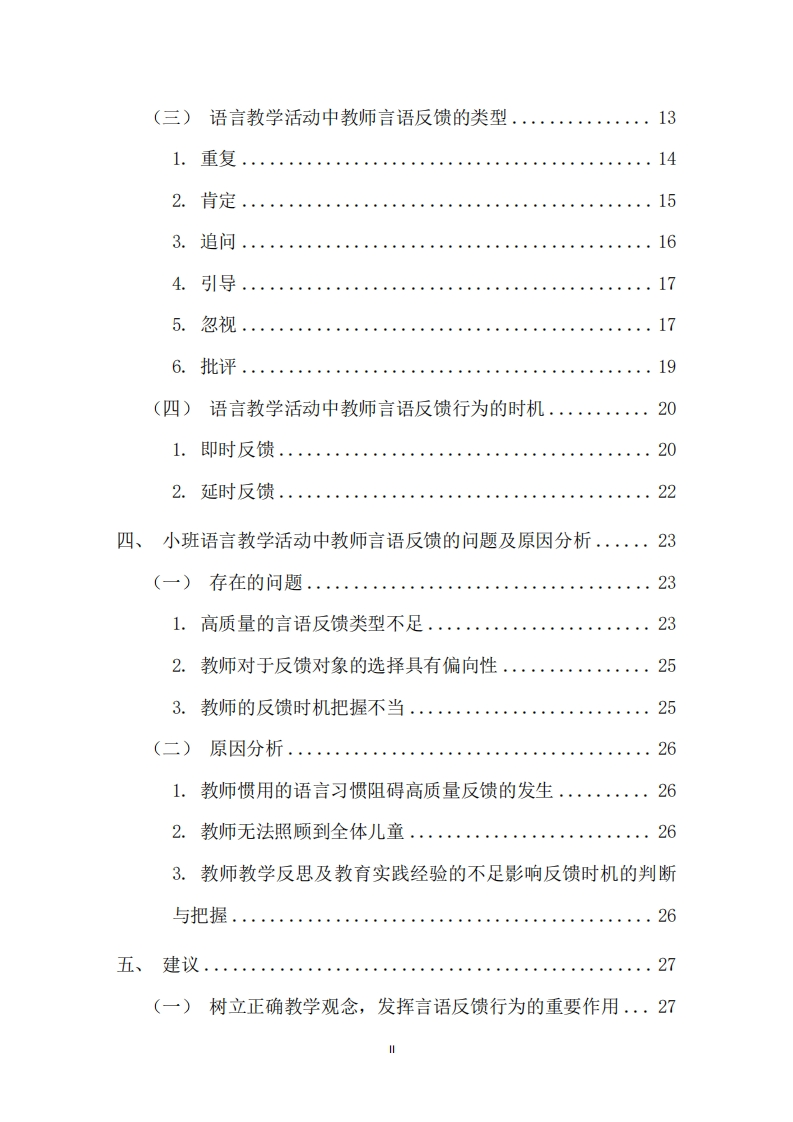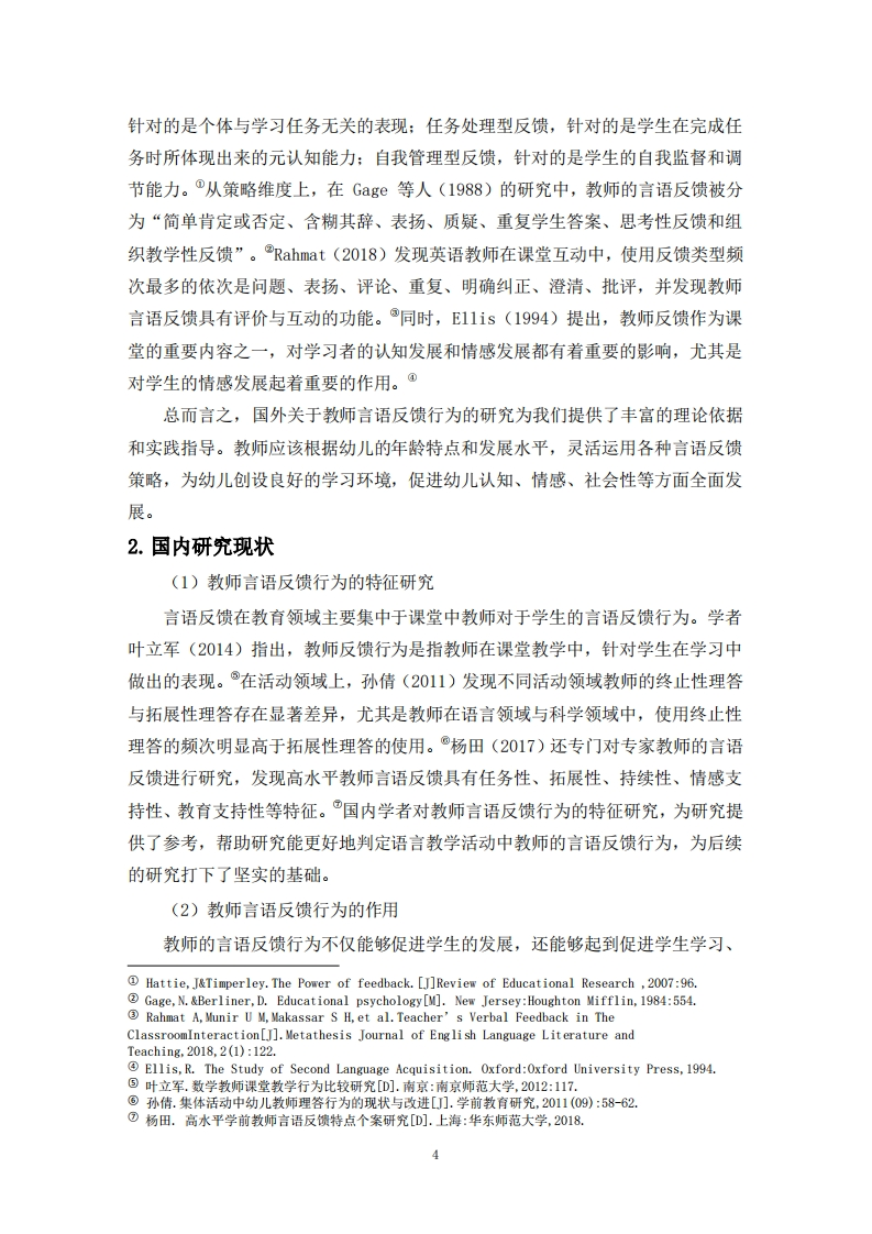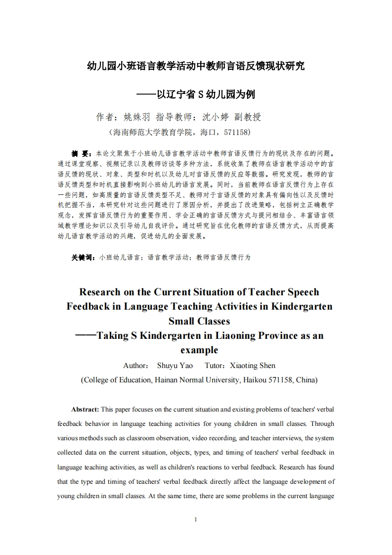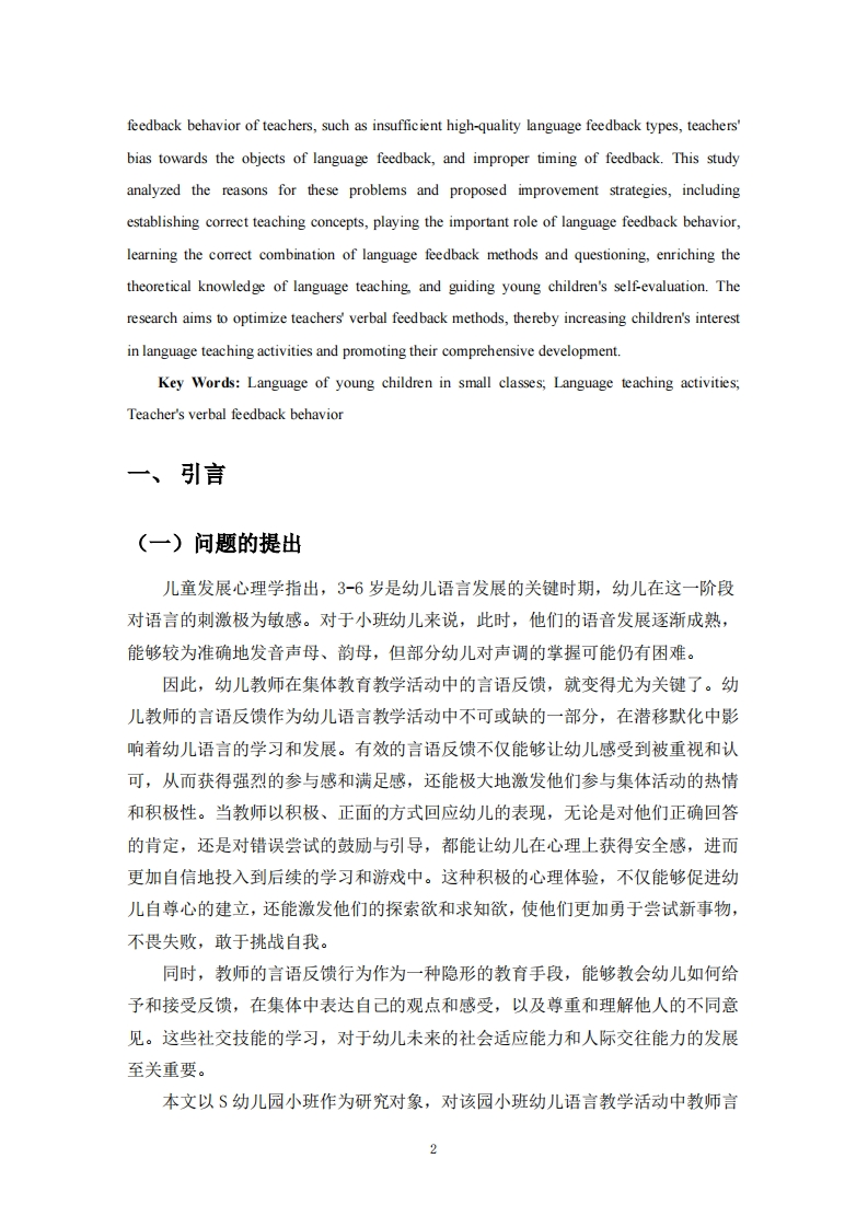 目录一、引言………(一)问题的提出......2(二)文献综述.......31.国外研究现状....P2.国内研究现状.………………3(三)研究目的及意义...51.研究目的...52.研究意义....6(四)概念界定(1)语言教学活动..。6(2)教师言语反馈...二、研究设计..···(一)研究对象......8(二)研究方法....·1.文献法....2.观察法...……3.访谈法.………………三、S幼儿园小班语言教学活动中教师言语反馈的现状..·.10(一)语言教学活动开展状况.…………………10(二)语言教学活动中教师言语反馈行为的对象.....·12(三)语言教学活动中教师言语反馈的类型.......·131.重复.…142.肯定.153.追问…164.引导....175.忽视...176.批评..19(四)语言教学活动中教师言语反馈行为的时机.........201.即时反馈.......202.延时反馈………22四、小班语言教学活动中教师言语反馈的问题及原因分析.···23(一)存在的问题.……231.高质量的言语反馈类型不足............232.教师对于反馈对象的选择具有偏向性......253.教师的反馈时机把握不当...................25(二)原因分析……261.教师惯用的语言习惯阻碍高质量反馈的发生.....262.教师无法照顾到全体儿童.……263.教师教学反思及教育实践经验的不足影响反馈时机的判断与把握....26五、建议.27(一)树立正确教学观念,发挥言语反馈行为的重要作用.·27(二)学会正确的言语反馈方式与提问相结合......28(三)丰富语言领域教学理论知识.…..…28(四)引导幼儿自我评价............29结论.….......29参考文献.30致谢.…..31附录.。·.32幼儿园小班语言教学活动中教师言语反馈现状研究一以辽宁省S幼儿园为例作者:姚姝羽指导教师:沈小婷副教授(海南师范大学教育学院,海口,571158)捕要:本论文聚焦于小班幼儿语言教学活动中教师言语反馈行为的现状及存在的问题。通过课堂观察、视频记录以及教师访谈等多种方法,系统收集了教师在语言教学活动中的言语反馈的现状、对象、类型和时机以及幼儿对言语反馈的反应等数据。研究发现,教师的言语反馈类型和时机直接影响到小班幼儿的语言发展。同时,当前教师在语言反馈行为上存在一些问题,如高质量的言语反馈类型不足、教师对于言语反馈的对象具有偏向性以及反馈时机把握不当,本研究针对这些问题进行了原因分析,并提出了改进策略,包括树立正确教学观念,发挥言语反馈行为的重要作用、学会正确的言语反馈方式与提问相结合、丰富语言领域教学理论知识以及引导幼儿自我评价。通过研究旨在优化教师的言语反馈方式,从而提高幼儿语言教学活动的兴趣,促进幼儿的全面发展。关健词:小班幼儿语言;语言教学活动:教师言语反馈行为Research on the Current Situation of Teacher SpeechFeedback in Language Teaching Activities in KindergartenSmall Classes--Taking S Kindergarten in Liaoning Province as anexampleAuthor:Shuyu Yao Tutor:Xiaoting Shen(College of Education,Hainan Normal University,Haikou 571158,China)Abstract:This paper focuses on the current situation and existing problems of teachers'verbalfeedback behavior in language teaching activities for young children in small classes.Throughvarious methods such as classroom observation,video recording,and teacher interviews,the systemcollected data on the current situation,objects,types,and timing of teachers'verbal feedback inlanguage teaching activities,as well as children's reactions to verbal feedback.Research has foundthat the type and timing of teachers'verbal feedback directly affect the language development ofyoung children in small classes.At the same time,there are some problems in the current language1