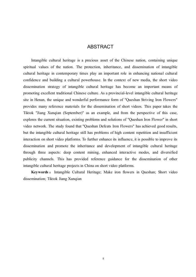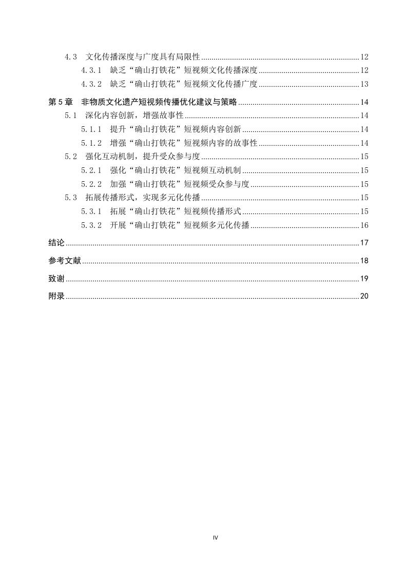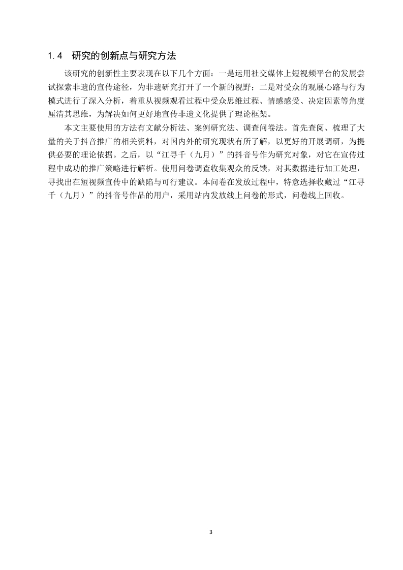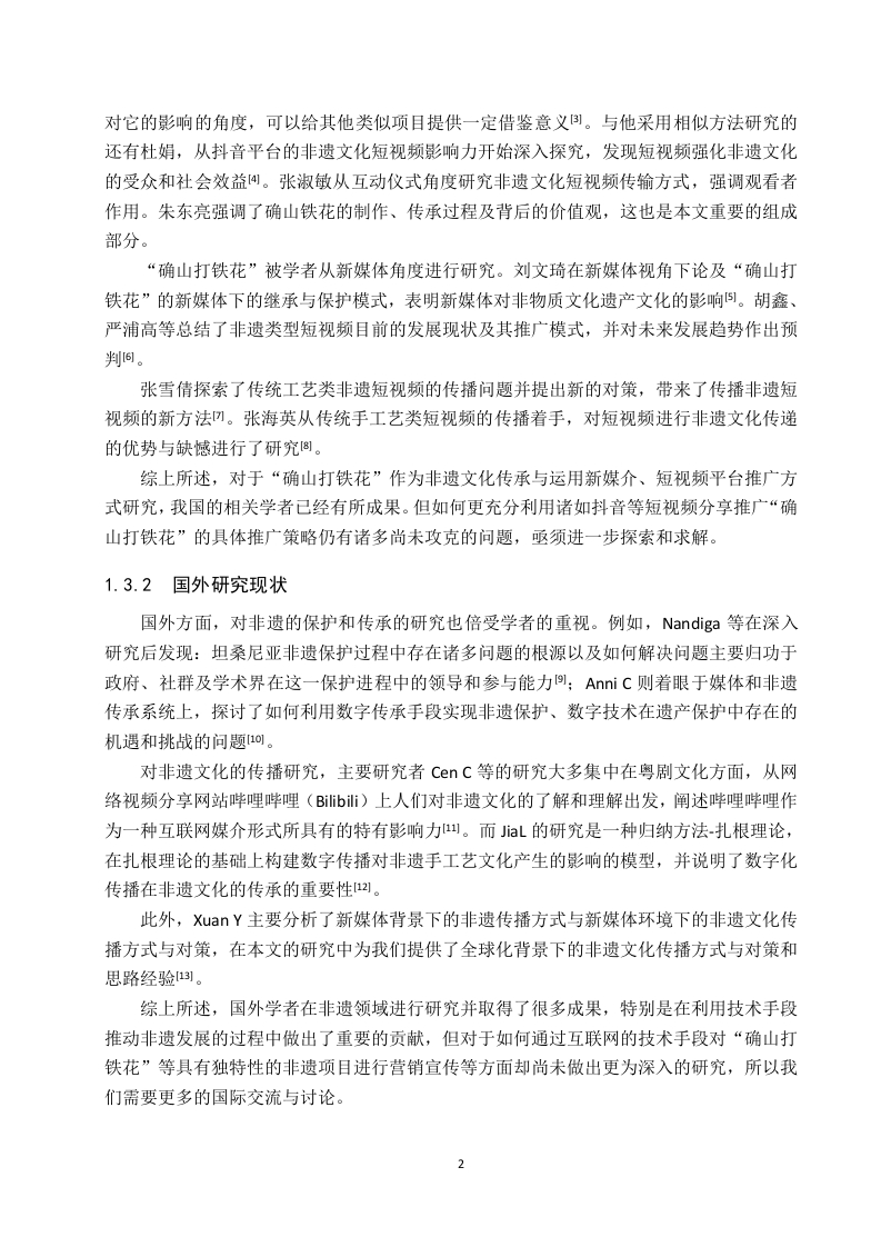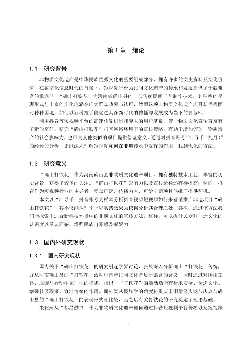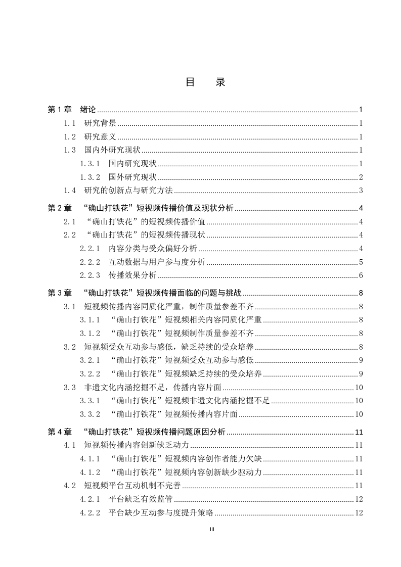 非物质文化遗产“确山打铁花”短视频传播策略研究一以抖音“江寻千”为例摘要非物质文化遗产,是中华民族的宝贵财富,蕴含着民族特有的精神价值。做好非遗文化在当代的保护、传承与传播,对提升民族文化自信、建设文化强国都有着重要作用。在新媒体背景下,非物质文化遗产的短视频传播策略成为弘扬中华传统优秀文化的重要手段。“确山打铁花”作为河南省级非遗,独特、奇妙的表演形式为短视频的传播提供了许多可供借鉴的素材。本文以抖音号“江寻千(九月)”为例,从该案例的视角出发,探究了“确山打铁花”在短视频网络中的现状、存在的问题和解决对策。该研究发现,“确山打铁花”取得了不错的成效,但该非遗在短视频平台依然存在内容重复率高、互动程度不足的问题。要想进一步提高影响力,可以从内容深度挖掘、增强互动模式,多样化宣传渠道三方面来提高传播力,促进非遗文化的传承和发展。为我国的其它非遗项目在短视频平台上的传播做出了参考指引。关键词:非物质文化遗产:确山打铁花:短视频传播:抖音江寻千ABSTRACTIntangible cultural heritage is a precious asset of the Chinese nation,containing uniquespiritual values of the nation.The protection,inheritance,and dissemination of intangiblecultural heritage in contemporary times play an important role in enhancing national culturalconfidence and building a cultural powerhouse.In the context of new media,the short videodissemination strategy of intangible cultural heritage has become an important means ofpromoting excellent traditional Chinese culture.As a provincial-level intangible cultural heritagesite in Henan,the unique and wonderful performance form of"Queshan Striving Iron Flowers"provides many reference materials for the dissemination of short videos.This paper takes theTiktok "Jiang Xungian (September)"as an example,and from the perspective of this case,explores the current situation,existing problems and solutions of"Queshan Iron Flower"in shortvideo network.The study found that "Queshan Defeats Iron Flowers"has achieved good results,but the intangible cultural heritage still has problems of high content repetition and insufficientinteraction on short video platforms.To further enhance its influence,it is possible to improve itsdissemination and promote the inheritance and development of intangible cultural heritagethrough three aspects:deep content mining,enhanced interactive modes,and diversifiedpublicity channels.This has provided reference guidance for the dissemination of otherintangible cultural heritage projects in China on short video platforms.Keywords Intangible Cultural Heritage;Make iron flowers in Queshan;Short videodissemination;Tiktok Jiang Xungian目录第1章绪论.….11.1研究背景…1.2研究意义…1.3国内外研究现状.1.3.1国内研究现状1.3.2国外研究现状…。.21.4研究的创新点与研究方法.3第2章“确山打铁花”短视频传播价值及现状分析.042.1“确山打铁花”的短视频传播价值…2.2“确山打铁花”的短视频传播现状.42.2.1内容分类与受众偏好分析.42.2.2互动数据与用户参与度分析….52.2.3传播效果分析…6第3章“确山打铁花”短视频传播面临的问题与挑战.83.1短视频传播内容同质化严重,制作质量参差不齐….83.1.1“确山打铁花”短视频相关内容同质化严重….83.1.2“确山打铁花”短视频制作质量参差不齐.83.2短视频受众互动参与感低,缺乏持续的受众培养.83.2.】“确山打铁花”短视频受众互动参与感低93.2.2“确山打铁花”短视频缺乏持续的受众培养..93.3非遗文化内涵挖掘不足,传播内容片面.1033.1“确山打铁花”短视频非遗文化内涵挖掘不足103.3.2“确山打铁花”短视频传播内容片面.10第4章“确山打铁花”短视频传播问题原因分析.….114.1短视频传播内容创新缺乏动力.114.1.1“确山打铁花”短视频内容创作者能力欠缺.114.1.2“确山打铁花”短视频内容创新缺少驱动力.114.2短视频平台互动机制不完善..114.2.】平台缺乏有效监管124.2.2平台缺少互动参与度提升策略…124.3文化传播深度与广度具有局限性124.3.1缺乏“确山打铁花”短视频文化传播深度.…124.3.2缺乏“确山打铁花”短视频文化传播广度.13第5章非物质文化遗产短视频传播优化建议与策略.145.1深化内容创新,增强故事性.145.1.1提升“确山打铁花”短视频内容创新145.1.2增强“确山打铁花”短视频内容的故事性.145.2强化互动机制,提升受众参与度.155.2.1强化“确山打铁花”短视频互动机制.155.2.2加强“确山打铁花”短视频受众参与度.155.3拓展传播形式,实现多元化传播..155.3.】拓展“确山打铁花”短视频传播形式.155.3.2开展“确山打铁花”短视频多元化传播.16结论.…….17参考文献.18致谢…19附录.