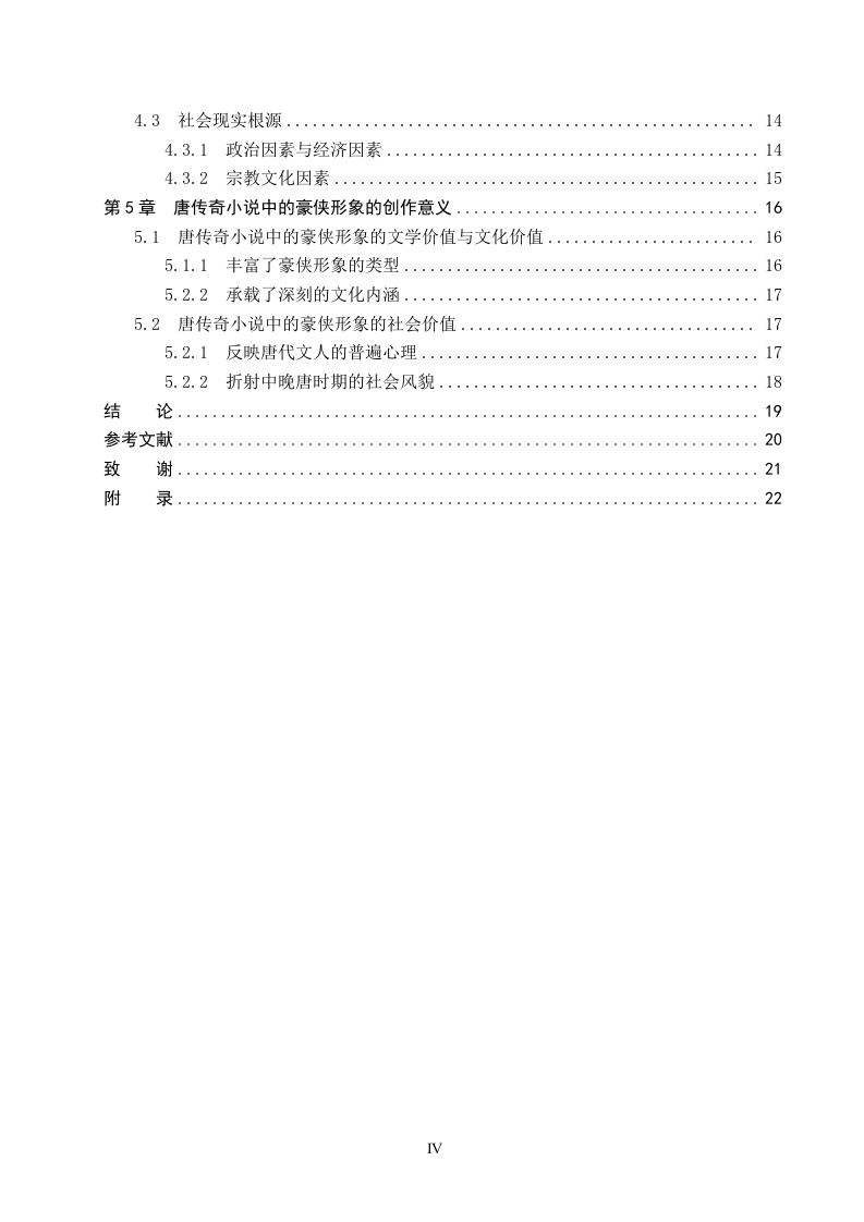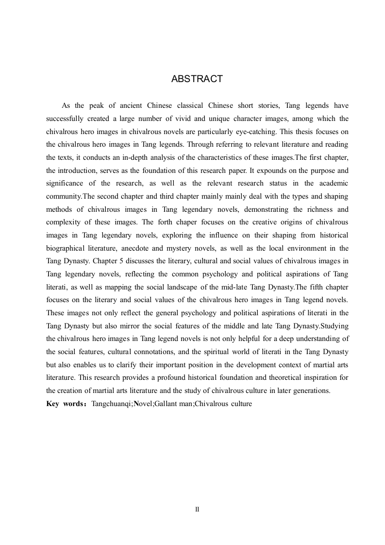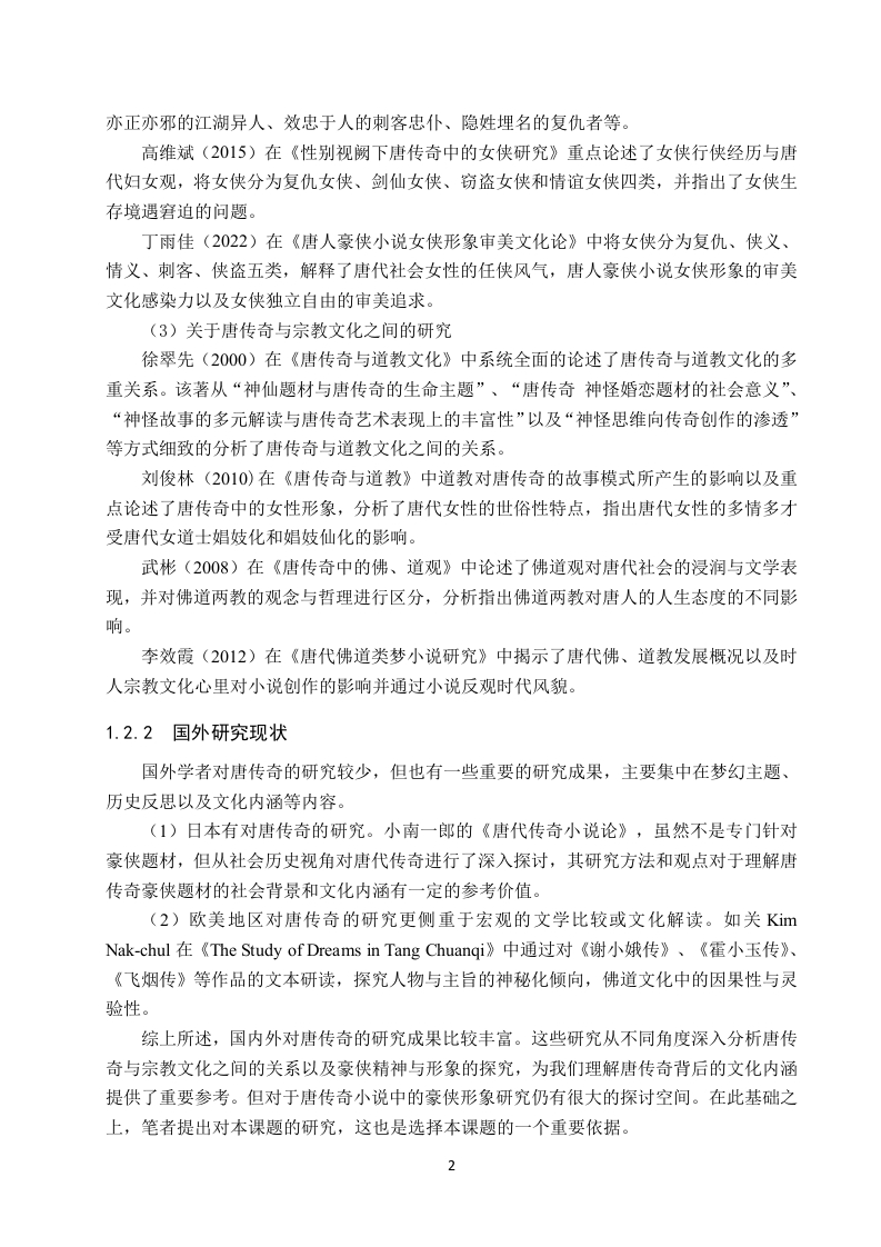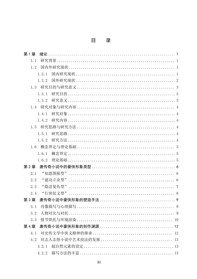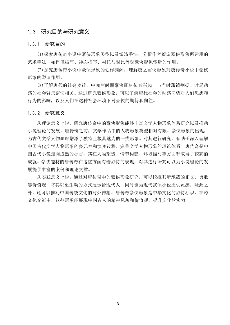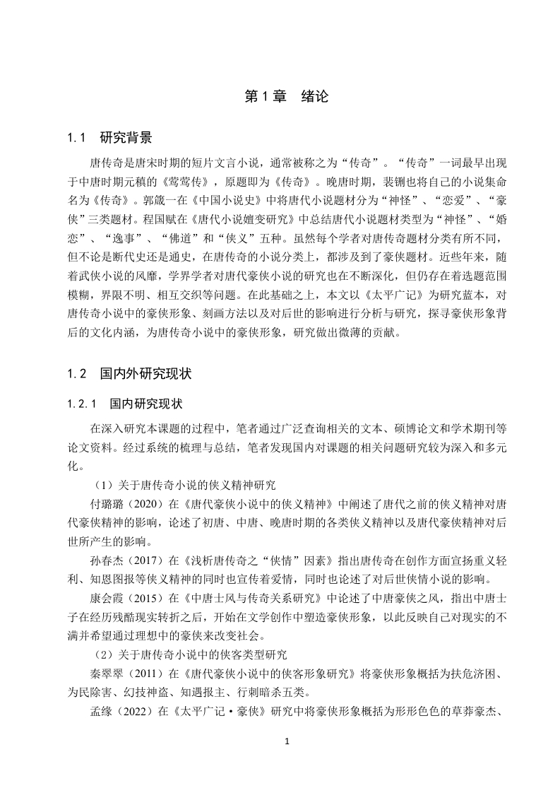 唐传奇小说中的豪侠形象研究摘要唐传奇作为中国古代文言短篇小说的高峰,塑造了众多鲜明独特的人物形象,其中豪侠小说中的豪侠形象尤为引人注目。本论文聚焦唐传奇小说中的豪侠形象,通过参考文献、阅读文本,深入剖析这些形象的特征。第一章绪论为研究论文的基础,叙述了论文研究的目的和意义,以及学术界的相关研究现状。第二章、第三章主要涉及了唐传奇小说中豪侠形象的类型以及塑造方法,展现了唐传奇小说中豪侠形象的丰富性和复杂性。第四章主要论述了唐传奇小说中豪侠形象的创作渊源,从史传文学到志人志怪小说以及唐代本土环境对唐传奇小说中豪侠形象塑造的影响。第五章主要论述了唐传奇小说中豪侠形象的文学价值、文化价值以及社会价值,反映了唐代文人的普遍心理以及政治抱负,也映射了中晚唐时期的社会风貌。研究唐传奇小说中的豪侠形象,不仅有助于深入理解唐代的社会风貌、文化内涵以及文人精神世界,还能明晰其在武侠文学发展脉络中的重要地位,为后世武侠文学创作与侠文化研究提供了深厚的历史根基与理论启示。关键词:唐传奇:小说:豪侠:侠文化ABSTRACTAs the peak of ancient Chinese classical Chinese short stories,Tang legends havesuccessfully created a large number of vivid and unique character images,among which thechivalrous hero images in chivalrous novels are particularly eye-catching.This thesis focuses onthe chivalrous hero images in Tang legends.Through referring to relevant literature and readingthe texts,it conducts an in-depth analysis of the characteristics of these images.The first chapter,the introduction,serves as the foundation of this research paper.It expounds on the purpose andsignificance of the research,as well as the relevant research status in the academiccommunity.The second chapter and third chapter mainlymainly deal with the types and shapingmethods of chivalrous images in Tang legendary novels,demonstrating the richness andcomplexity of these images.The forth chaper focuses on the creative origins of chivalrousimages in Tang legendary novels,exploring the influence on their shaping from historicalbiographical literature,anecdote and mystery novels,as well as the local environment in theTang Dynasty.Chapter 5 discusses the literary,cultural and social values of chivalrous images inTang legendary novels,reflecting the common psychology and political aspirations of Tangliterati,as well as mapping the social landscape of the mid-late Tang Dynasty.The fifth chapterfocuses on the literary and social values of the chivalrous hero images in Tang legend novels.These images not only reflect the general psychology and political aspirations of literati in theTang Dynasty but also mirror the social features of the middle and late Tang Dynasty.Studyingthe chivalrous hero images in Tang legend novels is not only helpful for a deep understanding ofthe social features,cultural connotations,and the spiritual world of literati in the Tang Dynastybut also enables us to clarify their important position in the development context of martial artsliterature.This research provides a profound historical foundation and theoretical inspiration forthe creation of martial arts literature and the study of chivalrous culture in later generations.Key words:Tangchuangi;Novel;Gallant man;Chivalrous culture女目录第1章绪论...…1.1研究背景.....1.2国内外研究现状...1.2.1国内研究现状...1.2.2国外研究现状...…21.3研究目的与研究意义.1.3.1研究目的....31.3.2研究意义....31.4研究对象与研究内容1.4.1研究对象...1.4.2研究内容....1.5研究思路与研究方法..41.5.1研究思路...…41.5.2研究方法...1.6概念界定与理论基础...51.6.1概念界定.…51.6.2理论基础.....第2章唐传奇小说中的豪侠形象类型2.1“知恩图报型”62.2“建功立业型”62.3“隐忍复仇型”72.4“行侠仗义型”8第3章唐传奇小说中豪侠形象的塑造手法03.1肖像描写与心理描写.......93.2人物对比与衬托.......93.3情节烘托与环境渲染
